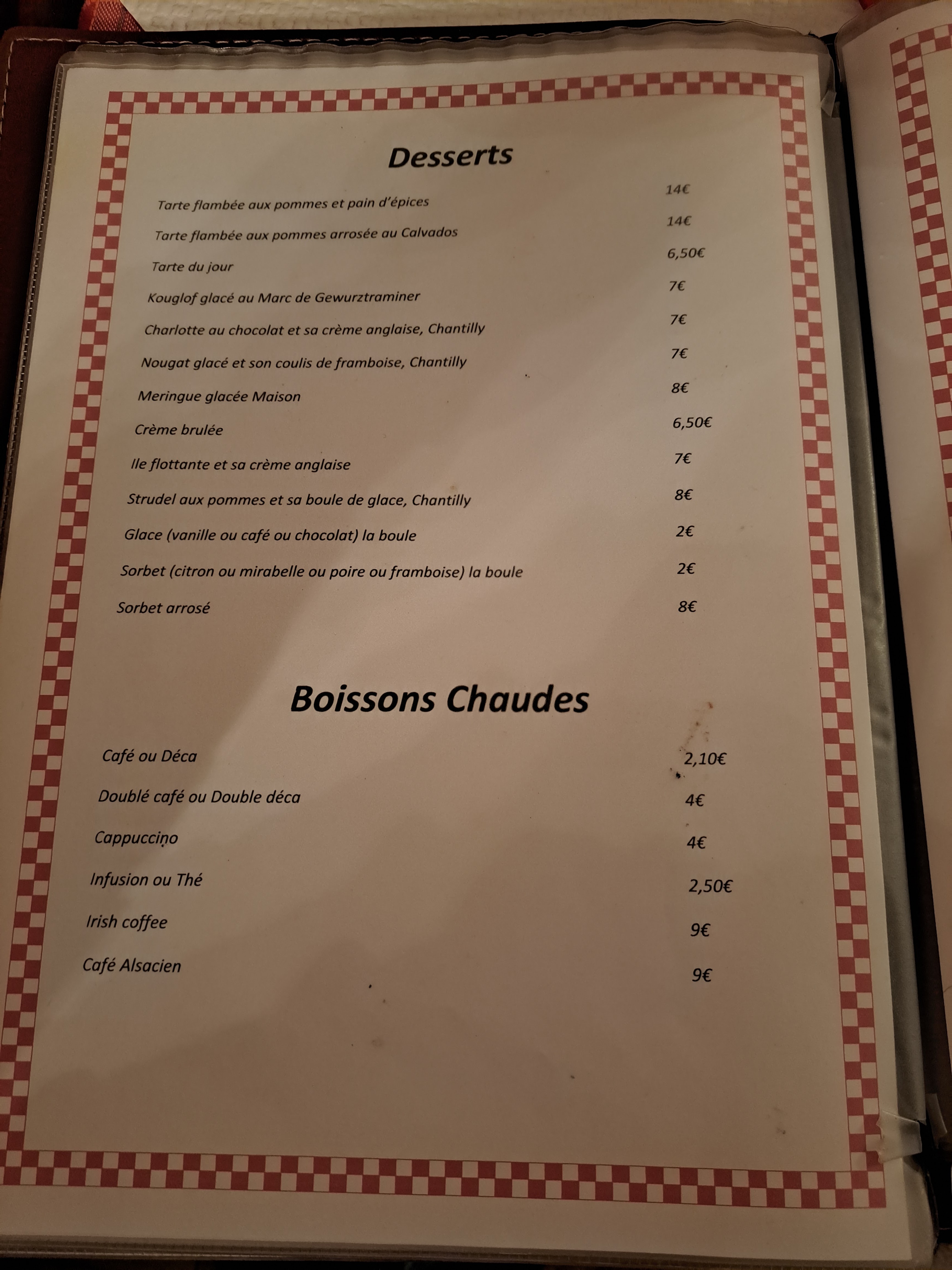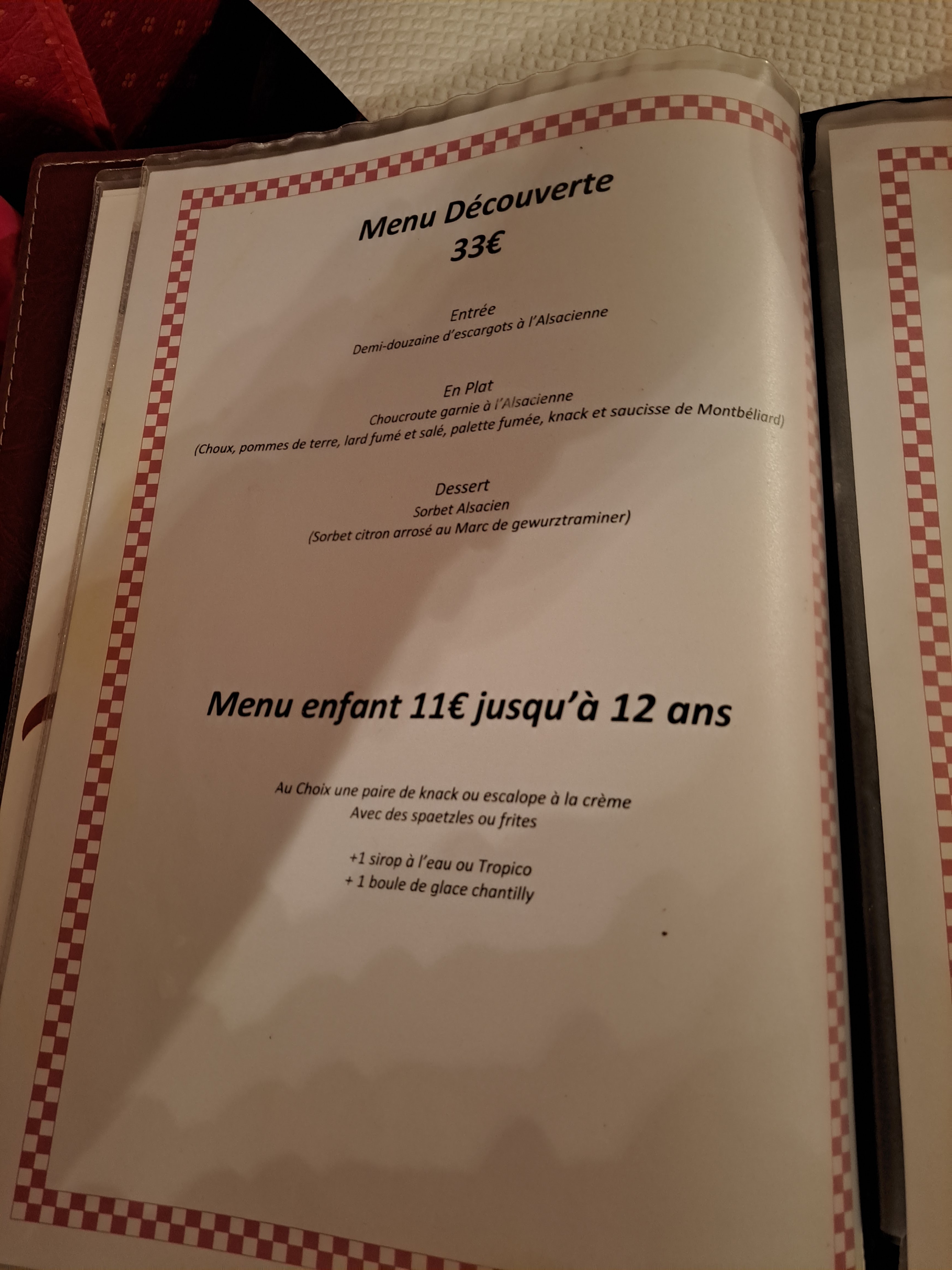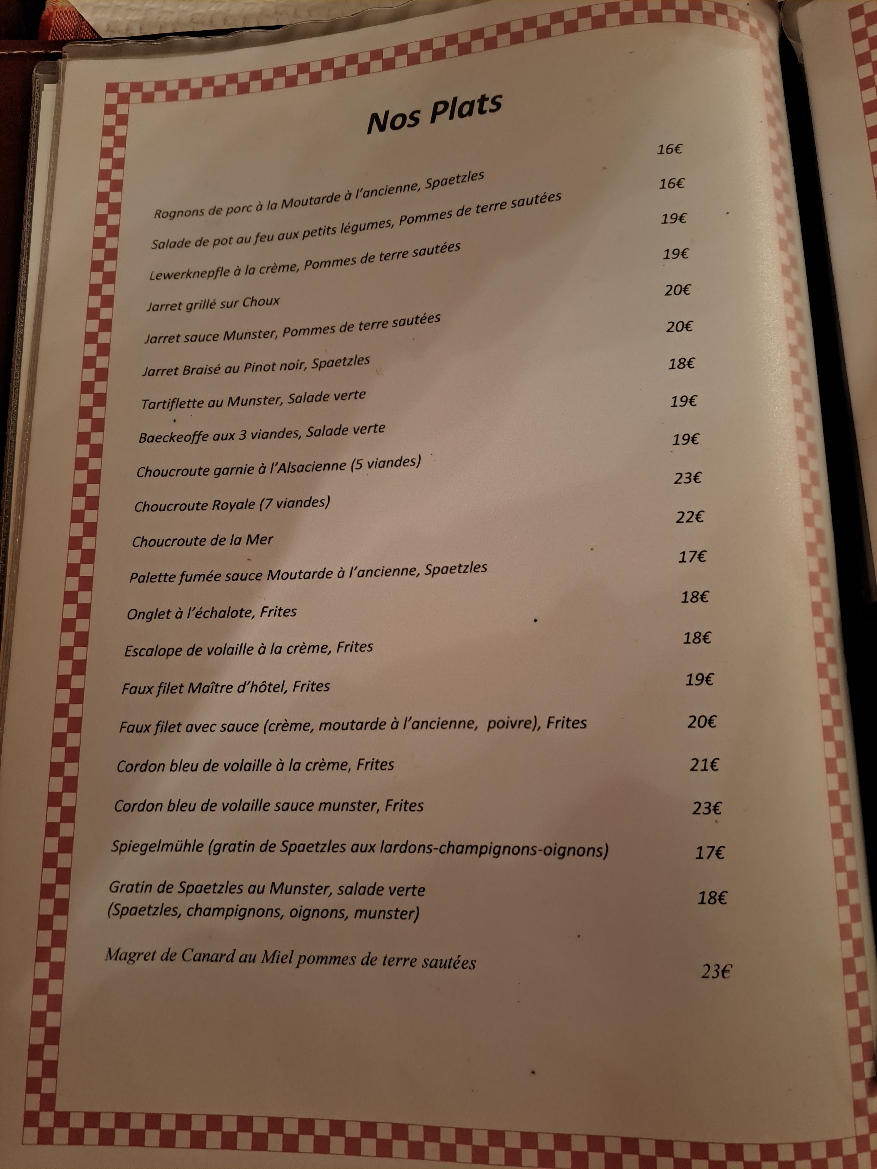 La carte est variée avec un large choix de spécialités Alsaciennes. Réservez de préférence si vous comptez y aller en fin de semaine. Restaurant un peu bruyant, table assez proches les unes des autres. Prix des plats entre 13 et un peu plus de 20 €, mais vous avez quelque chose dans votre assiette et le personnel est agréable.