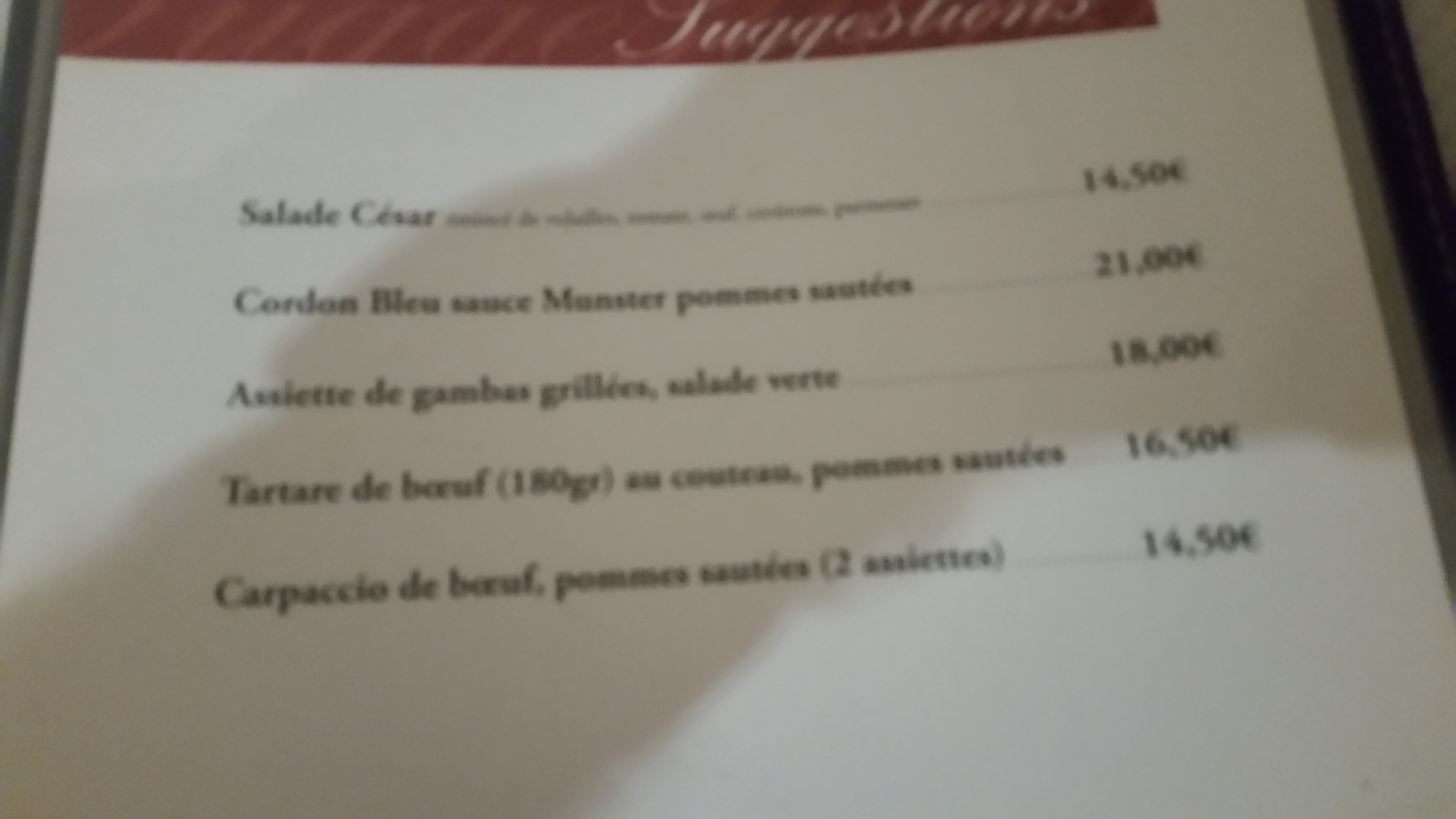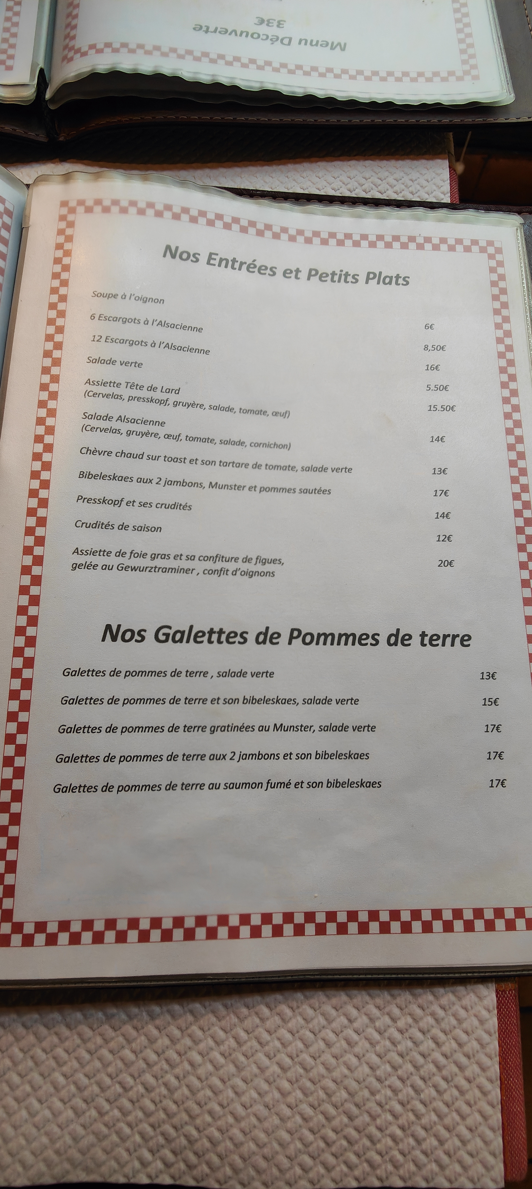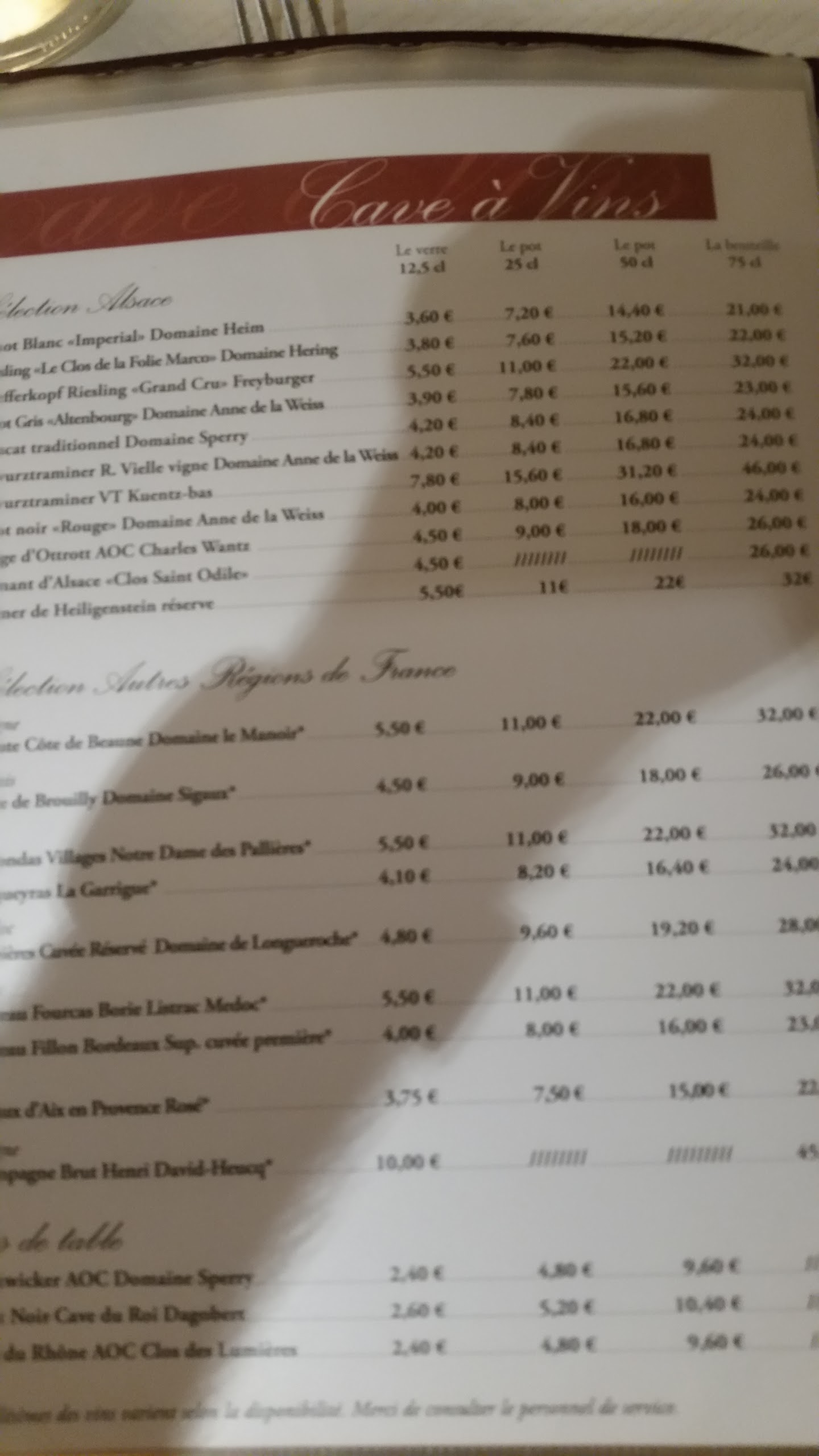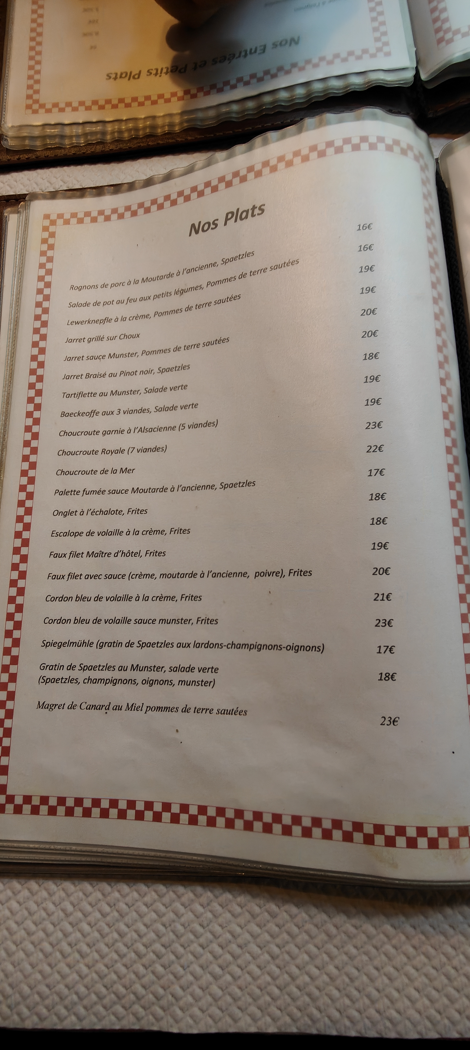 La carte est variée avec un large choix de spécialités Alsaciennes. Réservez de préférence si vous comptez y aller en fin de semaine. Restaurant un peu bruyant, table assez proches les unes des autres. Prix des plats entre 13 et un peu plus de 20 €, mais vous avez quelque chose dans votre assiette et le personnel est agréable.