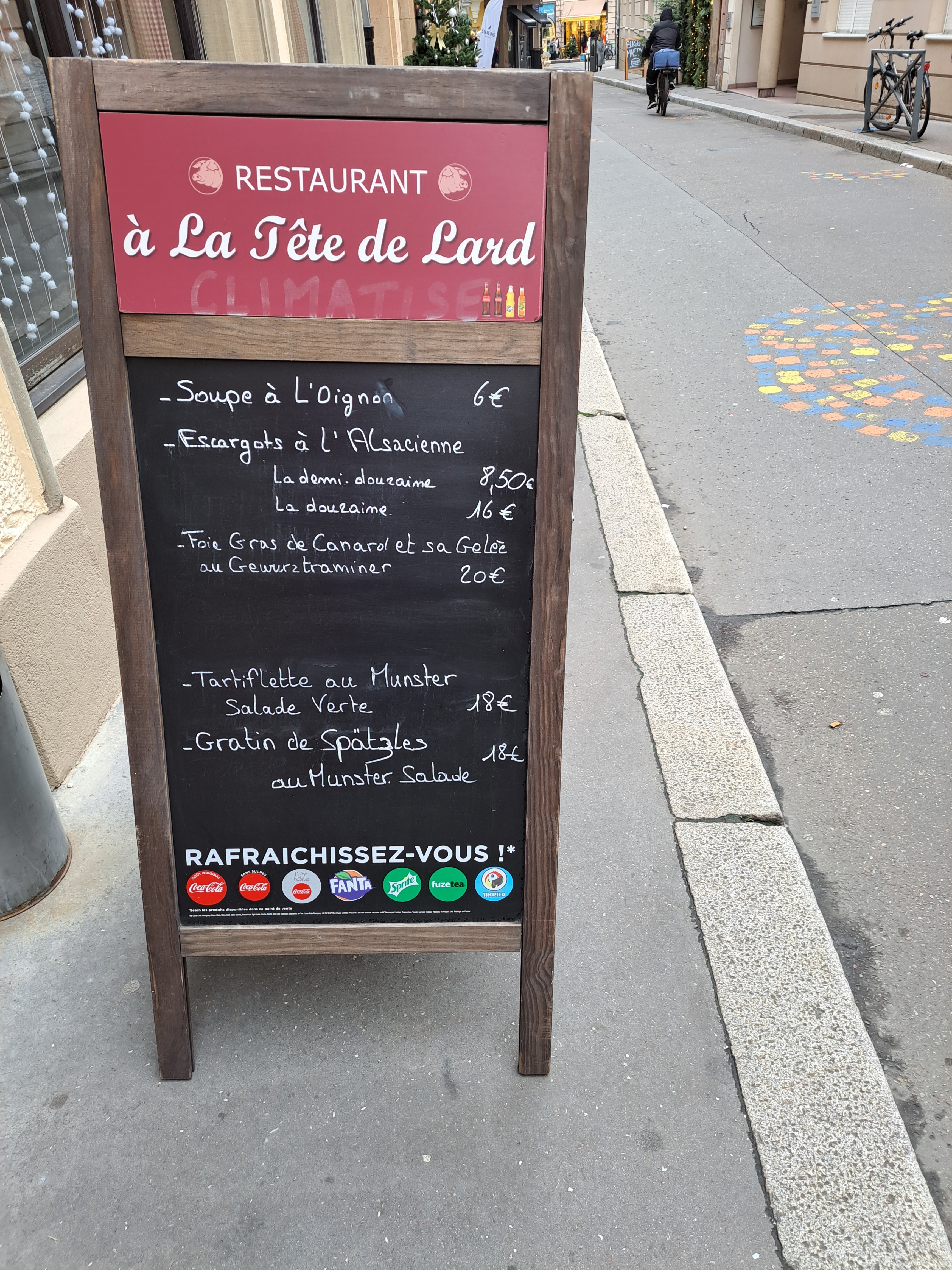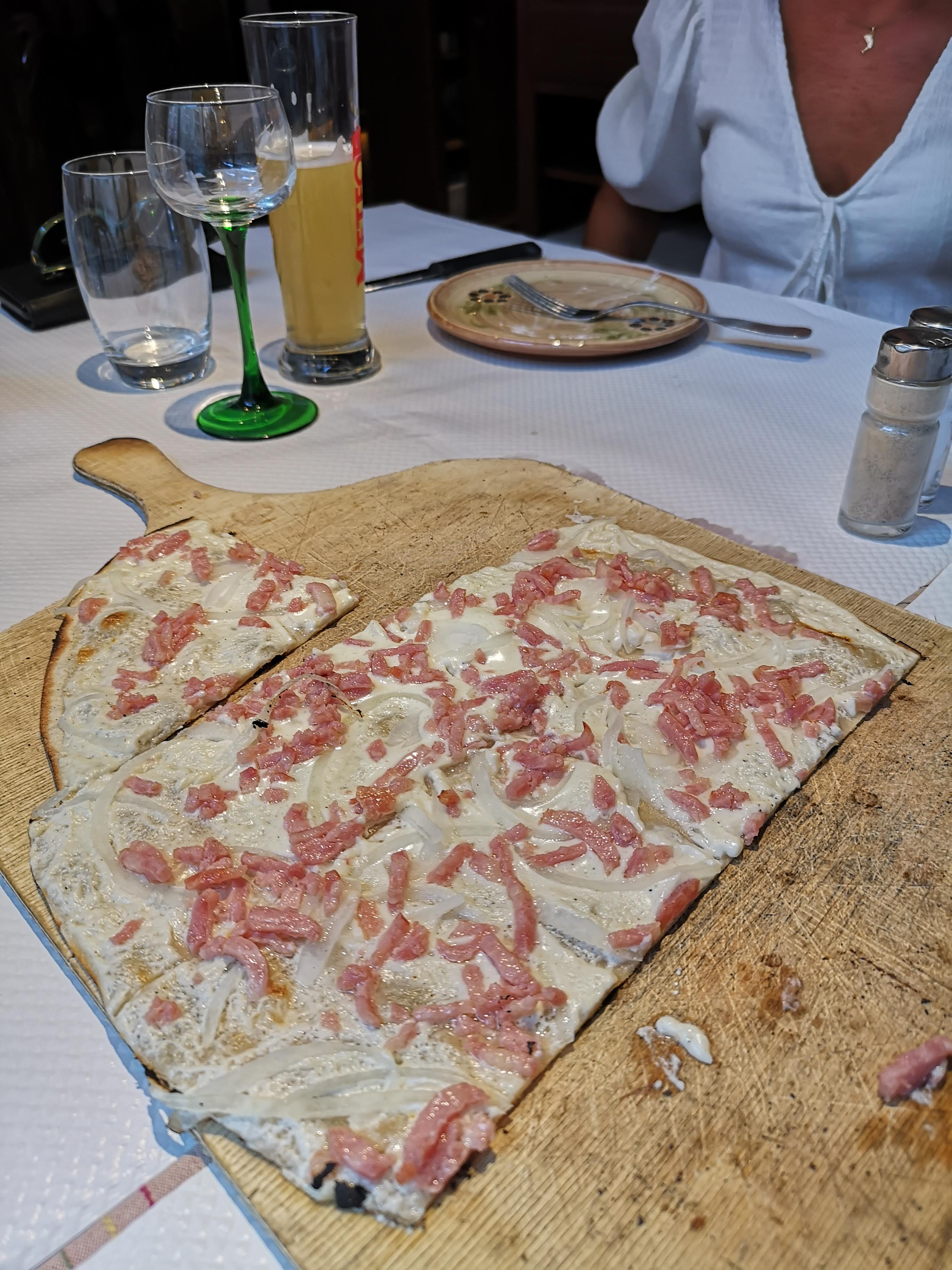 L’endroit nous avait été recommandé par le concierge. Nuit difficile pour estomac fragile. Nous avons pris des tartes flambées assez indigestes avec beaucoup de crème et des lardons et oignons simplement bouillis. Il y a franchement mieux. Les escargots en entrée étaient bons. Ai trempé les lèvres dans le « Riesling Grand cru », il piquait d’acidité, je suis convaincue que j’ai bien fait de ne pas le boire. ++ Cadre sympathique Portions généreuses Serveur diligent
