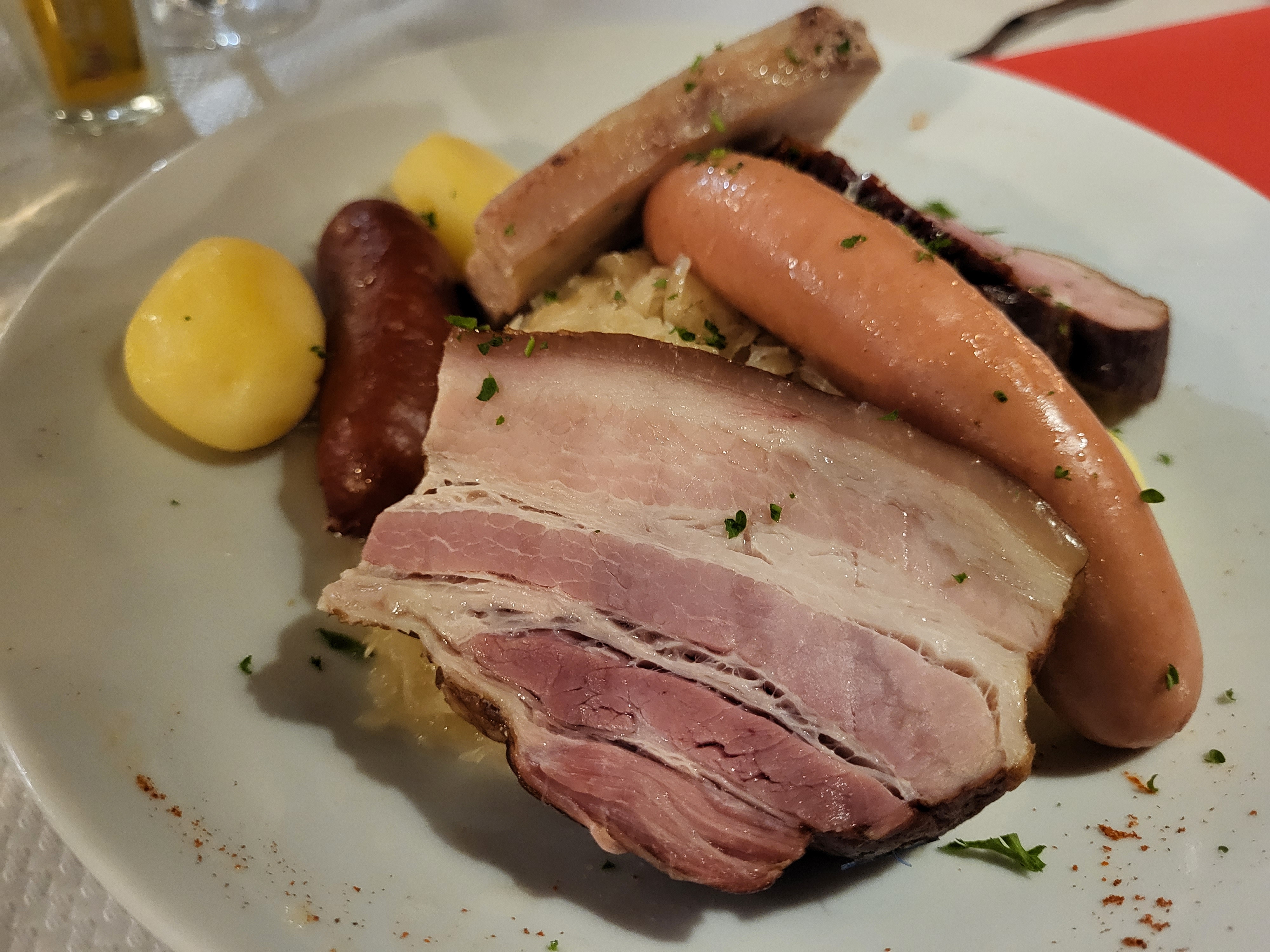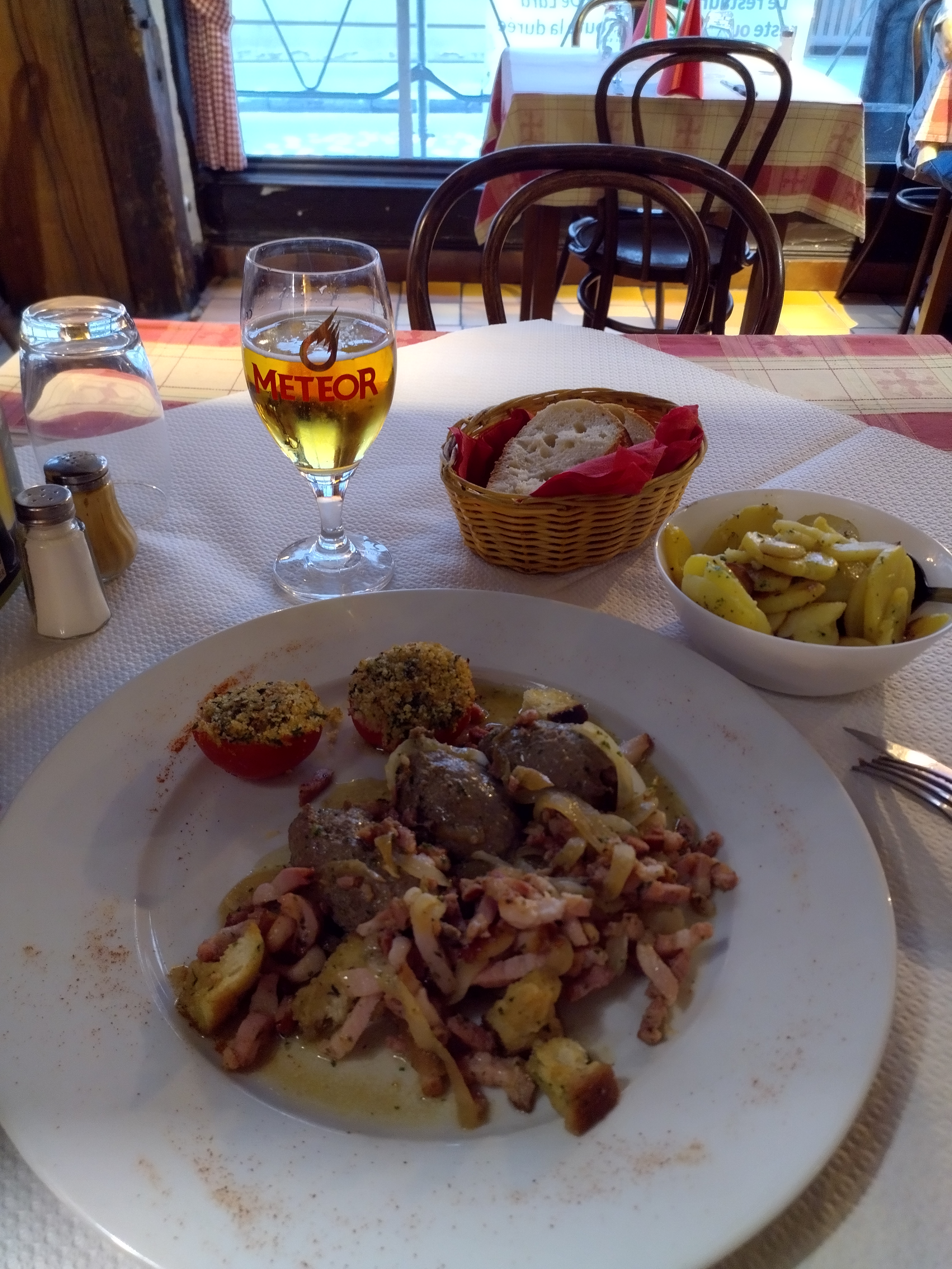 J’ai très bien mangé ! C’était frais, bon, réconfortant. Le serveur a très gentillement accepté de me faire une petite portion de choucroute sans viande. Le restaurant est très typique, mignon, intime.