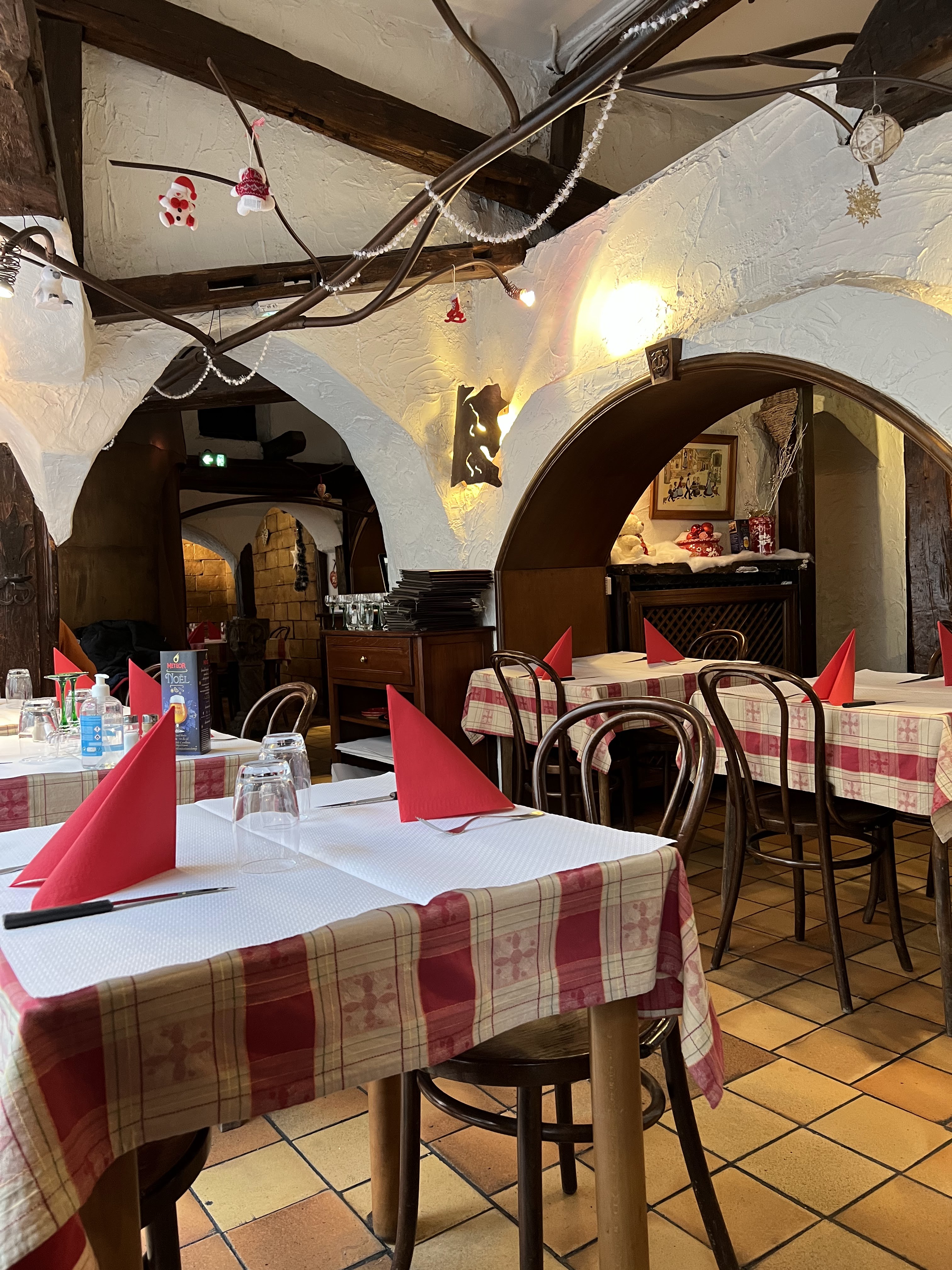 Restaurant qui a garder tout son charme. Atypique. Serveur très professionnel et souriant. On a pris une choucroute, une tartiflette et une flamenkuche. Tout était excellent. En quantité suffisante. La flamenkuche pomme pain d'épice pour le dessert était excellente. J'enlève une étoile pour le fait que le pass time ne soit pas accepté pendant la période du marché de Noël.