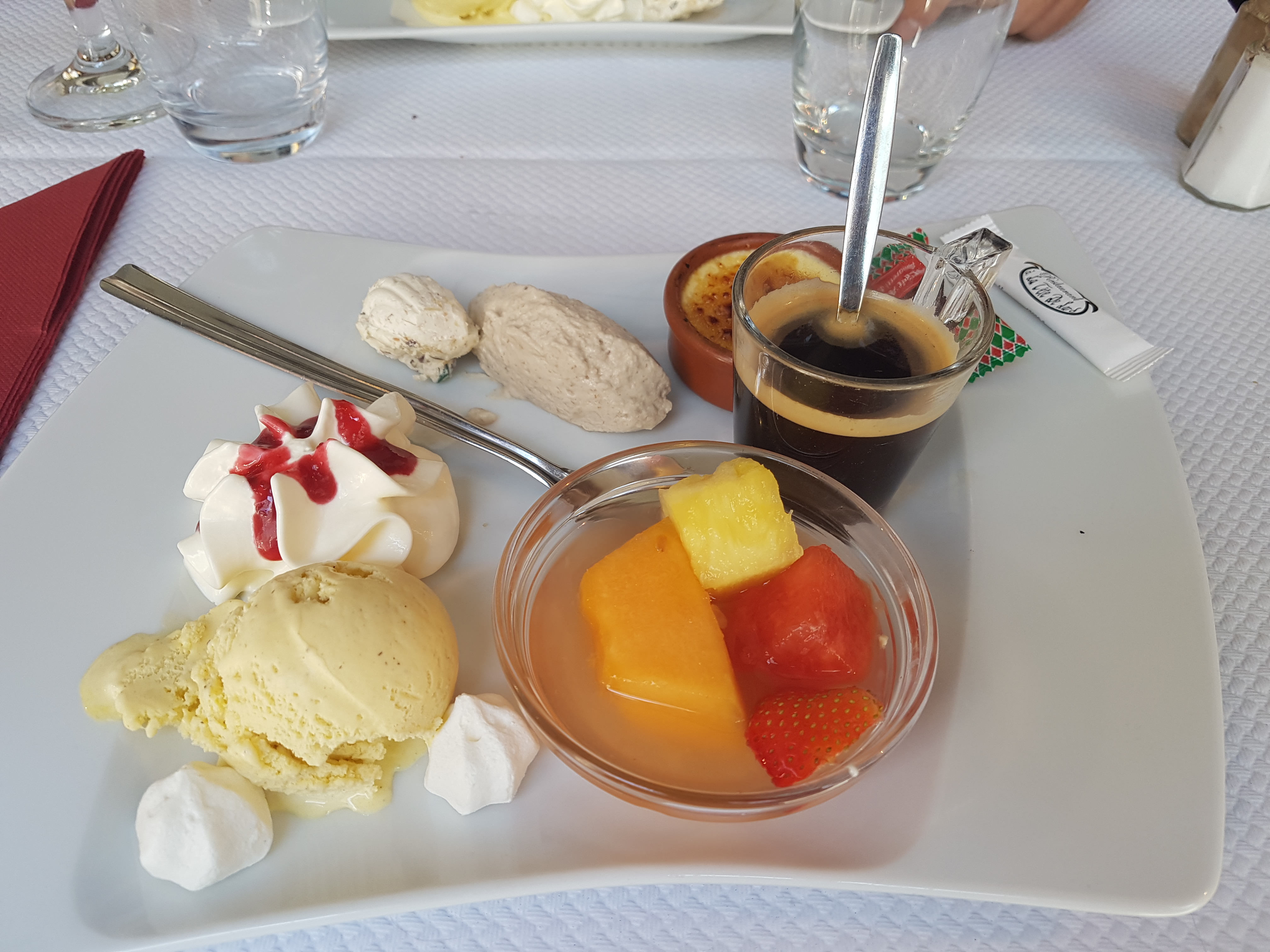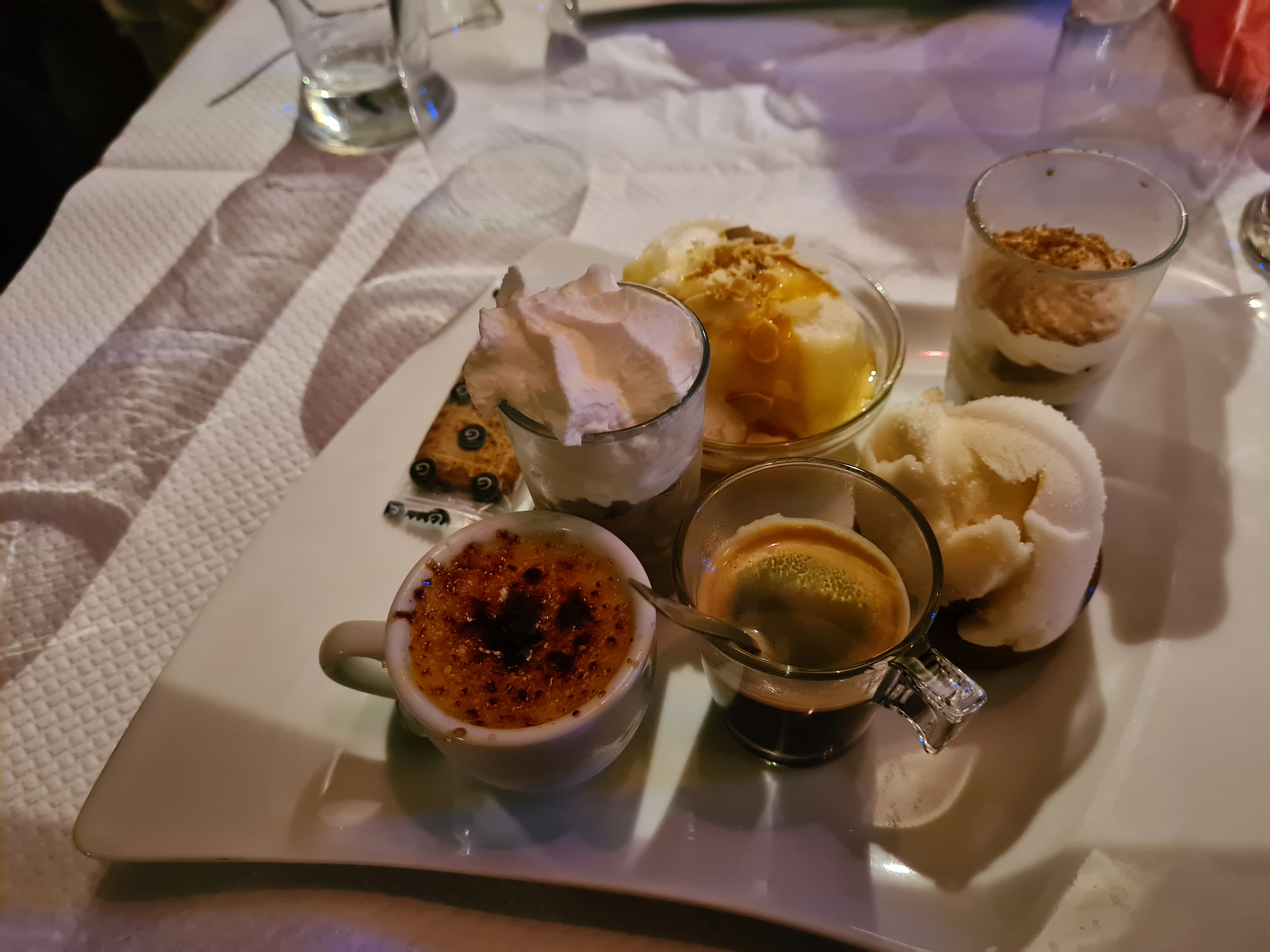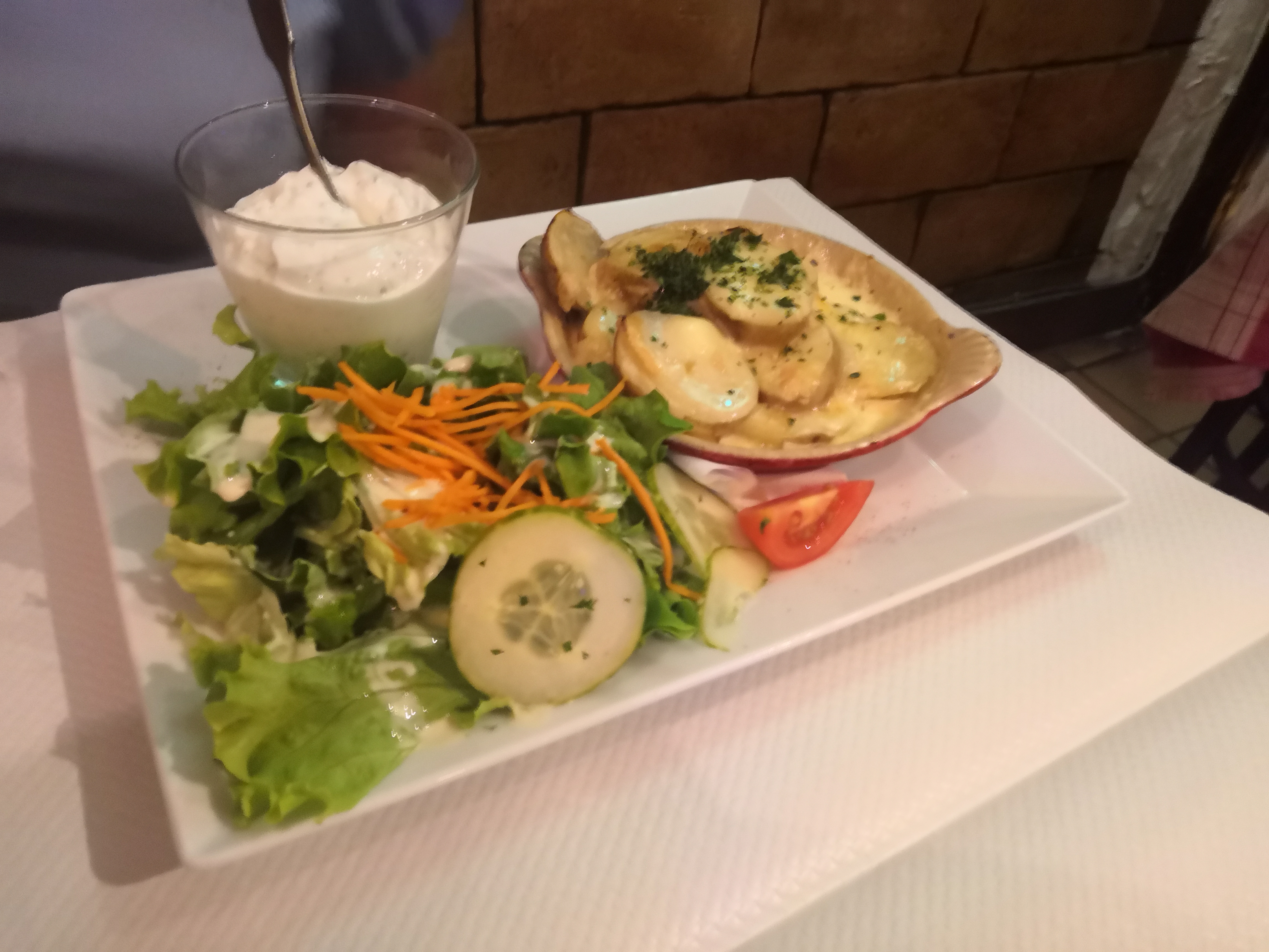 Nous n’avons pas mangé. La serveuse n’avait clairement pas envie de nous voir et nous accueilli plus que froidement. Nos voisins de table étant particulièrement bruyants, nous avons demandé à être déplacé (nous nous entendions à peine parler), la serveuse nous a proposé une autre table (en exprimant son agacement) à même distance de la table problématique alors qu’il y avait d’autres options. Incapables de passer une bonne soirée dans de telles conditions, nous sommes partis.