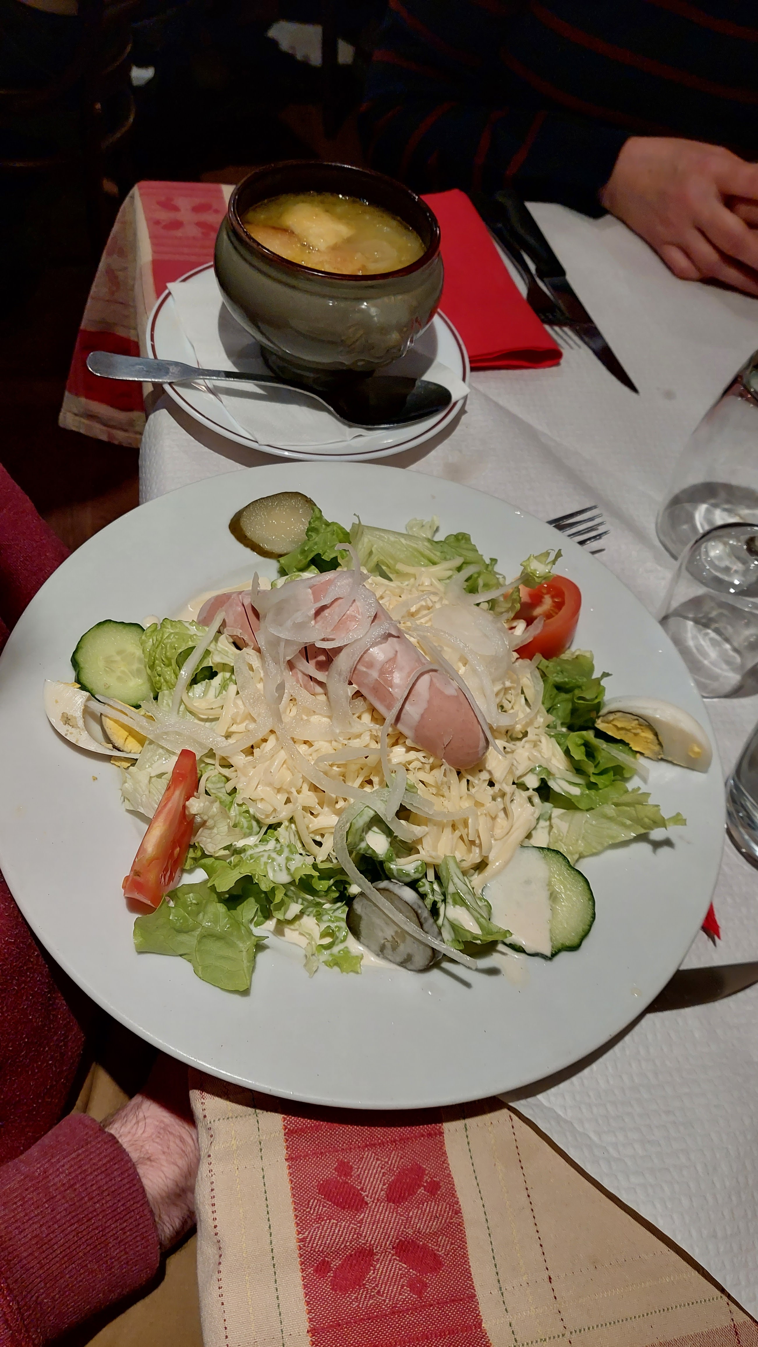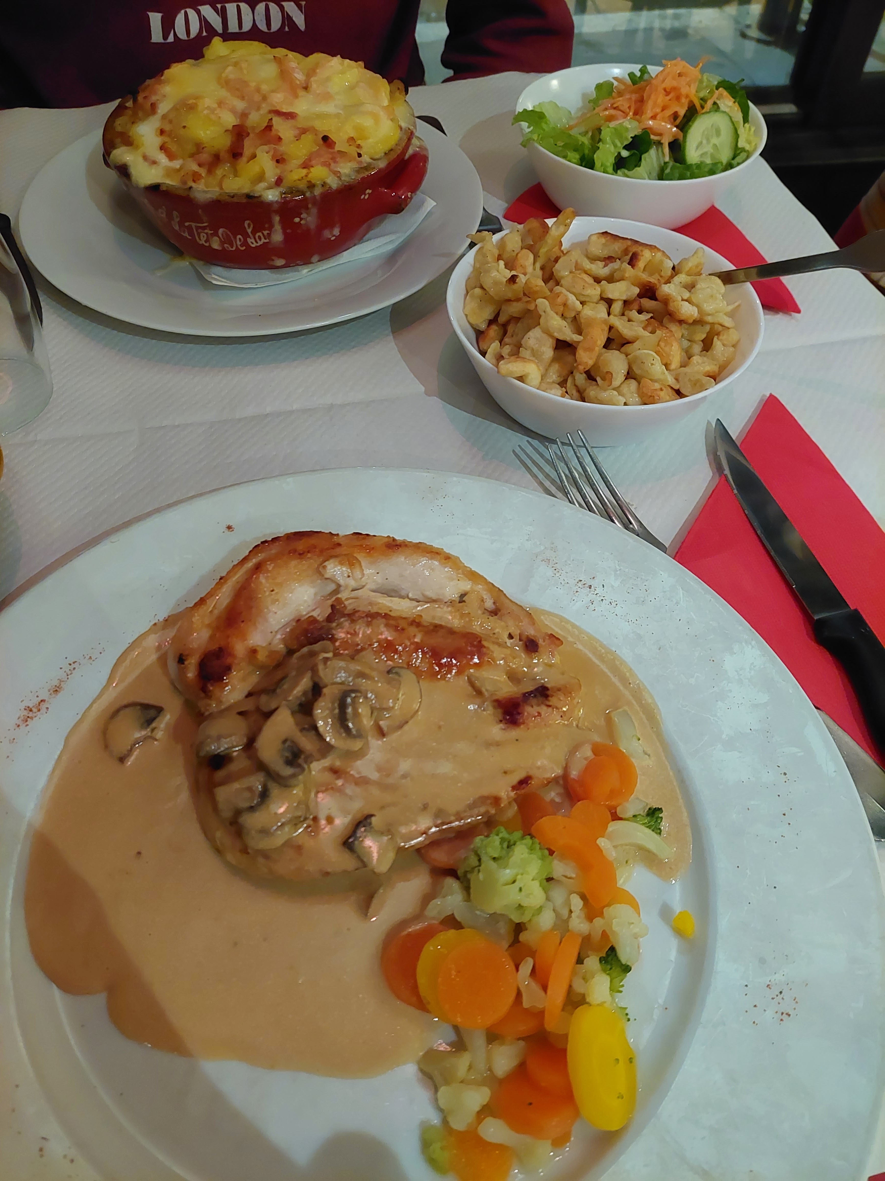 Plats très bons et généreux. Jolie déco à l'alsacienne ! Nous sommes revenus une 2e fois. Entrées : Soupe à l'oignon, Salade Alsacienne Plats : Tartiflettes, Escalope de volaille à la crème avec Spaetzle