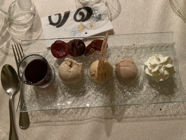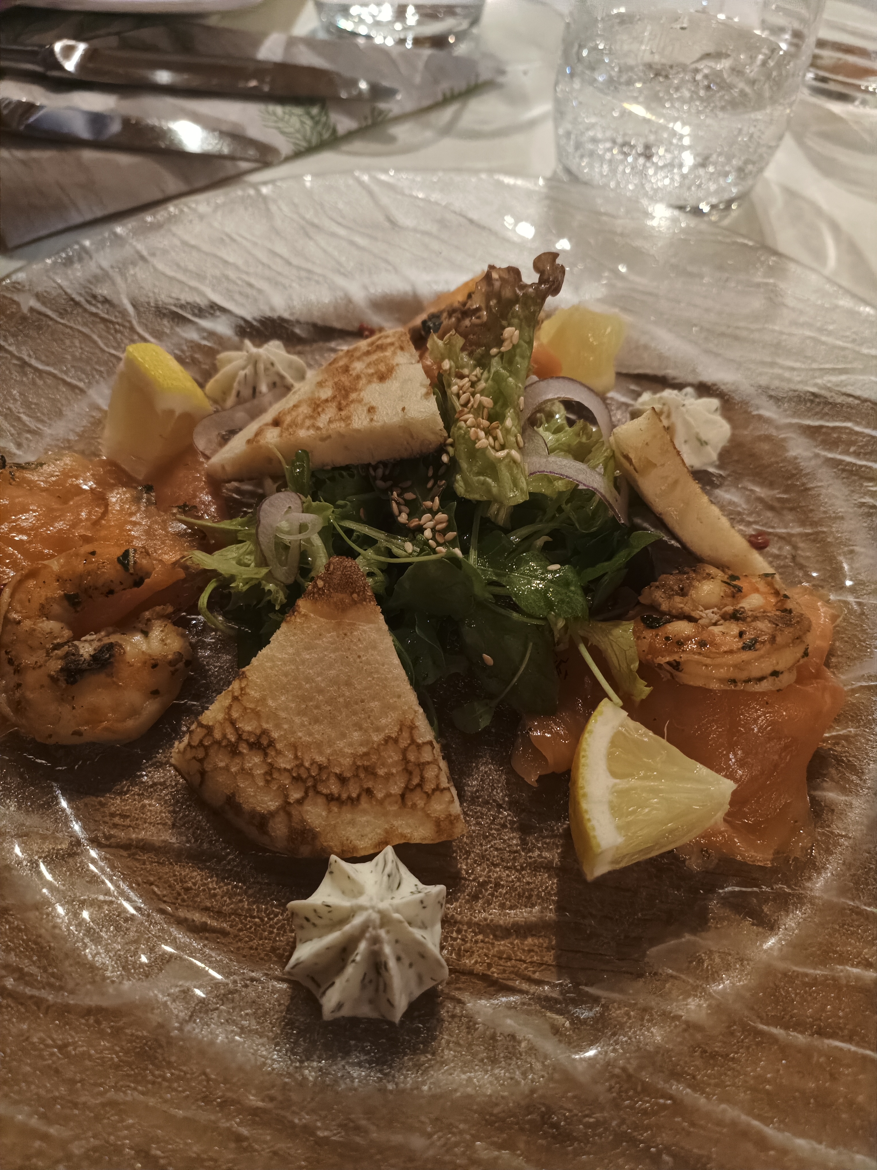 Repas de famille, un dimanche..... Tout poisson.... Un régal... farandole aux gambas Cordon bleu, sandre/saumon Dampfnudle pomme caramélisée glace quetsch.