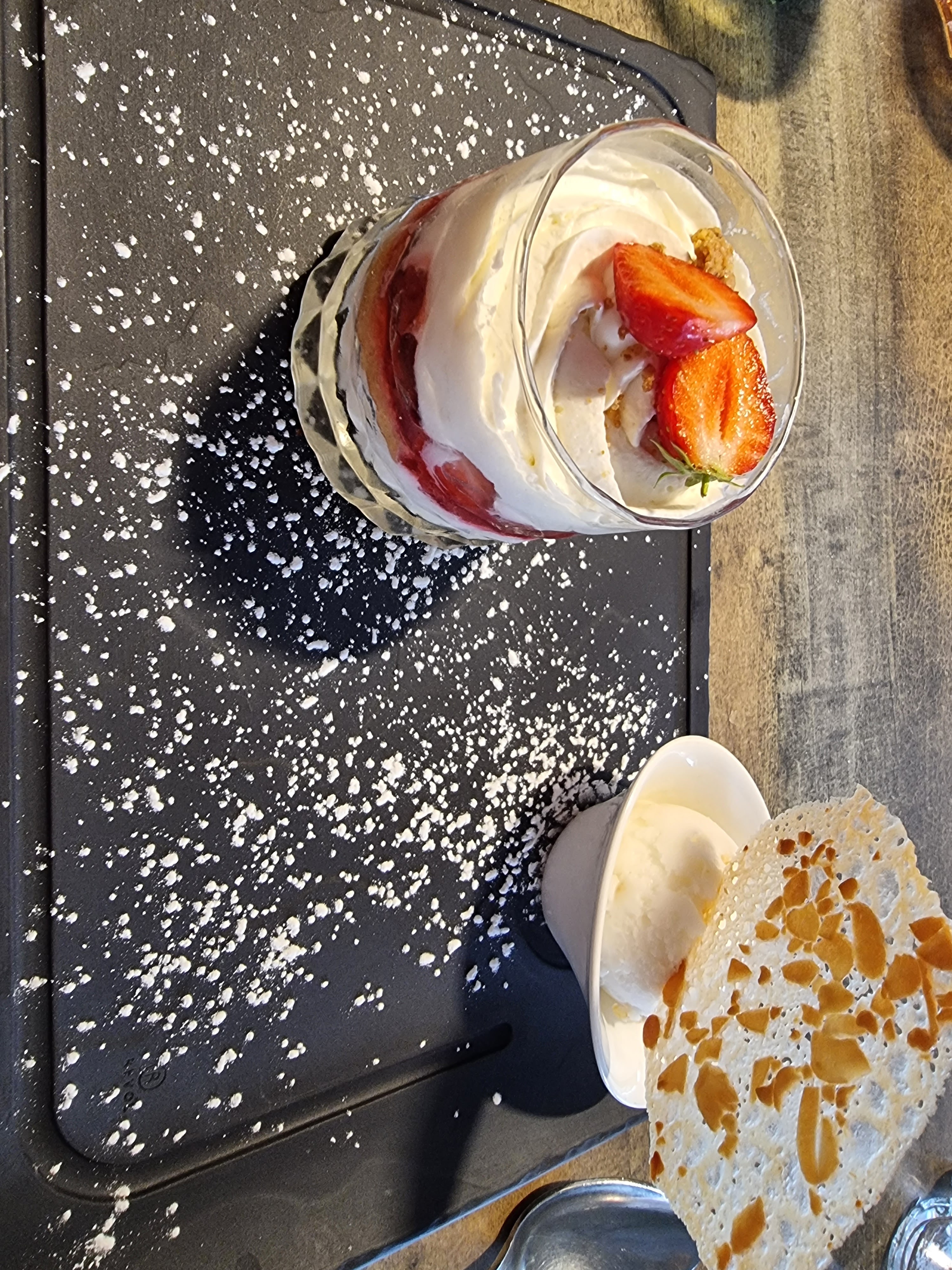 personnel accueillant et souriant terrasse agréable suggestion du jour:salade aux gambas, saumon, avocat très bonne et copieuse tiramisu aux fraises un régal bonne découverte