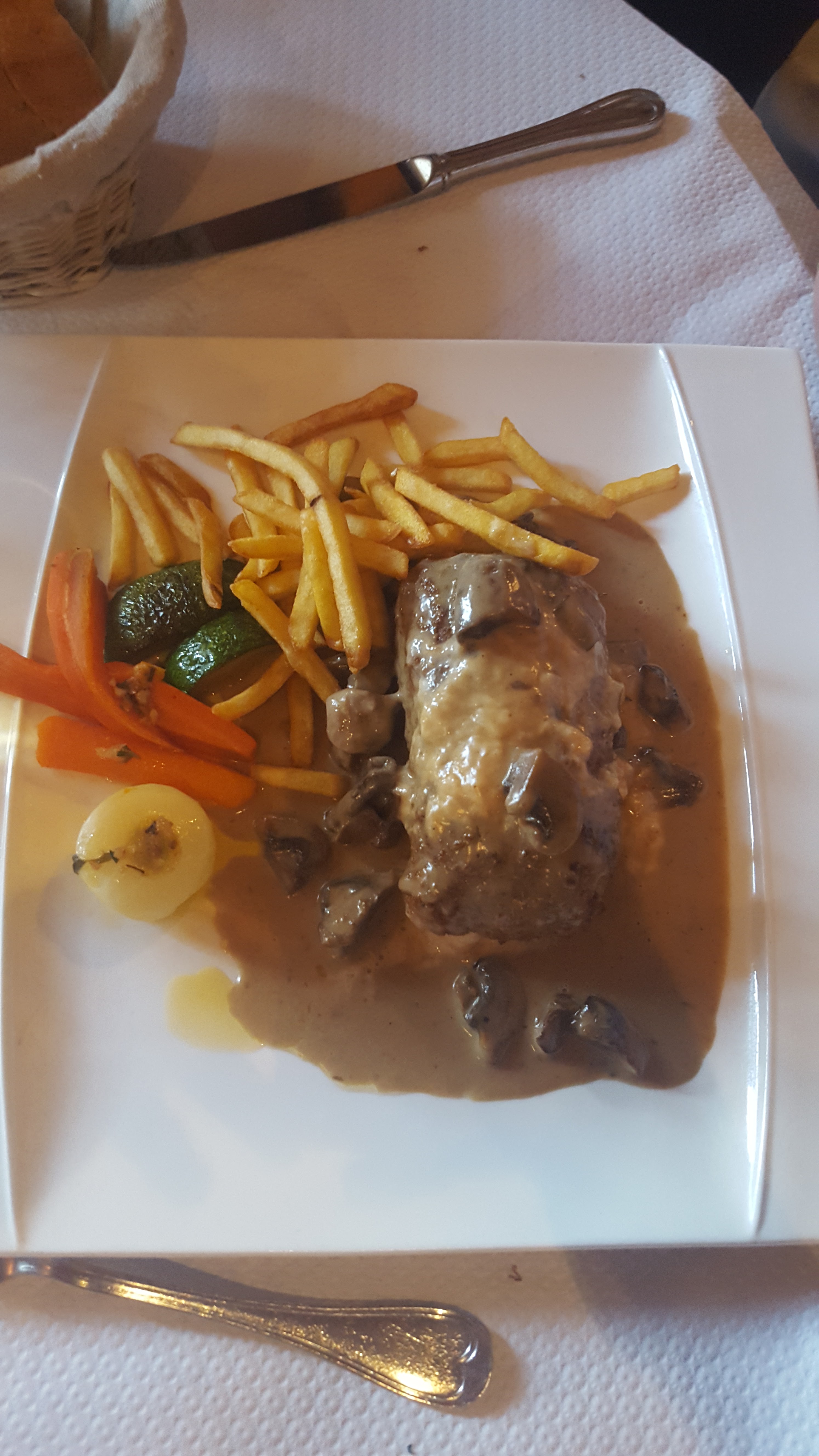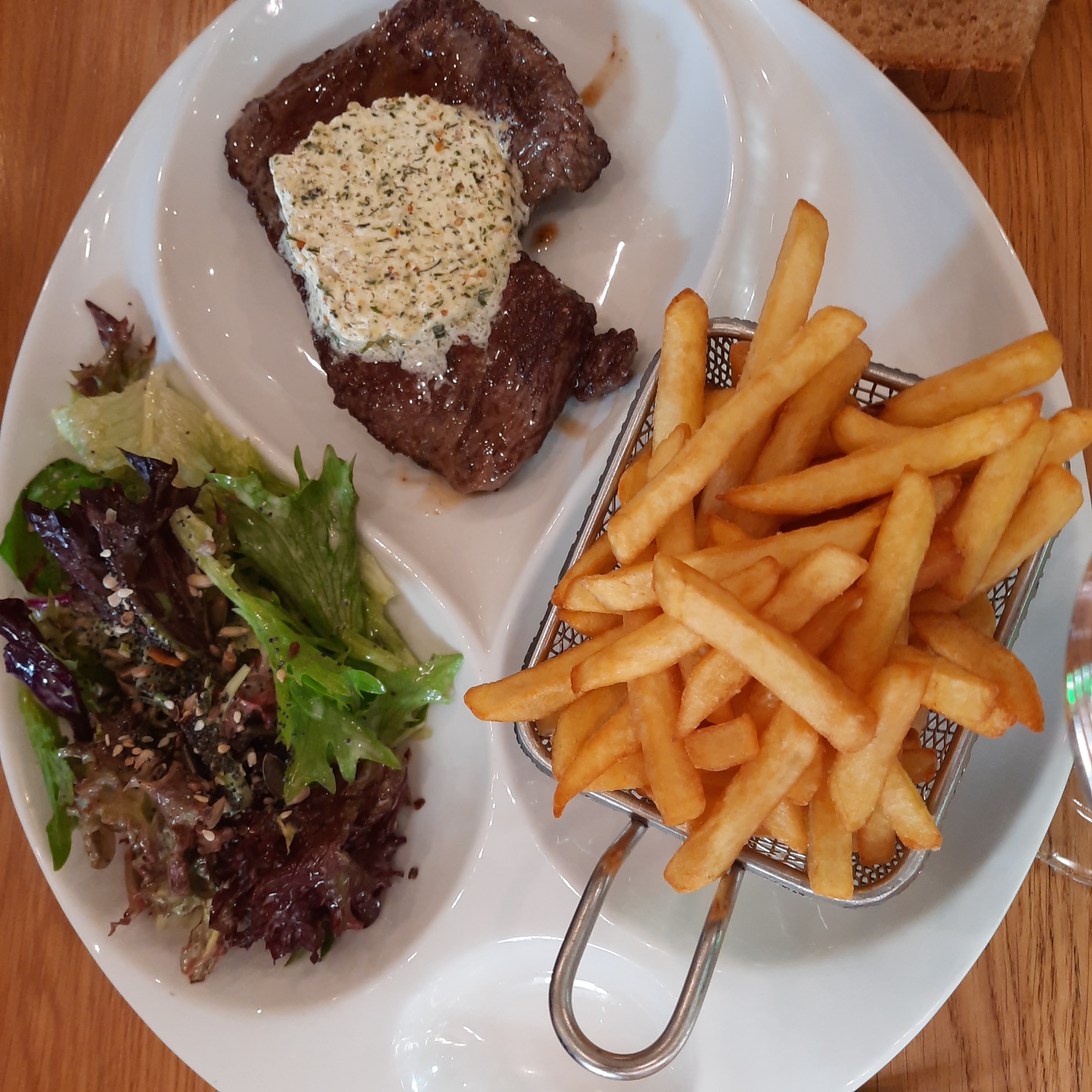 Très bon restaurant alsacien Personnellement j'ai pris un onglet de bœuf qui était très bon la viande été correctement cuite mais je ne me souviens plus de l accompagnement à part le plat de frites et si non le service était très sympathique ..