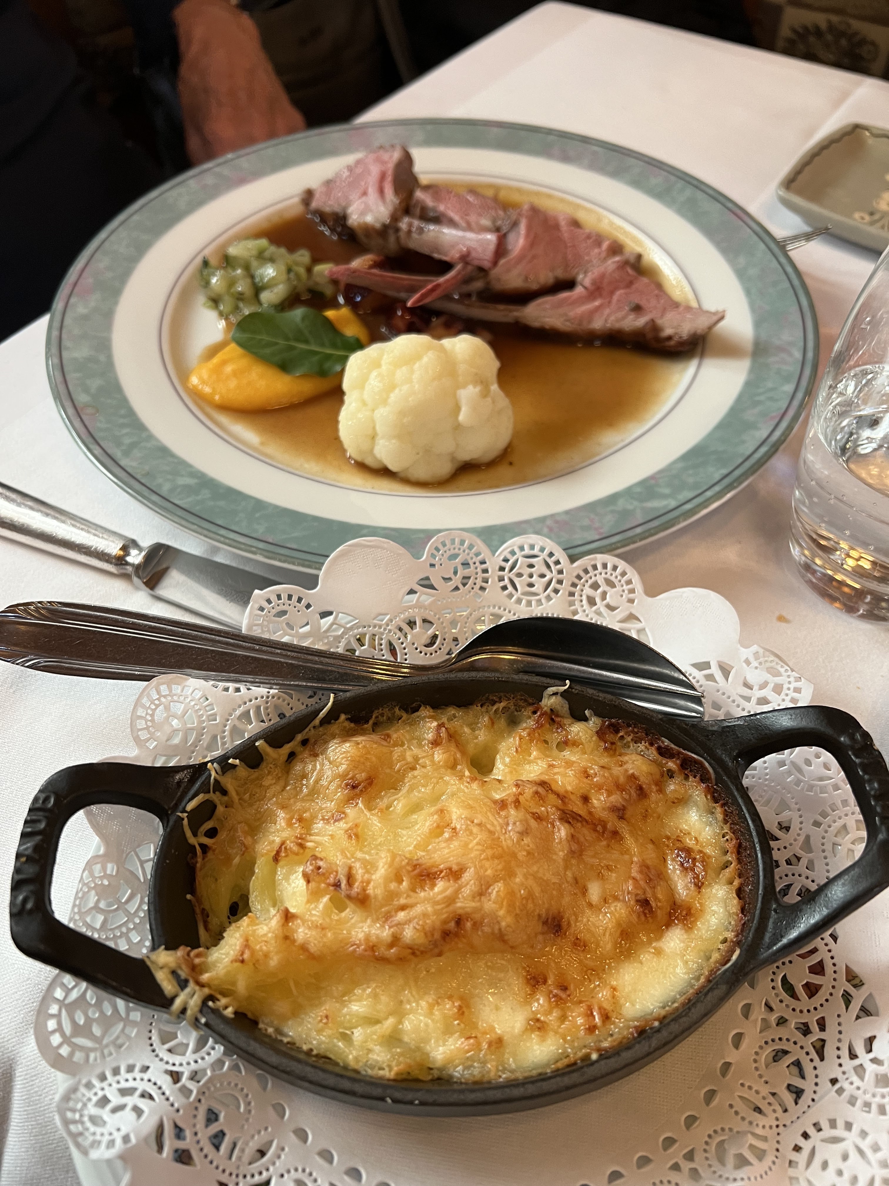 Restaurant traditionnel établi de longue date, sans fioritures ni chic. Excellents carrés d'agneau. Jolie terrasse au calme. Service amical, ohbe faux service sourire