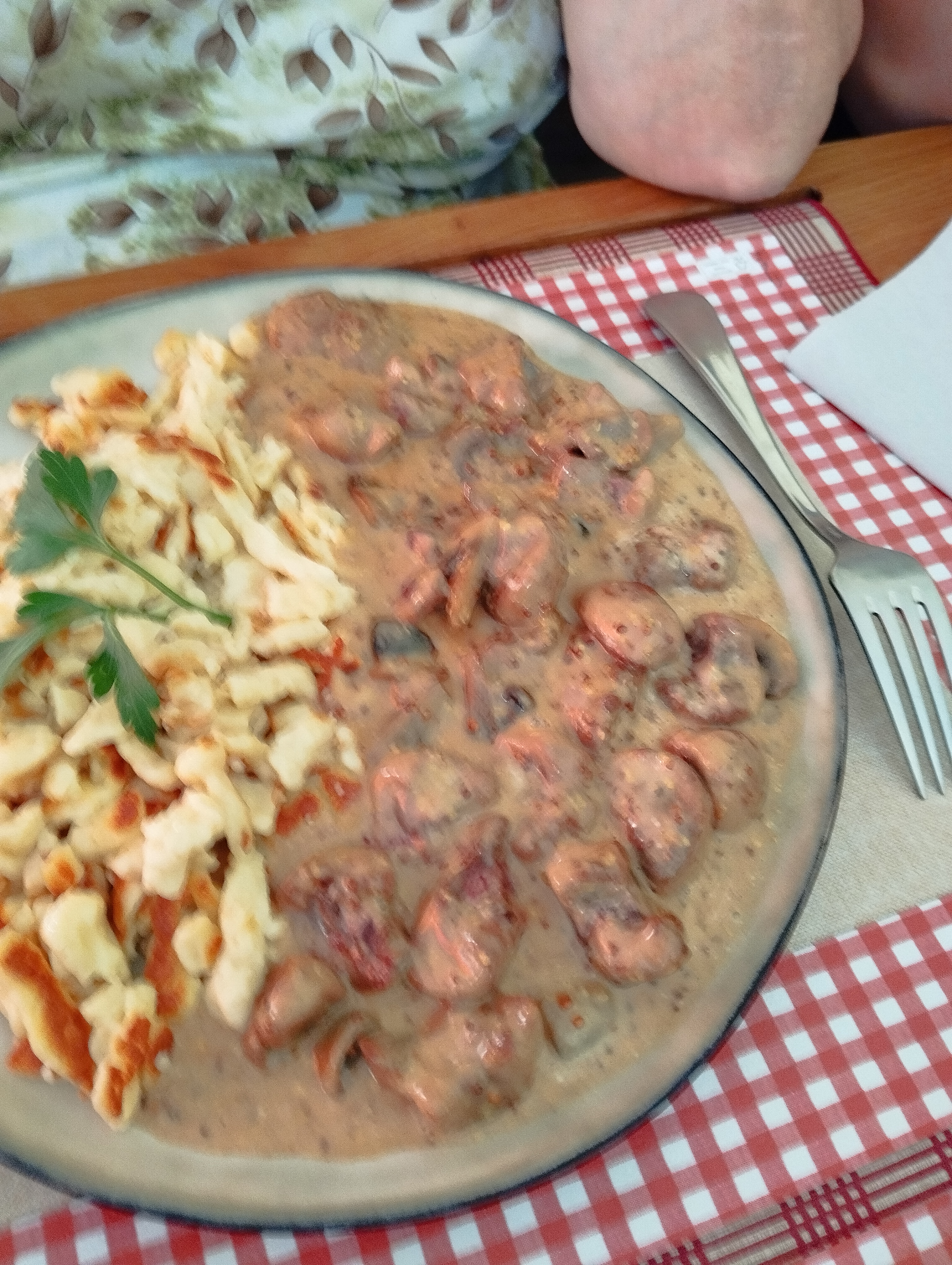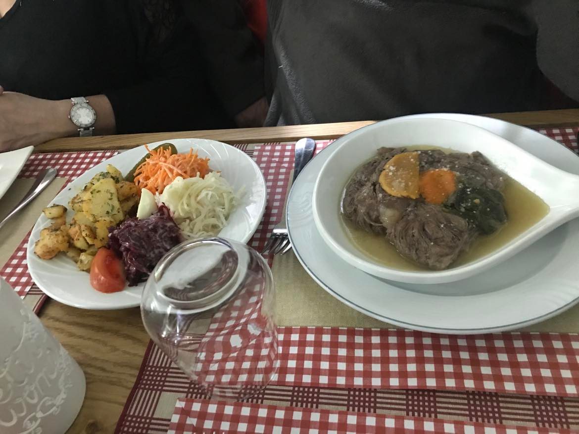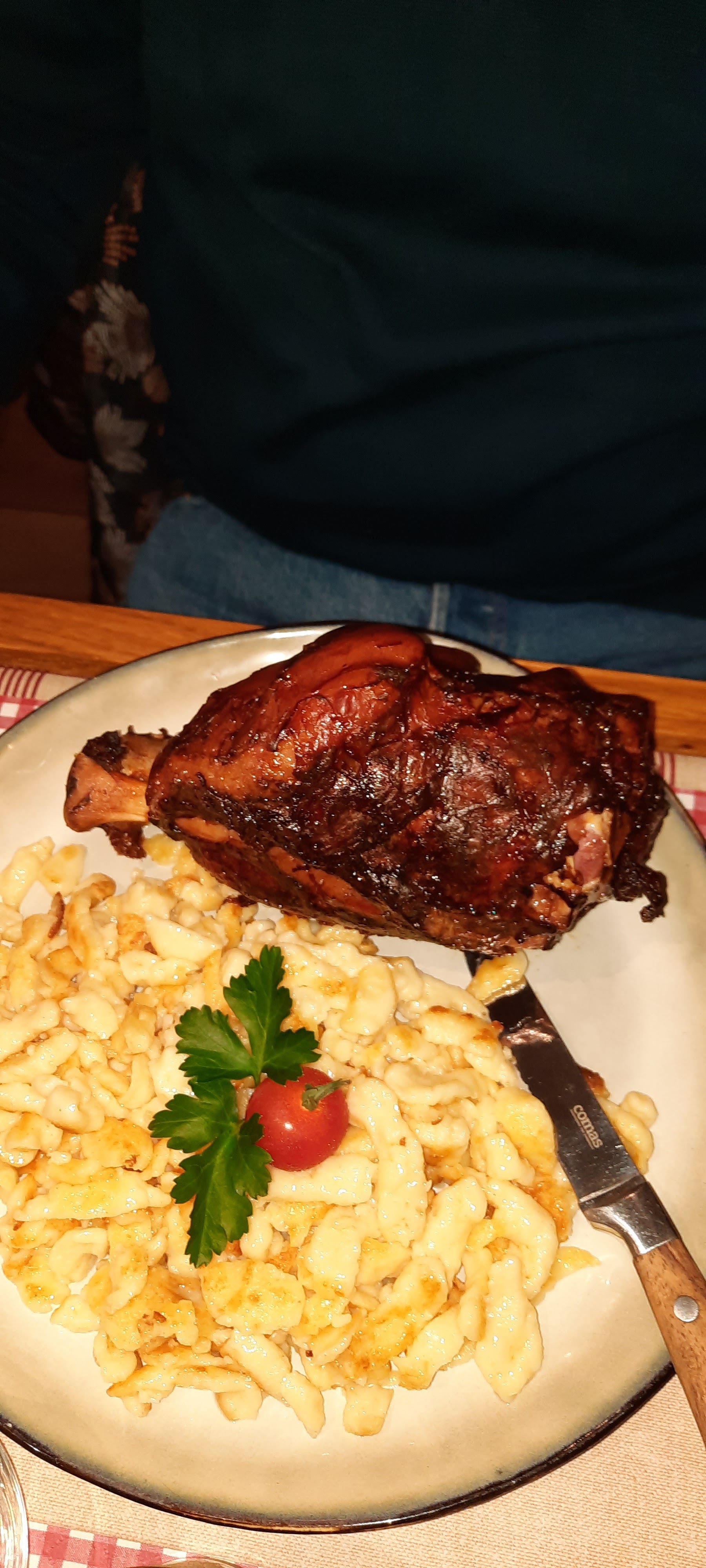 Restaurant très sympathique. L'accueil était très bien et les serveuses aussi. On a pris une cuisse de volaille farcie et un dos de porcelet rôti avec des spaetzle et des frites. Le tout avec sauce forestière, c'était vraiment très bon et très bien servi. En dessert un vacherin et une torche marron. Pareil très bon et copieux.