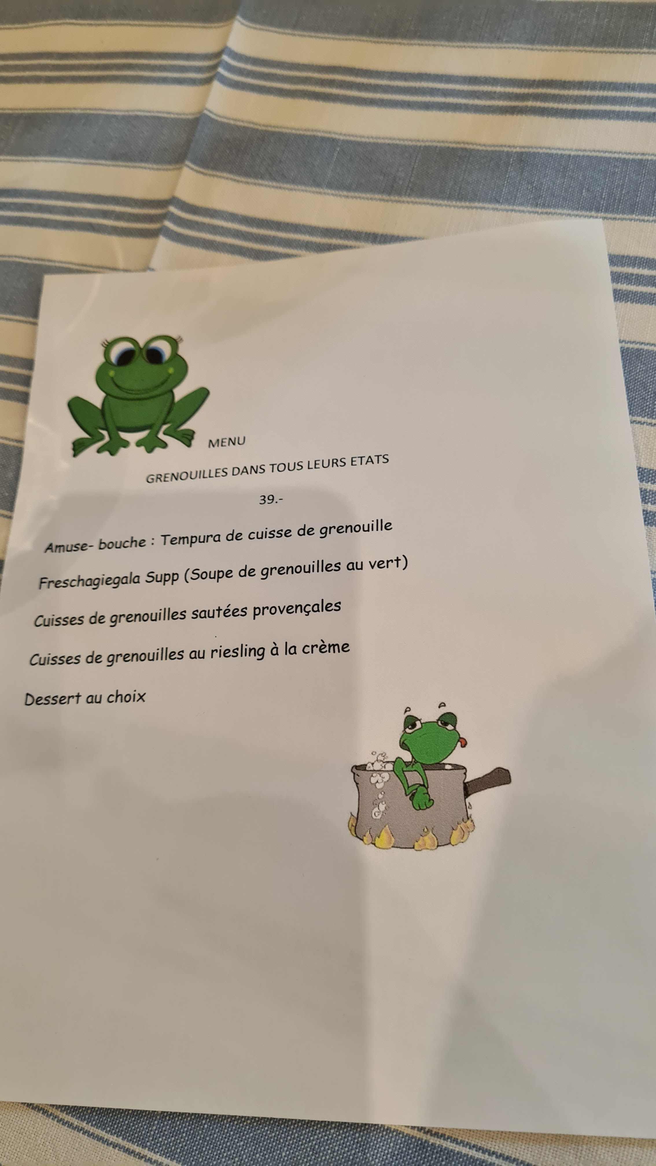 Thème :grenouilles à toutes les sauces.Depuis le potage,à la provençale (c'est à dire ail,persil beurre), à la crème et riesling. Bien préparées dans un cadre sympa.