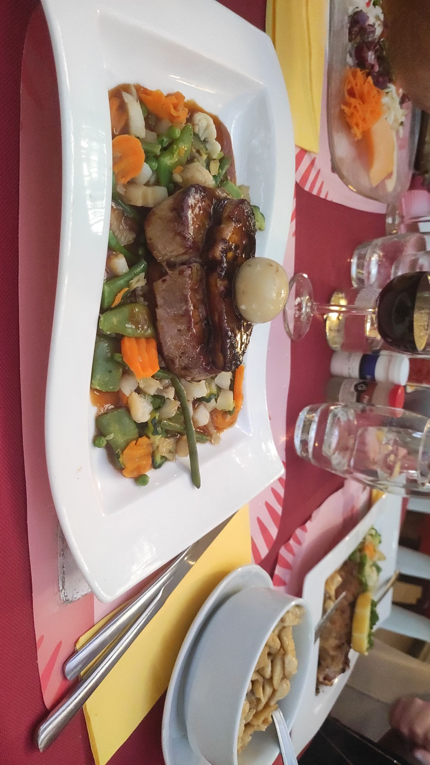 Viande et légumes succulents. Il faudrait un peu plus de sourires.