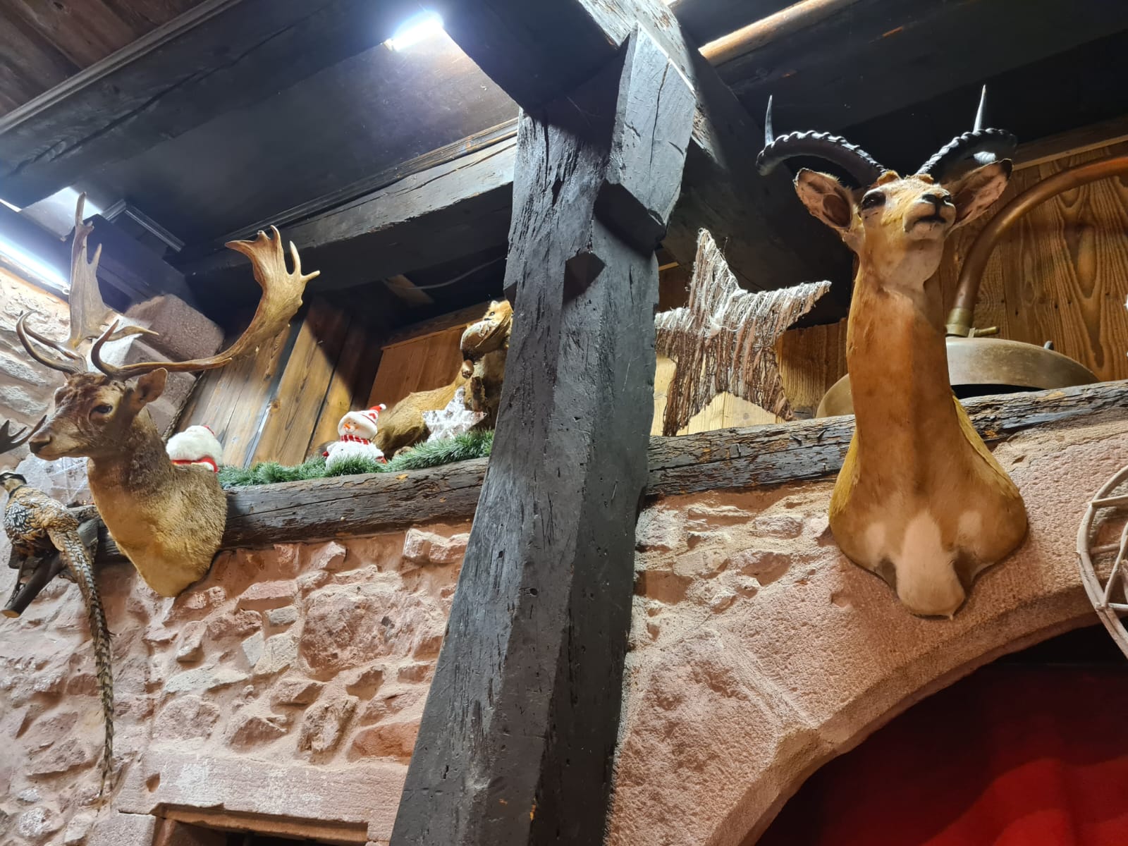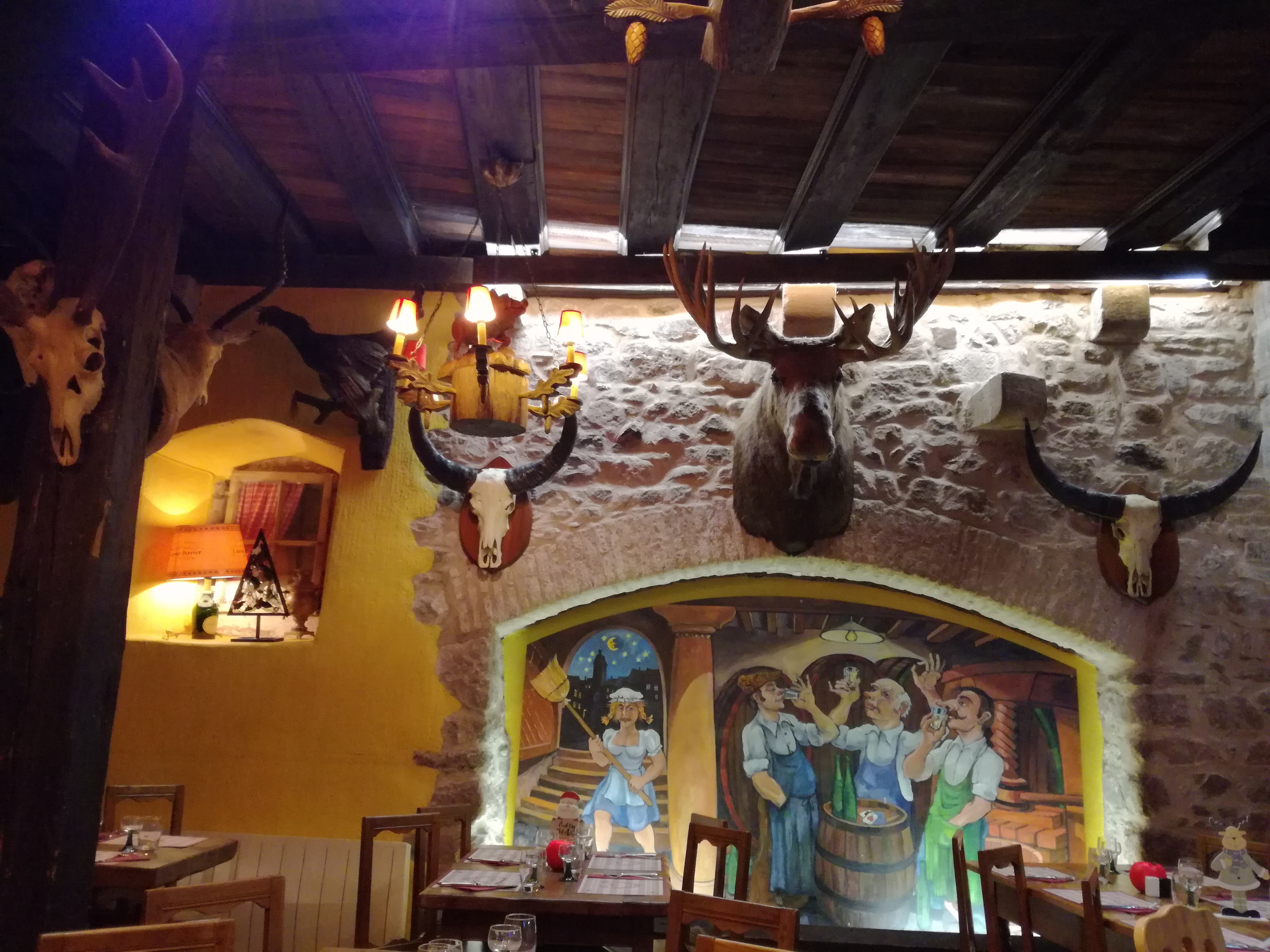 Nous avons déjeuner dans le restaurant au tire bouchon. On vous installe à l'arrière dans une salle avec une bonne 10ene d'animaux empaillés. La carte propose principalement des plats alsaciens, toutefois nous avons été très déçus de la choucroute (kassler ultra gras, choucroute fade...). Ma femme avait pris du poisson et c'était également décevant. Le service était toutefois sympathique même si la pauvre serveuse était rapidement débordé à devoir gérer une 10ene de table seule