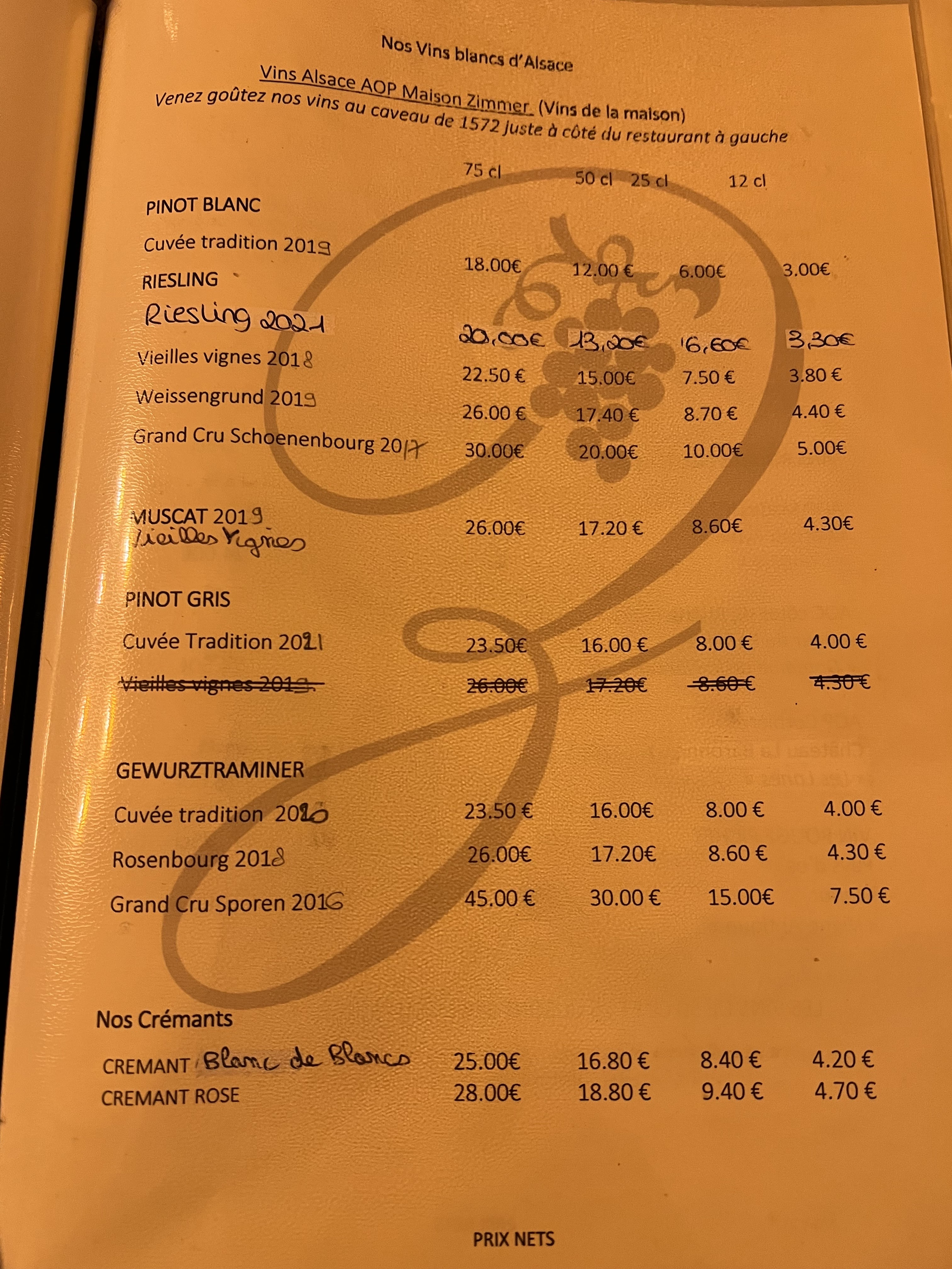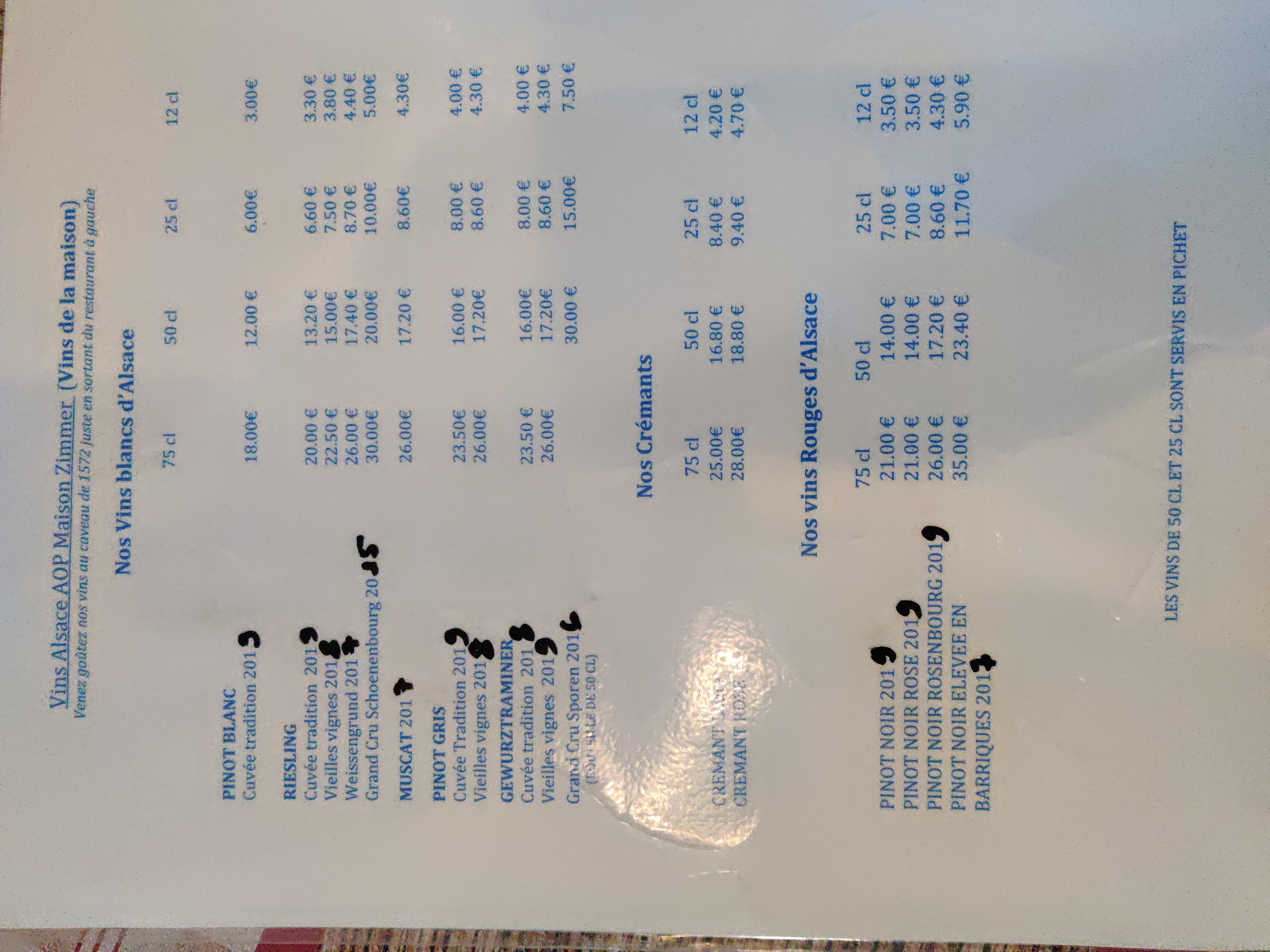Bon plats typiques du terroir entre autre. Découverte du caveau Zimmer dont le Riesling grand cru schoenenbourg élevé en barriques 2015 est excellent, de même pour le Gewurztraminer grand cru sporen 2015. J'y retournerai