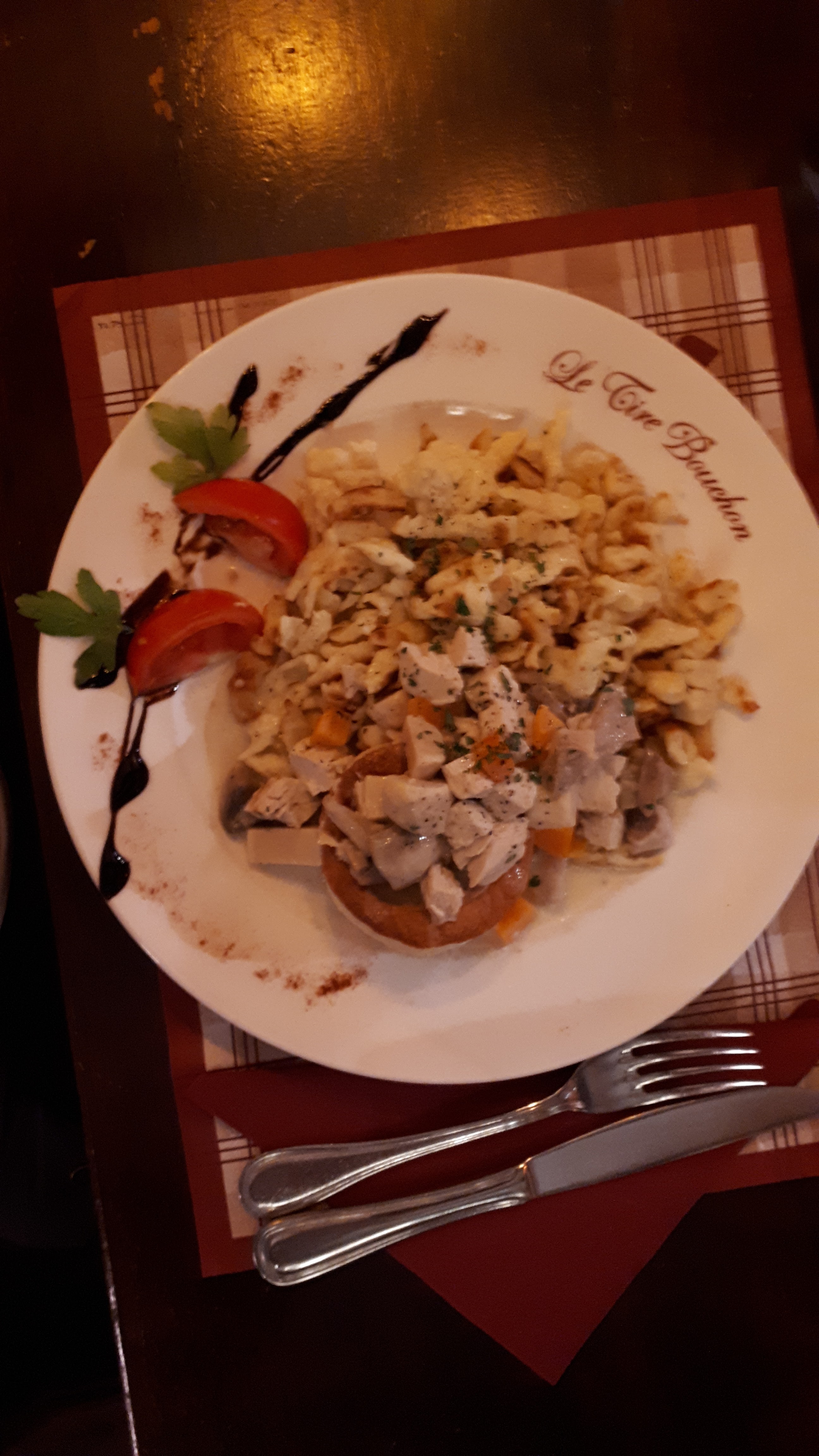 Petit repas dans a pris dans son restaurant avec un cadre charmant et puis des têtes d'animaux plein les murs salade vigneronne poulet au riesling avec des pâtes alsacienne et nougat glacée. Service correct