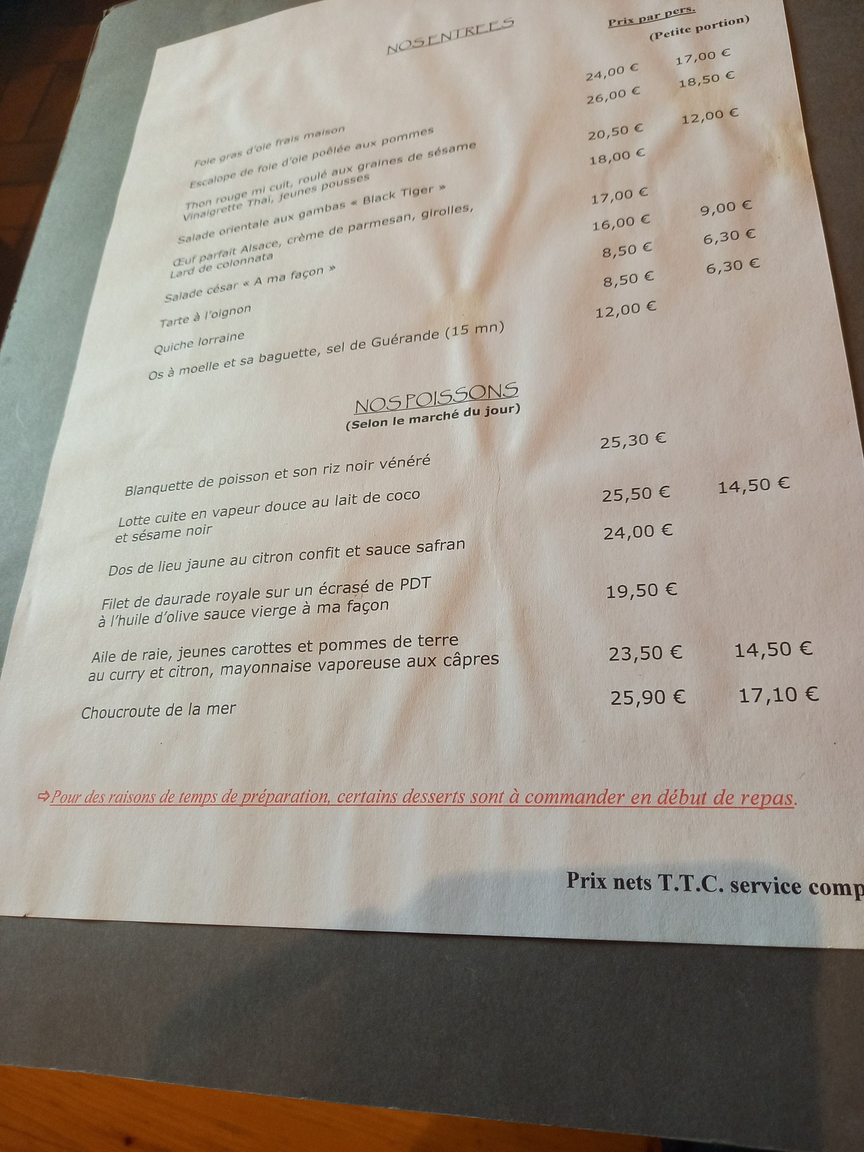 Très déçus par ce restaurant qui nous avait beaucoup plu par le passé. Des rognons à peine cuits dont certains oxydés Une choucroute de poissons servie tiède. Le dessert annonçait une torche aux marrons.... De la chantilly en bombe mais le tour, au lieu de reposer sur une meringue, se trouvait sur un banal biscuit à la cuiller. Je déconseille.