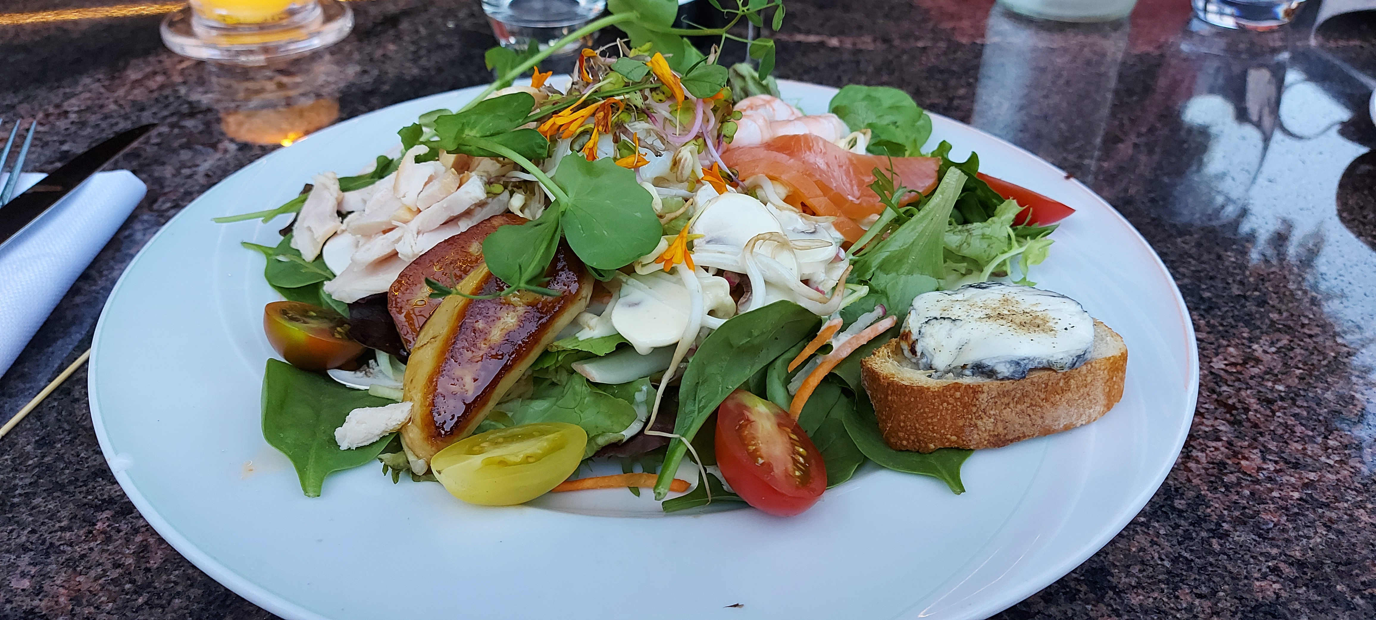 Excellente cuisine et service irréprochable. Petit bémol, mais c'est un avis personnel, manger à l'extérieur sur du marbre refroidi l'ambiance . À part ce détail, le reste est parfait