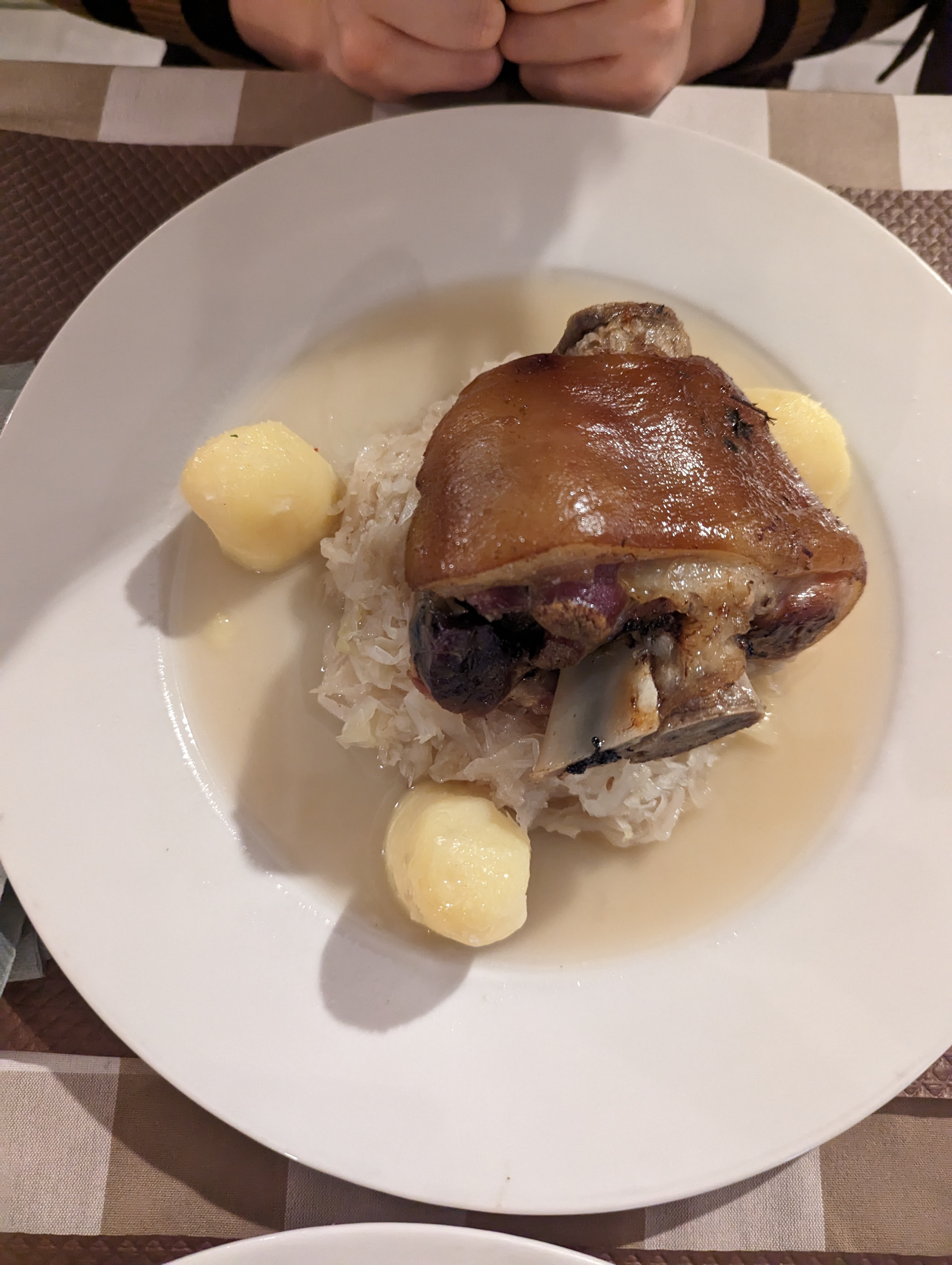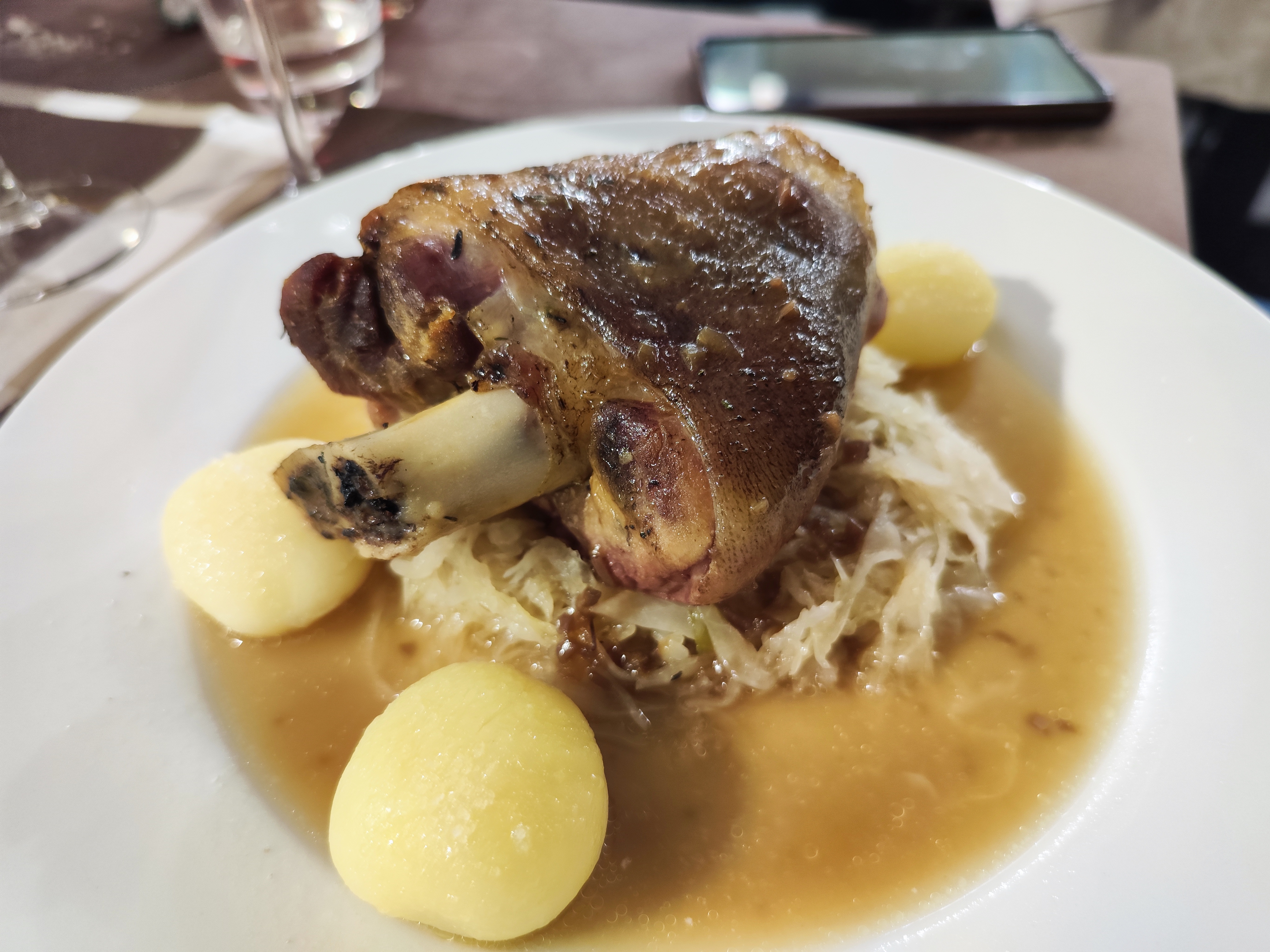 Catastrophique à tous les niveaux. Le meilleur était le jus de tomate et la moutarde. Un restaurant historique qui s'est apparemment transformé en piège à touriste. Serveurs pas du tout souriant et accueillant (et en jogging !!!). Jarret braisé qui était un jarret sorti du congélateur et cuit à l'eau, peau élastique immangeable et viande dure, complètement fade. Accompagné de choucroute en boite et de 3 pommes de terre à l'eau.