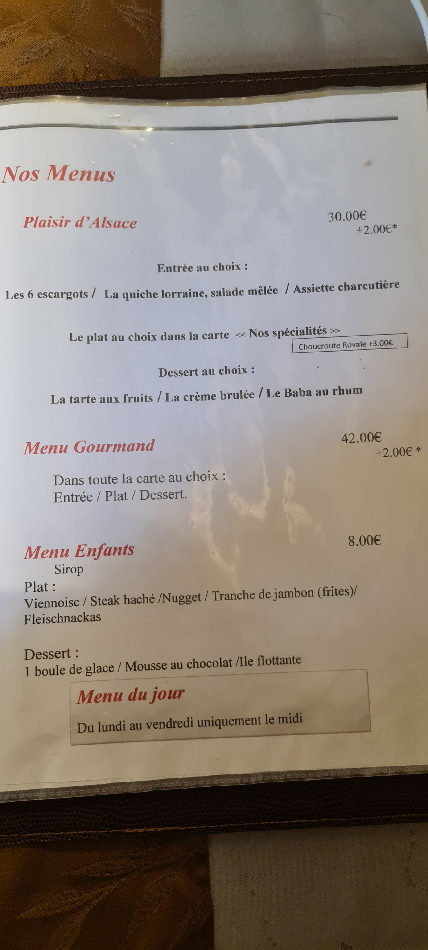 Nourriture pas mal, même si j'ai un doutes sur les à côtés.. mais j'ai été surprise de plusieurs choses : attente SUPRA MÉGA LONGUE. Service (Monsieur) pas souriant ni agréable.. Voir détestable.. Et un client en fin de repas qui demande l'attention de tous les clients, et fait un discours sur le seigneur Jésus Christ en distribuant une petite bd sur Dieu.. Bref, c'était assez choquant. Je n'y retournerais plus, il y a de meilleurs restaurants alsaciens au centre ville