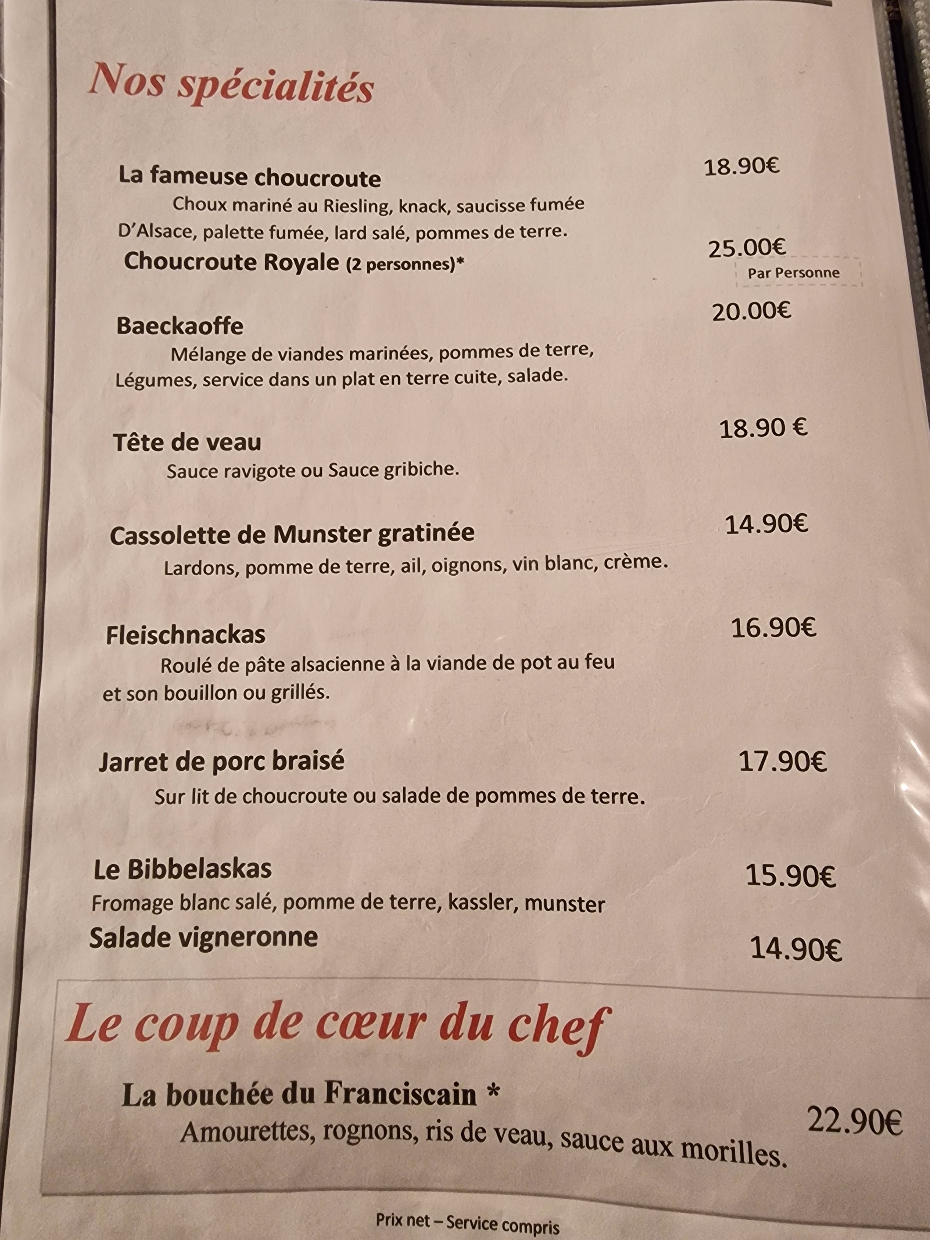 Rien n'a dire,nous avons chercher un resto spécialités alsacienne en dernière minute et l'auberge des Franciscains a bien voulu nous recevoir contrairement à d'autres que nous avions apeller,repas excellent,le serveur et la serveuse très sympathique,service rapide,rien a signaler,nous reviendrons