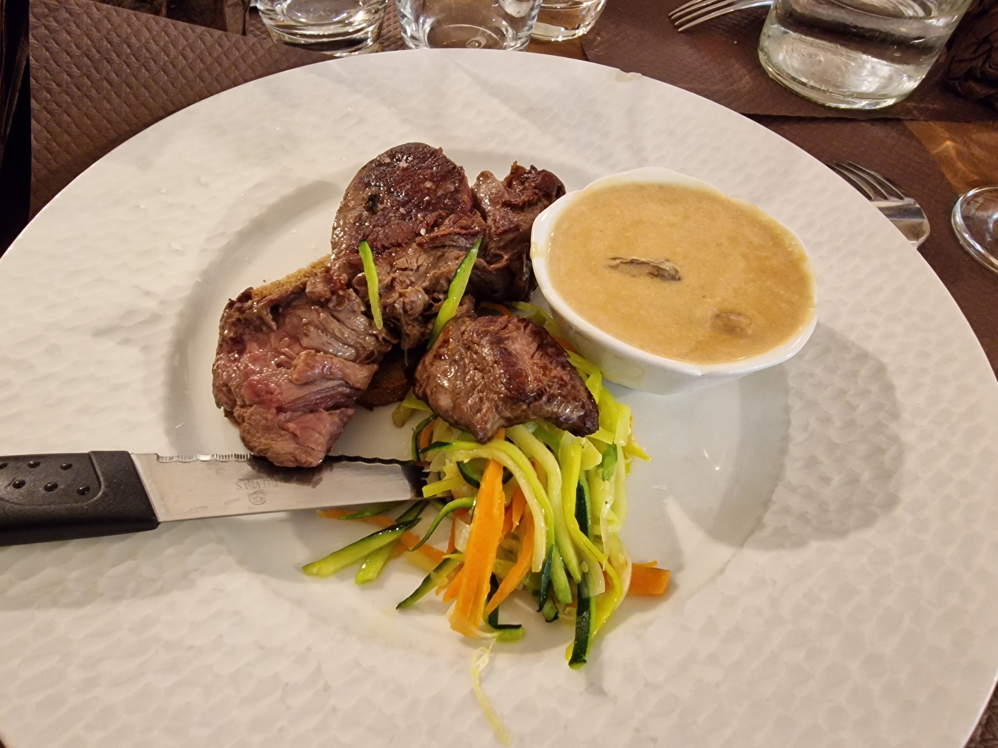 Viande succulente. Service agréable. Il y avait peu de monde le midi où nous avons déjeuné. Très agréable d'être ds une ambiance calme.