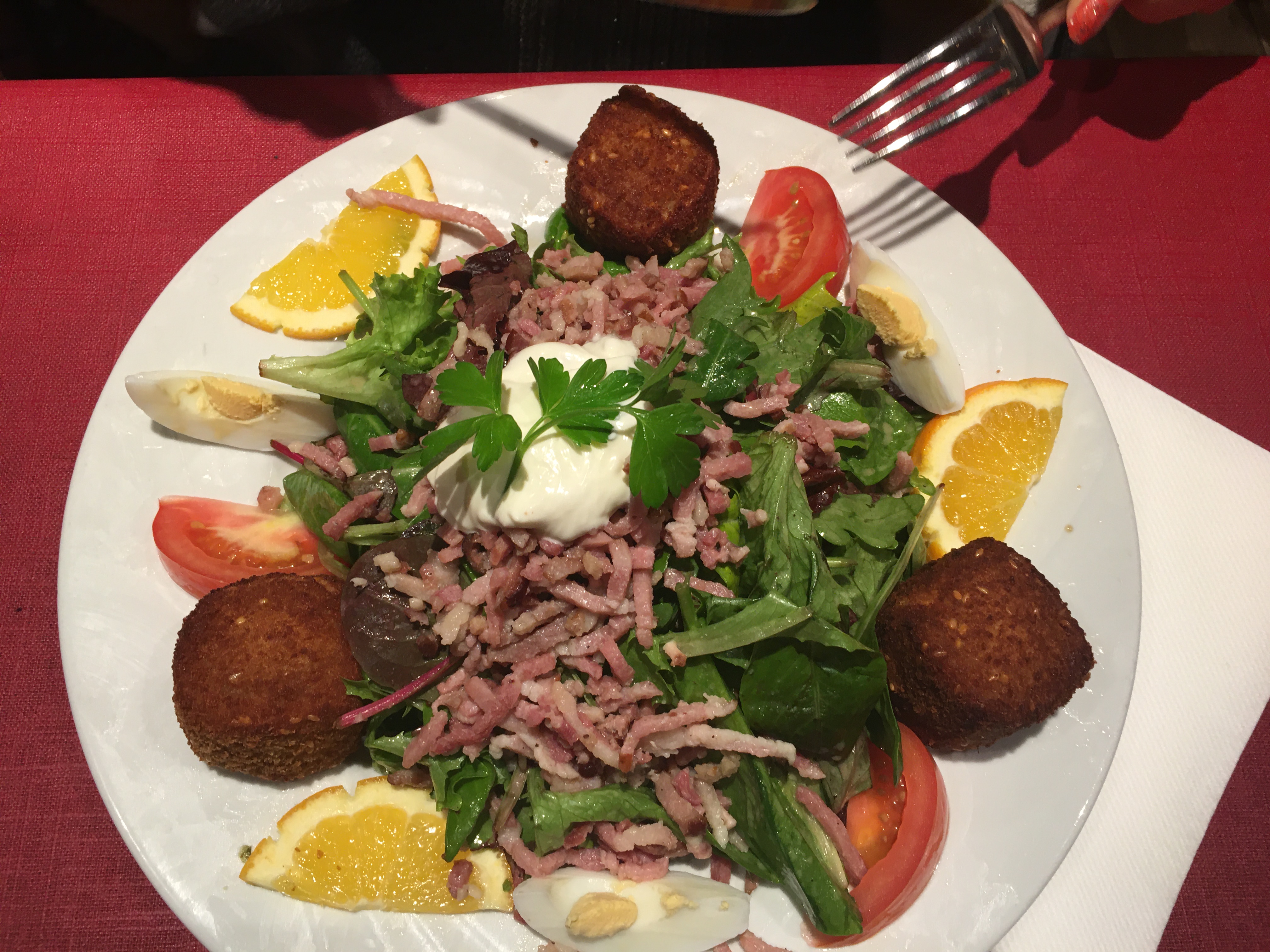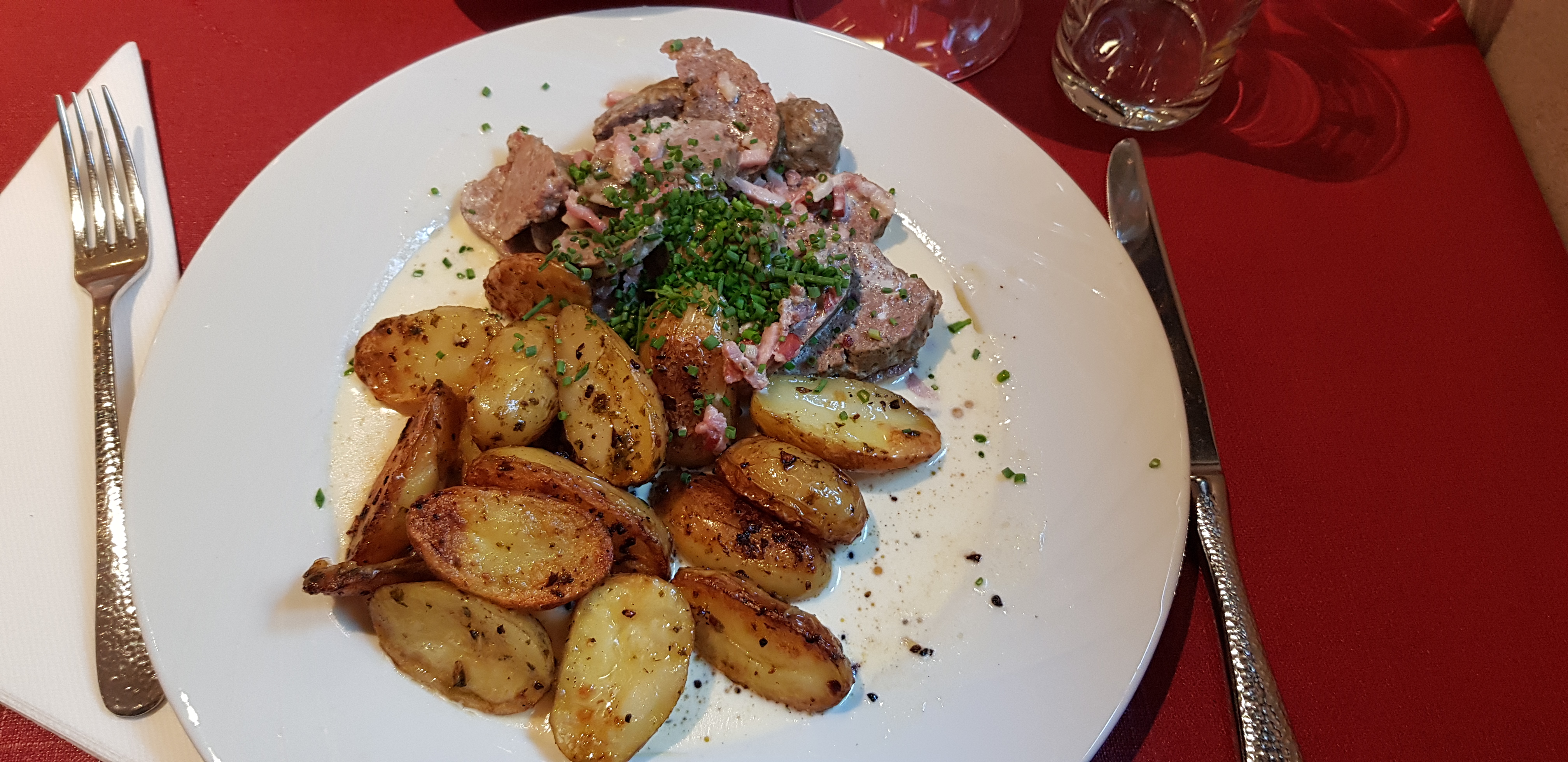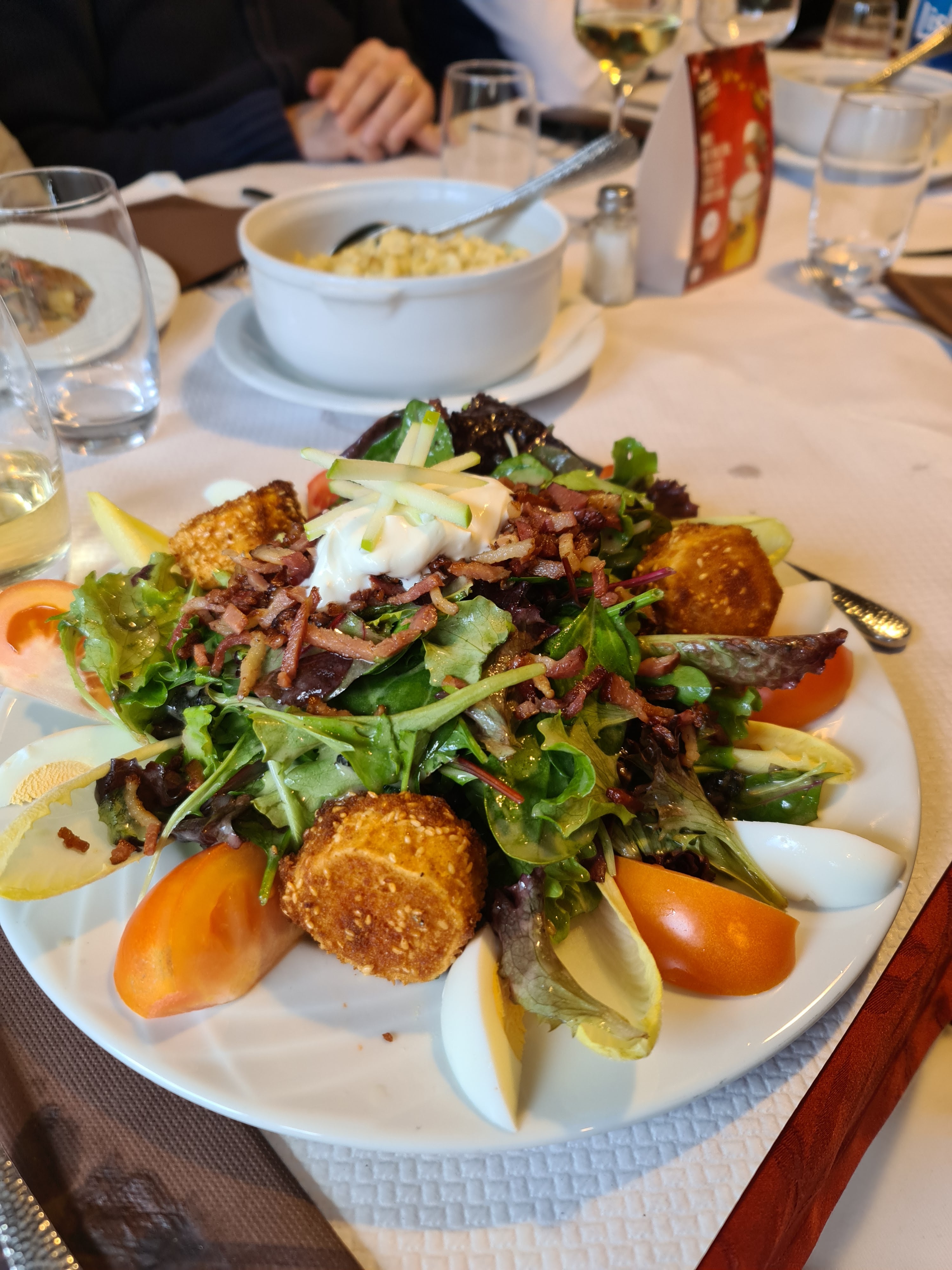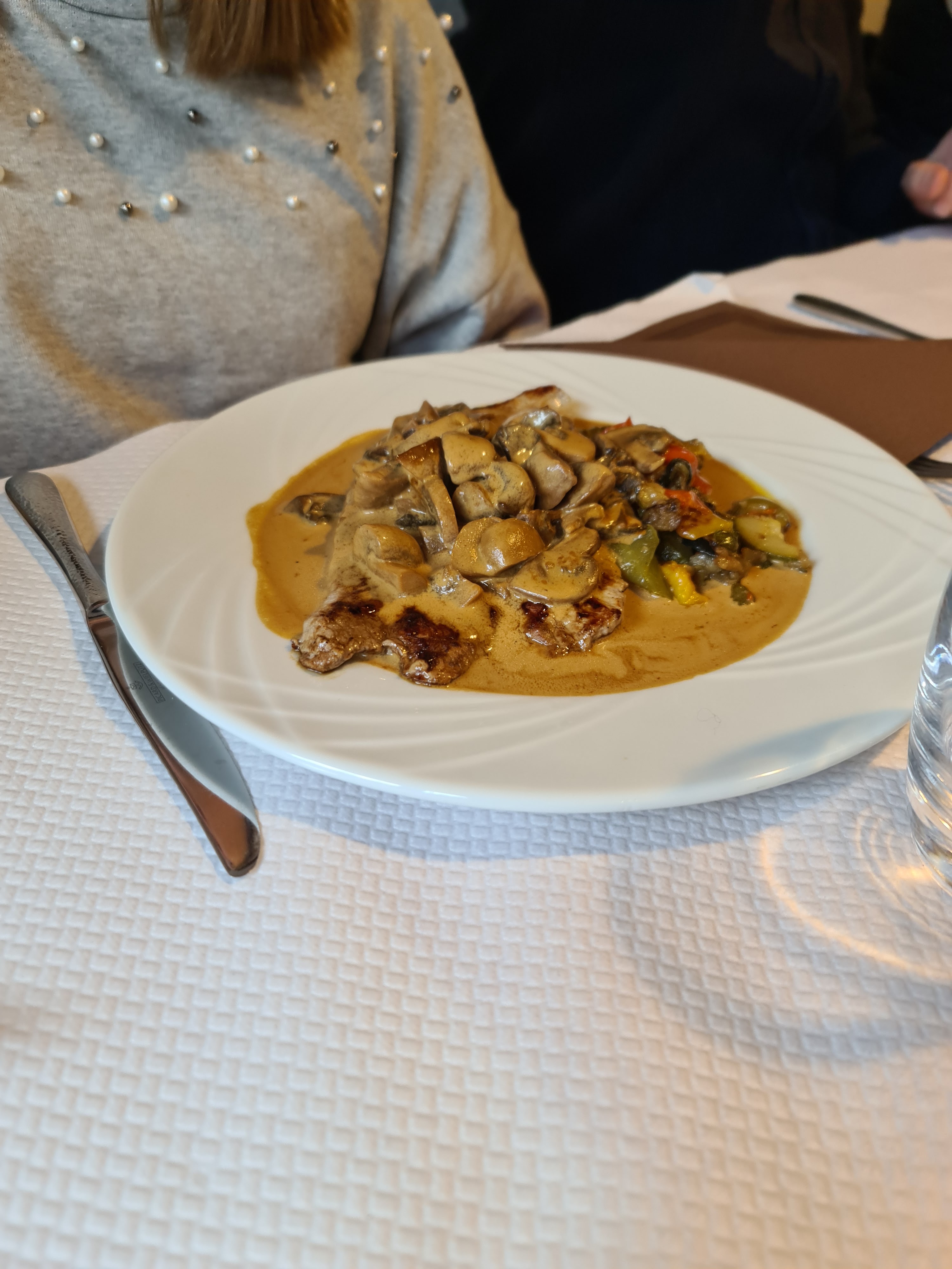 Bel accueil à l'arrivée alors que nous n'avions pas réservé de table. Les quenelles de foie étaient bonnes. Quantité limitée (l'astuce, elles étaient coupées en lamelles) La crème était un peu liquide et peu crémeuse. Belle tranche de jambon pour le menu enfant.