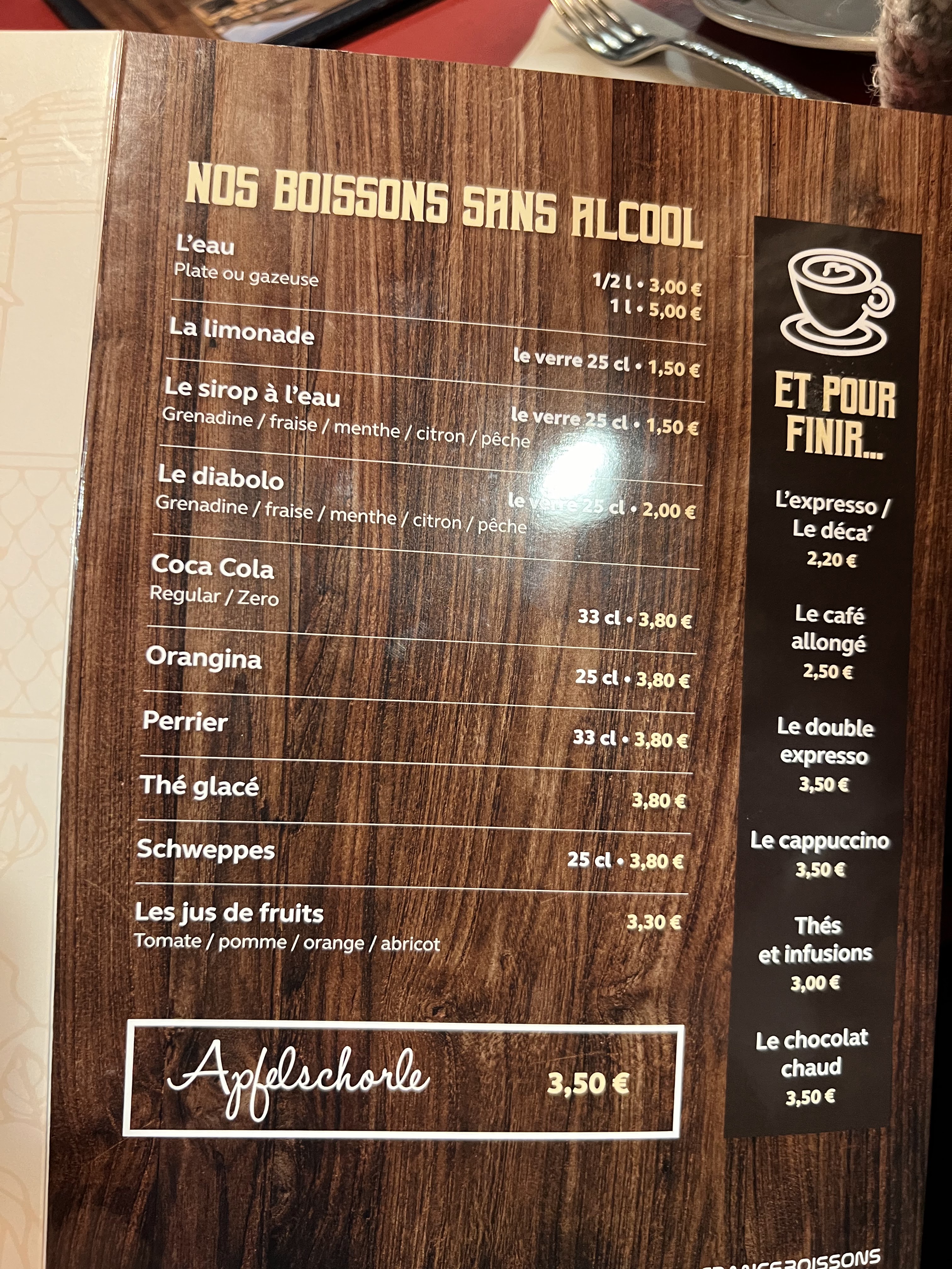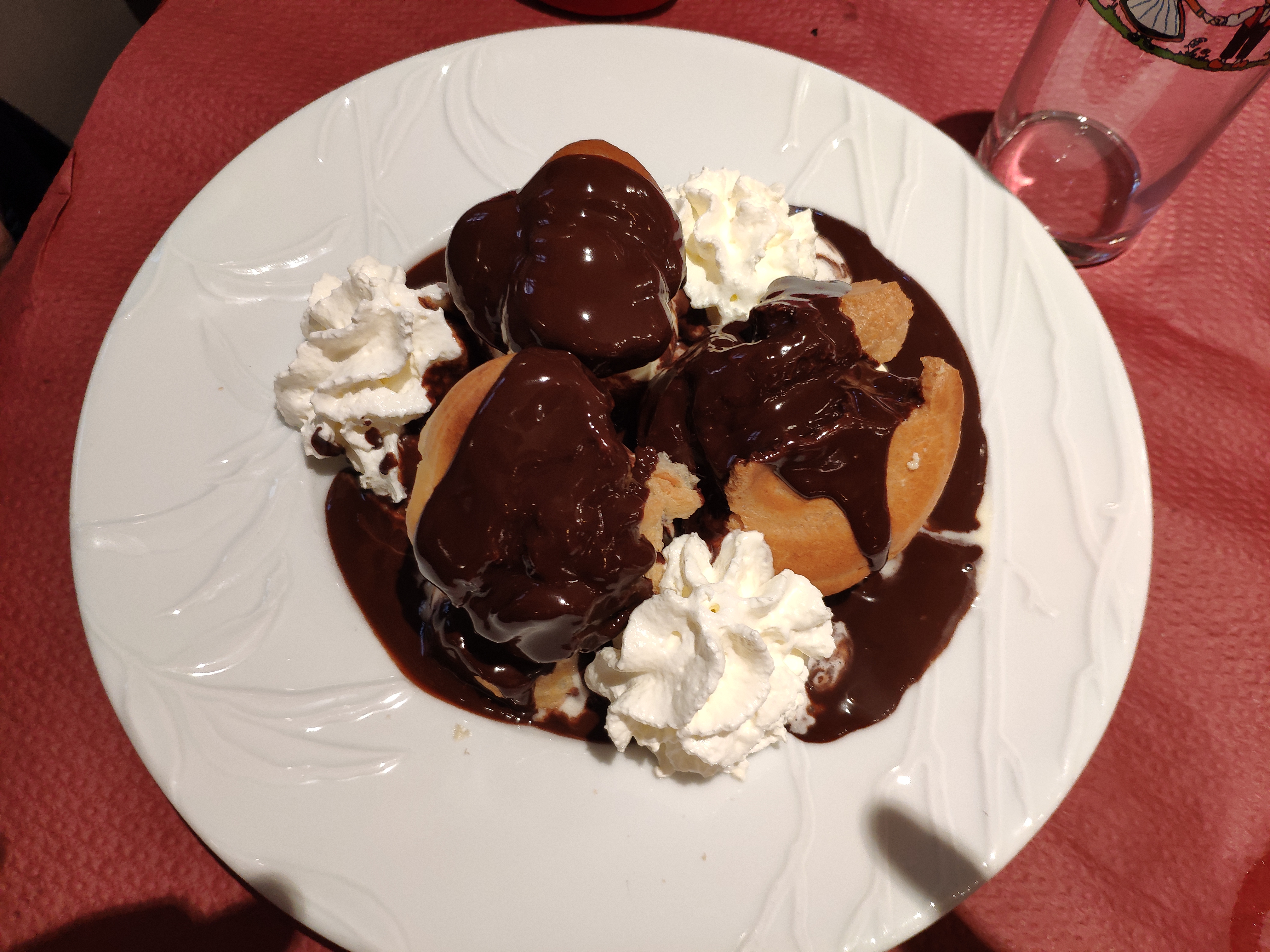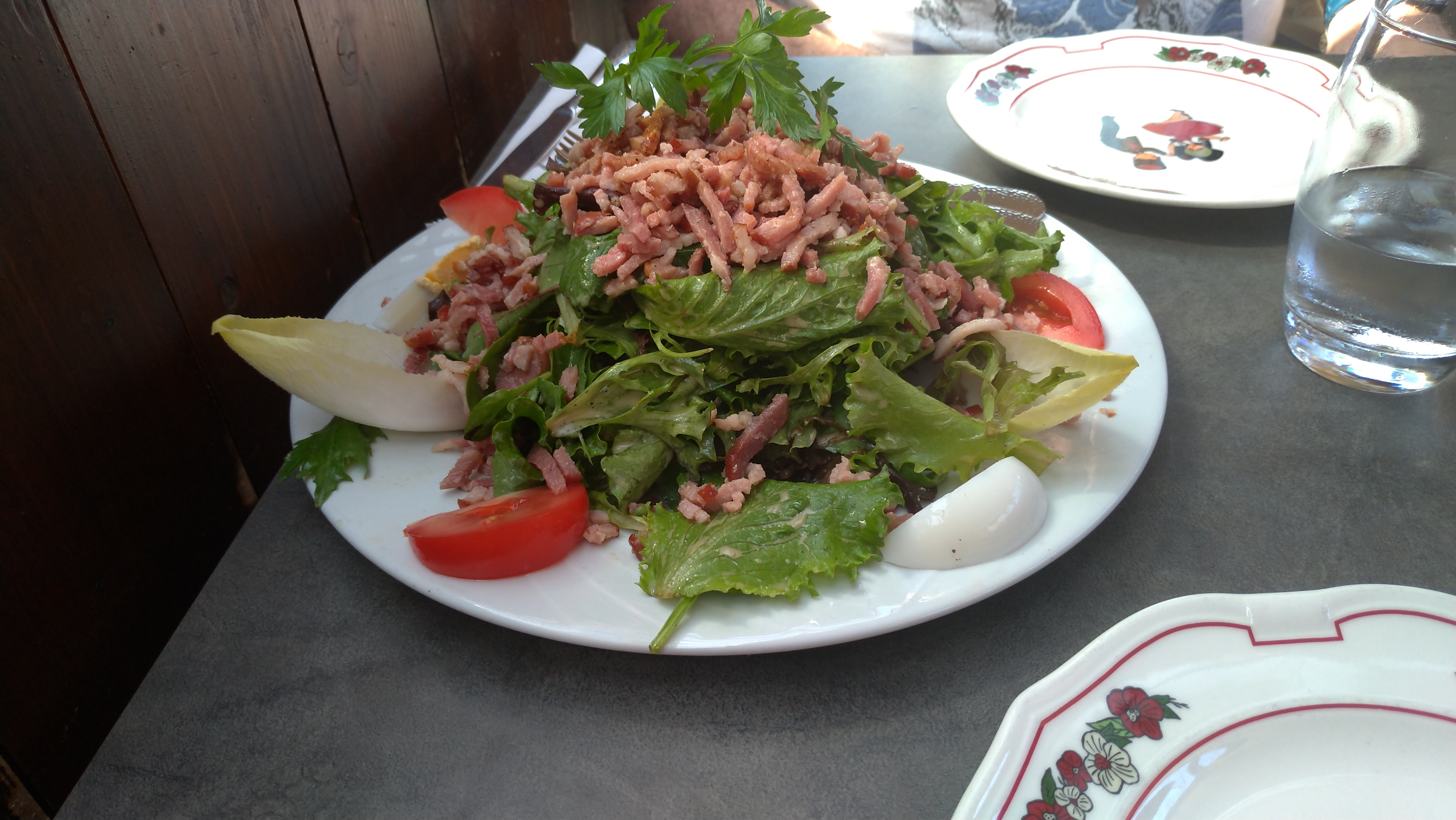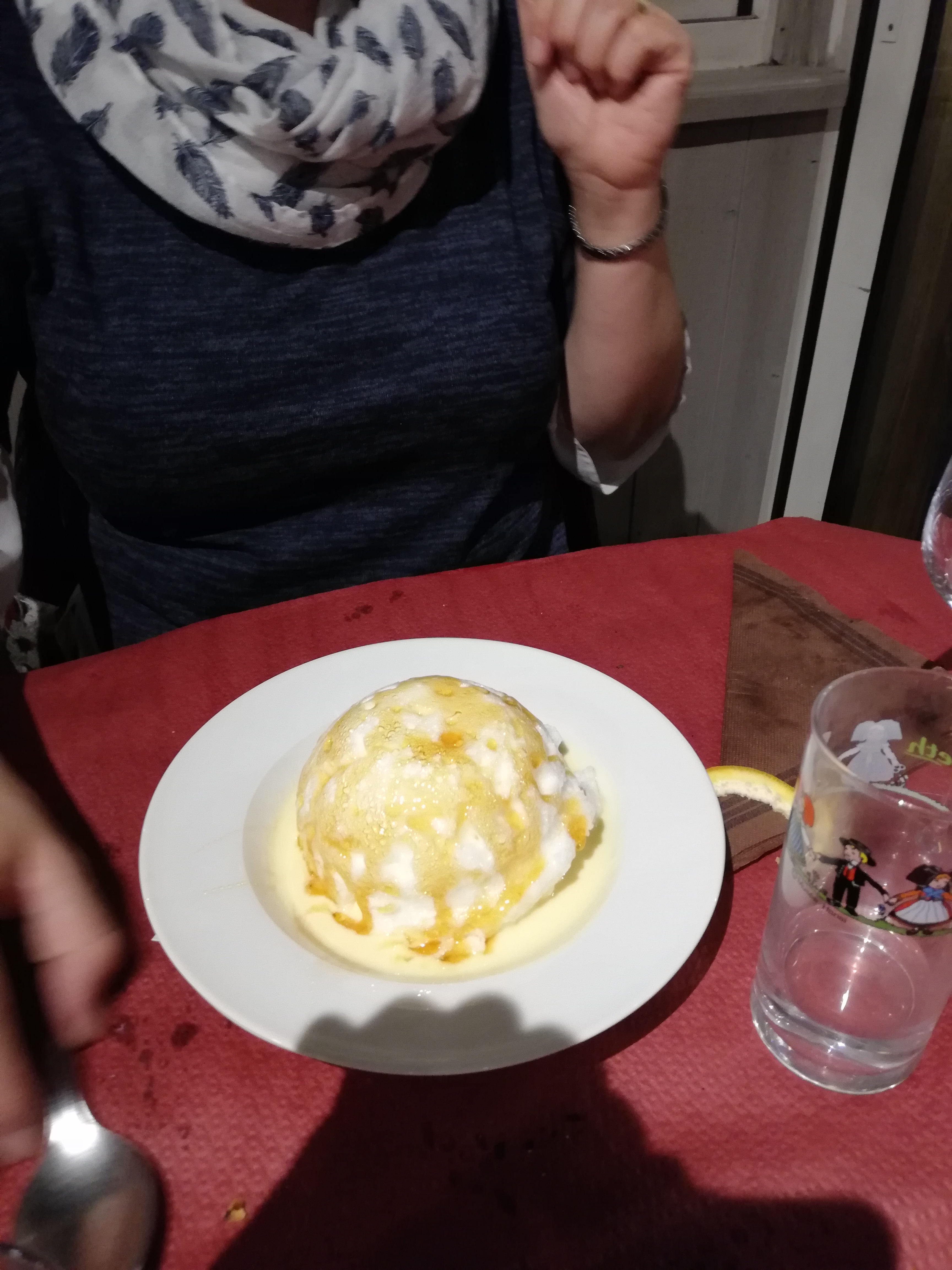 Bel accueil à l'arrivée alors que nous n'avions pas réservé de table. Les quenelles de foie étaient bonnes. Quantité limitée (l'astuce, elles étaient coupées en lamelles) La crème était un peu liquide et peu crémeuse. Belle tranche de jambon pour le menu enfant.