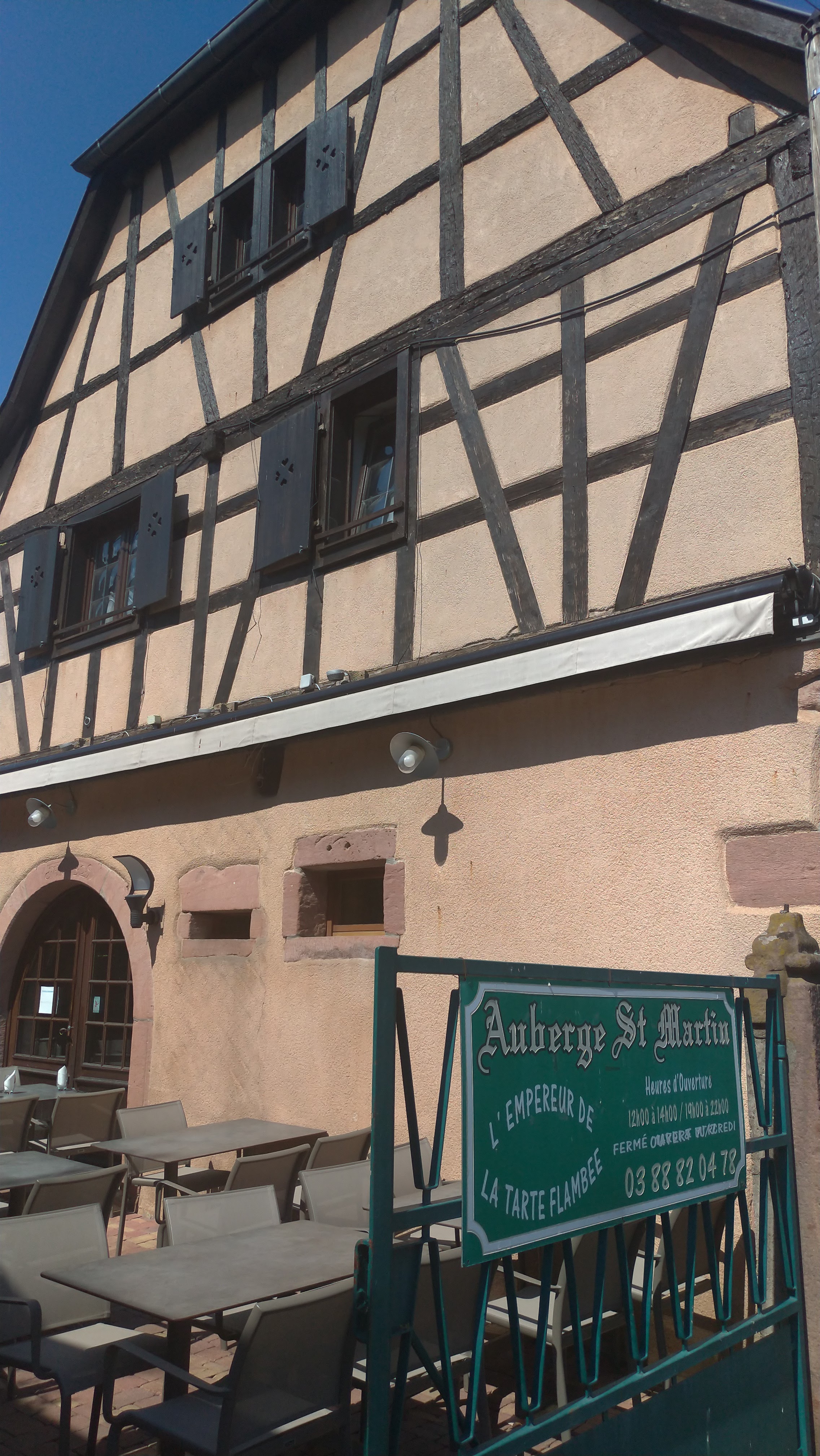 Visite avec notre fils de 4ans a la volerie des aigles a kintzheim. C'était super....afin de déjeuner réservation pour midi à l' auberge Saint Martin. Nous sommes arrivés a 11h36 , il faisait beau et chaud 32 degrés sur la parking du restaurant. Je rentre sur la terrasse en me présentant pour la réservation et en demandant la possibilité de m'asseoir avec mon fils en attendant l'heure du service de 12h00 pile. La patronne en train de déjeuner avec son personnel me répond il n'est pas midi, le service est a midi., Je lui explique qu avec un petit c'est plus facile d attendre assis a l' ombre sur la terrasse. Elle me répond avec beaucoup d'autorité, mais vous vous rendez compte si tout le monde veut s assoir comme vous. Bref discussion puérile et d'aucune utilité. Nous avons donc annulé la réservation. Je ne demandais pas à être servi juste a l abri de la chaleur et assis pour le petit. Un grand merci pour cette leçon de compassion et d humanité a cette patronne ainsi que d amabilité. Vive les restaurants touristiques et leur manne financière car ce n'est pas grace a son sens commercial que cette patronne arrive à faire tourner ce restaurant.