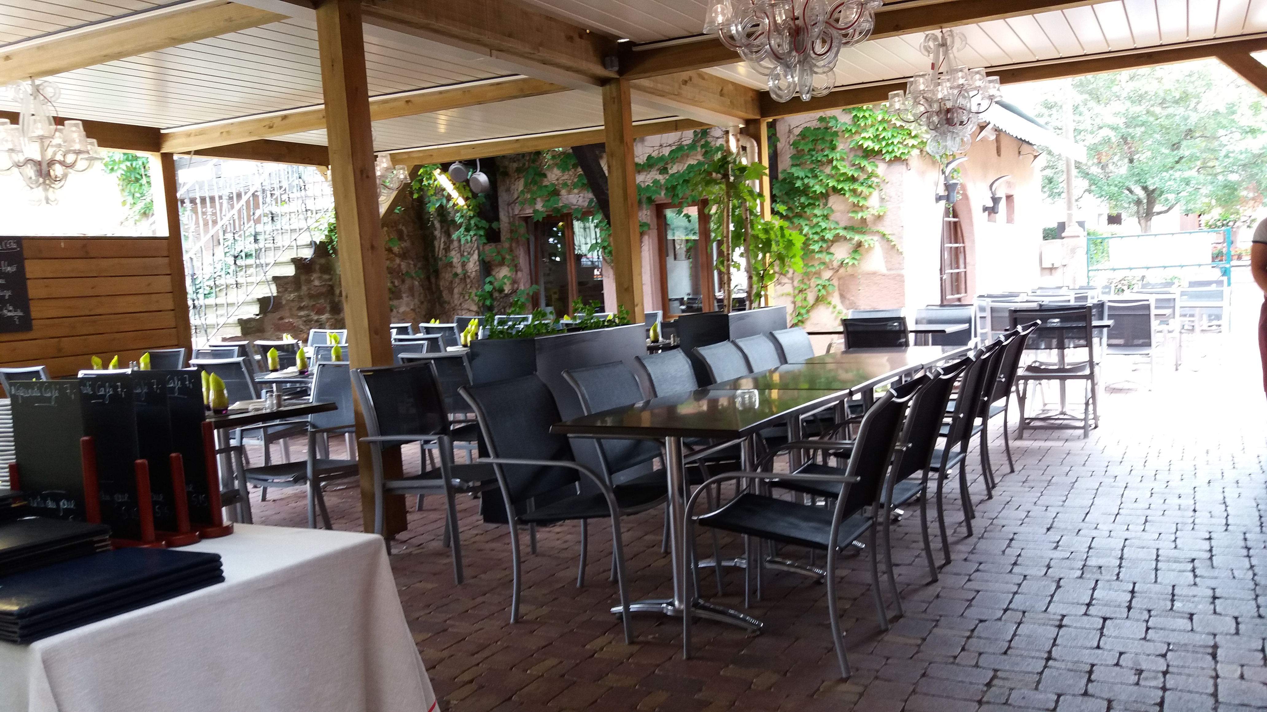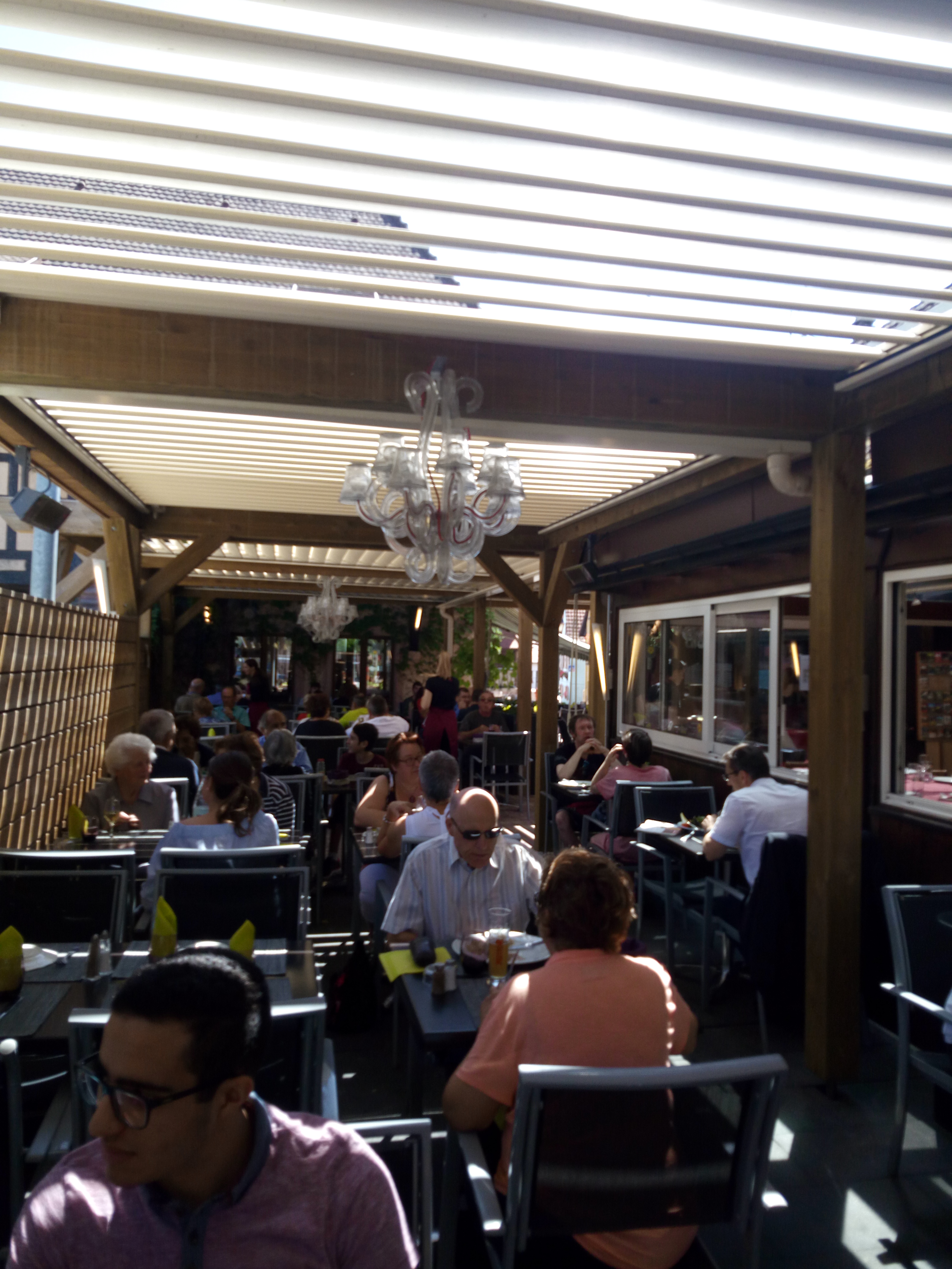Terrasse ombragée avec de très bonne tartes flambées, service au top
