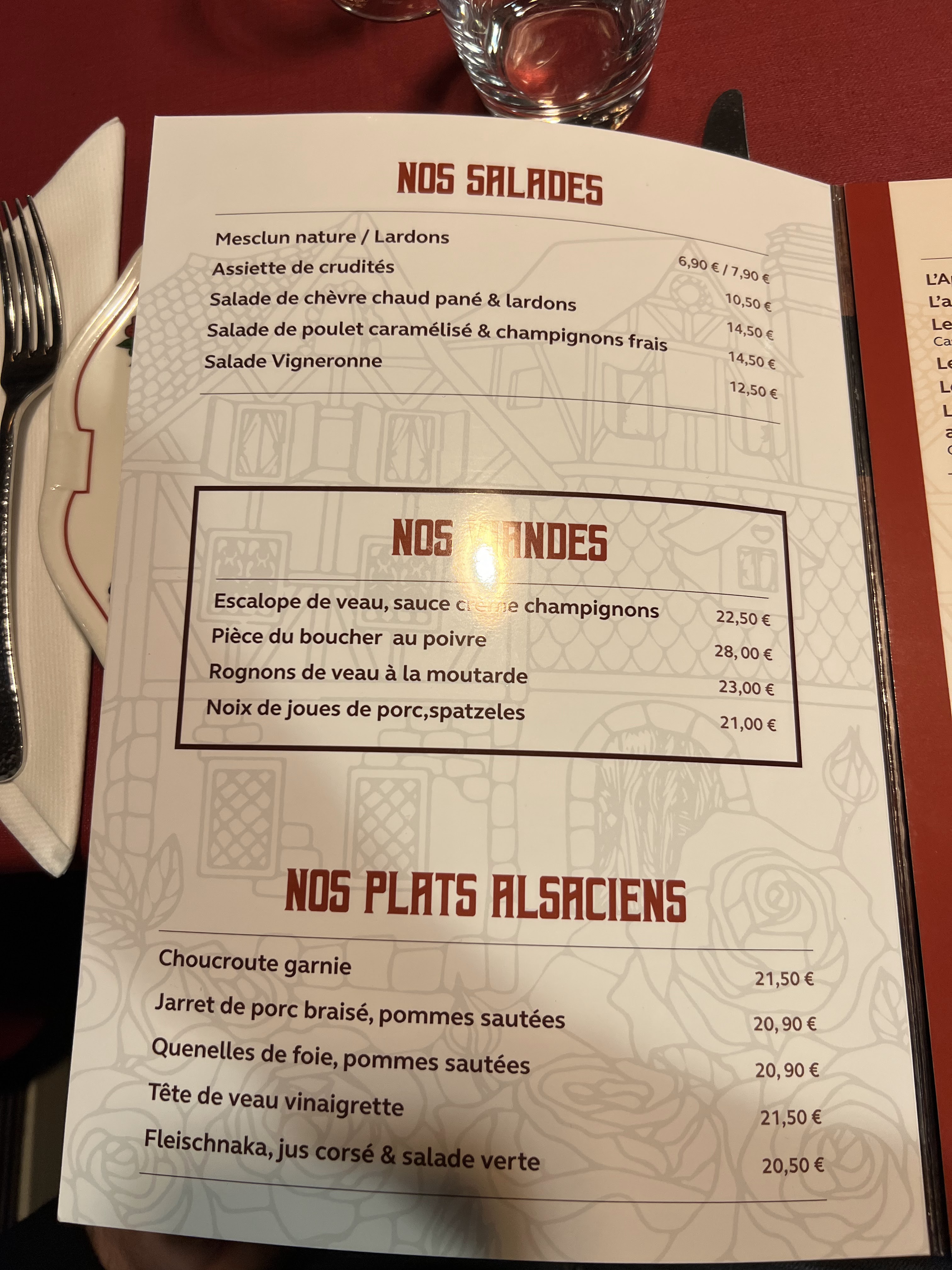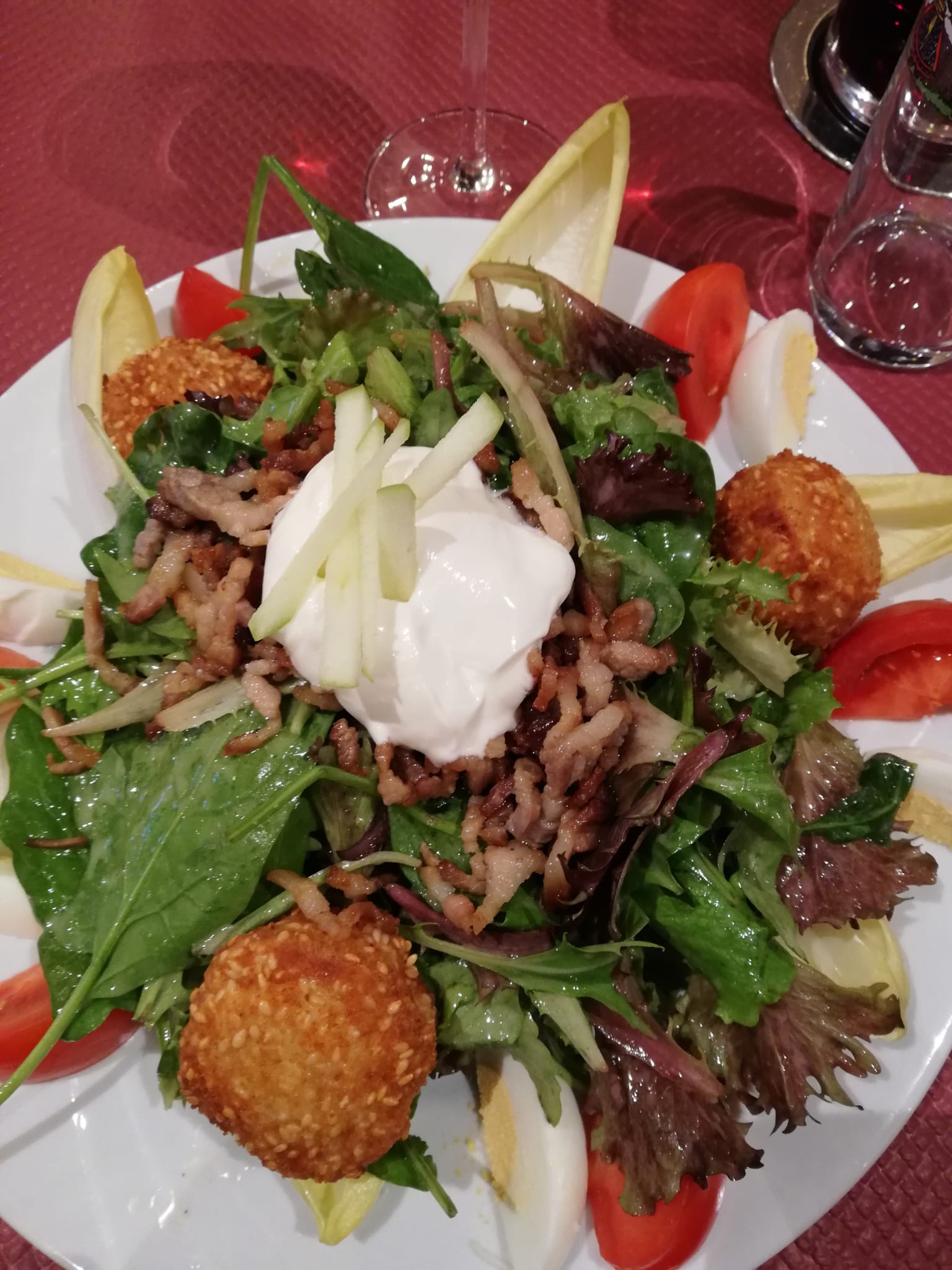 Le cadre est typiquement alsacien et le service au top. Je n’ai pas mis 5/5 à la cuisine car j’ai trouvé une plume au milieu de mon cordon bleu , cela prouve certes que ce sont des plats faits maison mais je suis contente de l’avoir vue avant de mettre la fin de mon repas à la bouche. La salade chèvre chaud est très copieuse toutefois et nous nous sommes régalés.