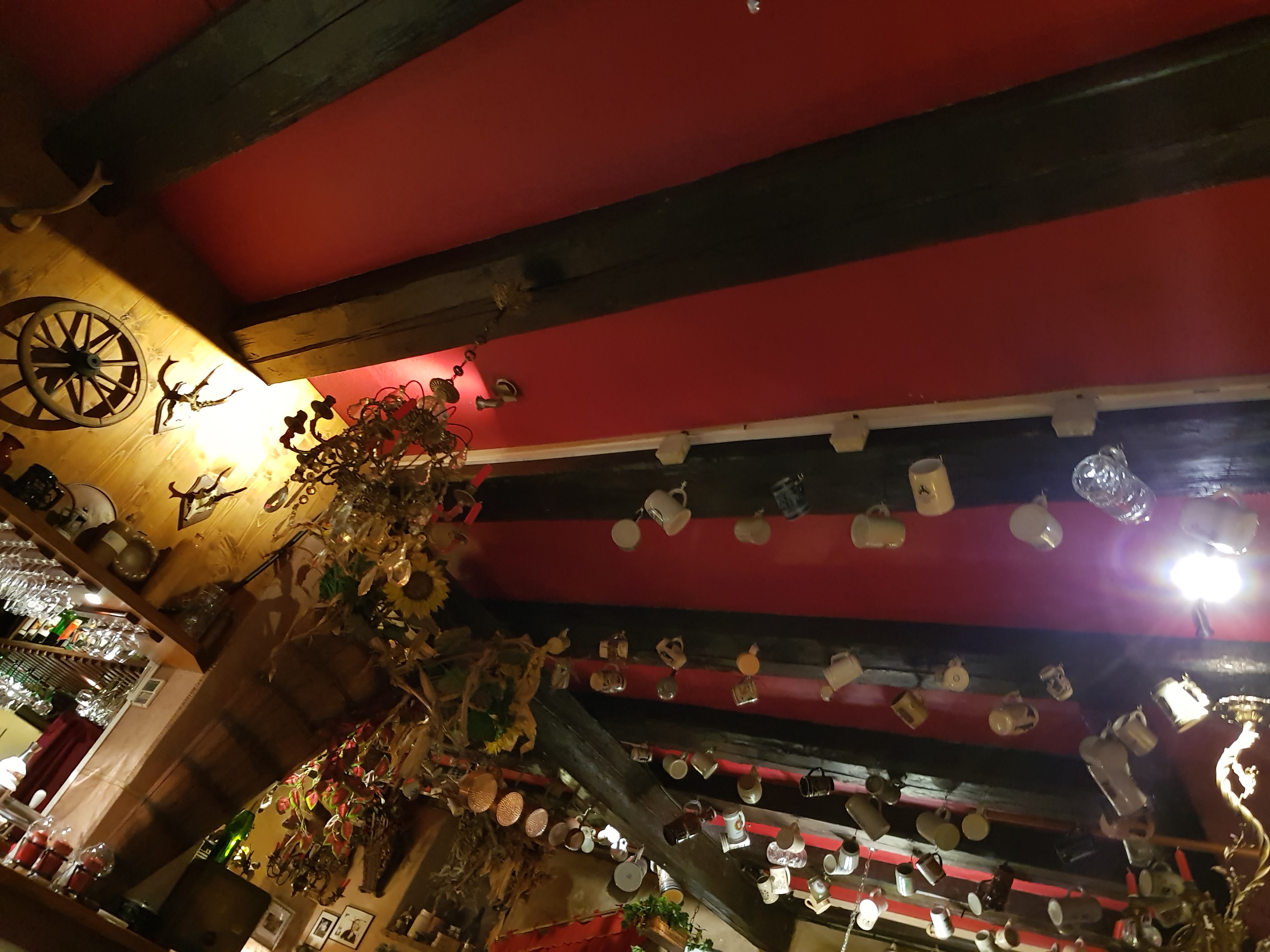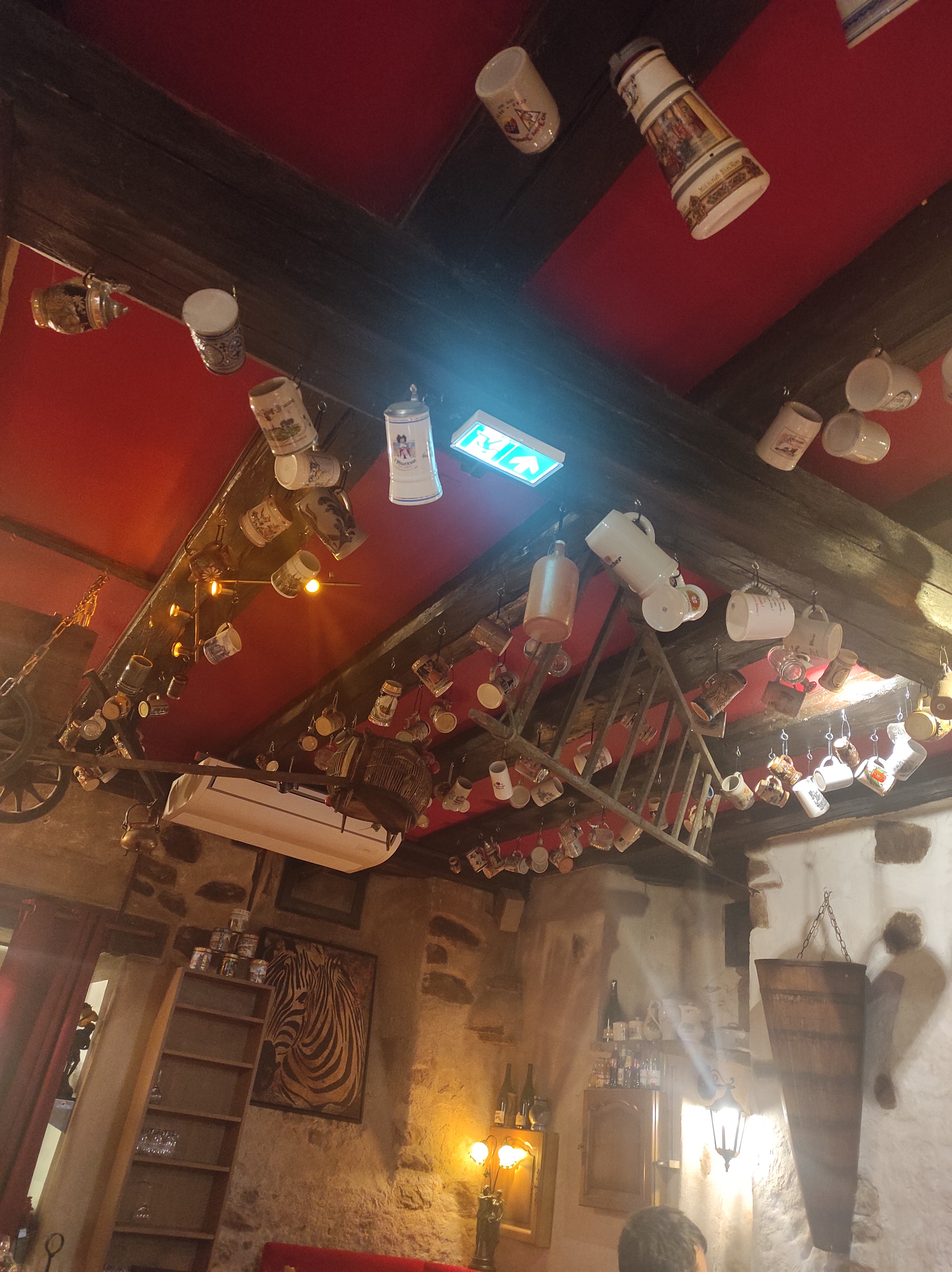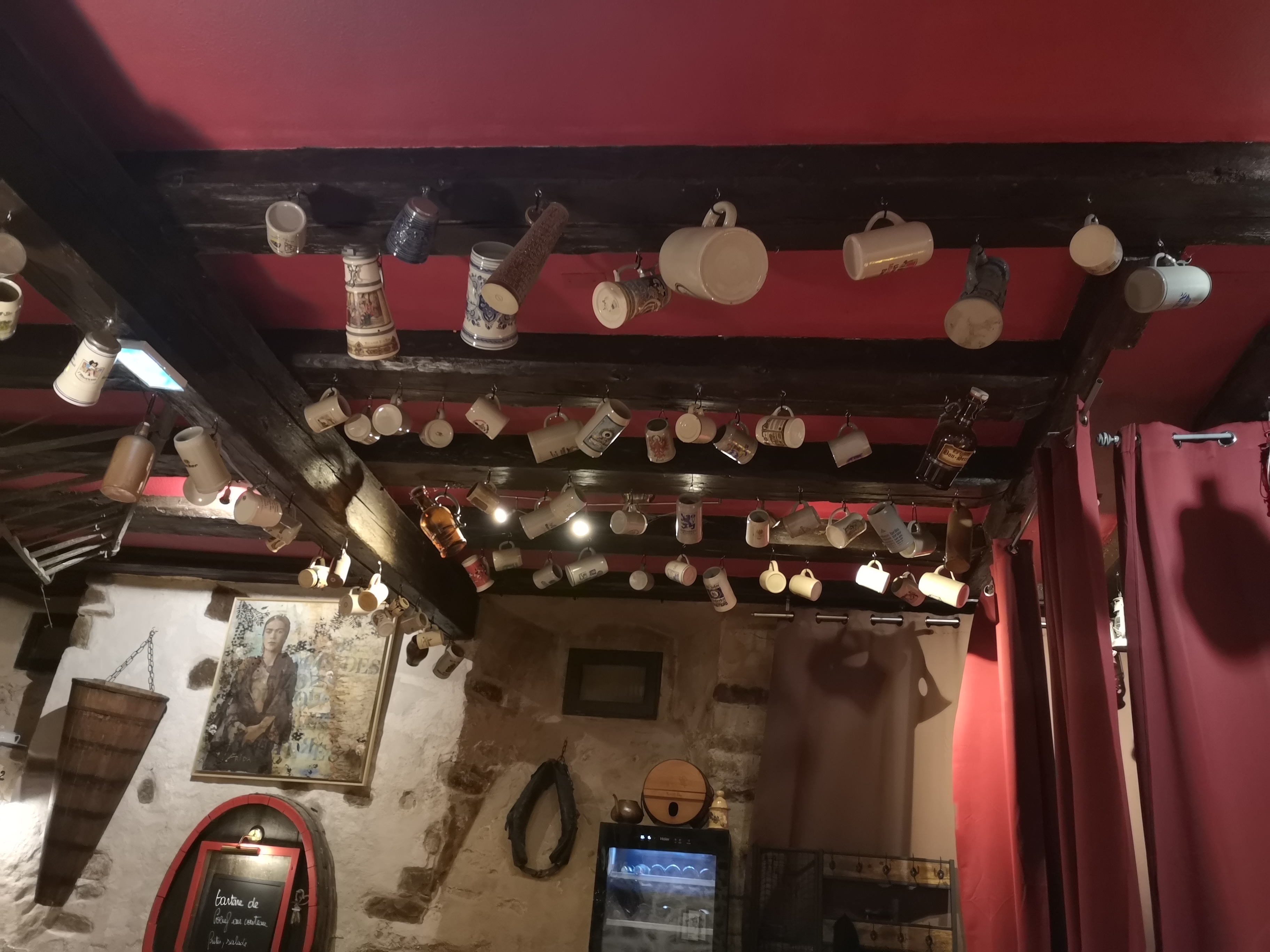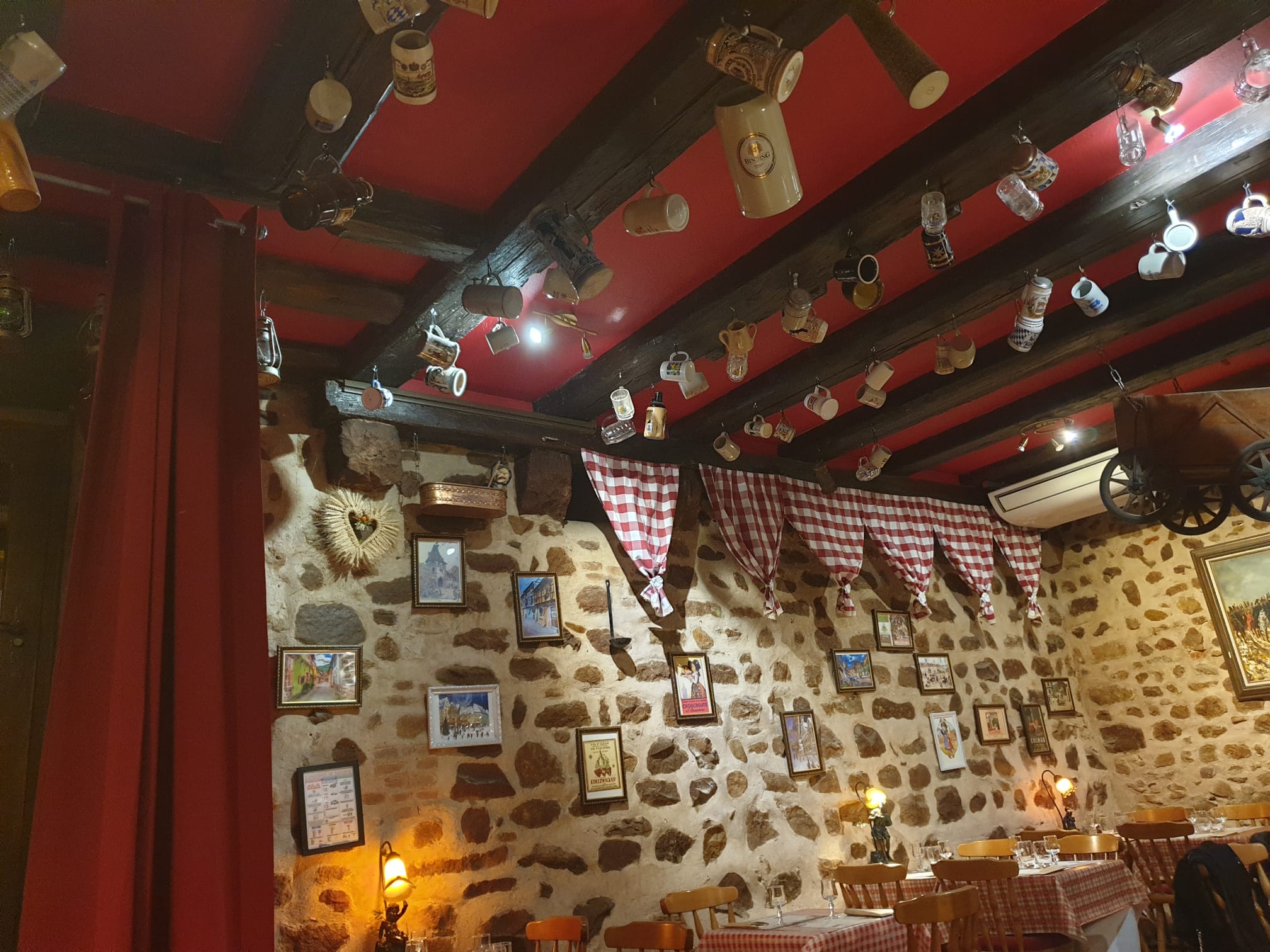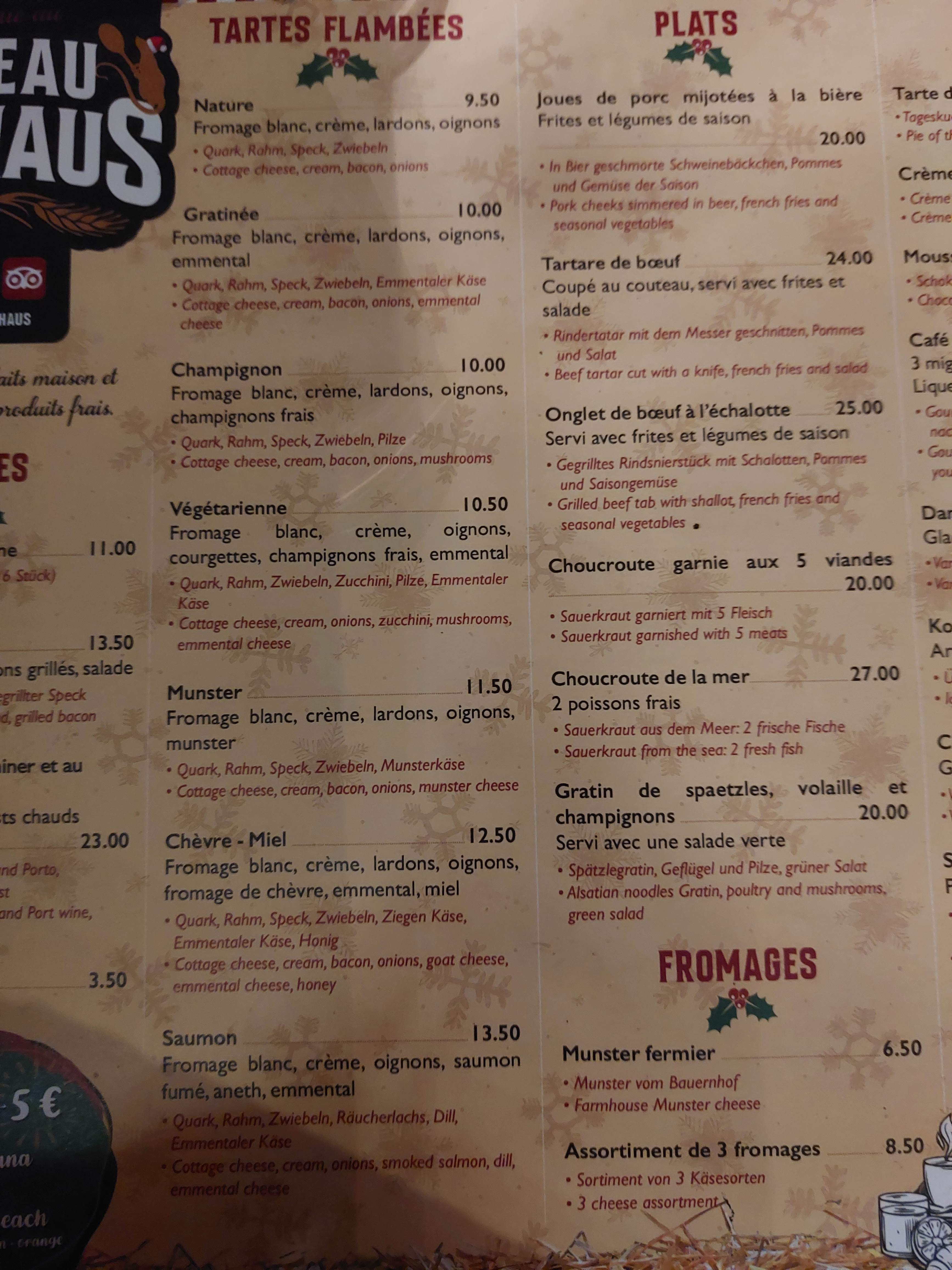 Carte avec un bon choix, des mets de bonnes qualités le tout servi rapidement. Un décor fait de choppes diverses et variés suspendues au plafond donne une note festive à l'ambiance régionale. Ps: la Flammekueche au munster est à tomber.