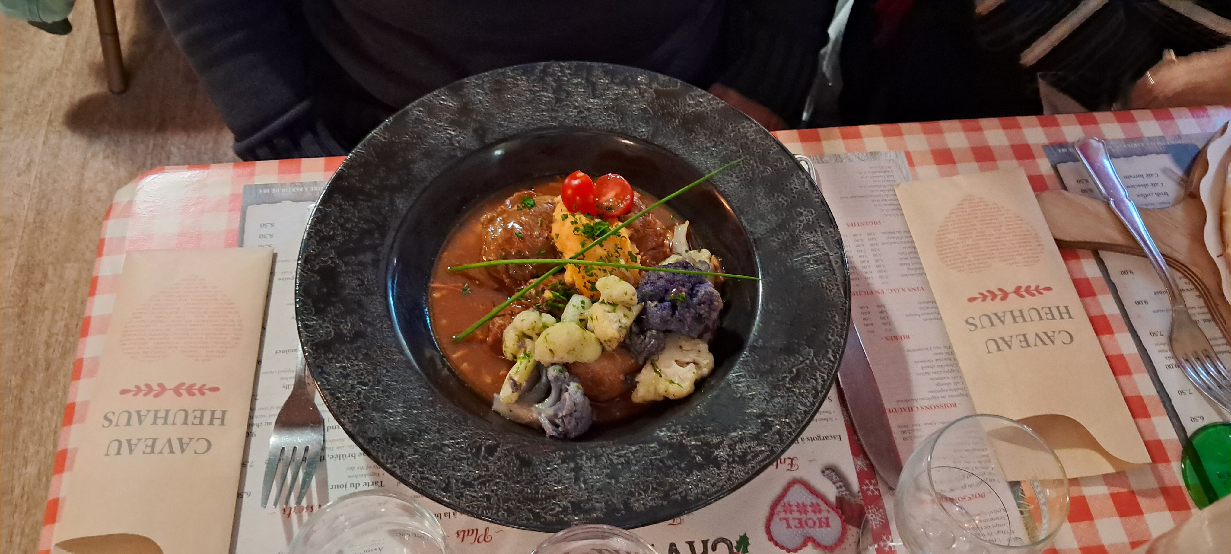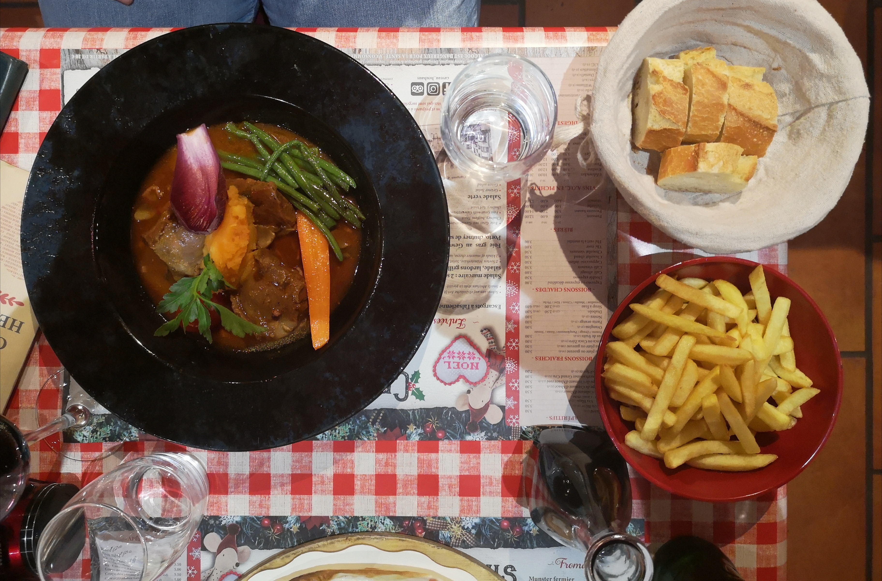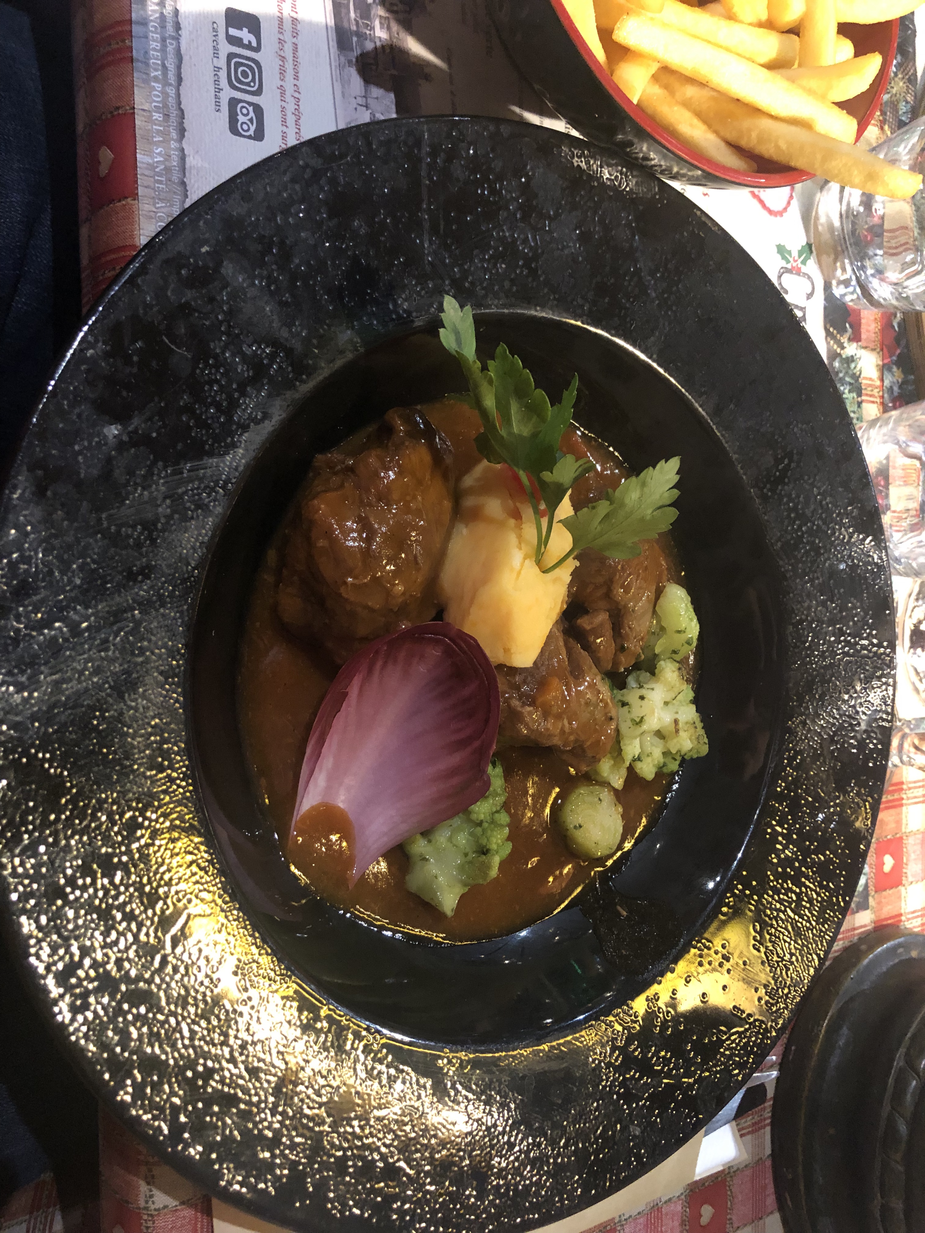 Nous sommes allés dans ce restaurant durant le marché de Noël. Vraiment je suis partagée car la cuisine était bonne; j'ai pris de la joue de boeuf et demandé seulement les légumes en accompagnement et pas les frites; c'était très goûtu. Seulement je regrette la vitesse à laquelle le service s'est fait, entrés à 18h15, on est sorti à 18h45. Vraiment on sent que le restaurant veut faire un maximum de services. Et le comble, c'est que les tables sont tellement serrées qu'on pourrait taper la discussion avec les voisins. Et le serveur est obligé de passer de côté en levant les fesses pour passer entre les tables. On sent vraiment que le plus important, c'est le chiffre du marché de Noël. Déçue !