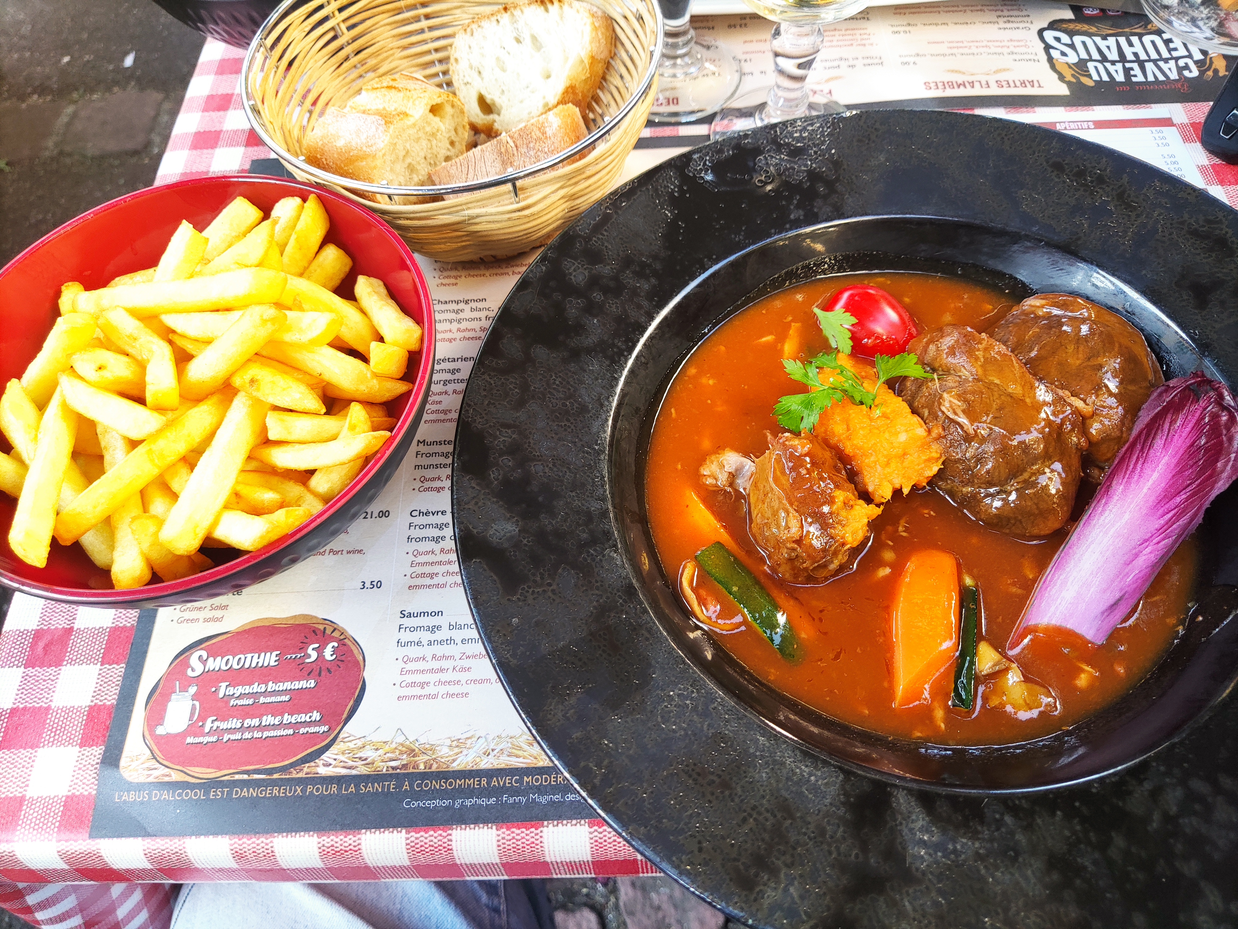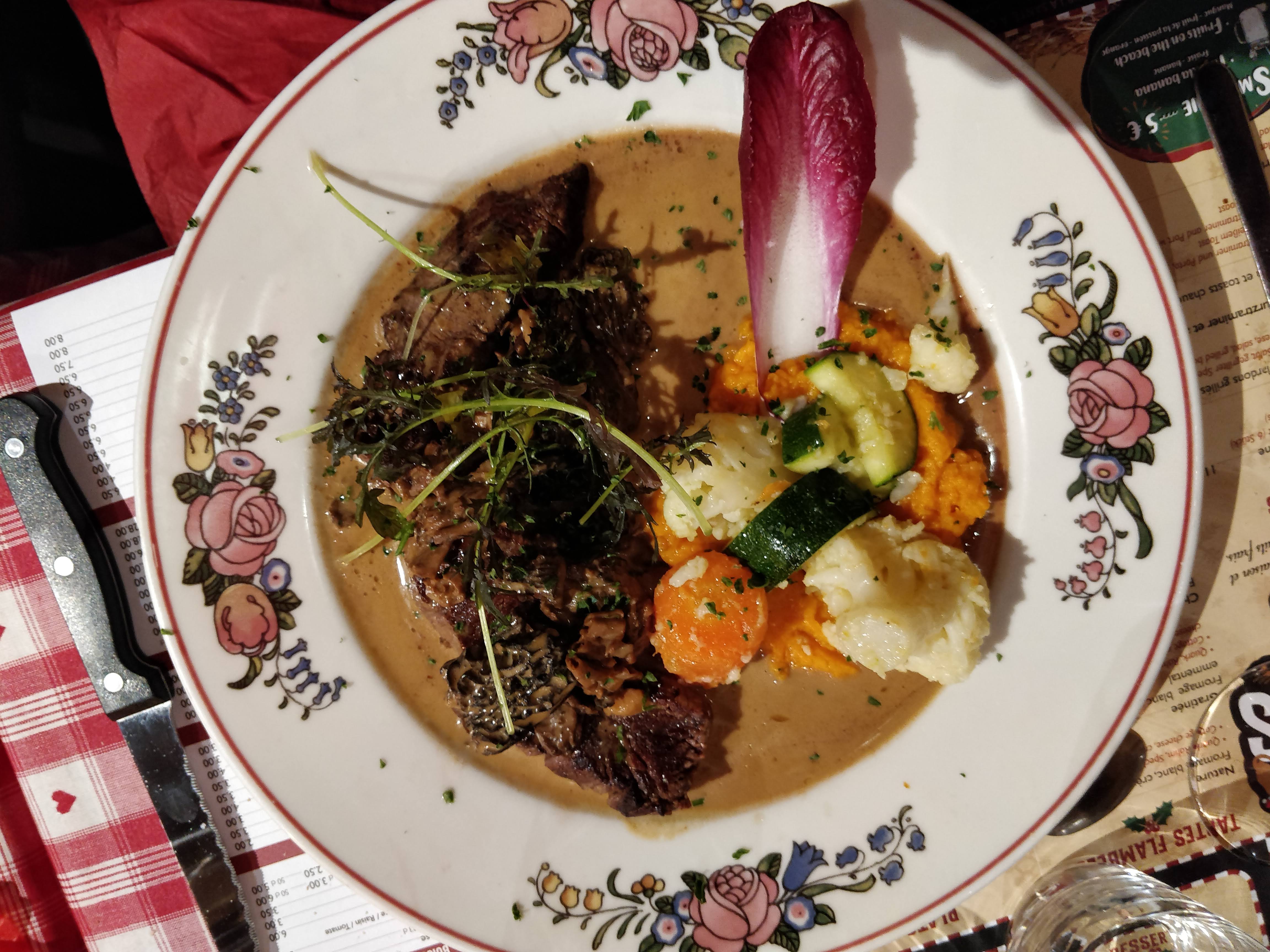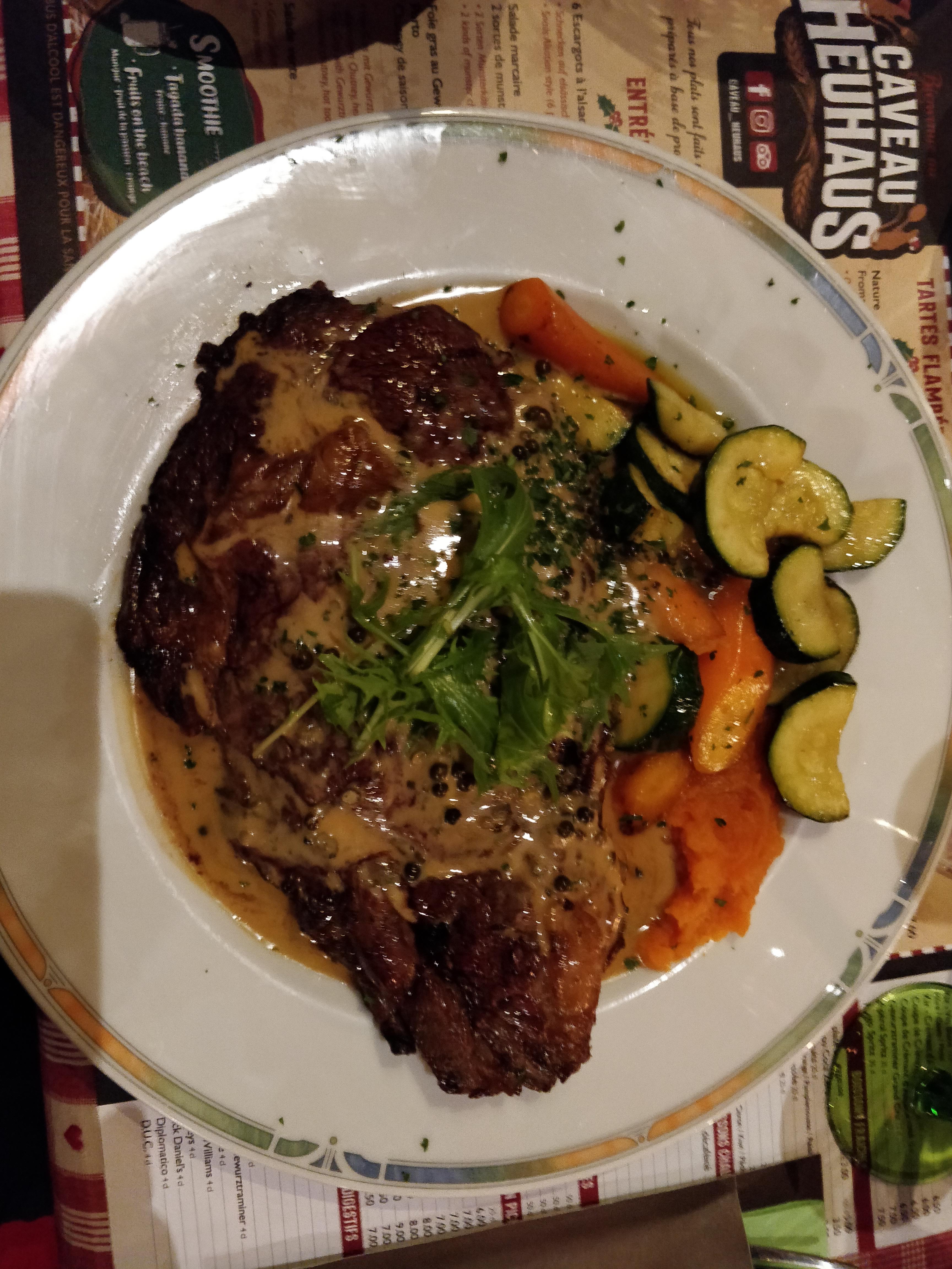 Nous sommes allés dans ce restaurant durant le marché de Noël. Vraiment je suis partagée car la cuisine était bonne; j'ai pris de la joue de boeuf et demandé seulement les légumes en accompagnement et pas les frites; c'était très goûtu. Seulement je regrette la vitesse à laquelle le service s'est fait, entrés à 18h15, on est sorti à 18h45. Vraiment on sent que le restaurant veut faire un maximum de services. Et le comble, c'est que les tables sont tellement serrées qu'on pourrait taper la discussion avec les voisins. Et le serveur est obligé de passer de côté en levant les fesses pour passer entre les tables. On sent vraiment que le plus important, c'est le chiffre du marché de Noël. Déçue !