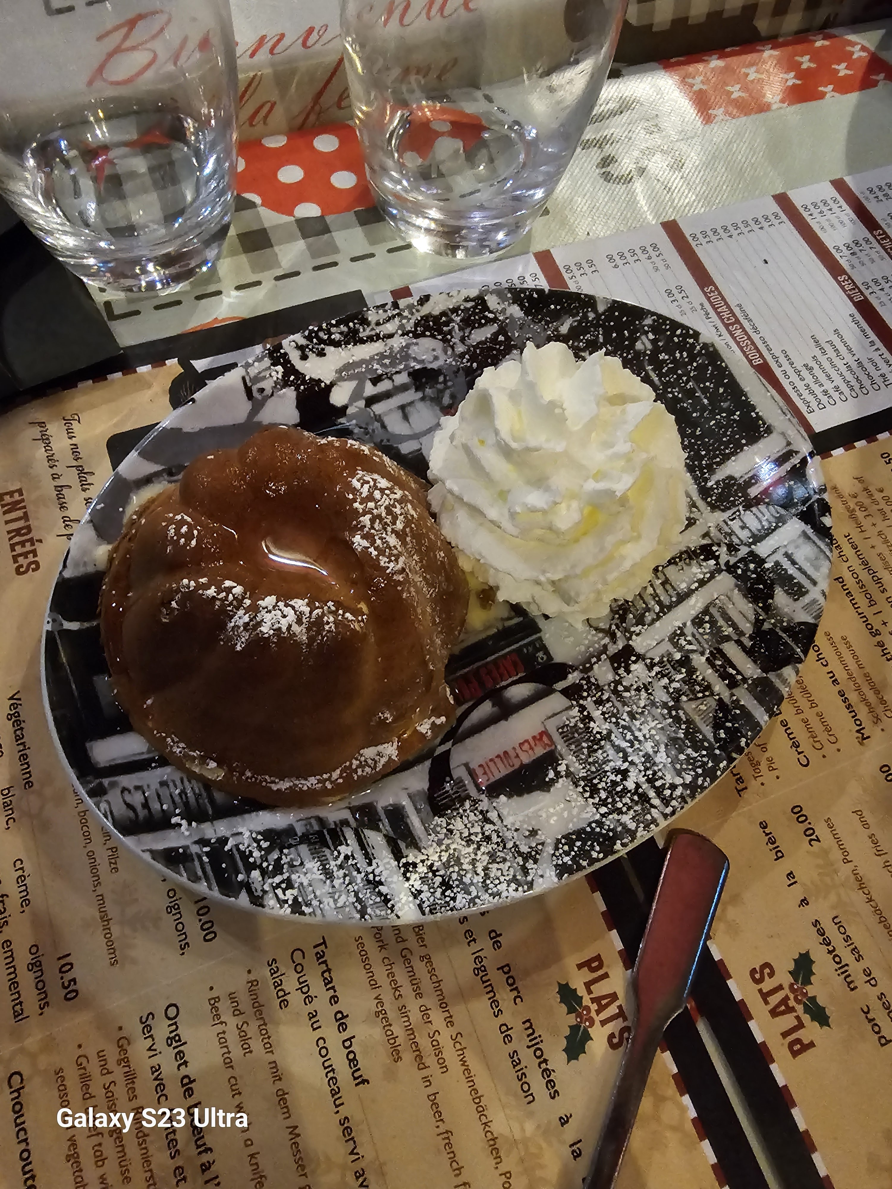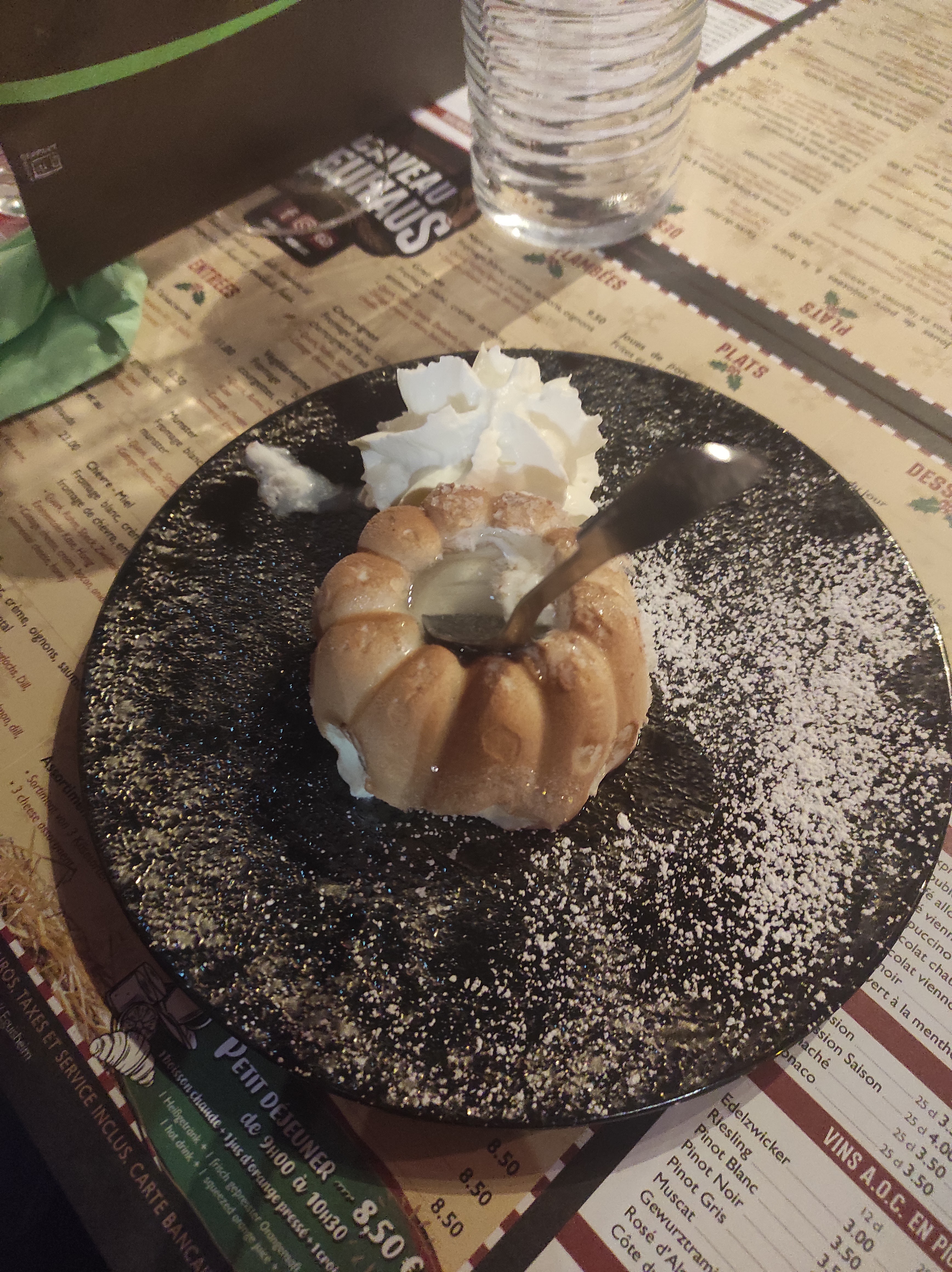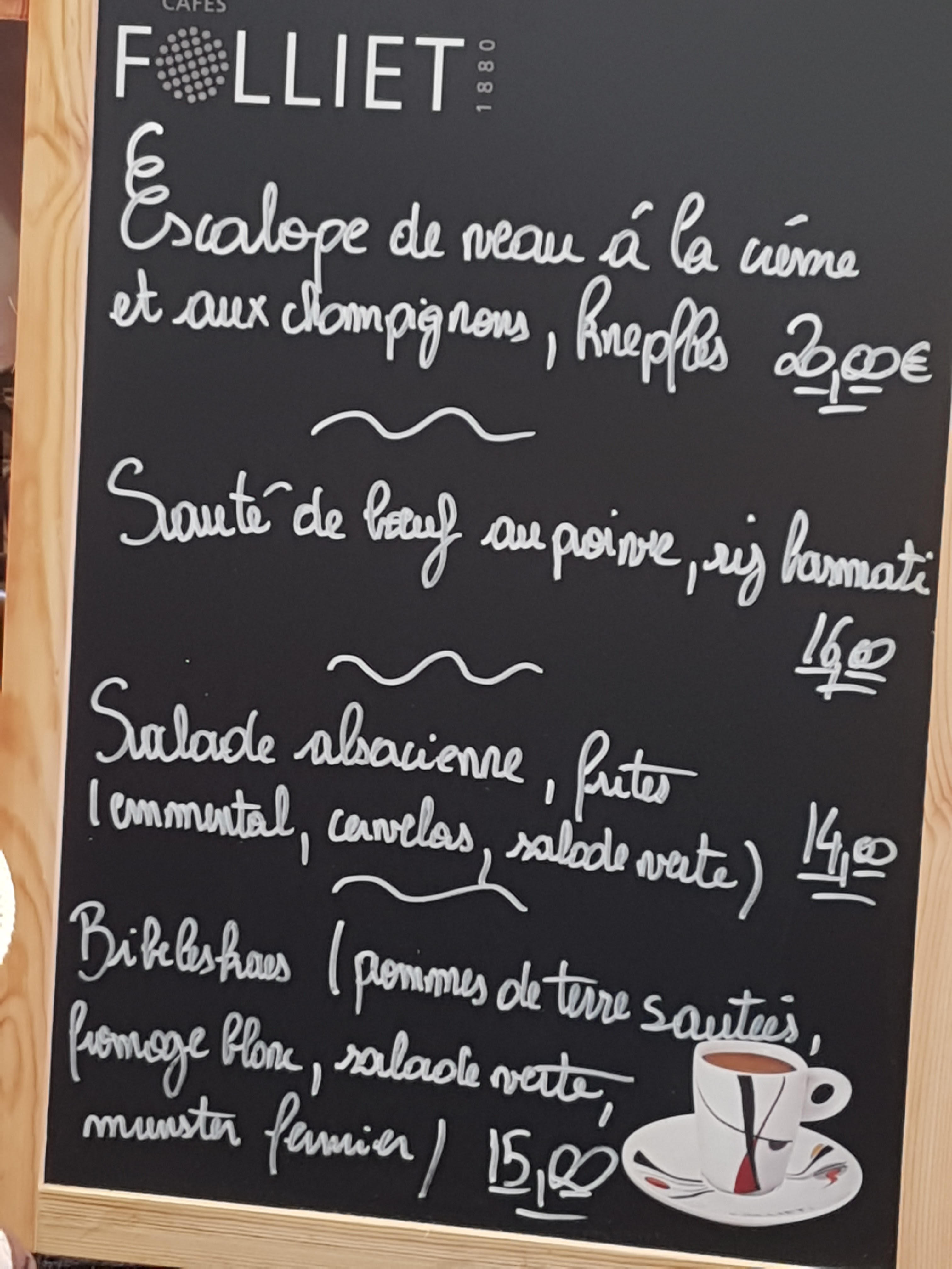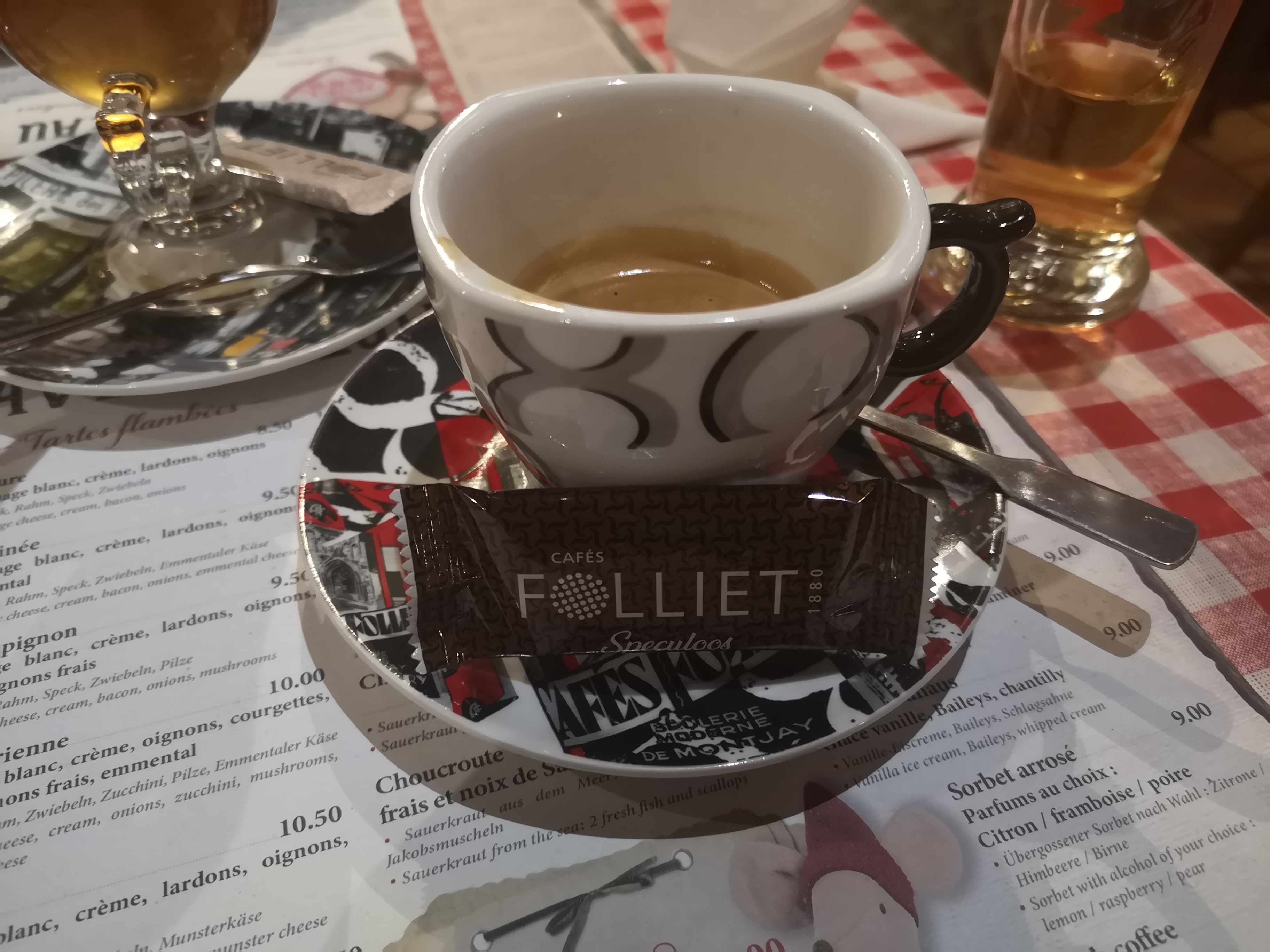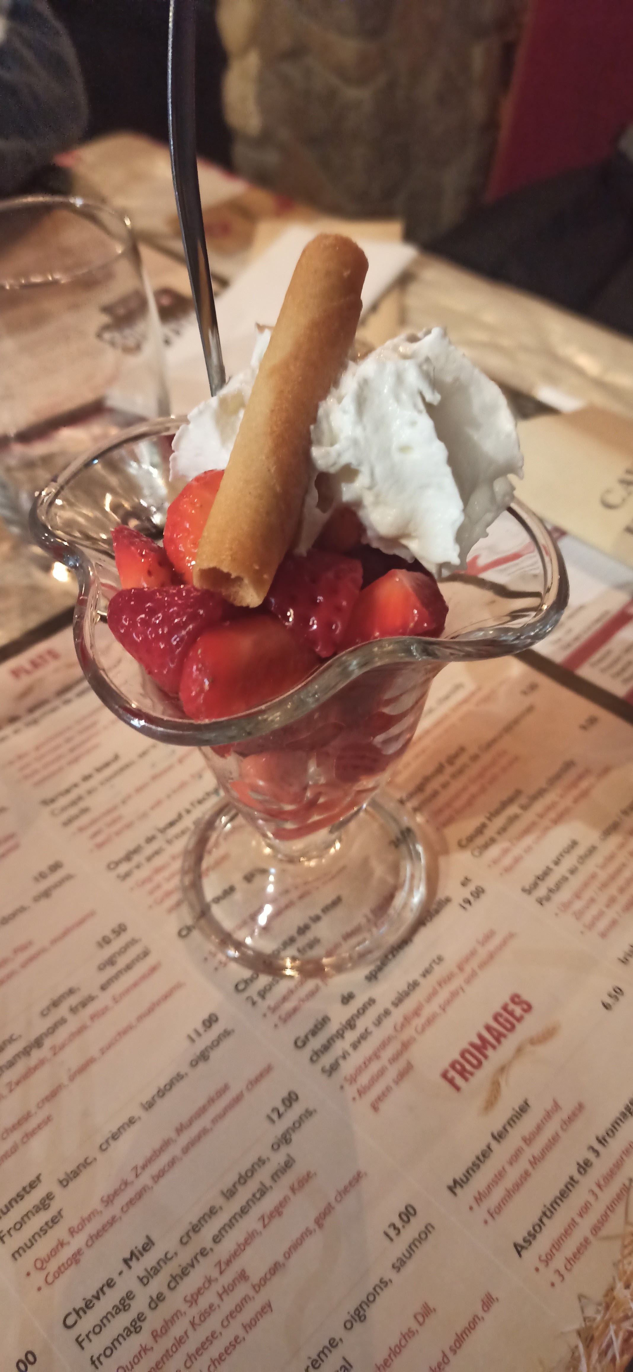 Déçue. Arrivés à 14h30, on nous a indiqué que seules les tartes flambées étaient servies. Pas de problème, nous aimons ça. 8 euros pour ce genre de tartes toutes faites je trouve ça cher. Mais bon, c'est habituel. En revanche, j'ai pris une mousse au chocolat et j'ai été très déçue : elle était très bonne, mais ridiculement petite (voir photo). Un verre majoritairement rempli de crème chantilly, avec très peu de mousse au chocolat, pour 7 euros !