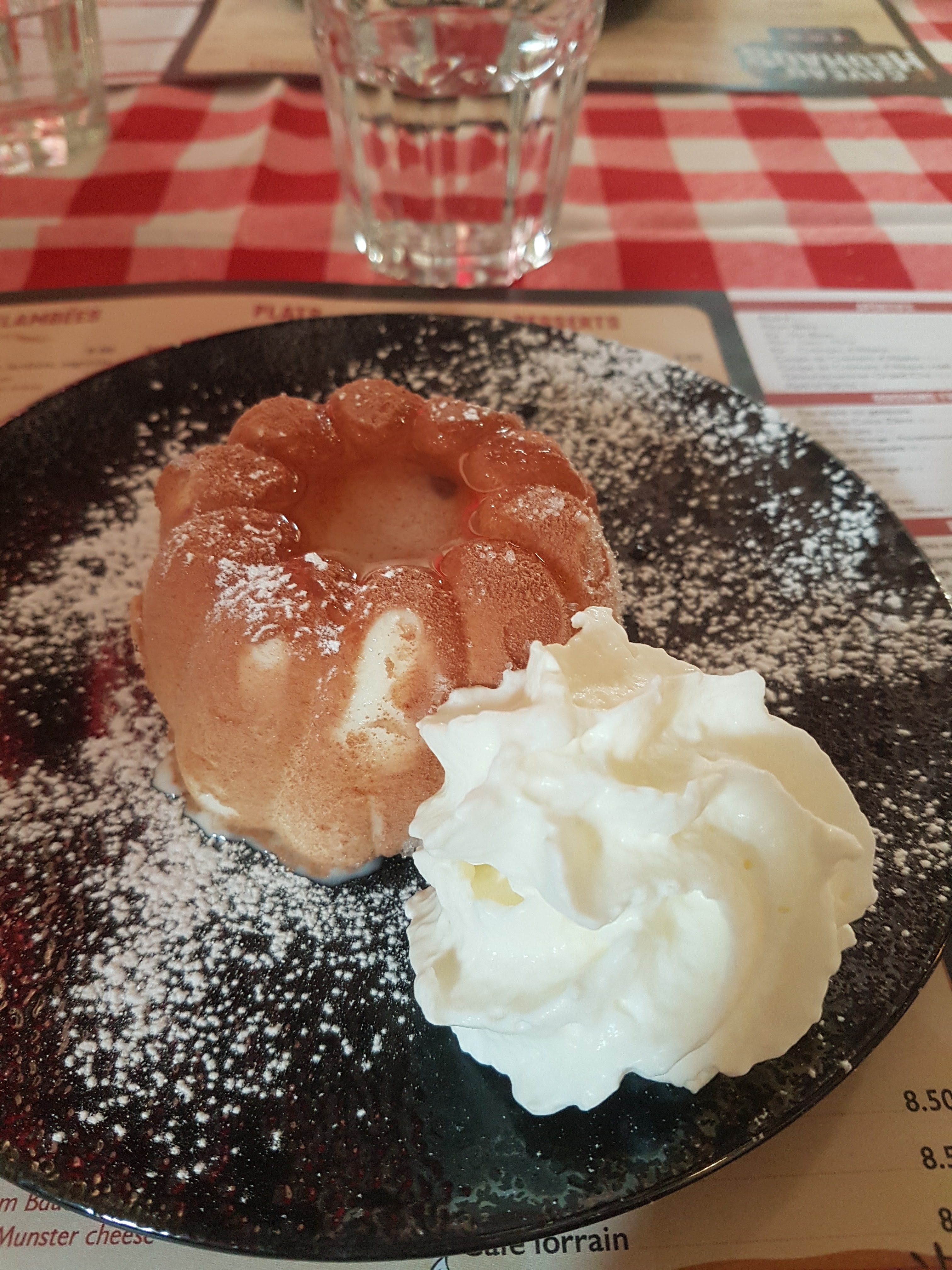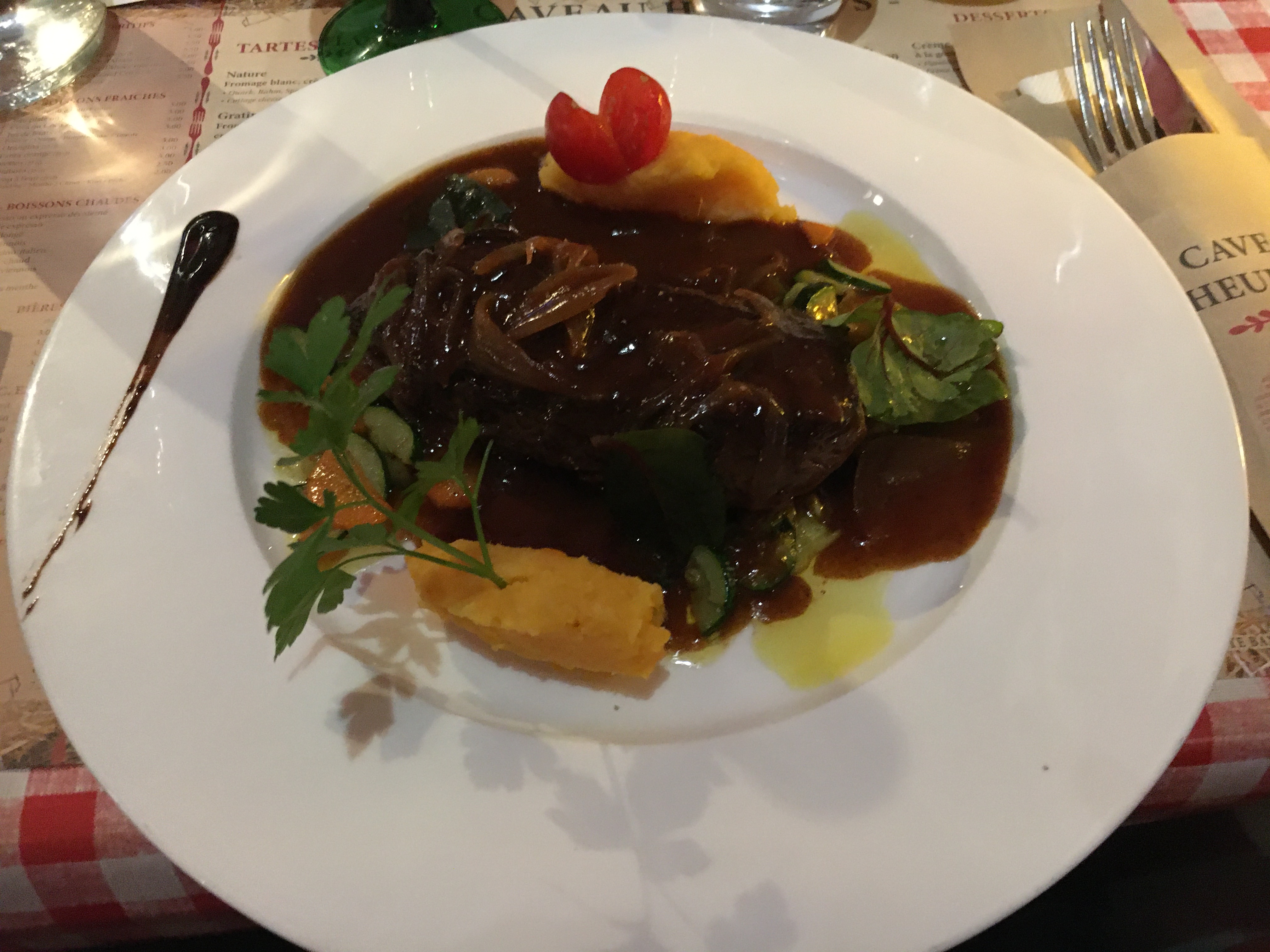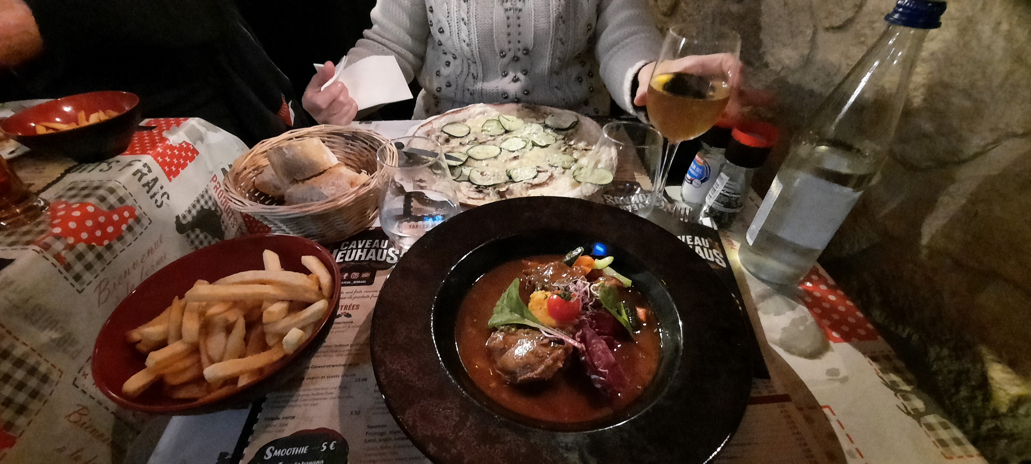 J’ai pris un choucroute plat du jour avec une sauce vinaigre, je pourrai en manger tous les jours. Bravo le cuisinier. Le cadre dans une cave voûtée et les tables en bois, j’ai adoré. Ça donne tout de suite envie de s’installer. Niveau service, un peu froid ou disons particulier quand on est habitué au service standard parisien.