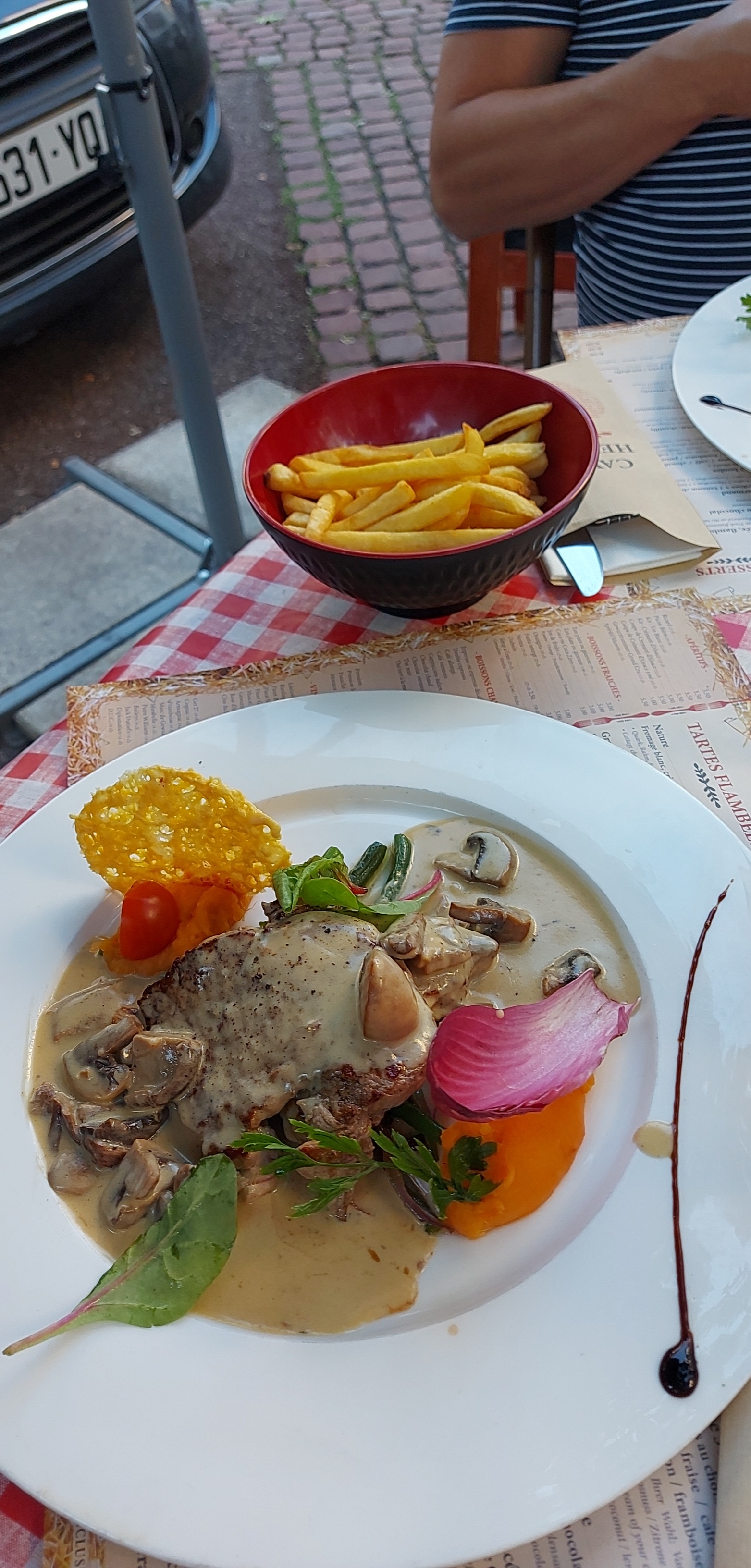 Jolie terrasse. Les serveurs sont sympathiques et dynamiques. Le plat principal était parfait, visuel comme gustatif. Le morceau de boeuf et sa sauce échalote, un régal. La purée de betternuts ou potiron, si je ne me trompe, très bonne. Les frites étaient bonnes. J'ai bien aimé la bière. Seul petit bémol : l'entrée d'escargots alsacienne, un peu regrettable. Il manquait un peu de goût. J'ignore si c'est le manque de persil ou autres herbes dans la préparation mais j'avais plus le goût de beurre/huile à la bouchée. De plus, de mon point de vue, ne serait-il pas plus esthétique avec leurs coquilles ? Bref, sinon dans l'ensemble tout était correct. Les autres plats tout autant ragoûtants sont à tester.