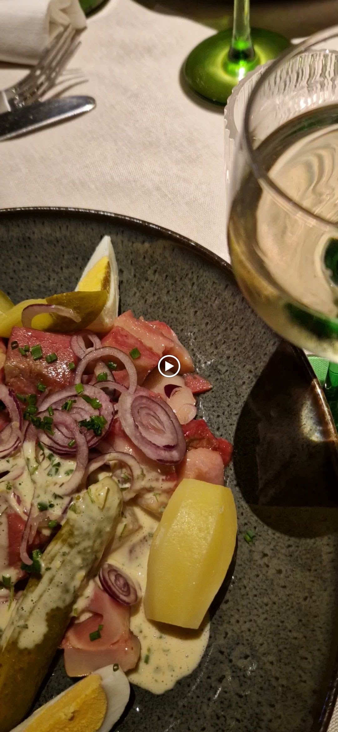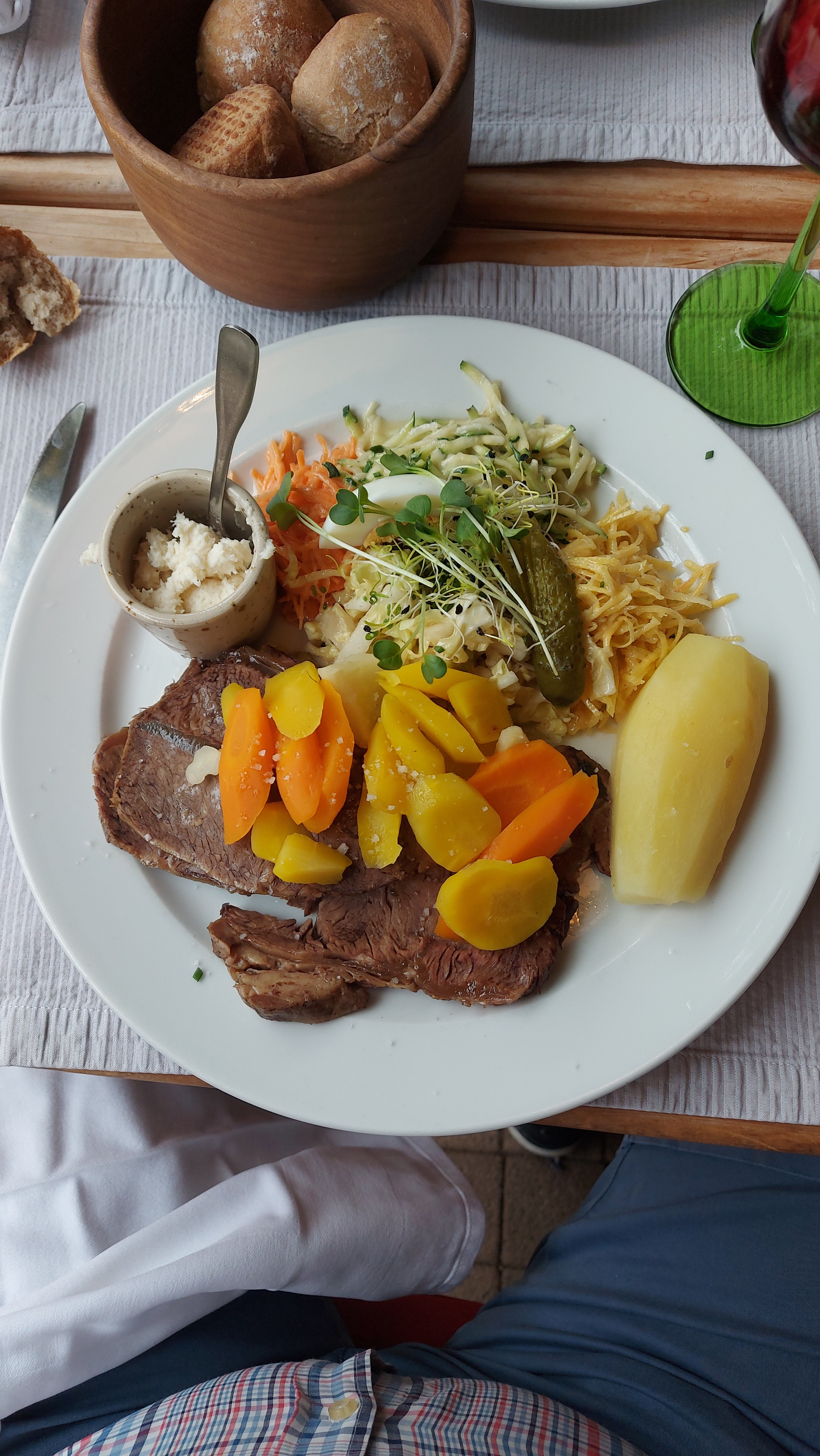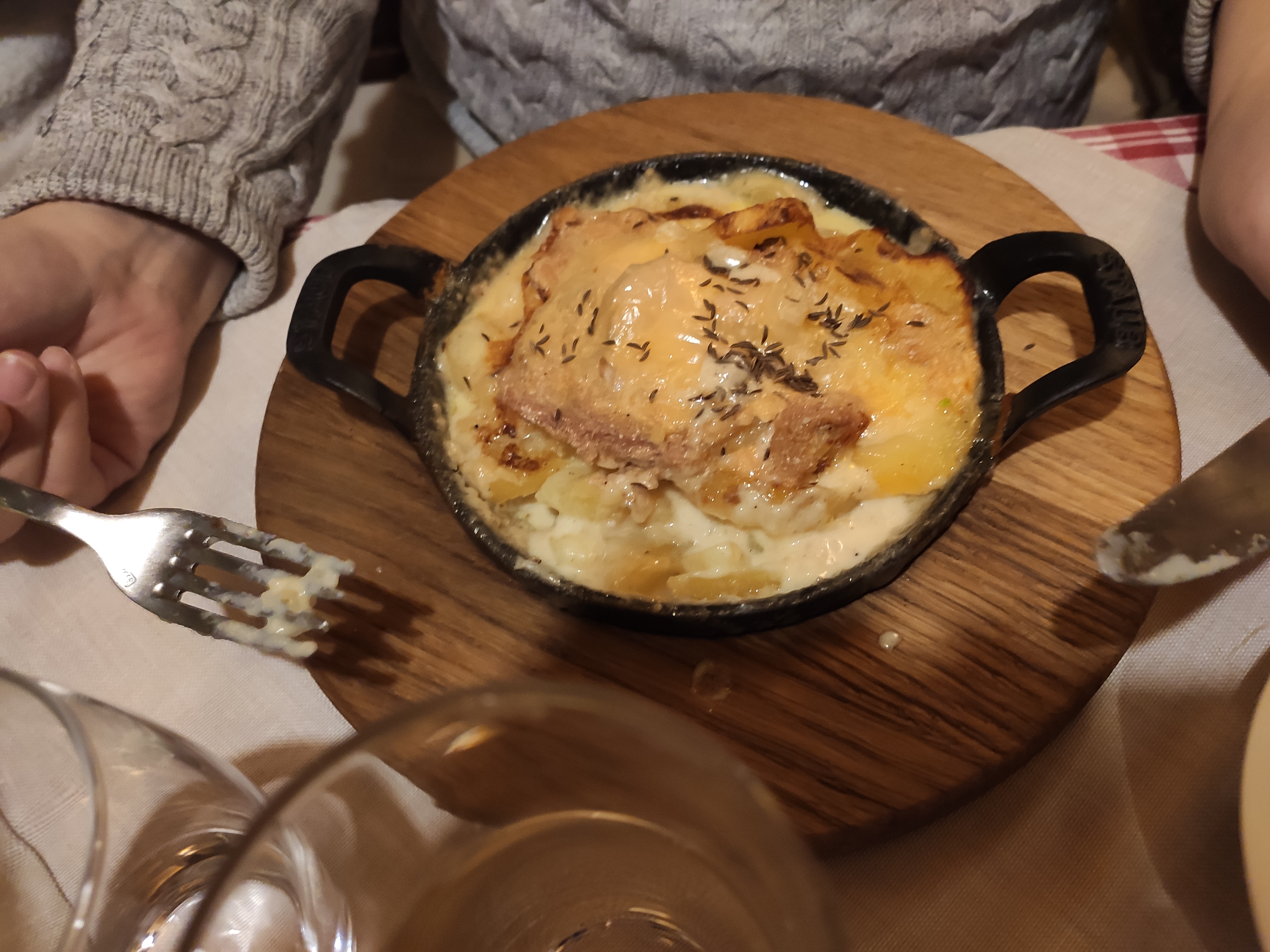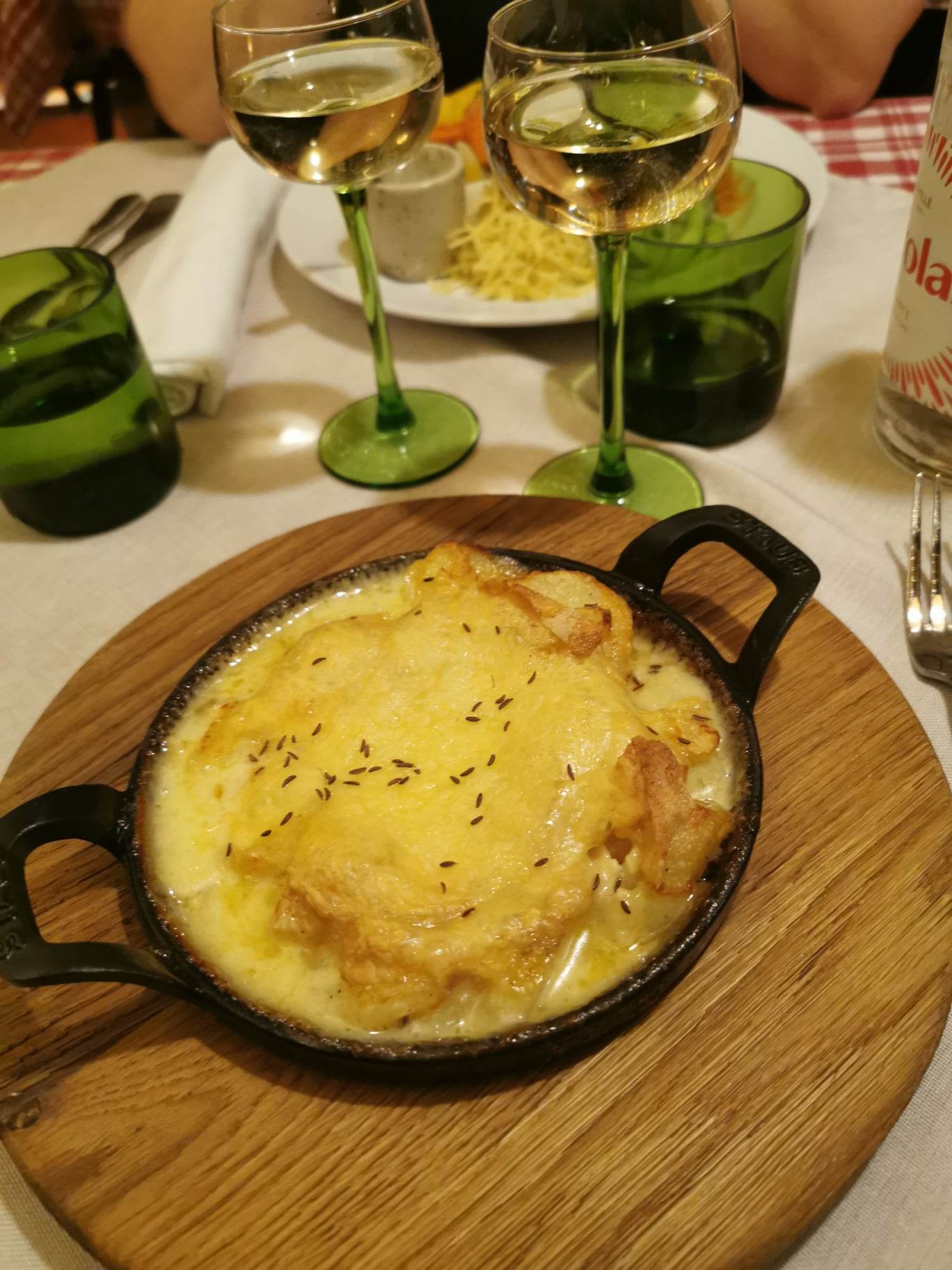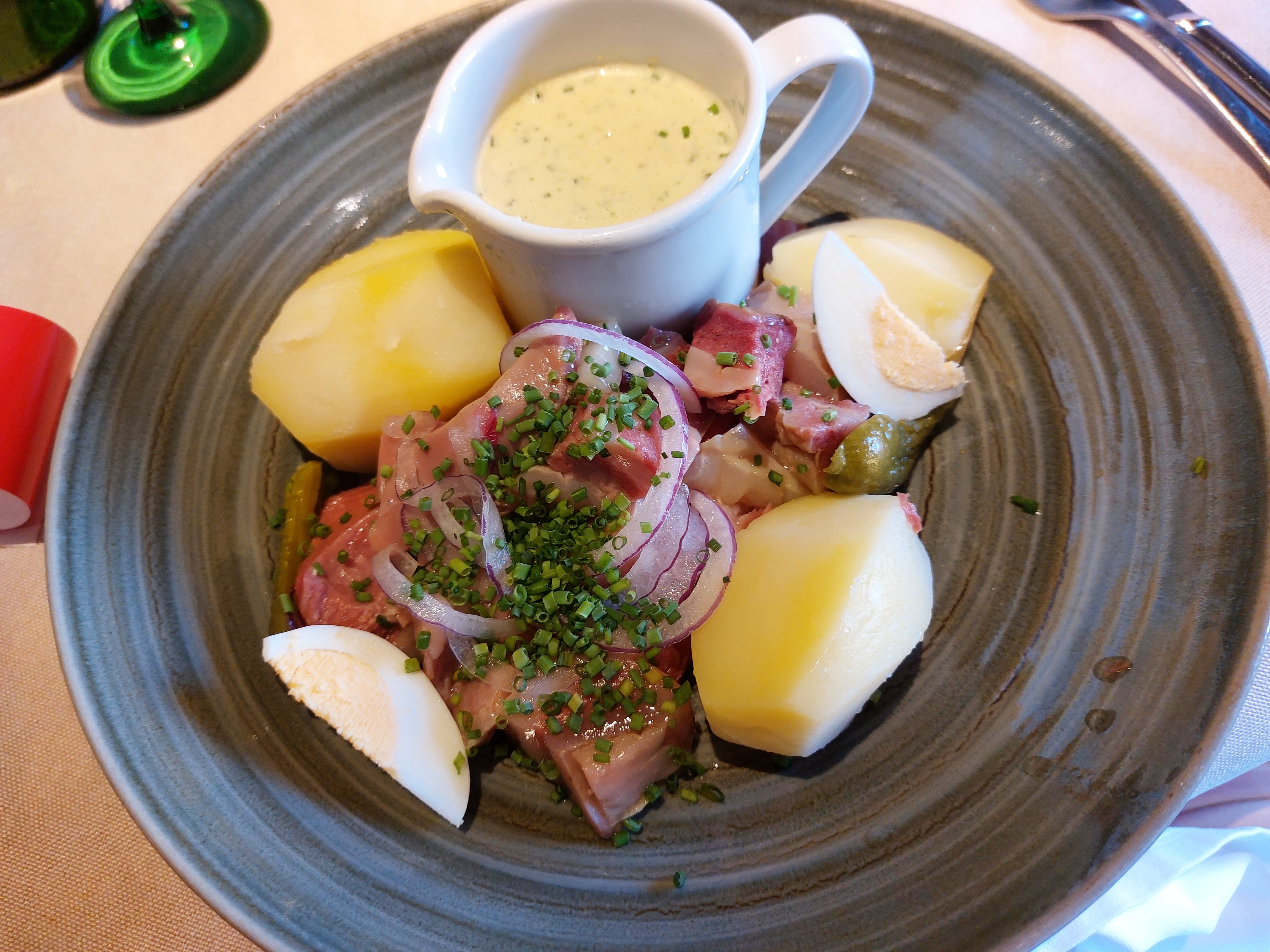 Déçus de ce restaurant. Mon mari à pris de la tête de veau, bonne, mais il a dû manger bcp de pain pour être rassasié. Pour ma part j'ai commandé des fleischscnacka et j'en ai eu 2 tranches, dans un bouillon clair, sans sauce, crème ou autre.....nous sommes restés sur notre faim.... Dommage, les tarifs ont grimpé et les portions diminué. Nous ne recommandons pas et ne reviendrons pas non plus.....