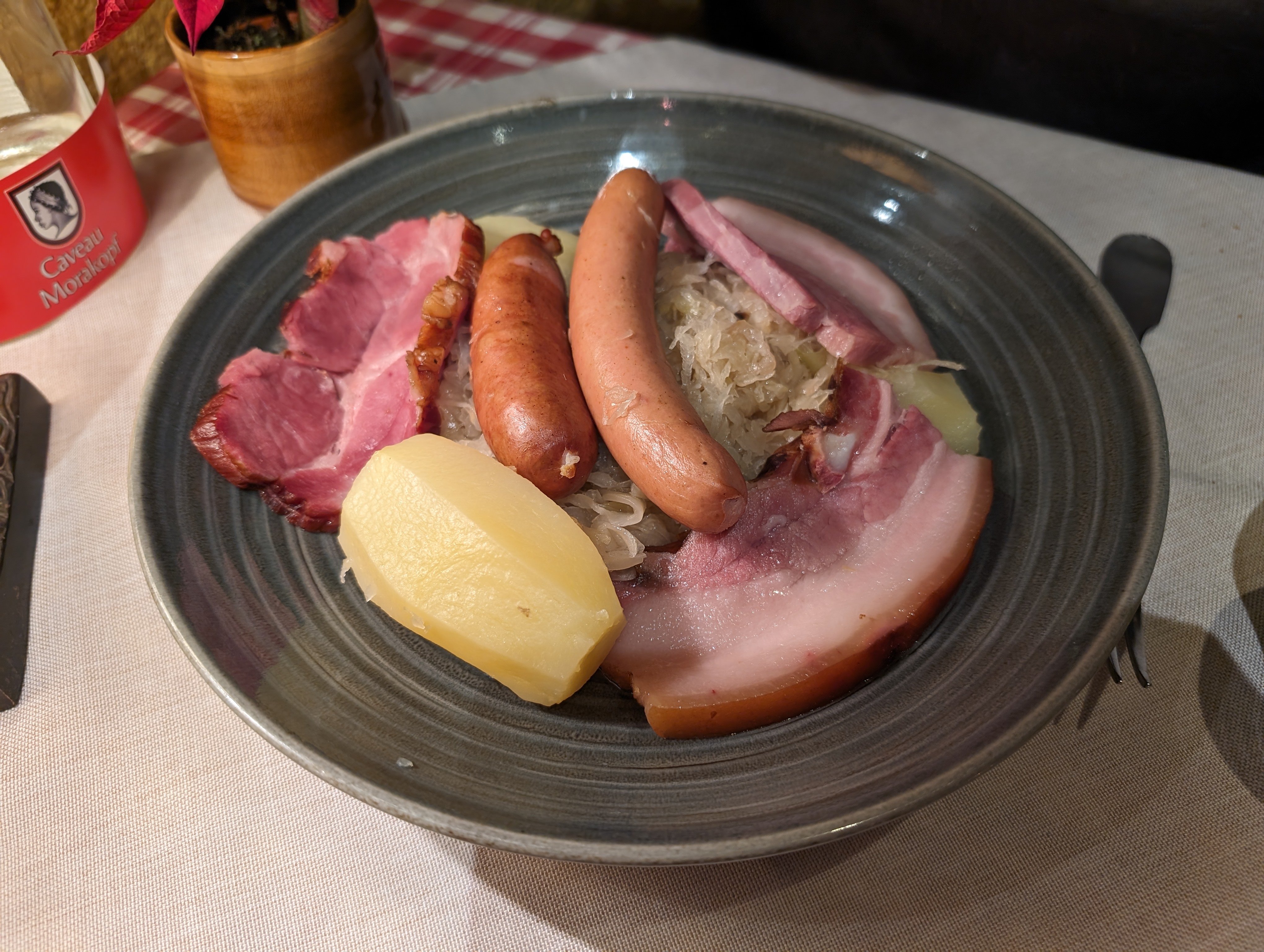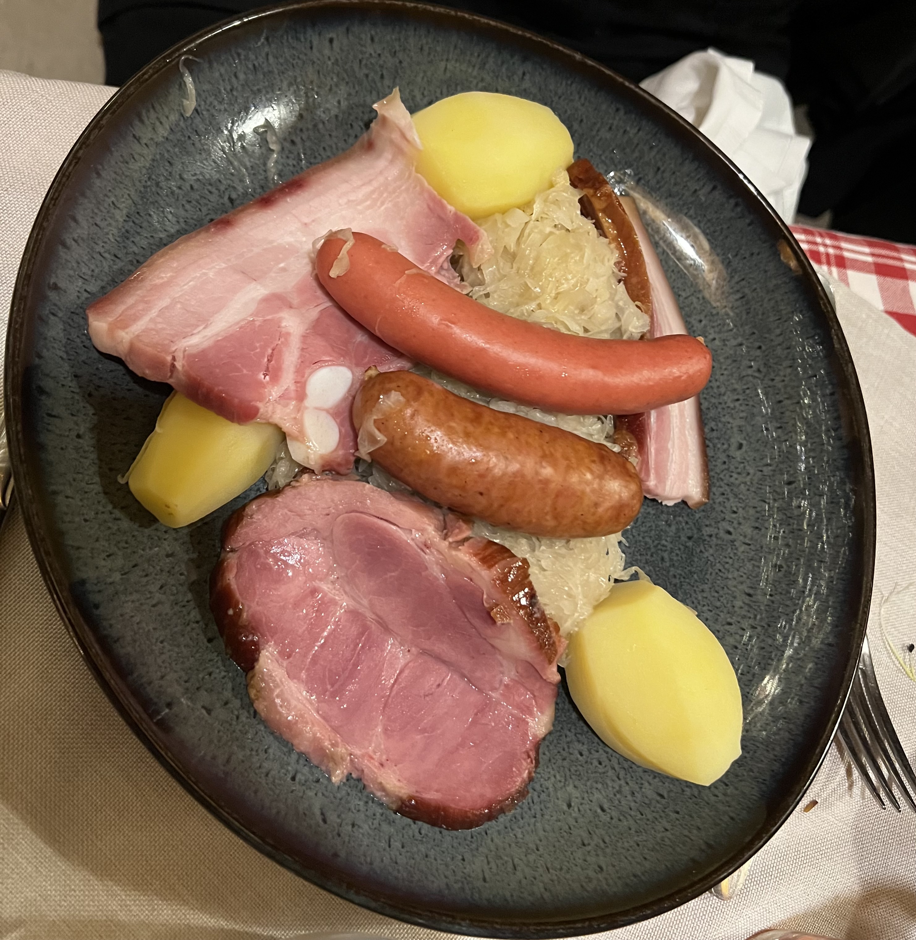Un bon restaurant avec des spécialités alsaciennes. Le service est rapide même s’il y avait du monde en salle. Le personnel est très accueillant et aimable. Il y a un wifi disponible pour compenser le fait que l’on ne captait pas bien avec nos téléphones 😂 Il y du choix entre la carte et les suggestions du jour (qui n’étaient pas très visibles depuis notre place - on n’arrivait pas à lire le tableau). On a passé une bonne soirée entre amis sur place mais il manquait un petit quelque chose pour les 5 étoiles. Cela étant dit je recommande le resto pour ceux qui veulent découvrir la cuisine alsacienne.