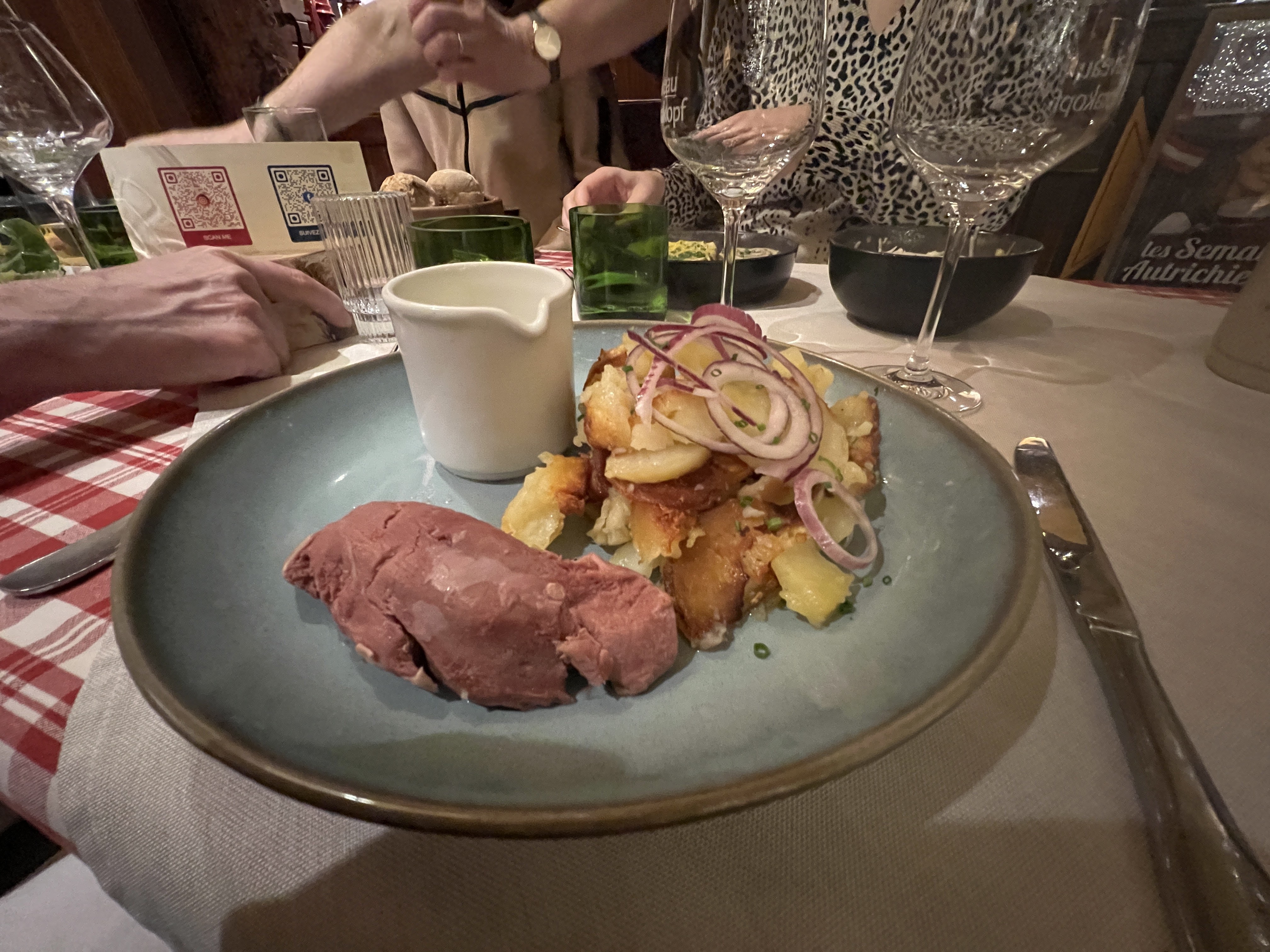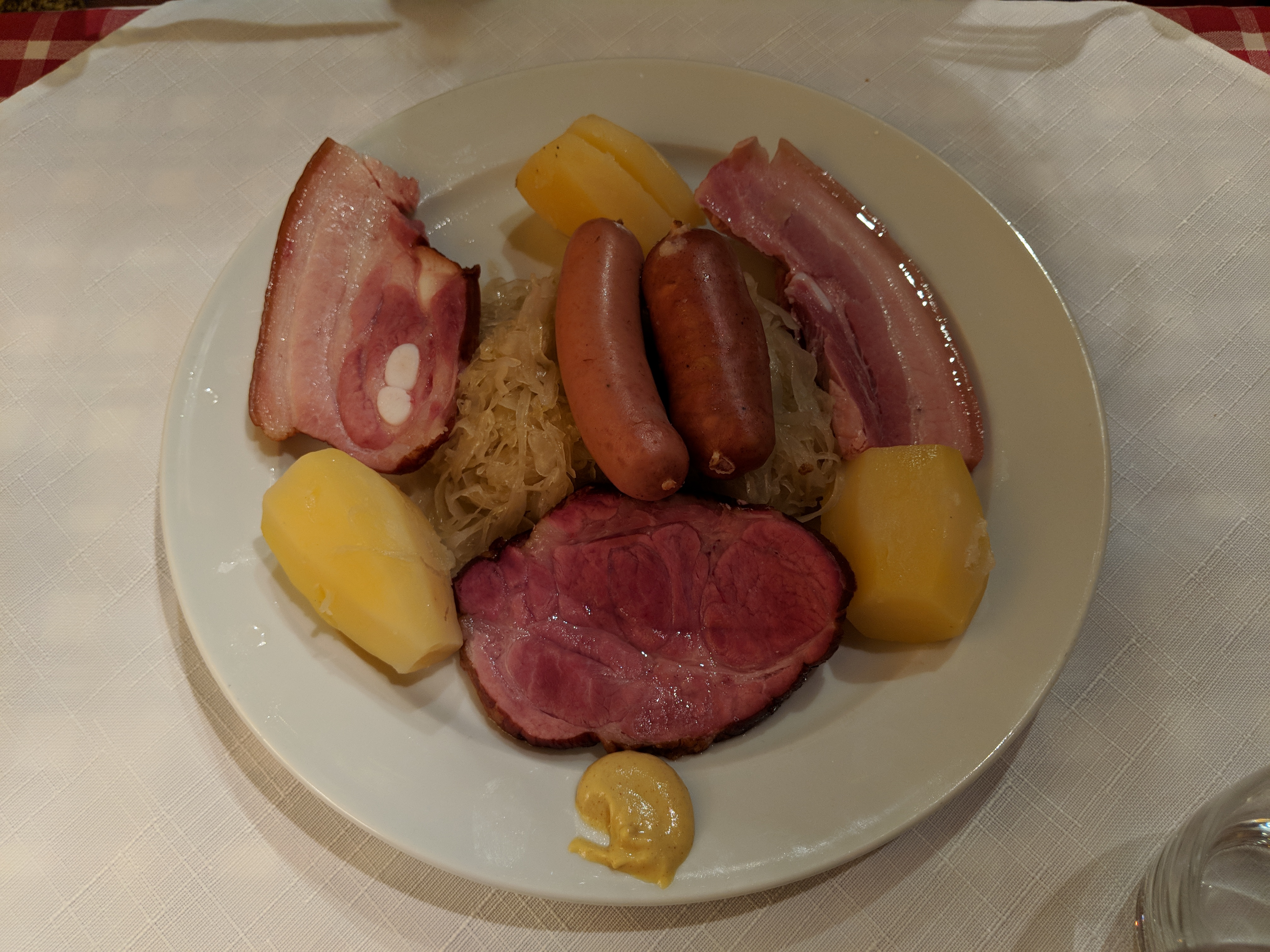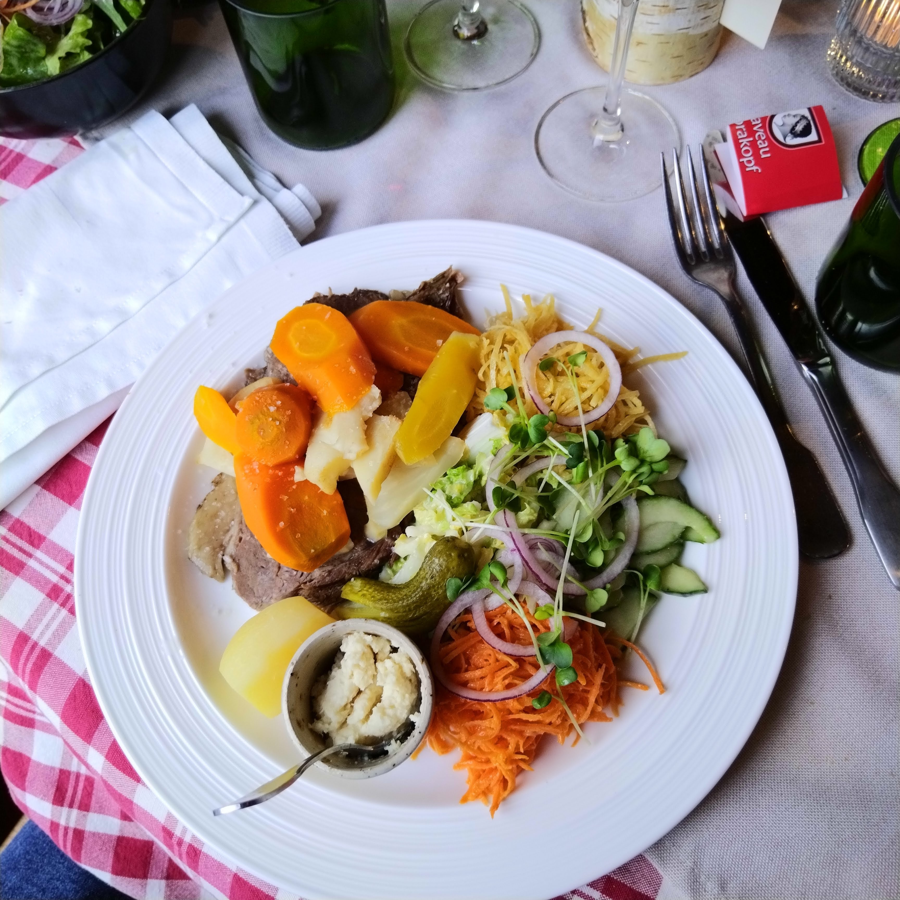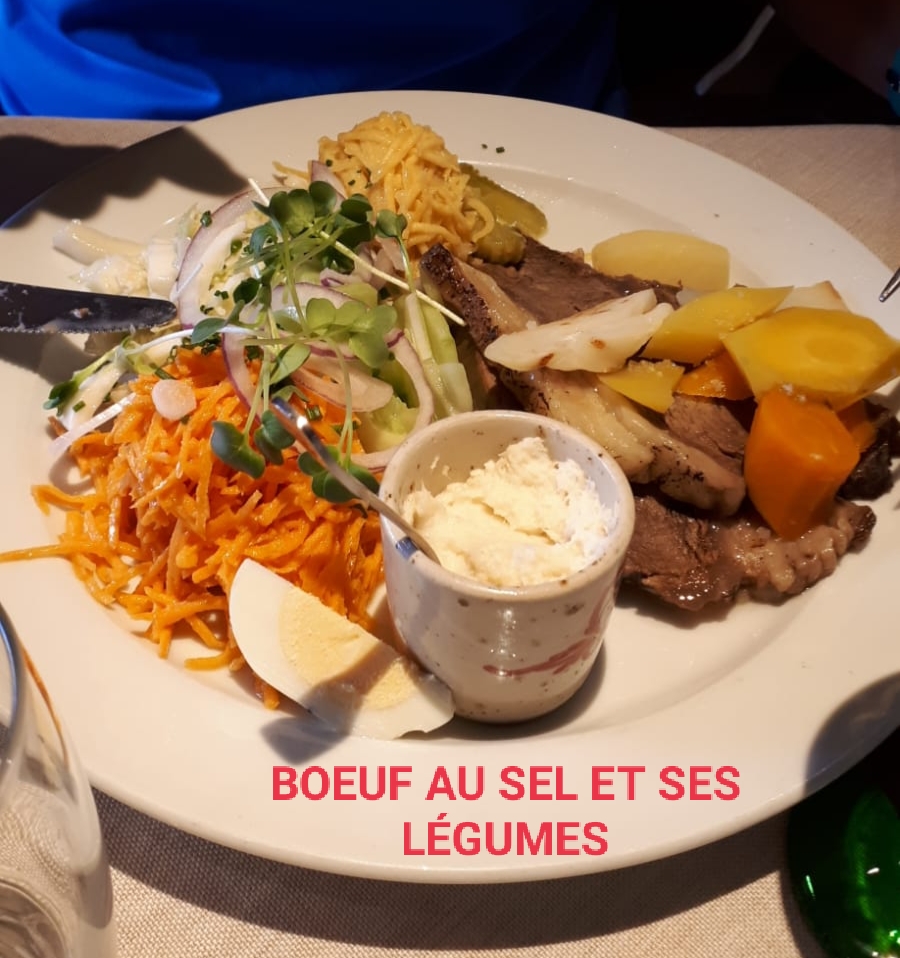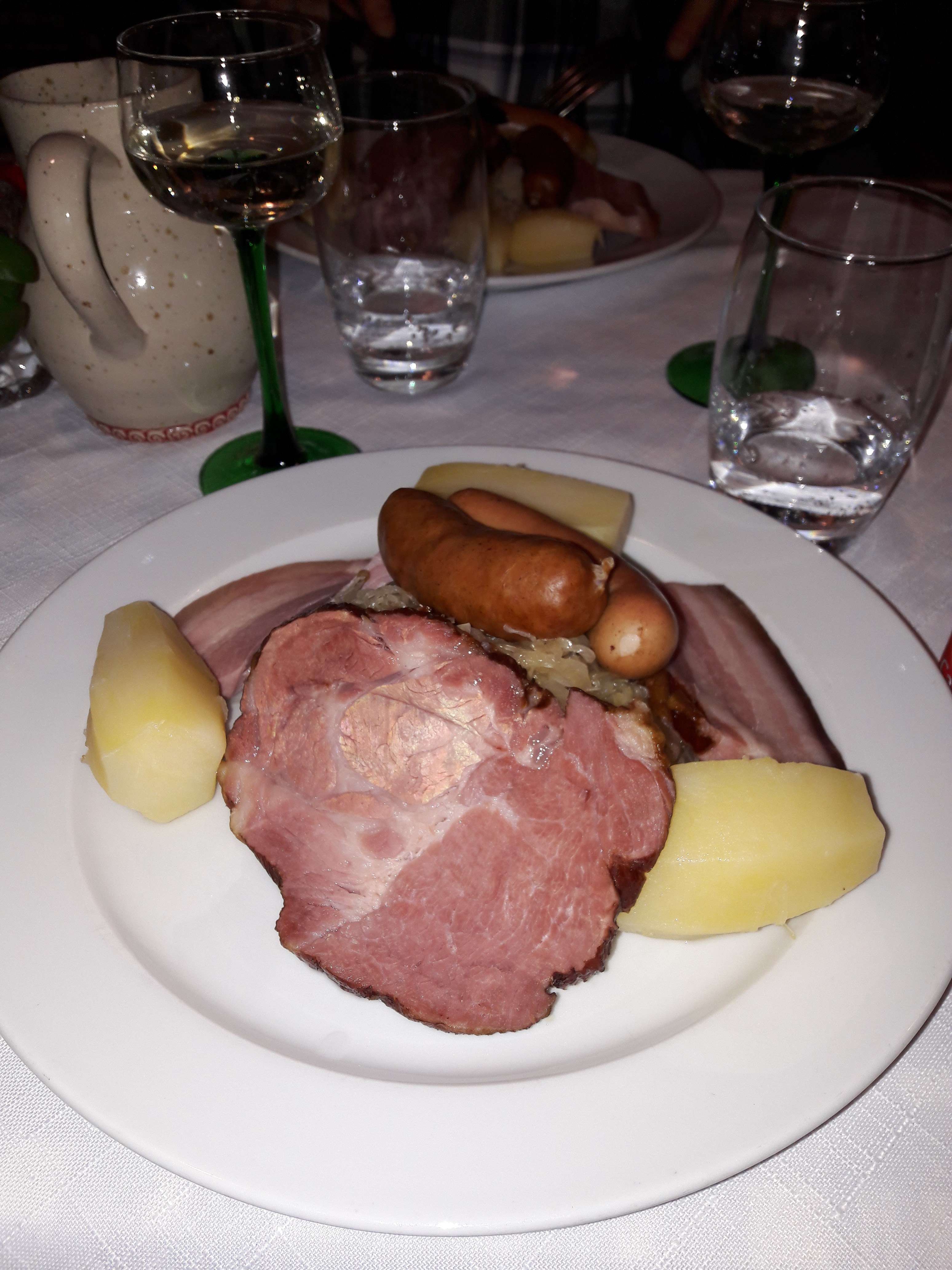 Cuisine typique alsacienne dans un petit village près de Colmar. La cuisine est excellente, entre boeuf gros sel, jambonneau, Bibelakaas ( fromage blanc avec pommes de terre sautées et morceau de Munster) ...