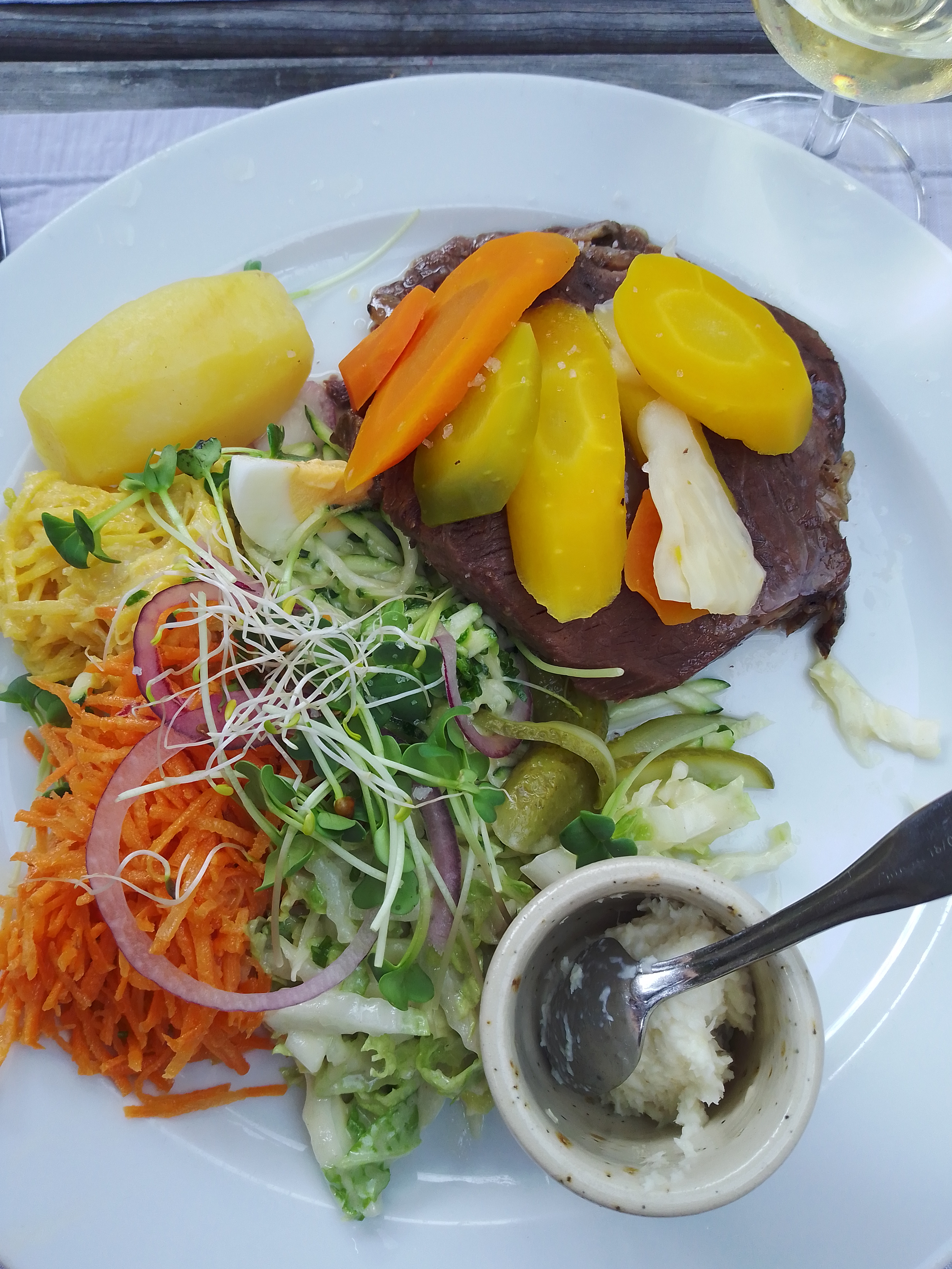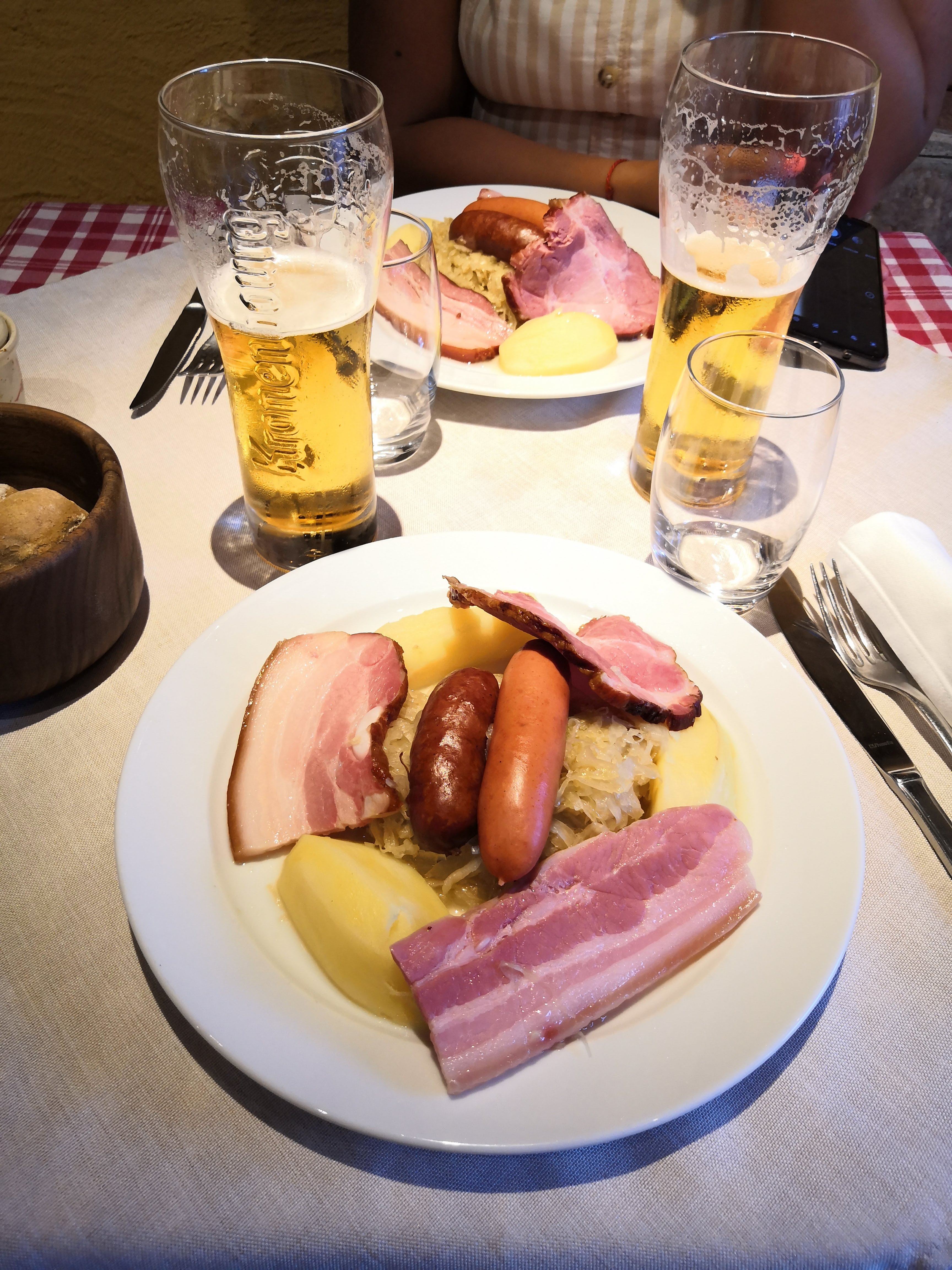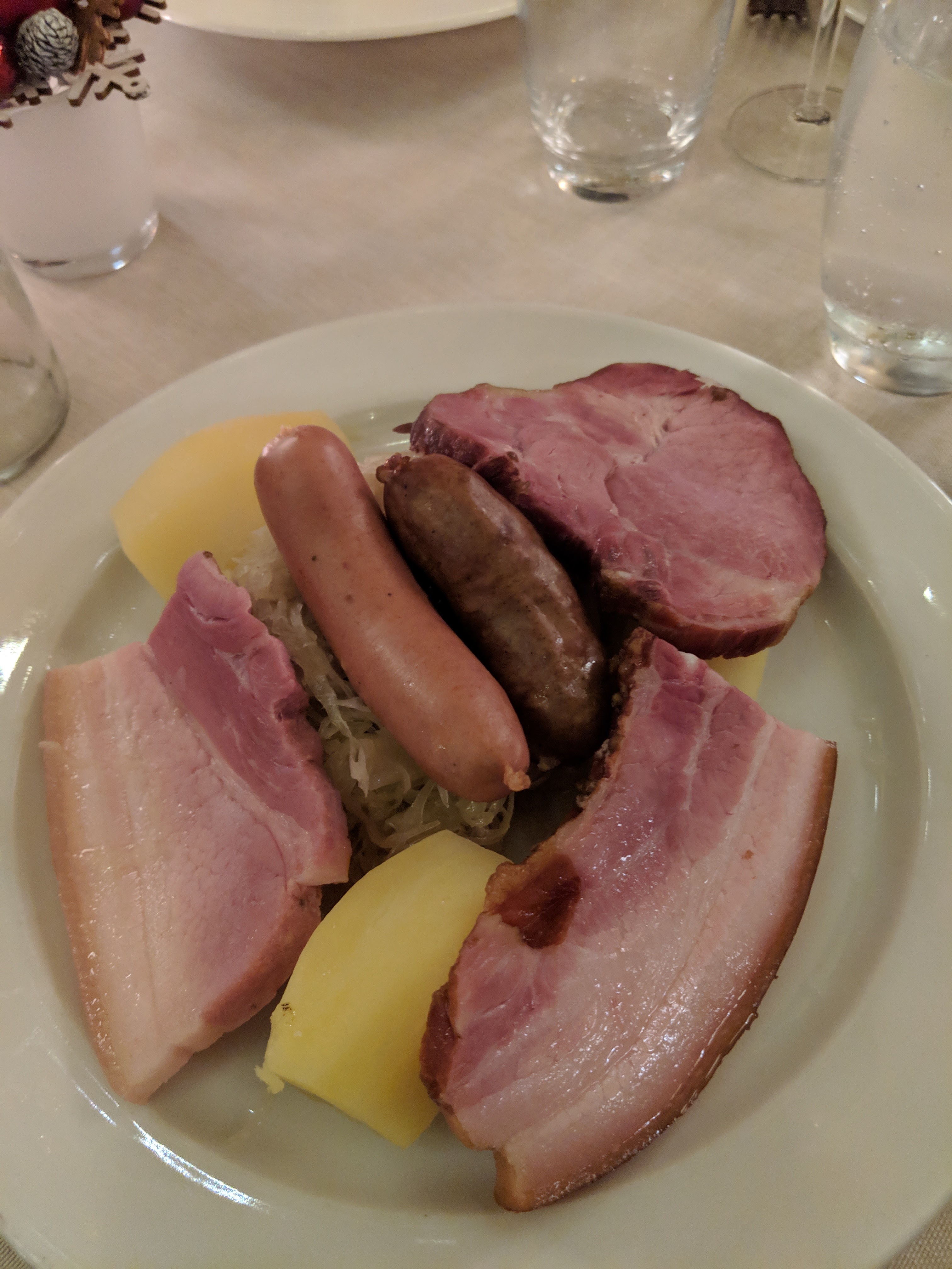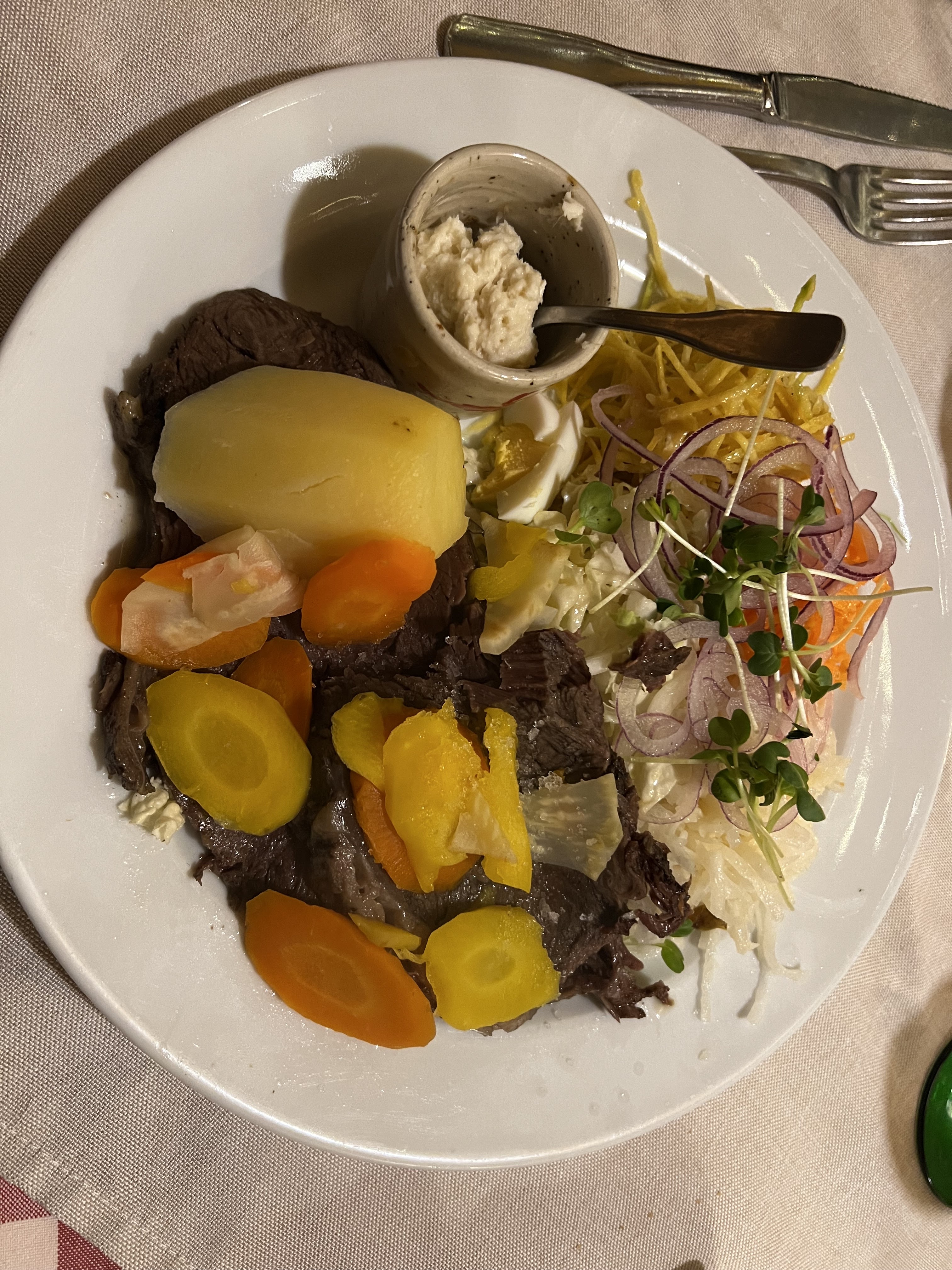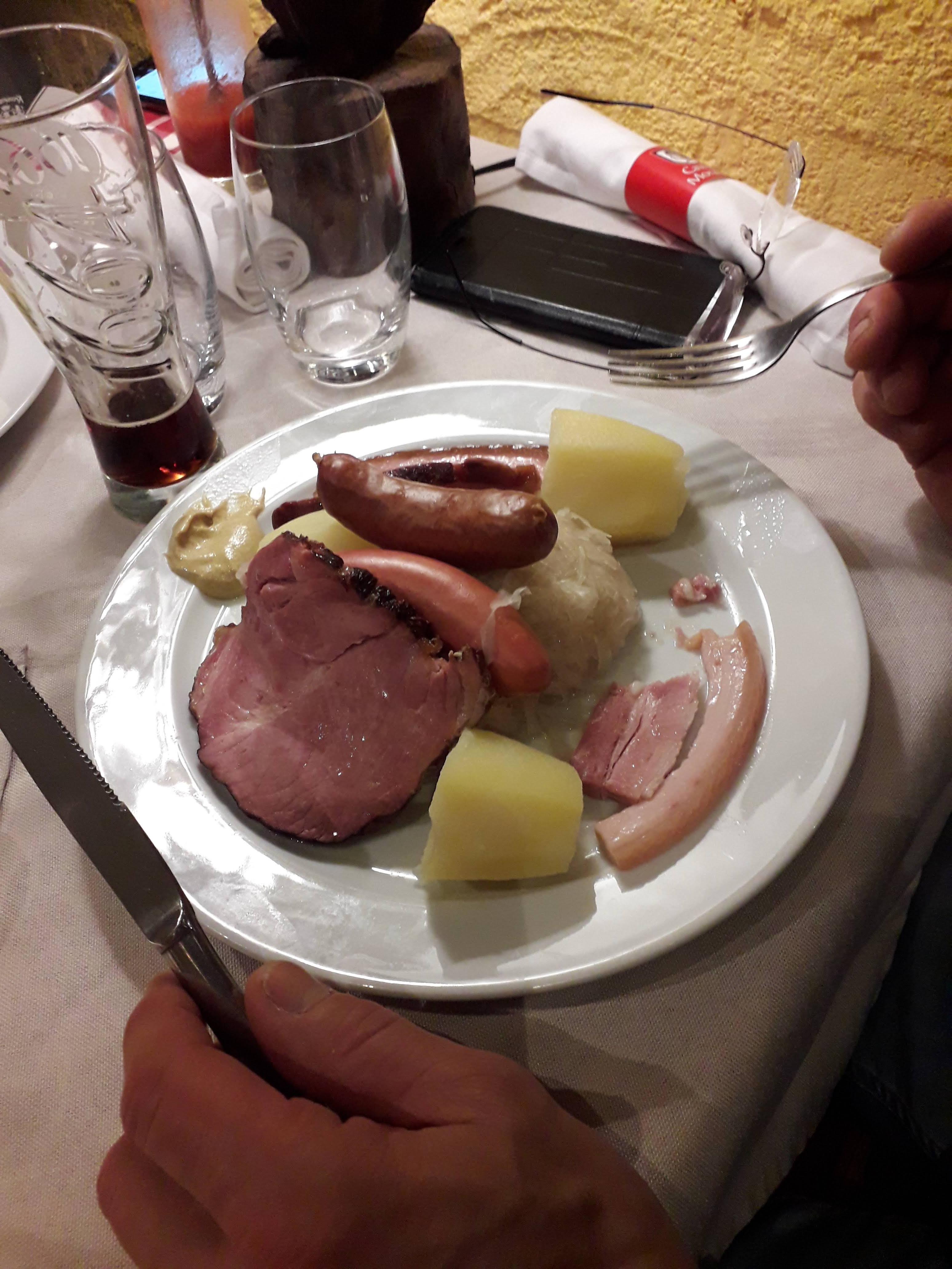 Cuisine typique alsacienne dans un petit village près de Colmar. La cuisine est excellente, entre boeuf gros sel, jambonneau, Bibelakaas ( fromage blanc avec pommes de terre sautées et morceau de Munster) ...