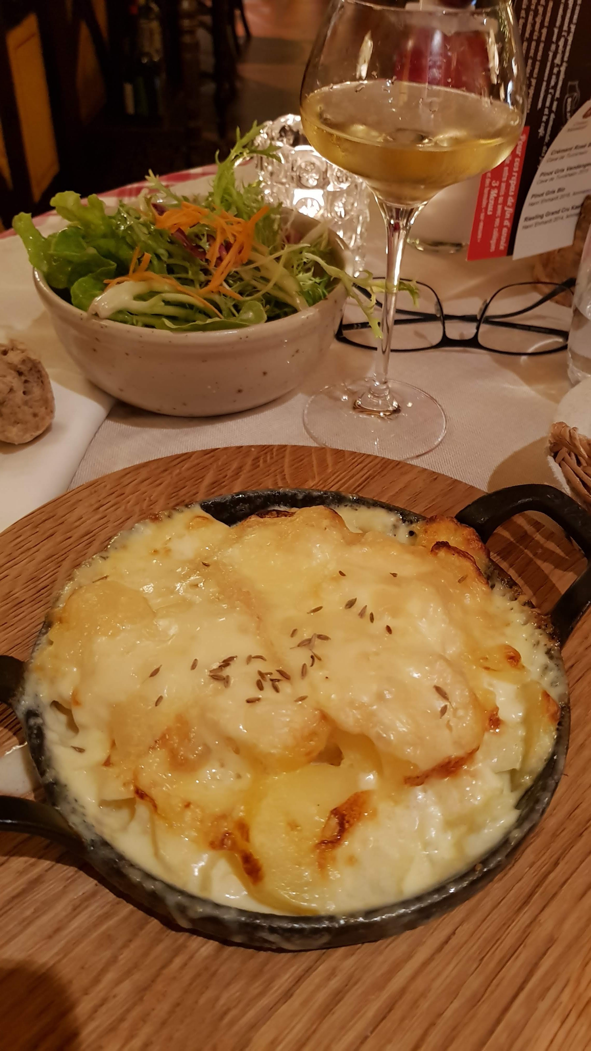 Très joli restaurant réparti en plusieurs salles. Bakeof aux trois viandes mijoté très goûteux, avec une seconde assiette pour les gourmands et une vraie salade verte. Tarte à la rhubarbe avec meringue à l'italienne. Le tout copieux mais léger Très bons vins de la localité, aux bons millésimes. Service attentionné et efficace. Ne pas hésiter !