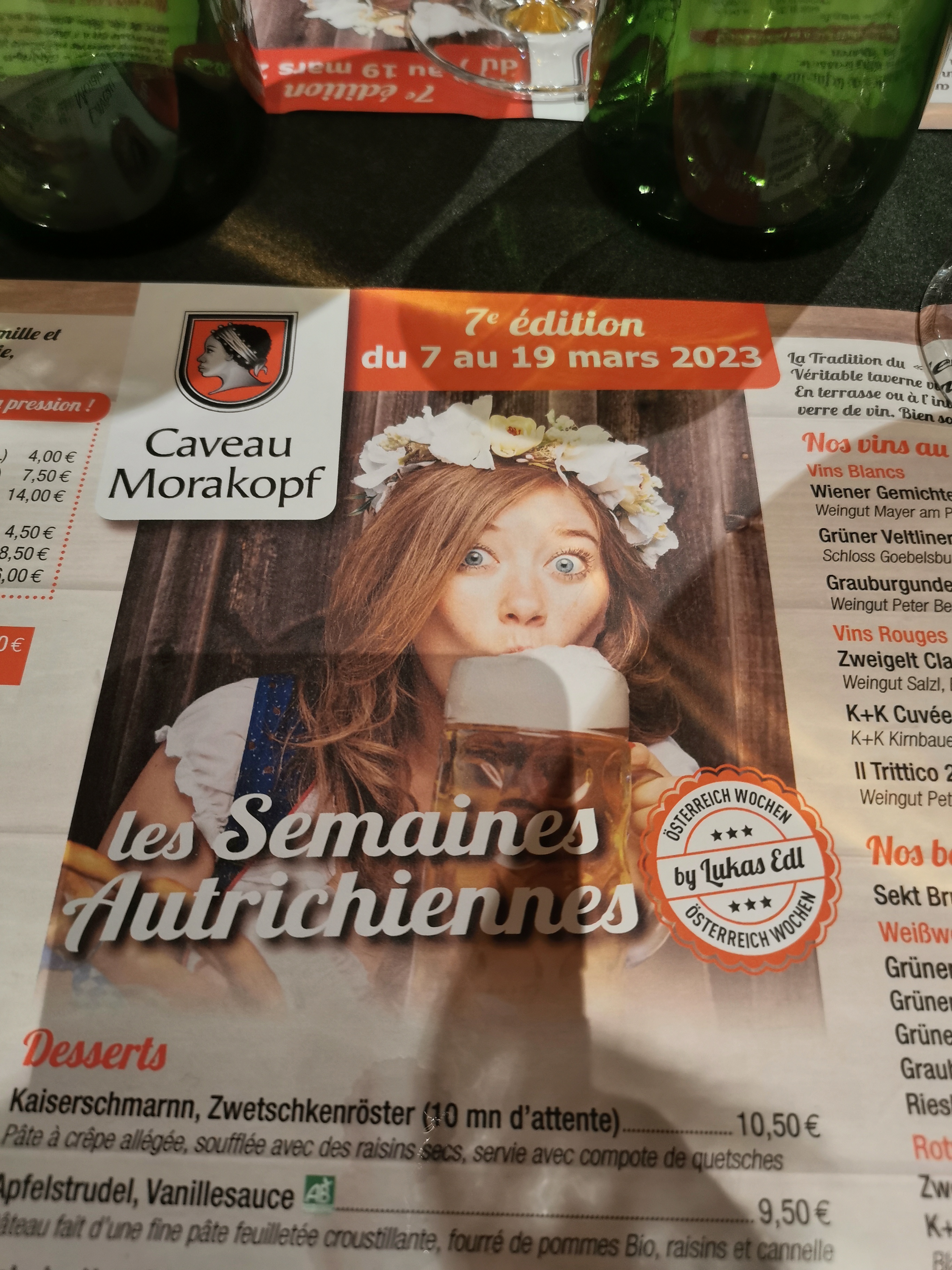 C'est lors d'une émission de télévision que nous avons découvert ce winstub et nous avions très envie d'y aller goûter les spécialités de la cuisine alsacienne . Nous avons été enchantés par le décor si typique d'un winstub , l'acceuil chaleureux , un service rapide et des assiettes très généreuses . Nous gaderons un excellent souvenir de notre dîner au caveau Morakopf , une excellente adresse .