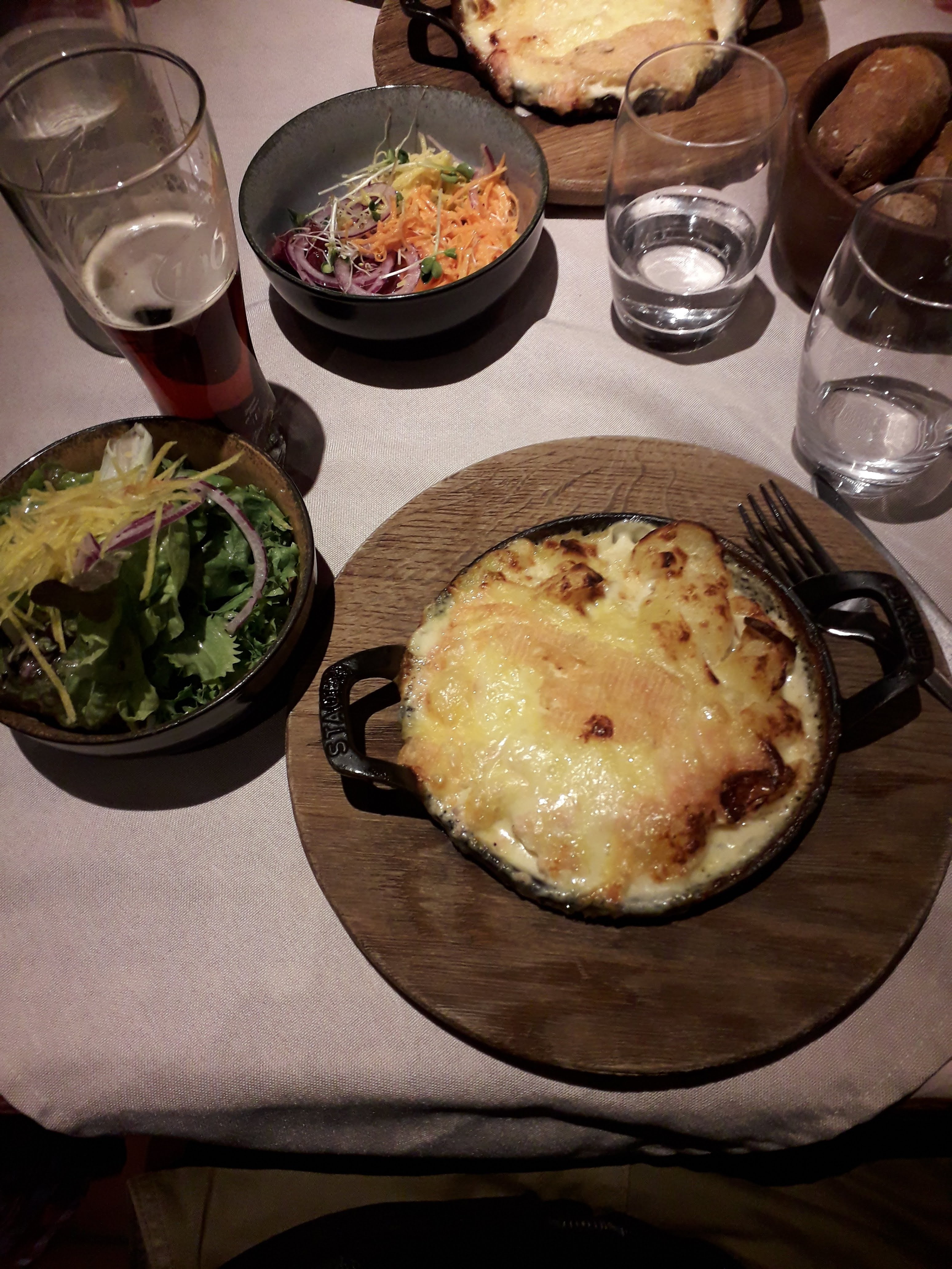 Un repas excellent dans un cadre très jolie , malheureusement réservation faites à 20h30 , 30 minute d’attente dans le froid , notre table étais prête mais personne n’est venu nous chercher .. certaines serveuse très presser de prendre les commandes a peine le temps de lire les cartes , les enfants 1 heures d’attente pour leur menu enfant ( patate avec 2 cervelas ) , et des bouteilles d’eau plate à 6e unité un peu choquant au moment de l’addition.
