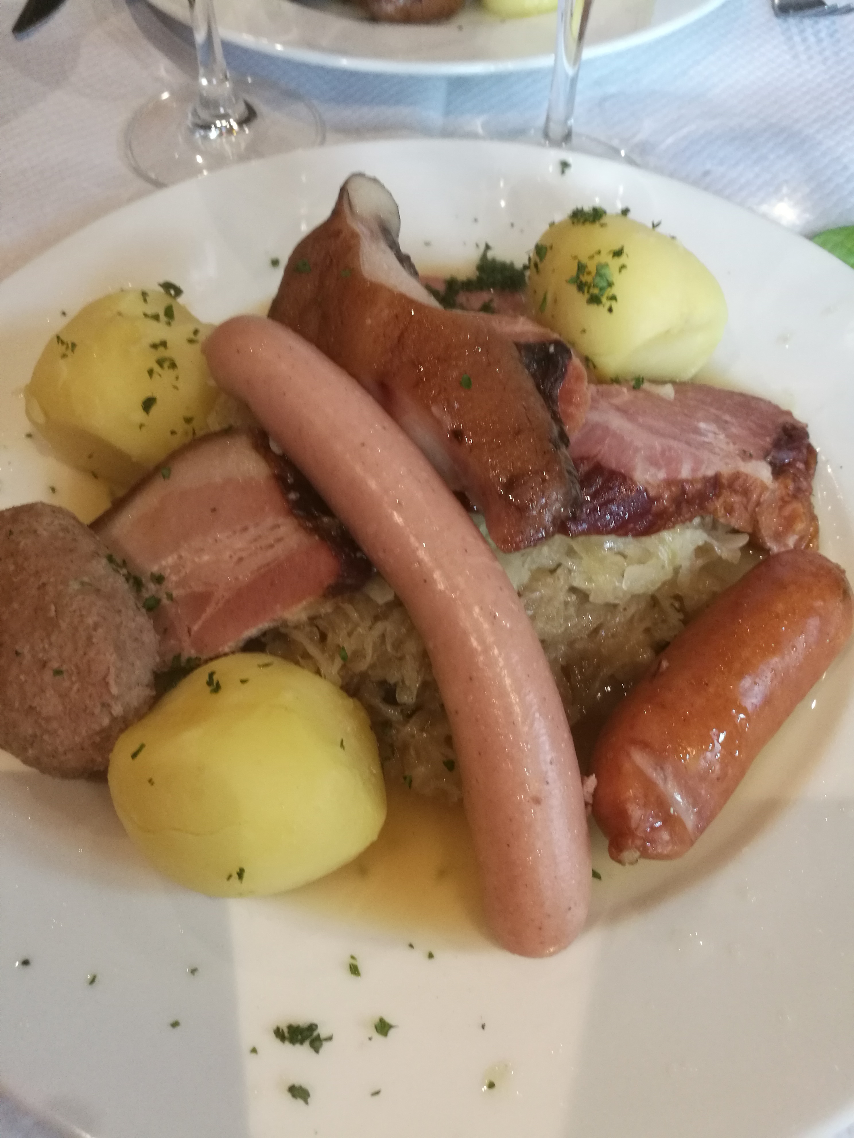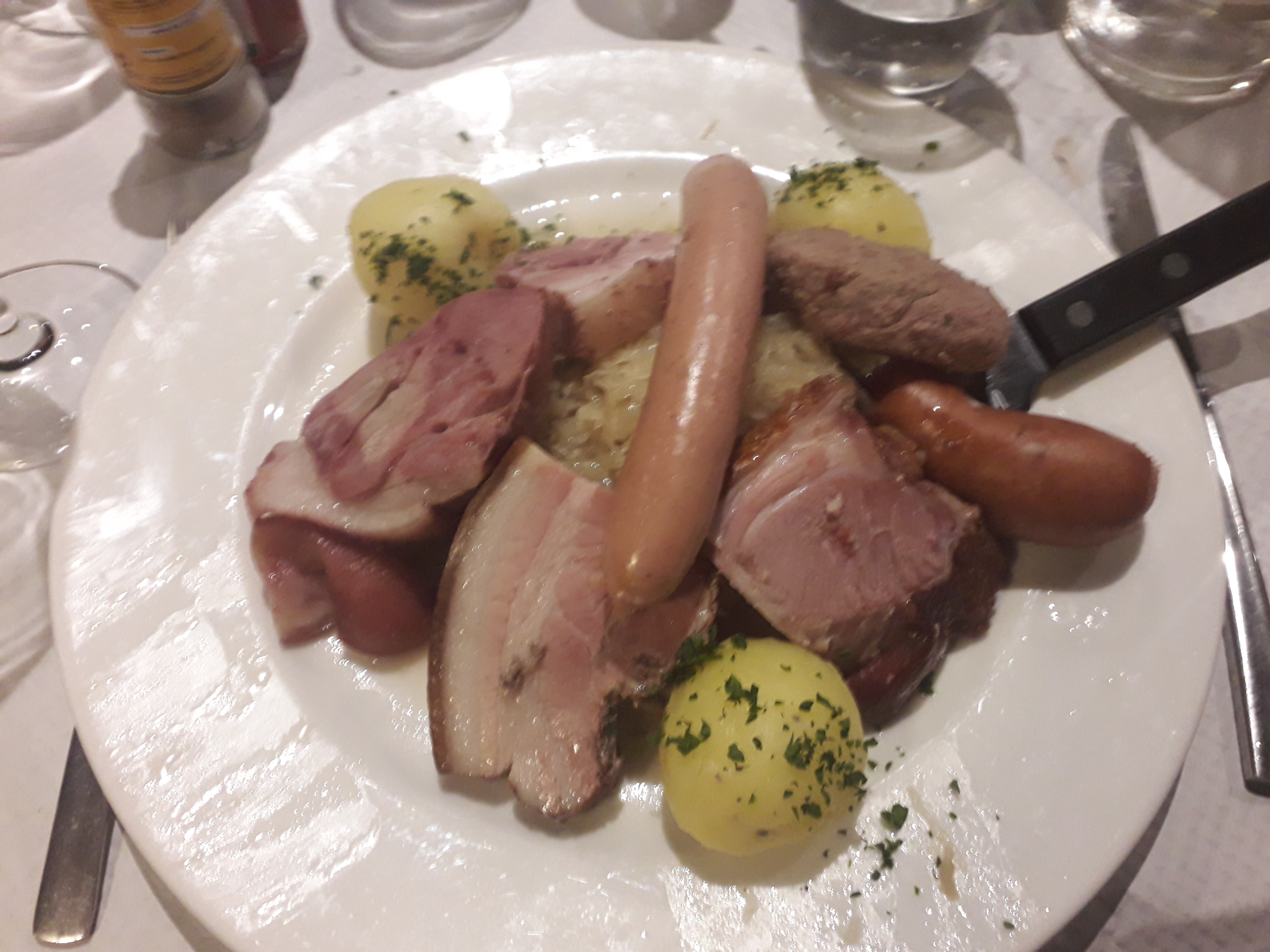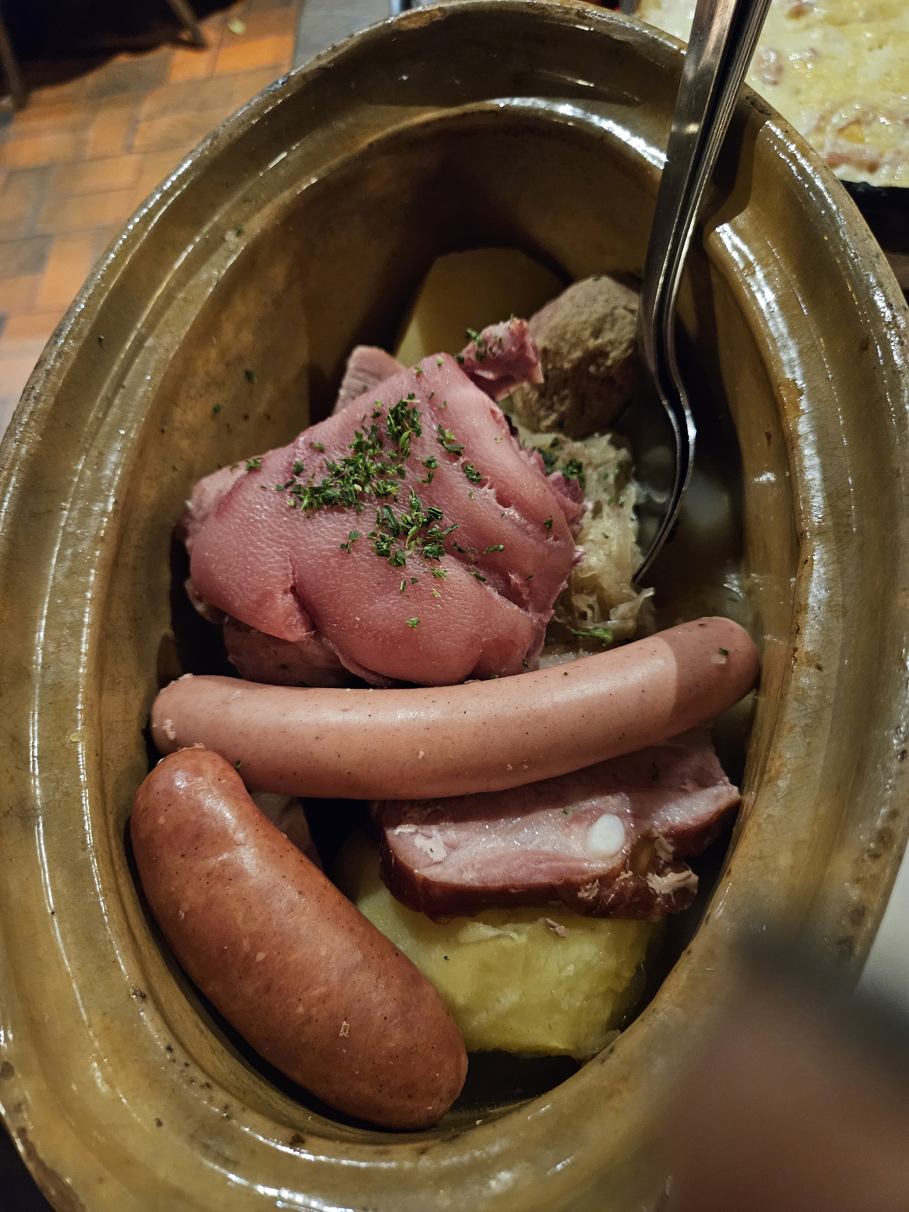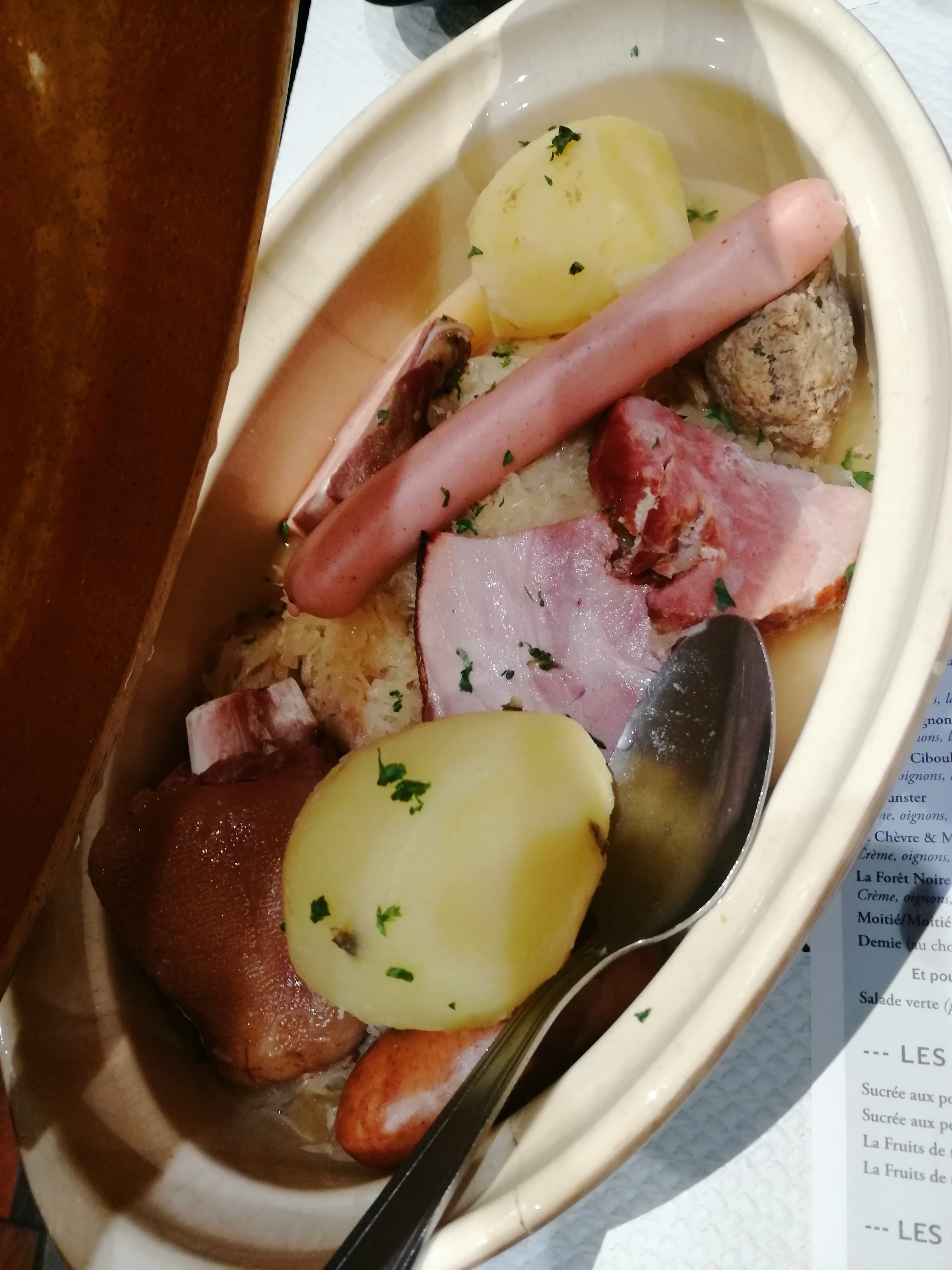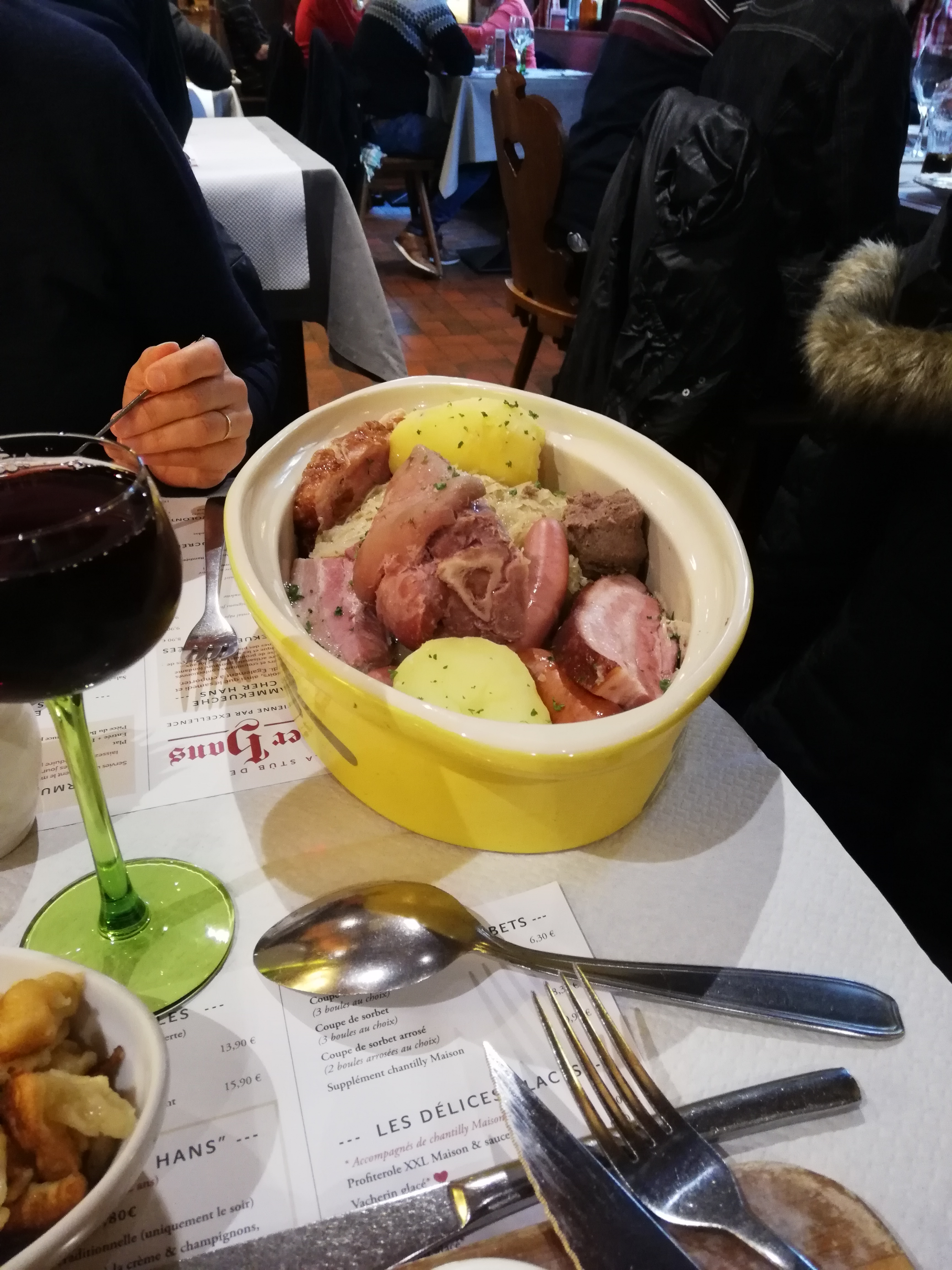Nourriture bonne et en grande quantité. Quoique assez grasse donc attention aux lendemains. Dessert OK également. Service un peu calamiteux : plat froid, longue attente pour une carafe d'eau ou pour les plats, embrouille également sur quel serveur fait payer à la borne assez incompréhensible. Ambiance bruyante et intérieur température élevée, serveurs qui se rentre dedans, renversent des choses... Un peu dommage pour le service mais la nourriture est bien qualifiable d'alsacienne