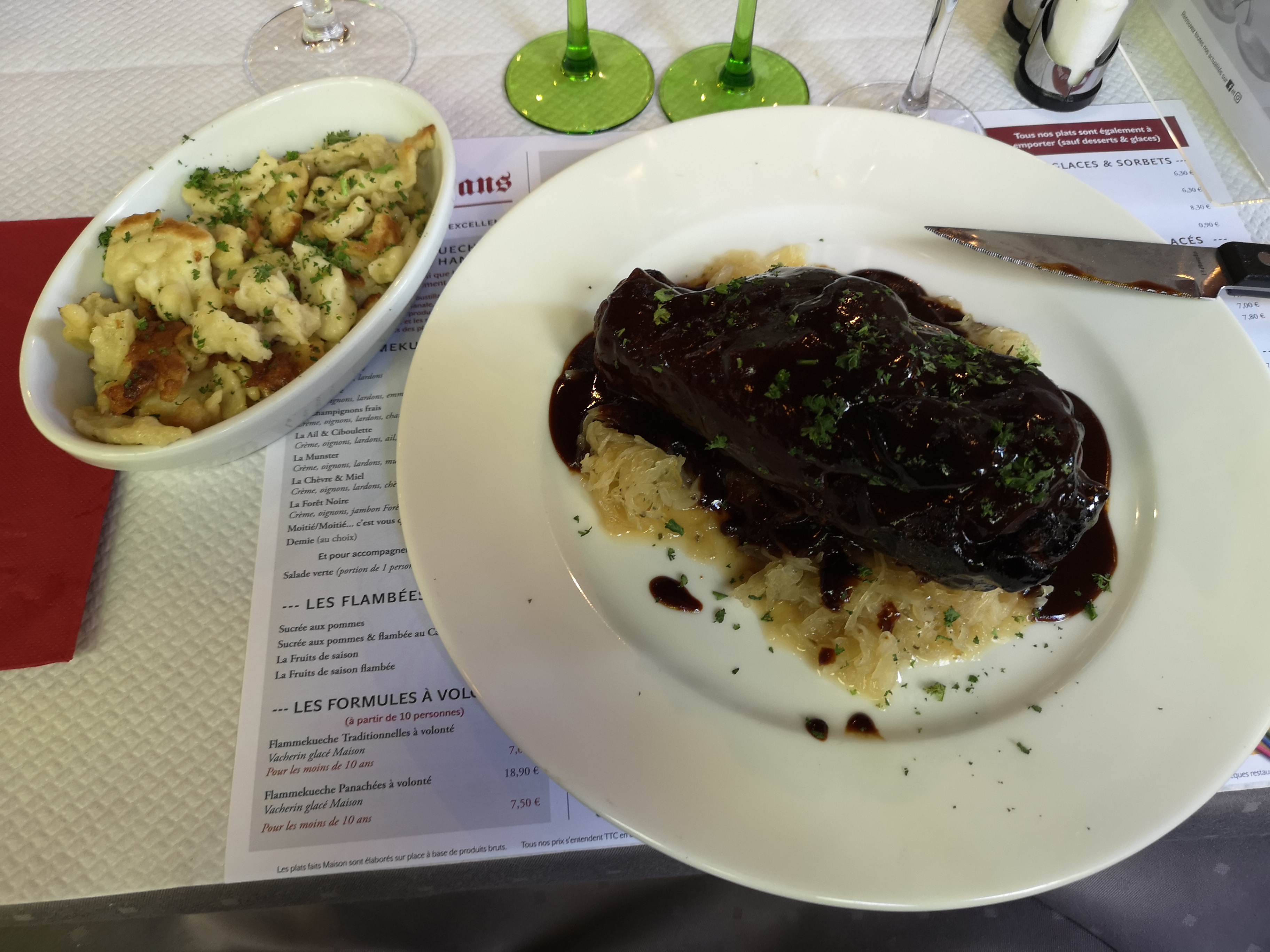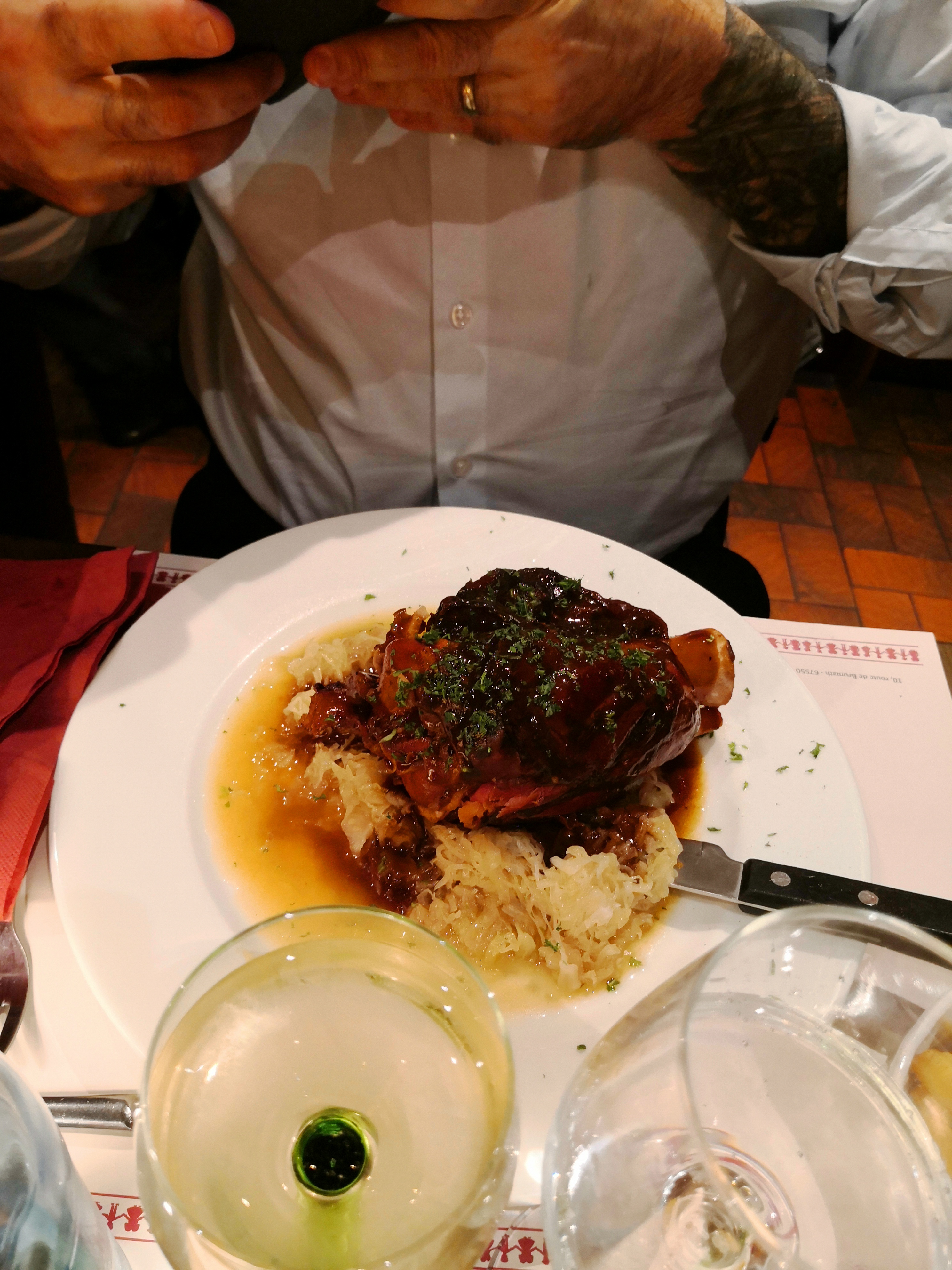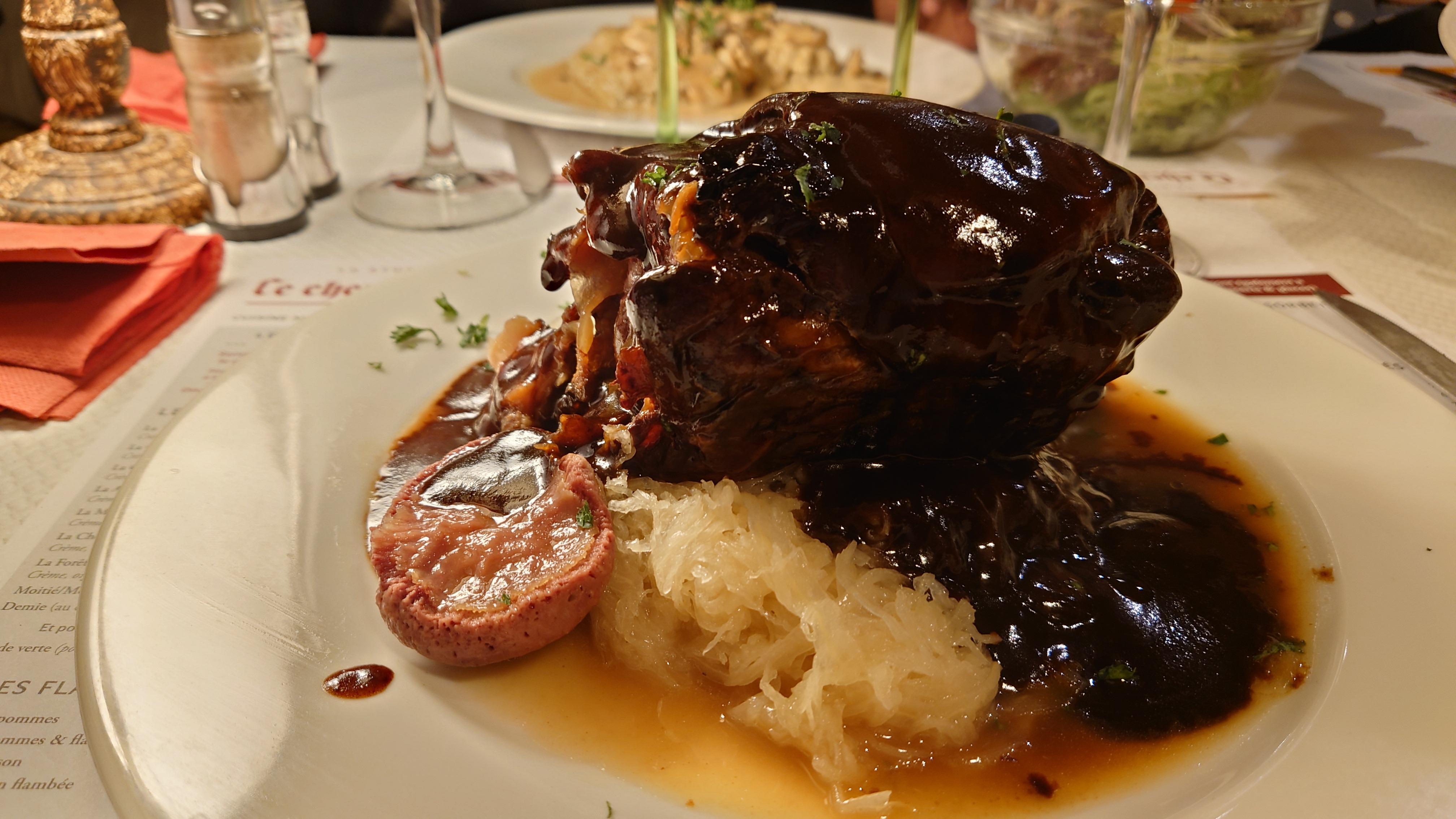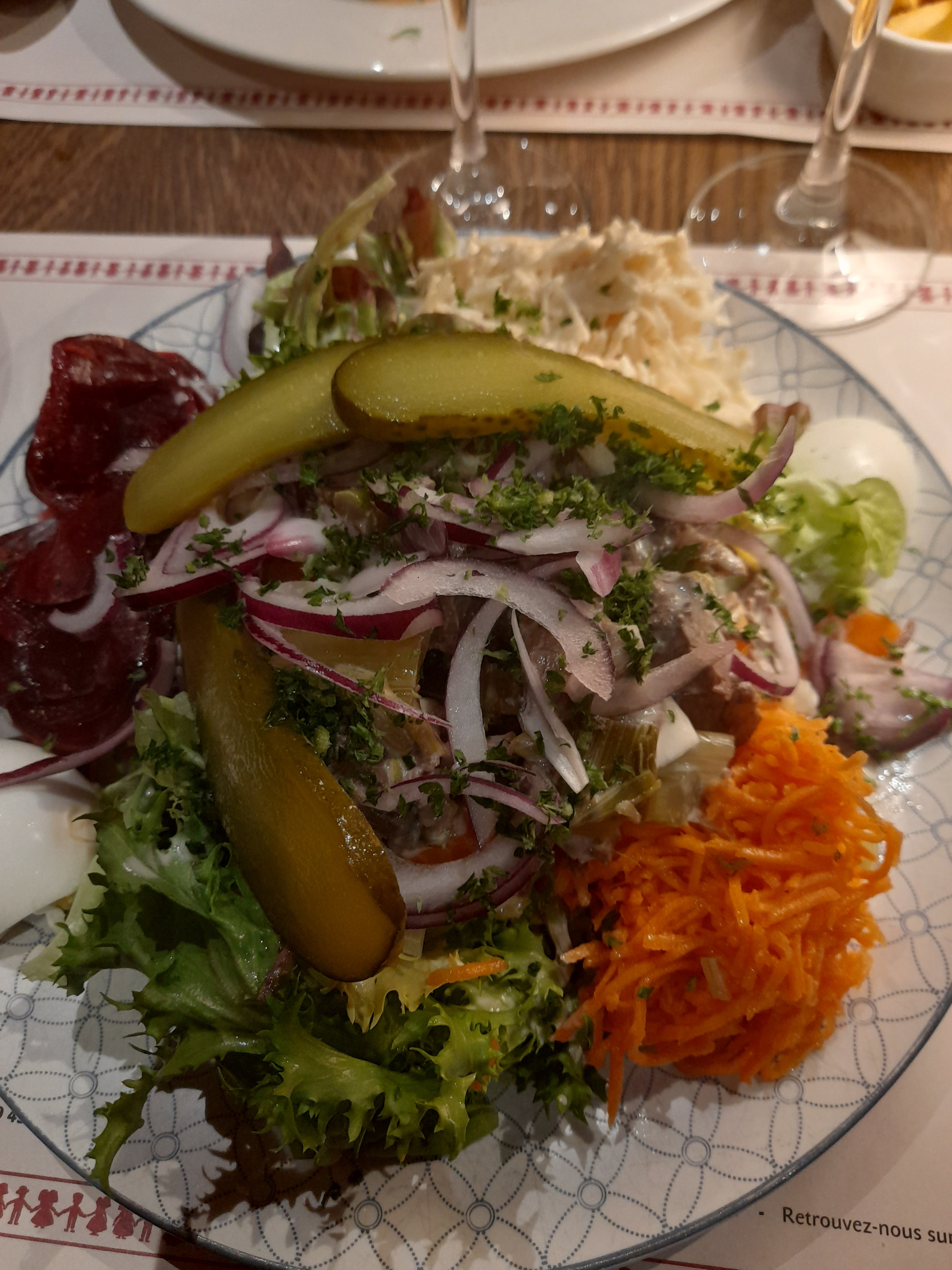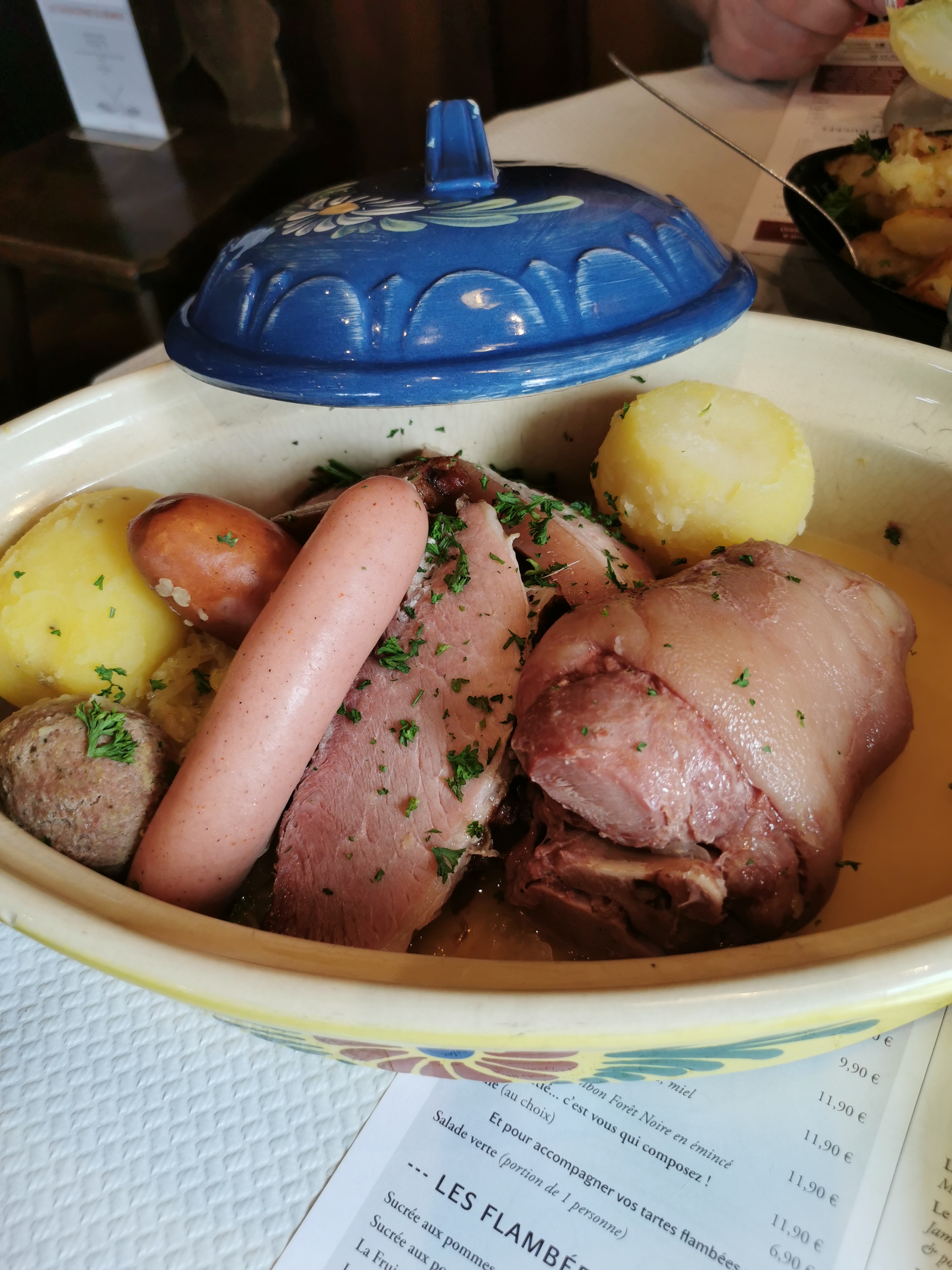 Nourriture bonne et en grande quantité. Quoique assez grasse donc attention aux lendemains. Dessert OK également. Service un peu calamiteux : plat froid, longue attente pour une carafe d'eau ou pour les plats, embrouille également sur quel serveur fait payer à la borne assez incompréhensible. Ambiance bruyante et intérieur température élevée, serveurs qui se rentre dedans, renversent des choses... Un peu dommage pour le service mais la nourriture est bien qualifiable d'alsacienne