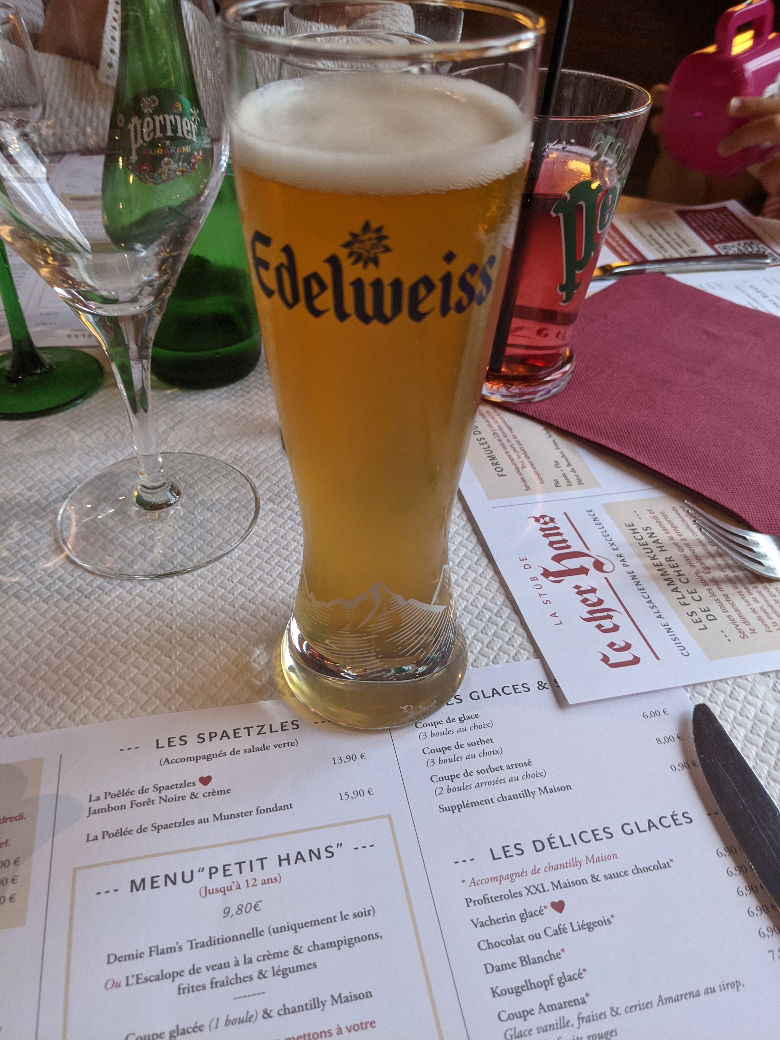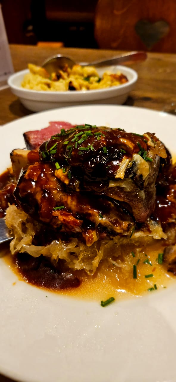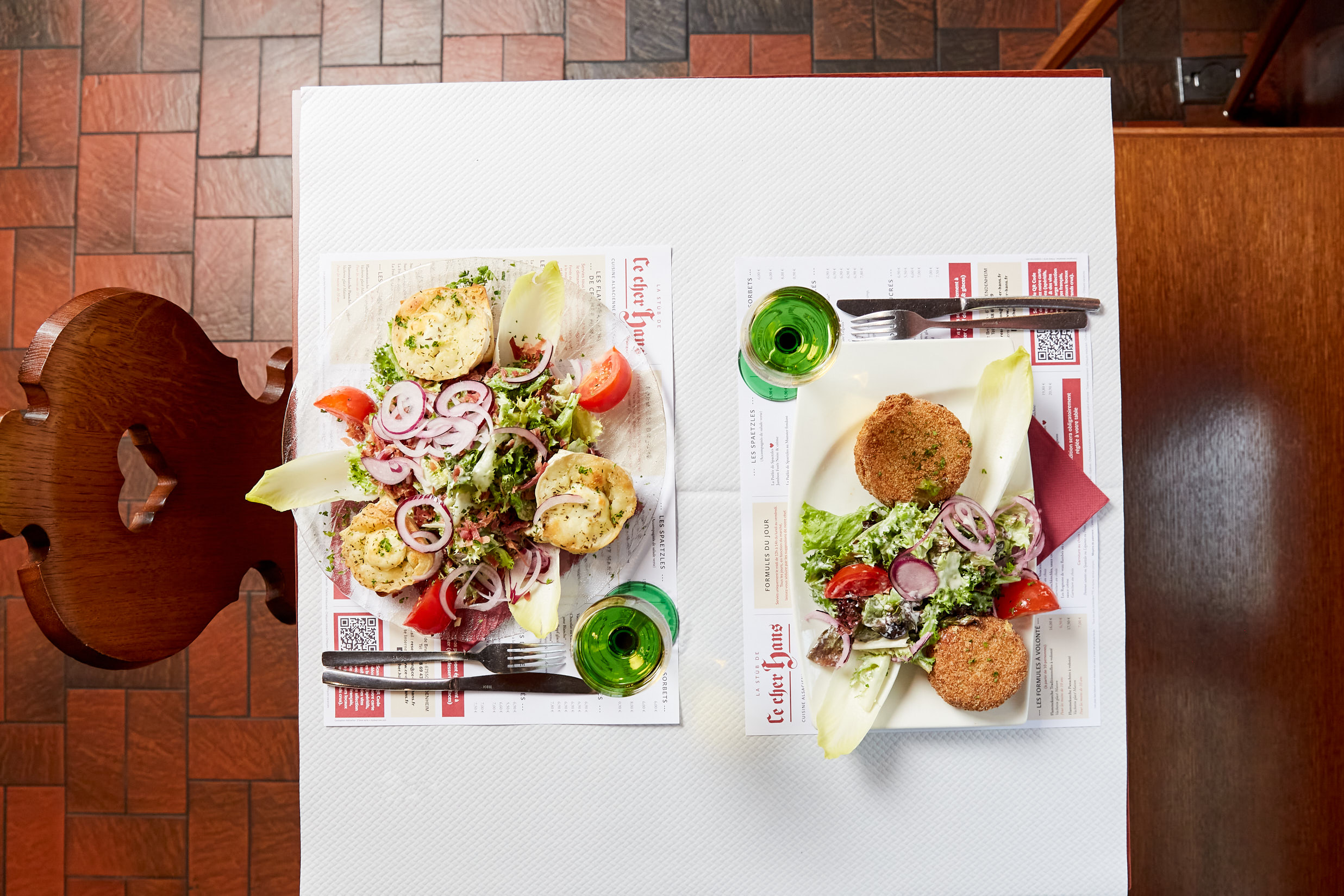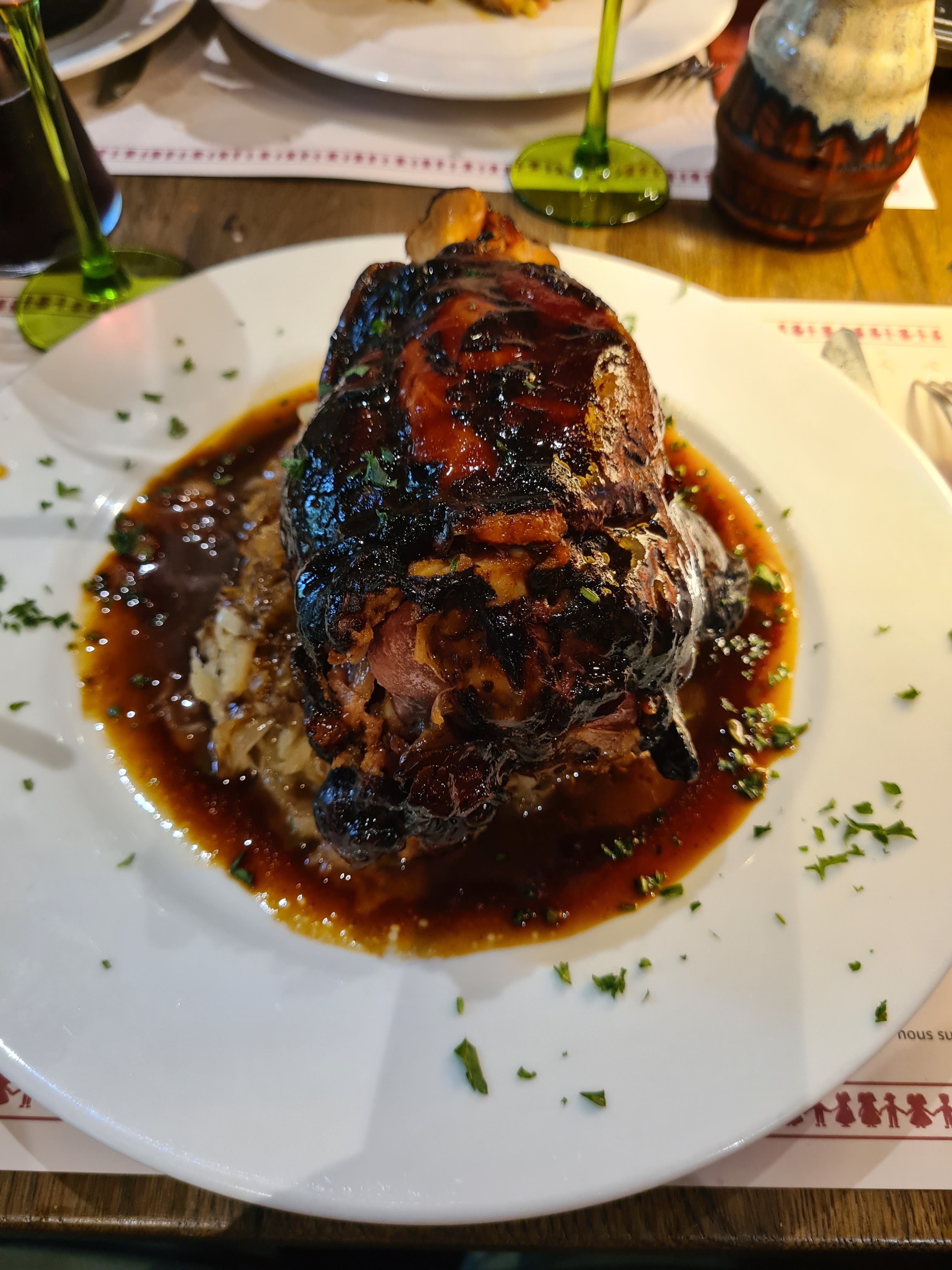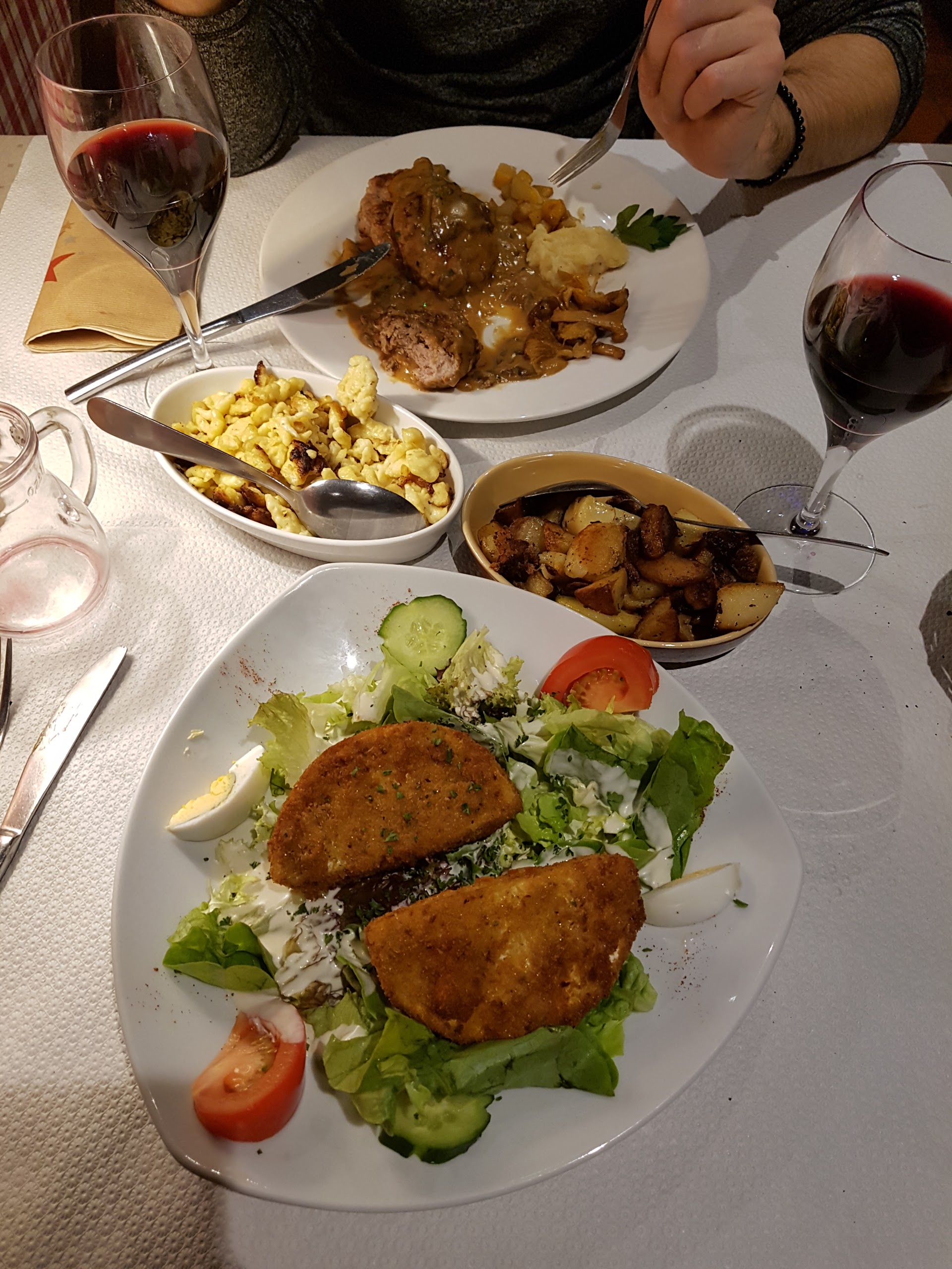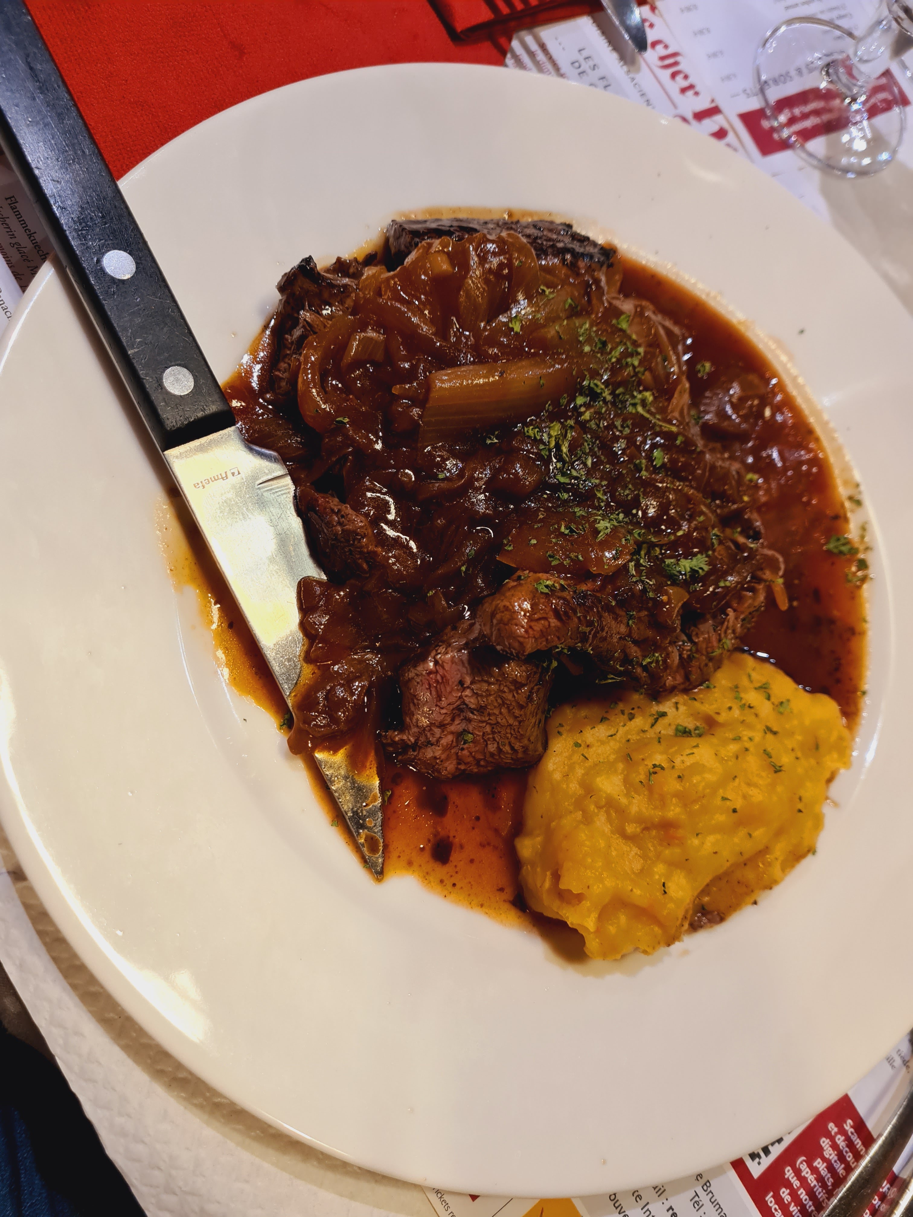 Nourriture bonne et en grande quantité. Quoique assez grasse donc attention aux lendemains. Dessert OK également. Service un peu calamiteux : plat froid, longue attente pour une carafe d'eau ou pour les plats, embrouille également sur quel serveur fait payer à la borne assez incompréhensible. Ambiance bruyante et intérieur température élevée, serveurs qui se rentre dedans, renversent des choses... Un peu dommage pour le service mais la nourriture est bien qualifiable d'alsacienne