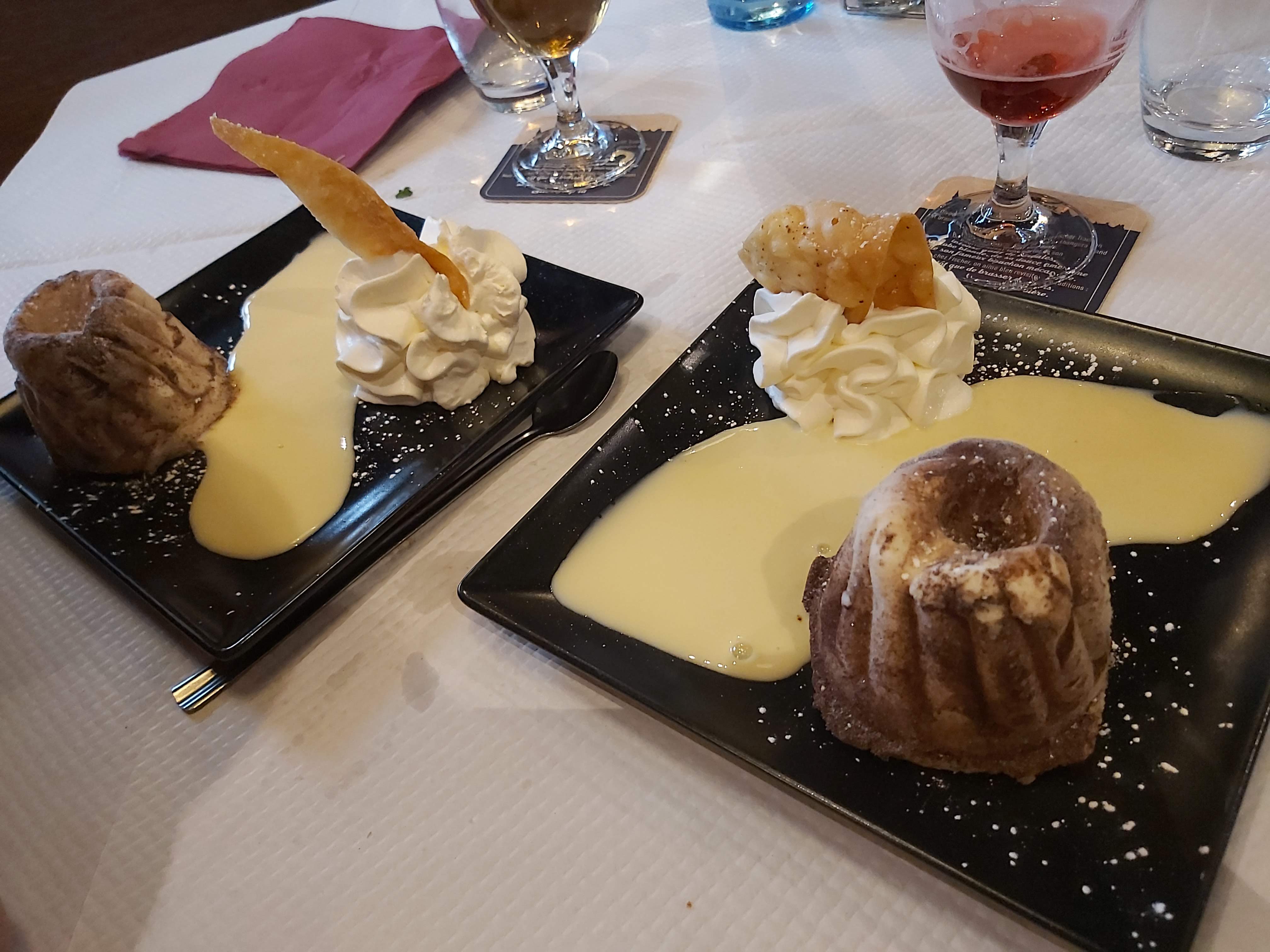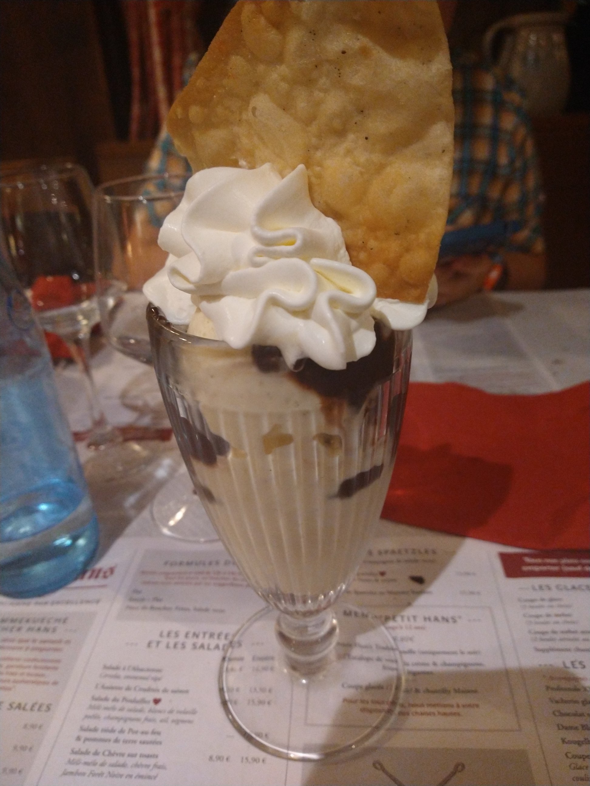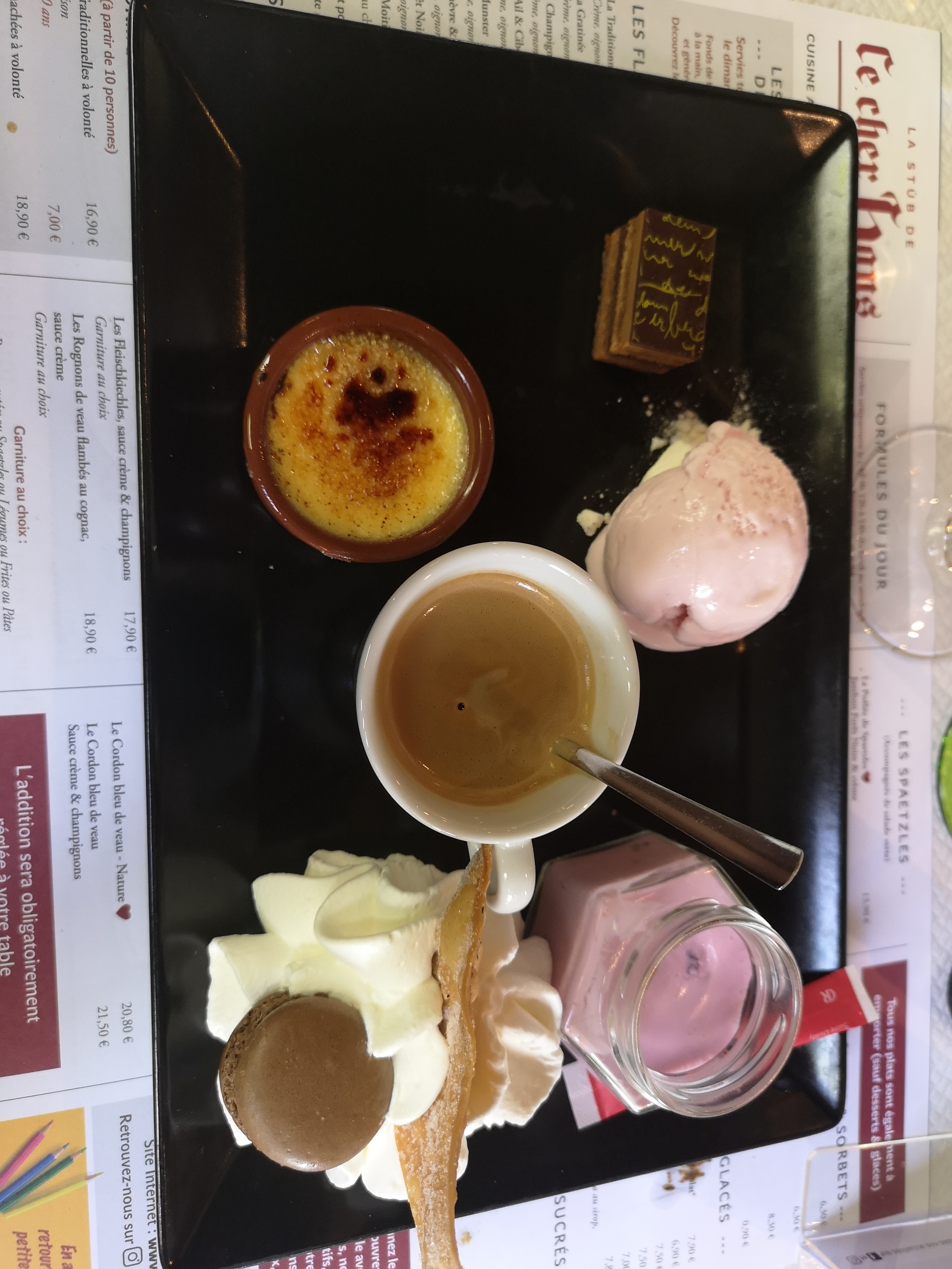 Bon accueil,cadre agréable, service sympa, mais déçu cette fois ci,la tarte flambée était très coulante,fromage de la gratinée jaunâtre,la dame blanche avec chocolat entre la glace et la chantilly,donc figé,le café gourmand très moyen,une boule de glace,du yaourt dans une coupelle,un macaron,deux petits entremets,et une portion de chantilly. Rien à voir avec les photos de présentation. Nouvelle direction? nouveau chef?en tout cas il y a eu du changement.