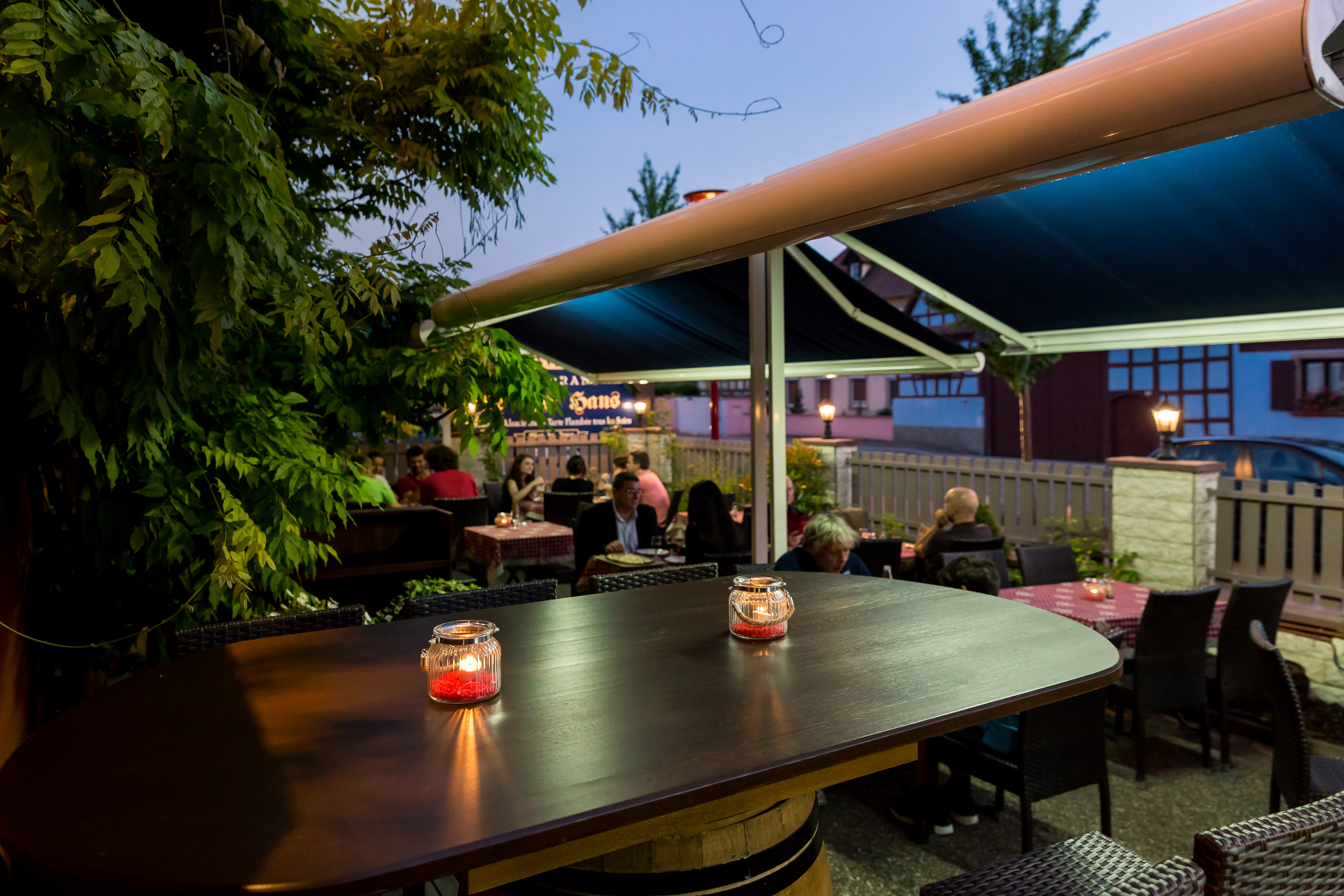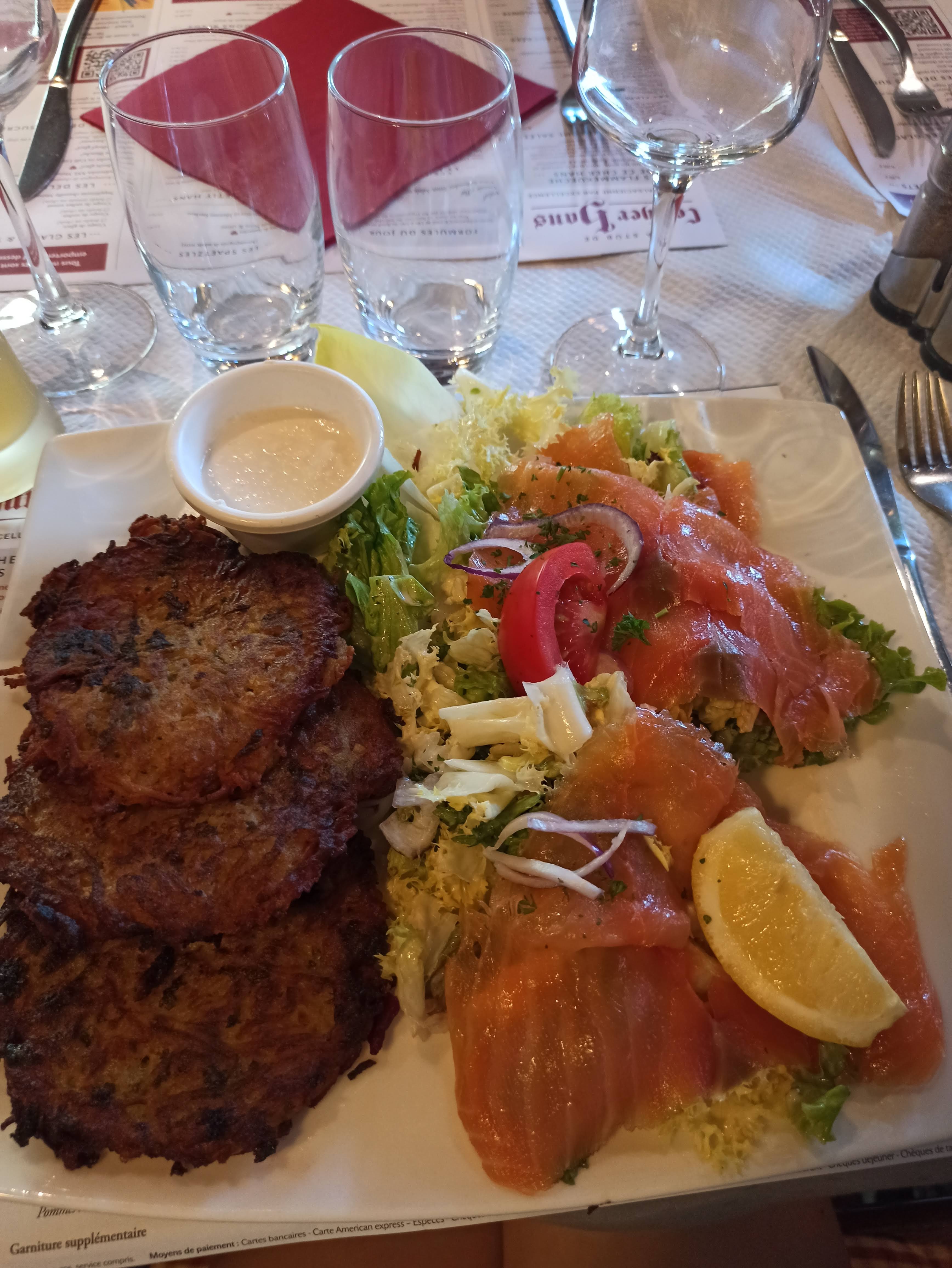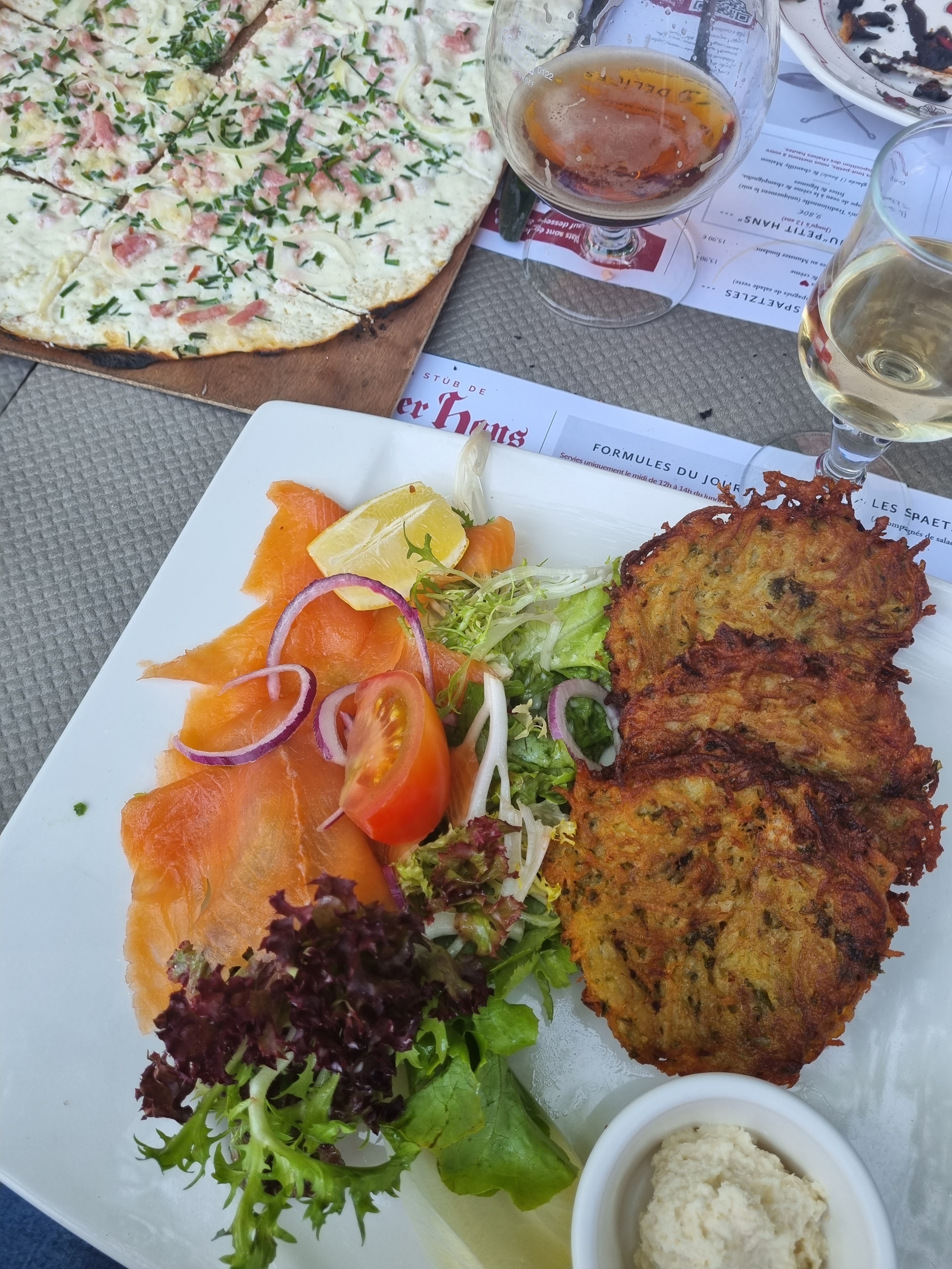 La tarte flambée gratinée est vraiment exceptionnelle, je la recommande vivement ! Concernant le reste, nous avons toujours été ravis du restaurant, autant les plats que le service. Nous n'avons été déçus qu'une seule fois où le service en terrasse laissait clairement à désirer, autant sur le temps d'attente que sur le fonctionnement. Certains souhaitaient manger des tartes flambées mais personne n'est revenu leur demander ce qu'ils souhaitaient (après la première qu'ils ont partagé), notre bouteille de vin n'a pas été ouverte, nous n'avons jamais eu les carafes d'eau ou autres boissons demandées... Nous nous sommes également questionnés sur un plat : les galettes de pommes de terre au saumon où entre 2 assiettes, la quantité de saumon doublait entre les deux... Nous y retournerons tout de même, en espérant que cet incident n'était que passager.