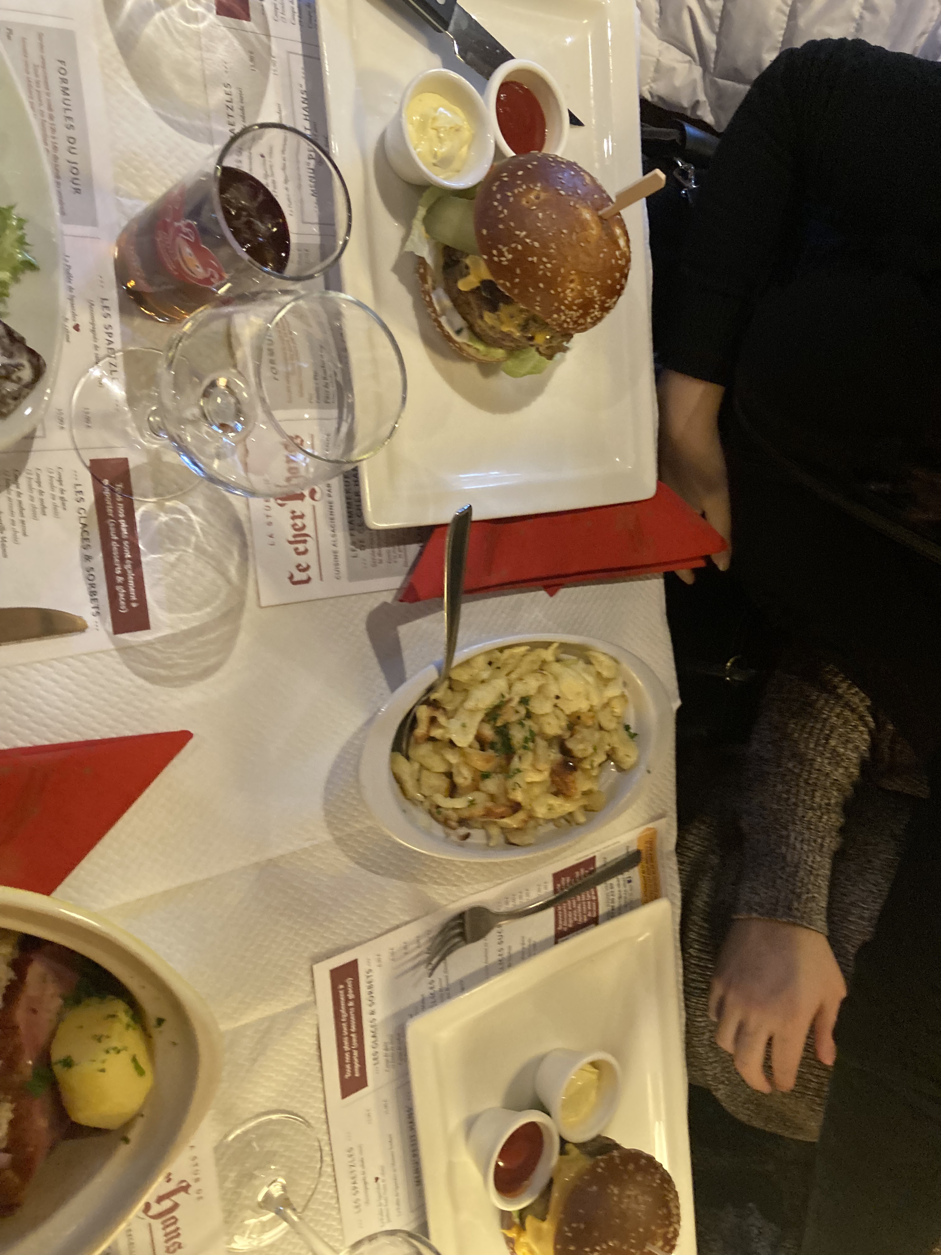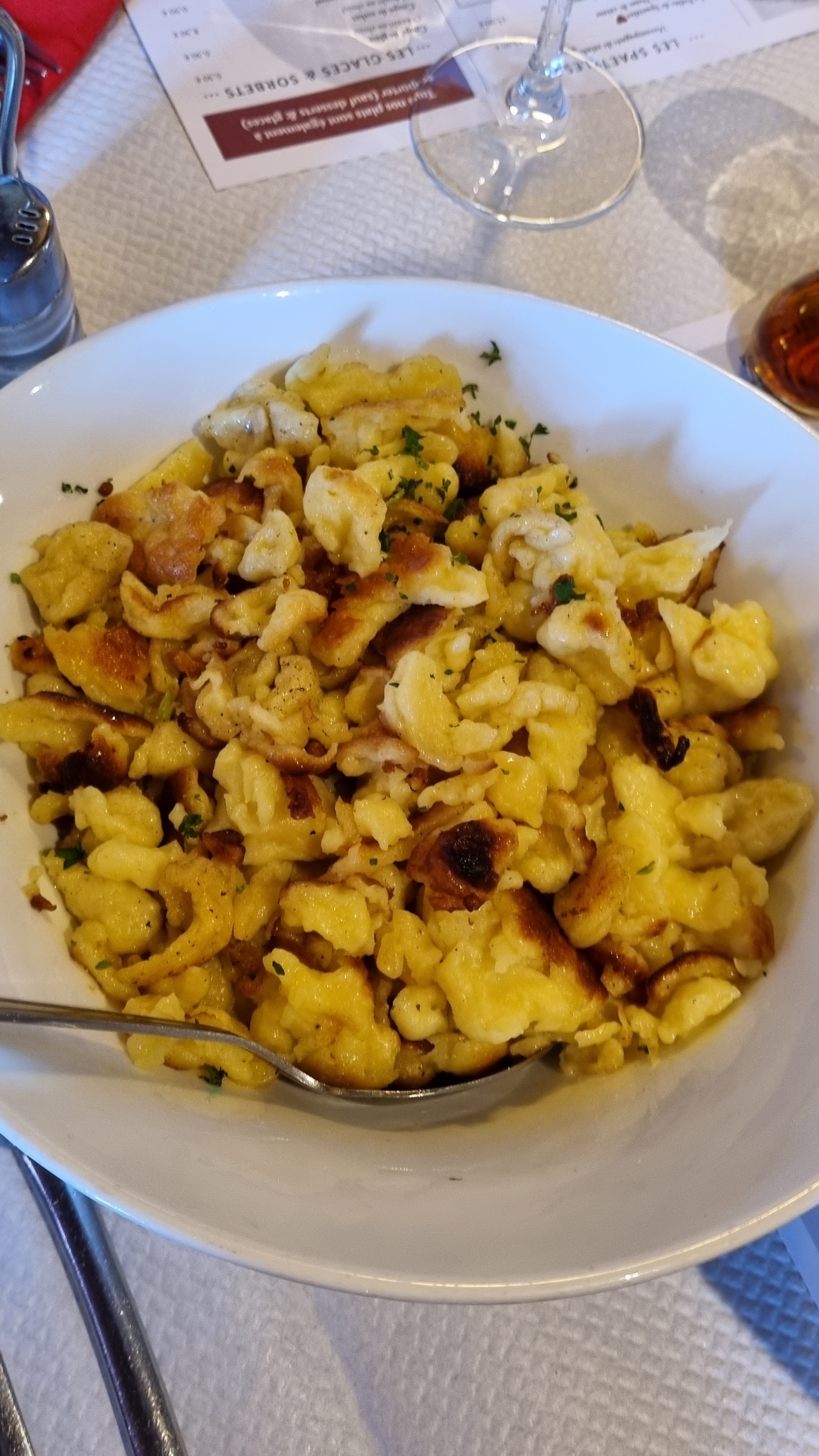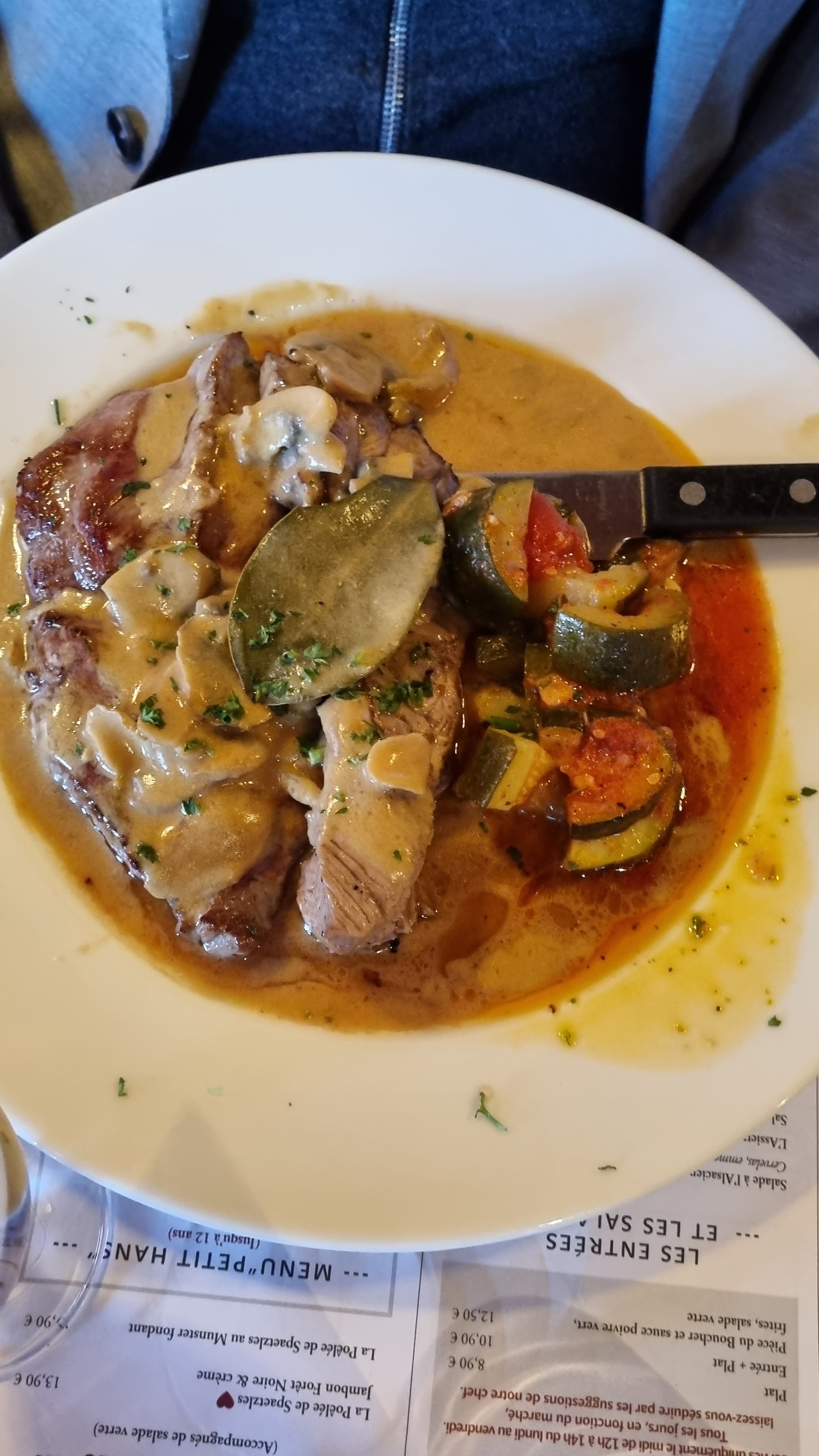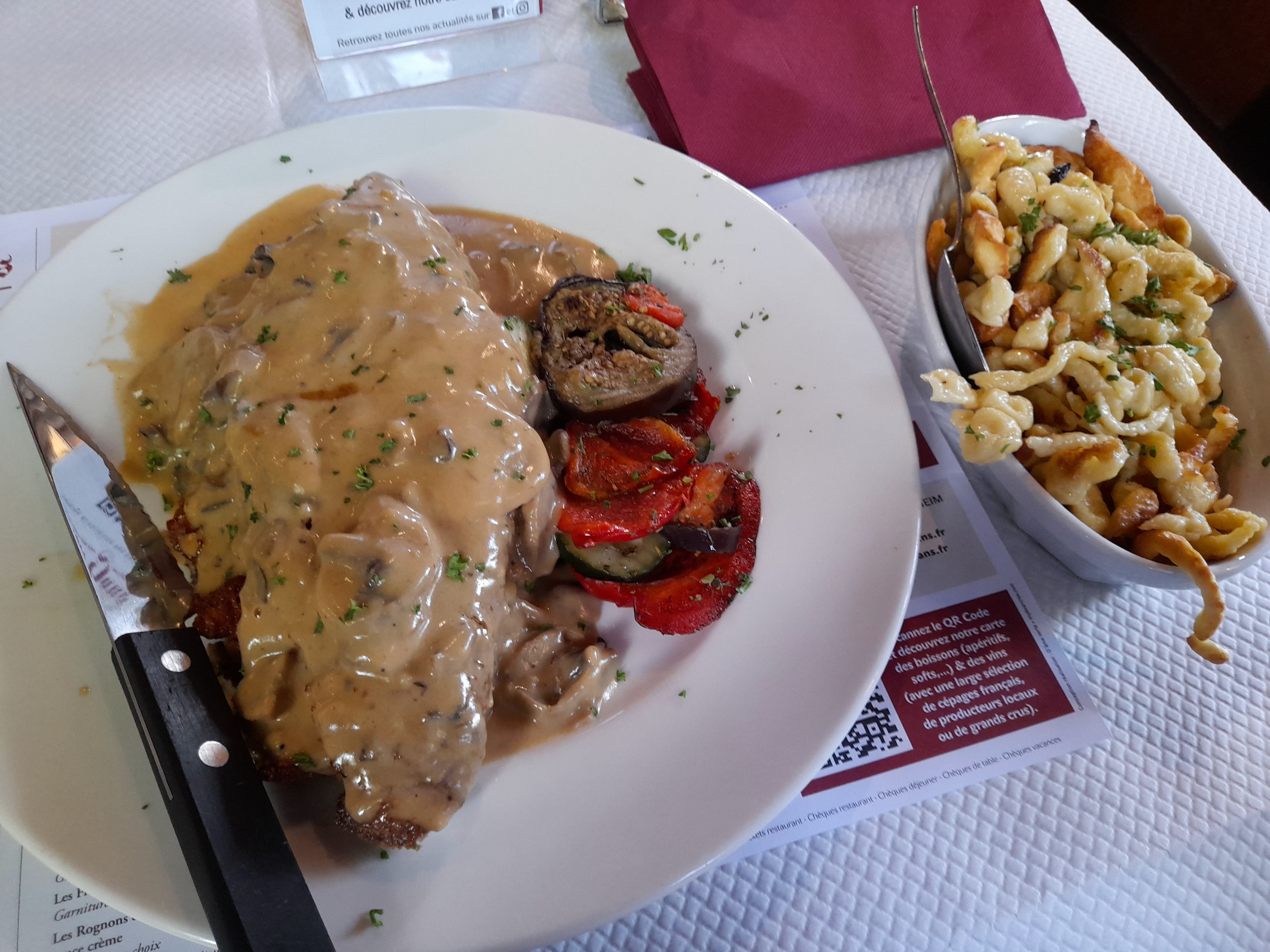 Je suis venu entre midi et deux avec des collègues de travail. J'ai pris l'entrée du jour qui était un croque monsieur avec une petite salade qui était bonne. En plat j'ai pris des spaetzles au munster qui était très bon et bourratif comme on aime. En dessert j'ai pris une tarte rhubarbe meringuée qui était bonne. Franchement j'ai bien aimé le restaurant et en plus niveau qualité prix on s'y retrouve je recommande !