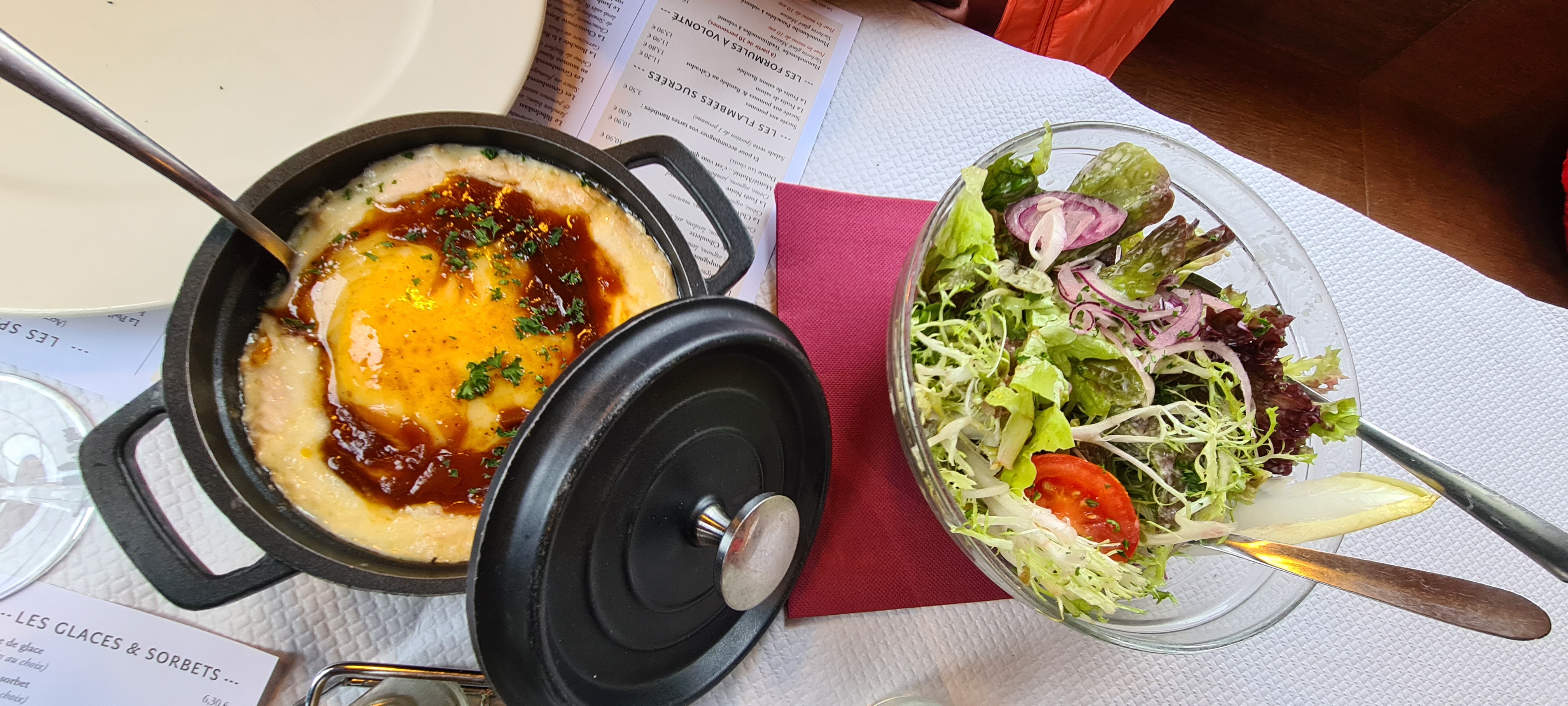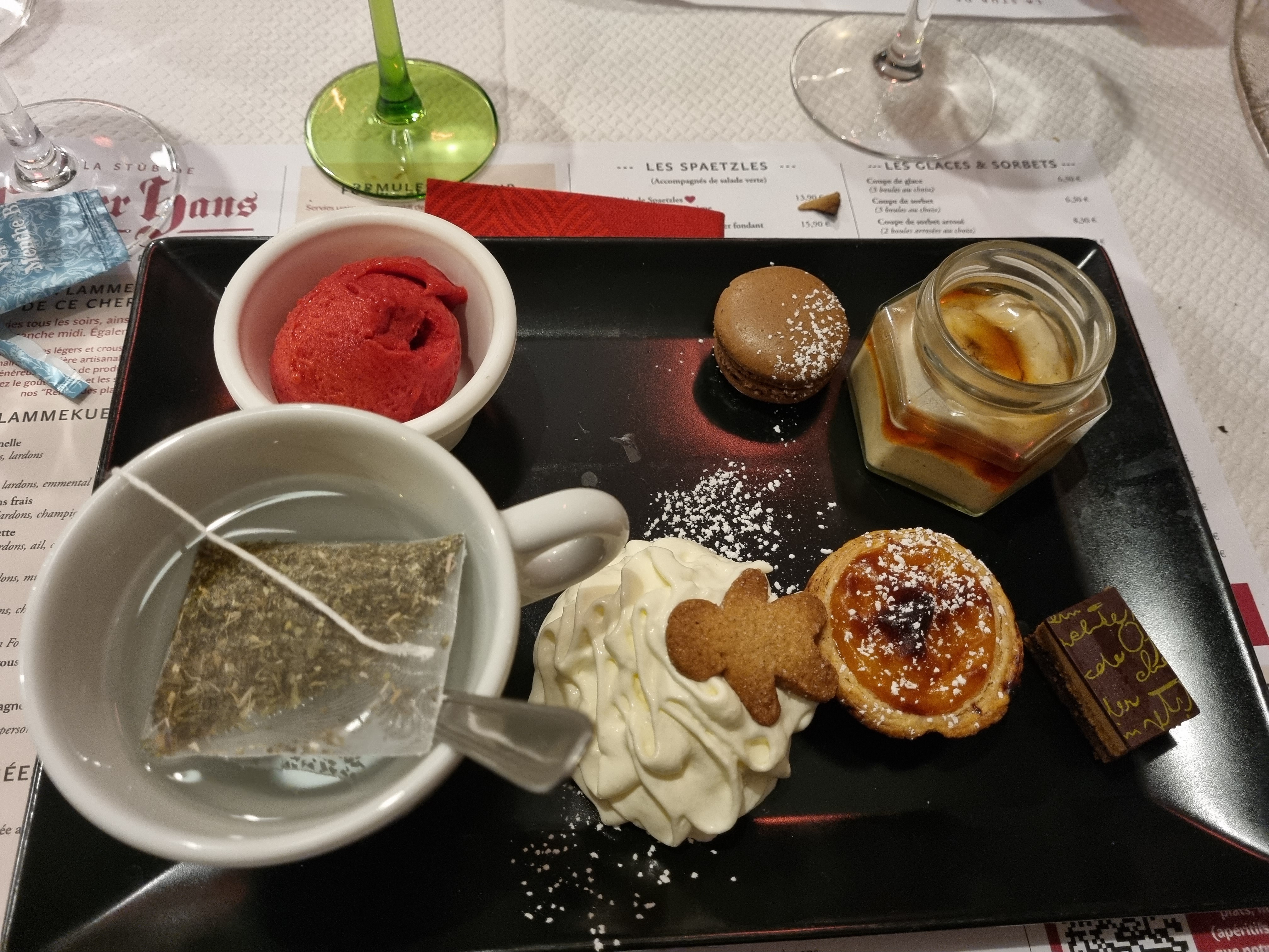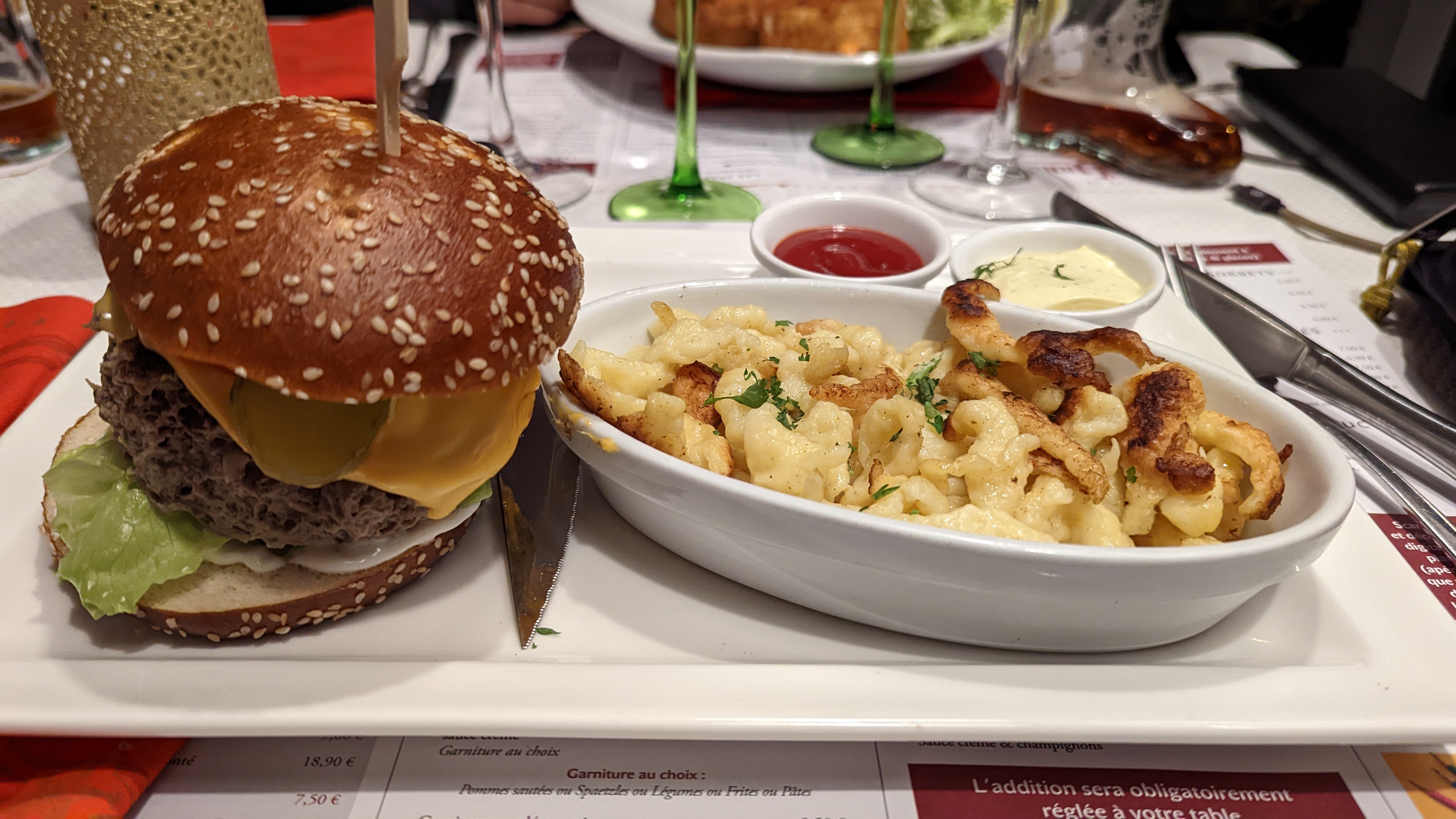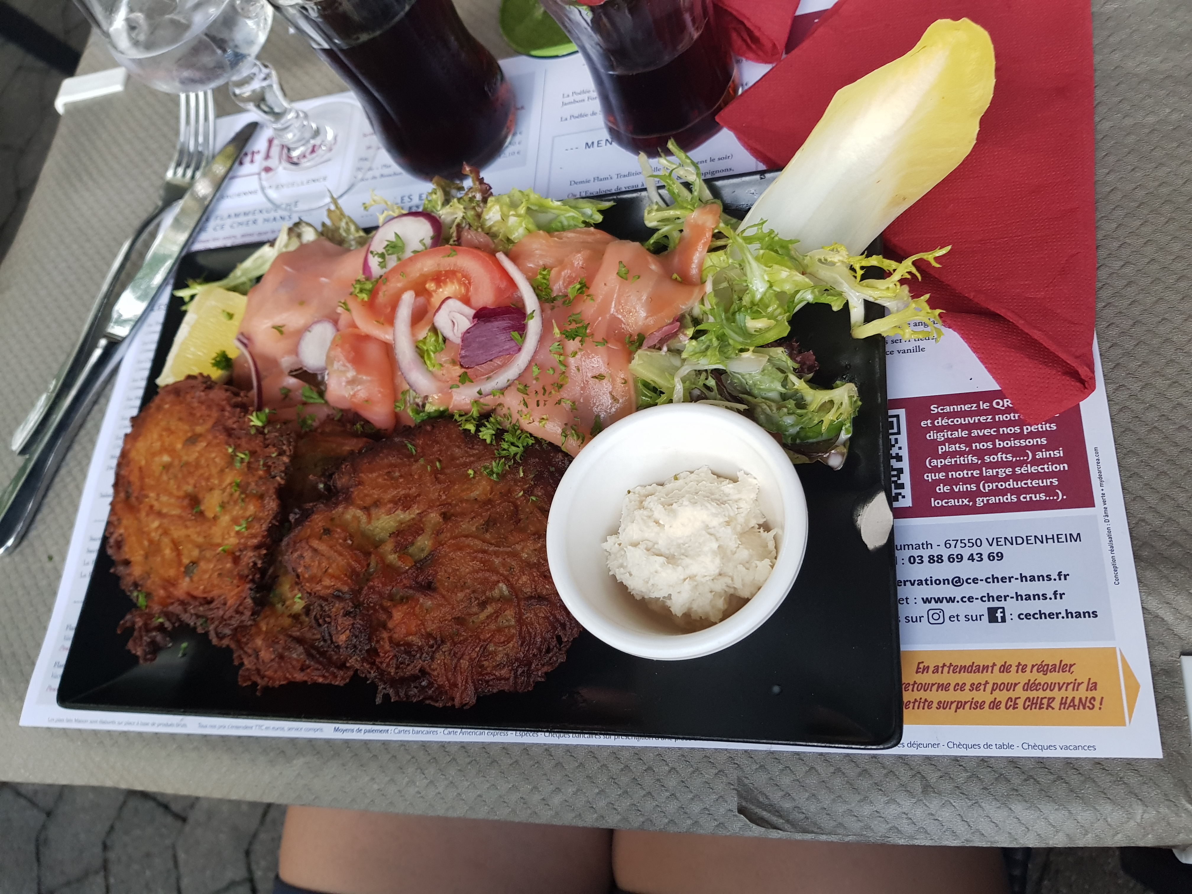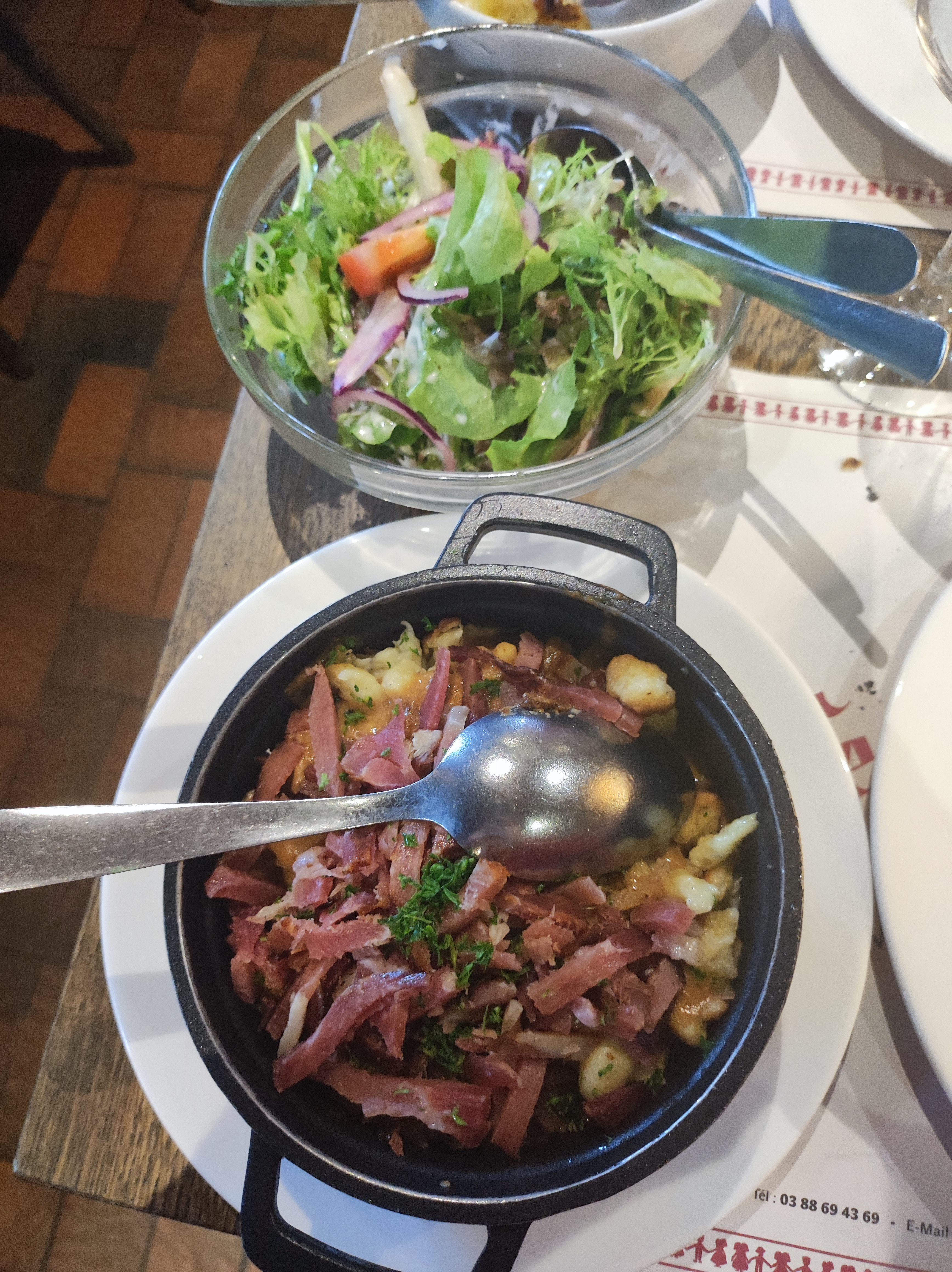 Je suis venu entre midi et deux avec des collègues de travail. J'ai pris l'entrée du jour qui était un croque monsieur avec une petite salade qui était bonne. En plat j'ai pris des spaetzles au munster qui était très bon et bourratif comme on aime. En dessert j'ai pris une tarte rhubarbe meringuée qui était bonne. Franchement j'ai bien aimé le restaurant et en plus niveau qualité prix on s'y retrouve je recommande !