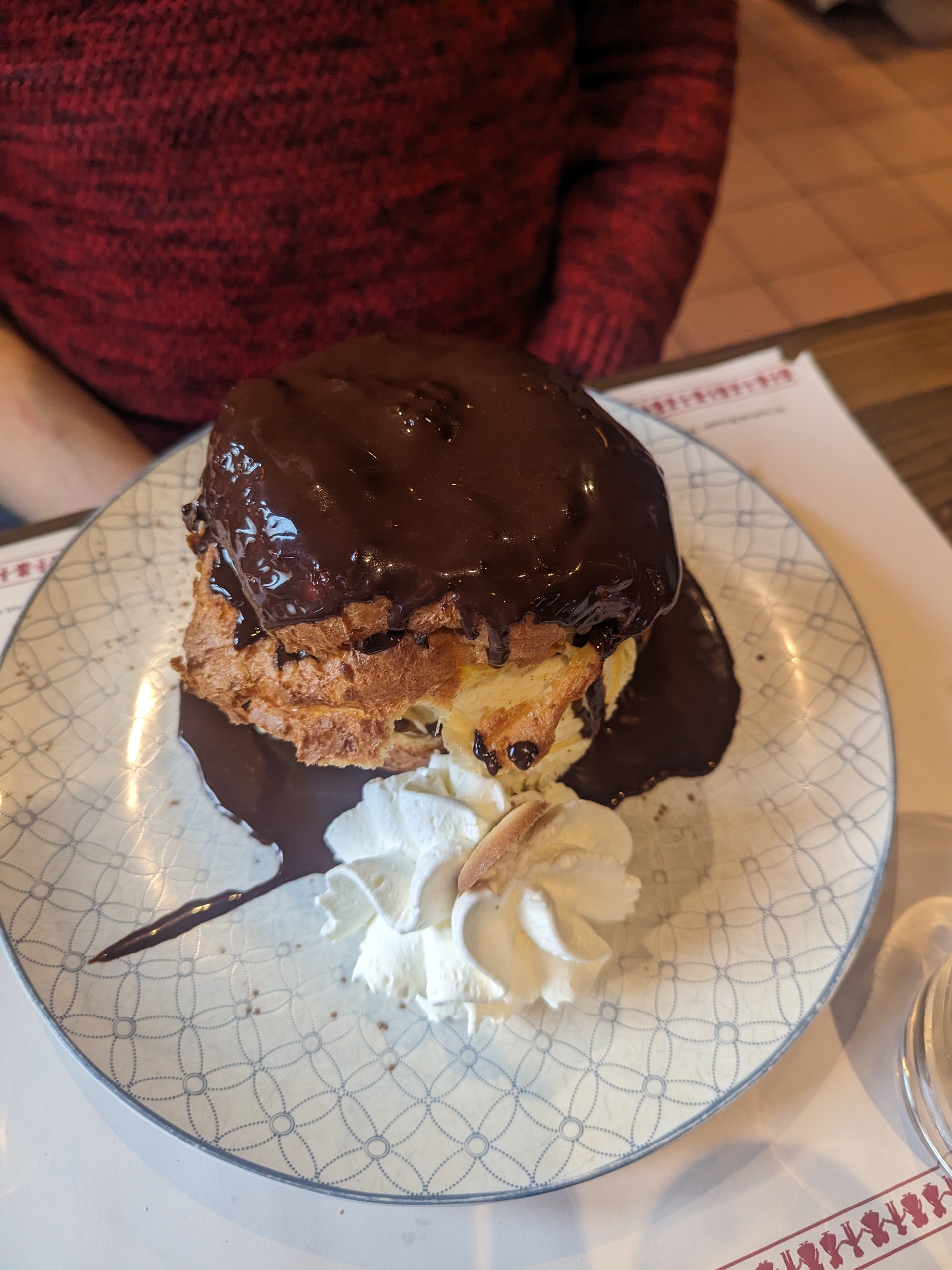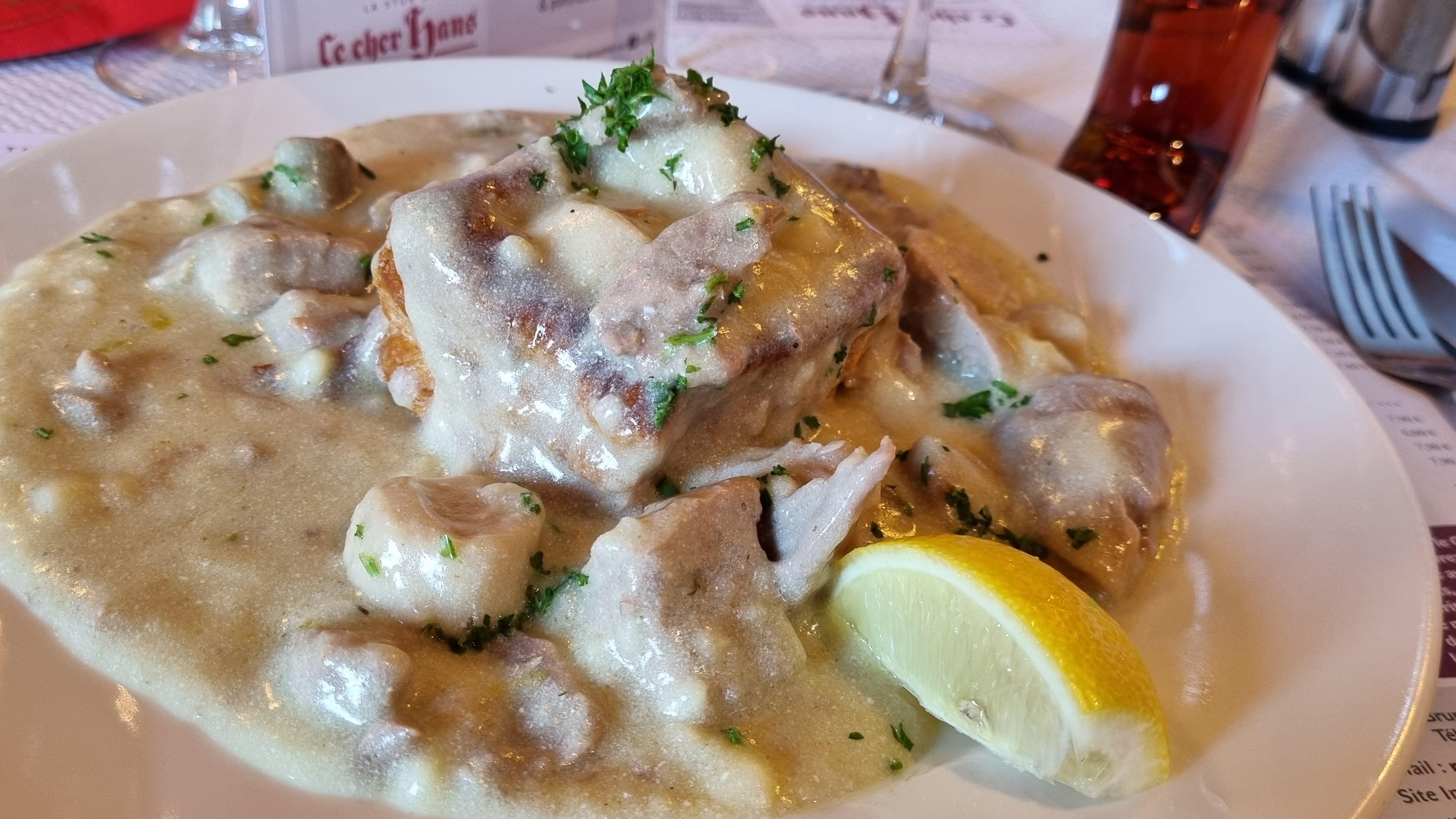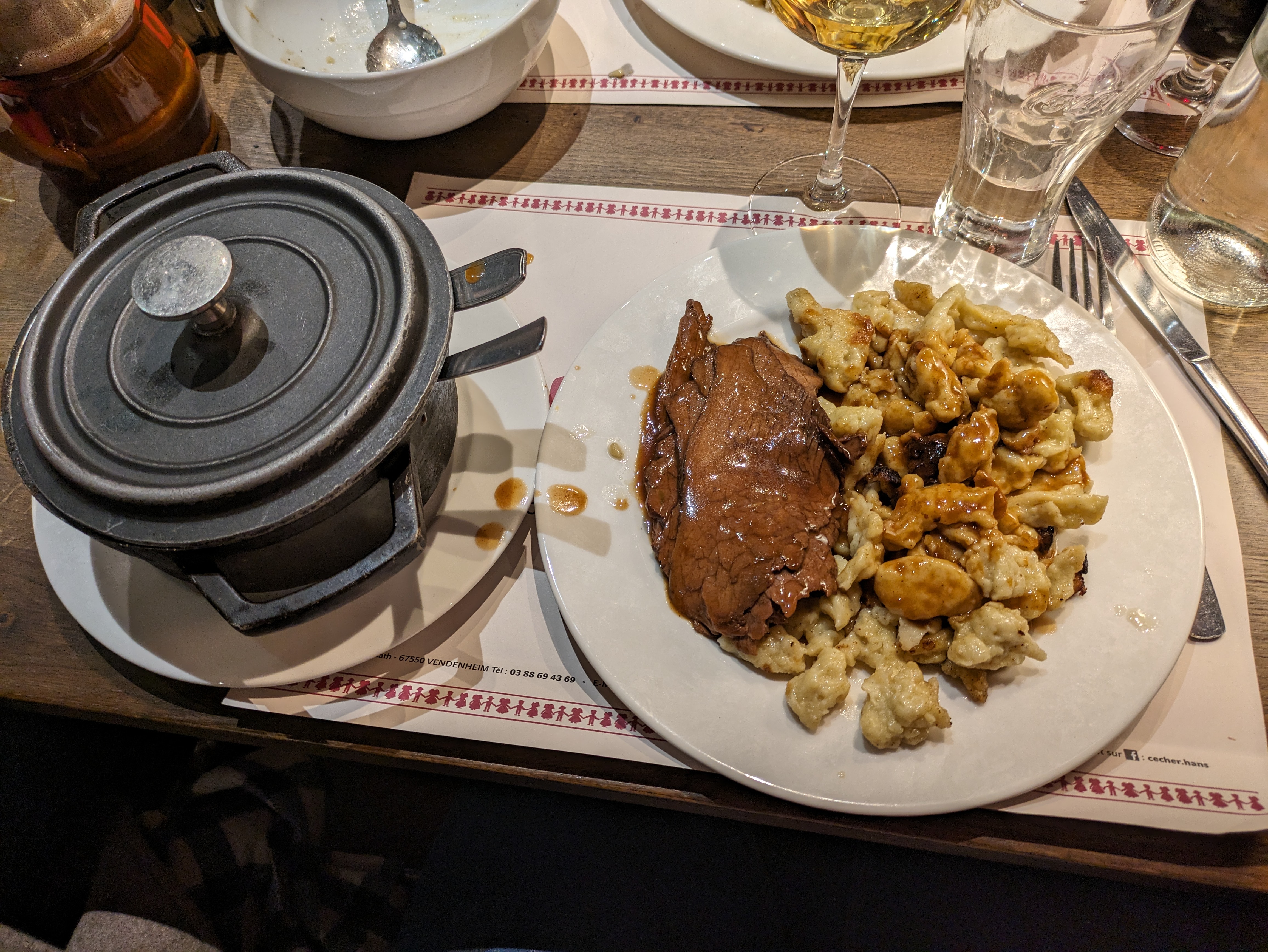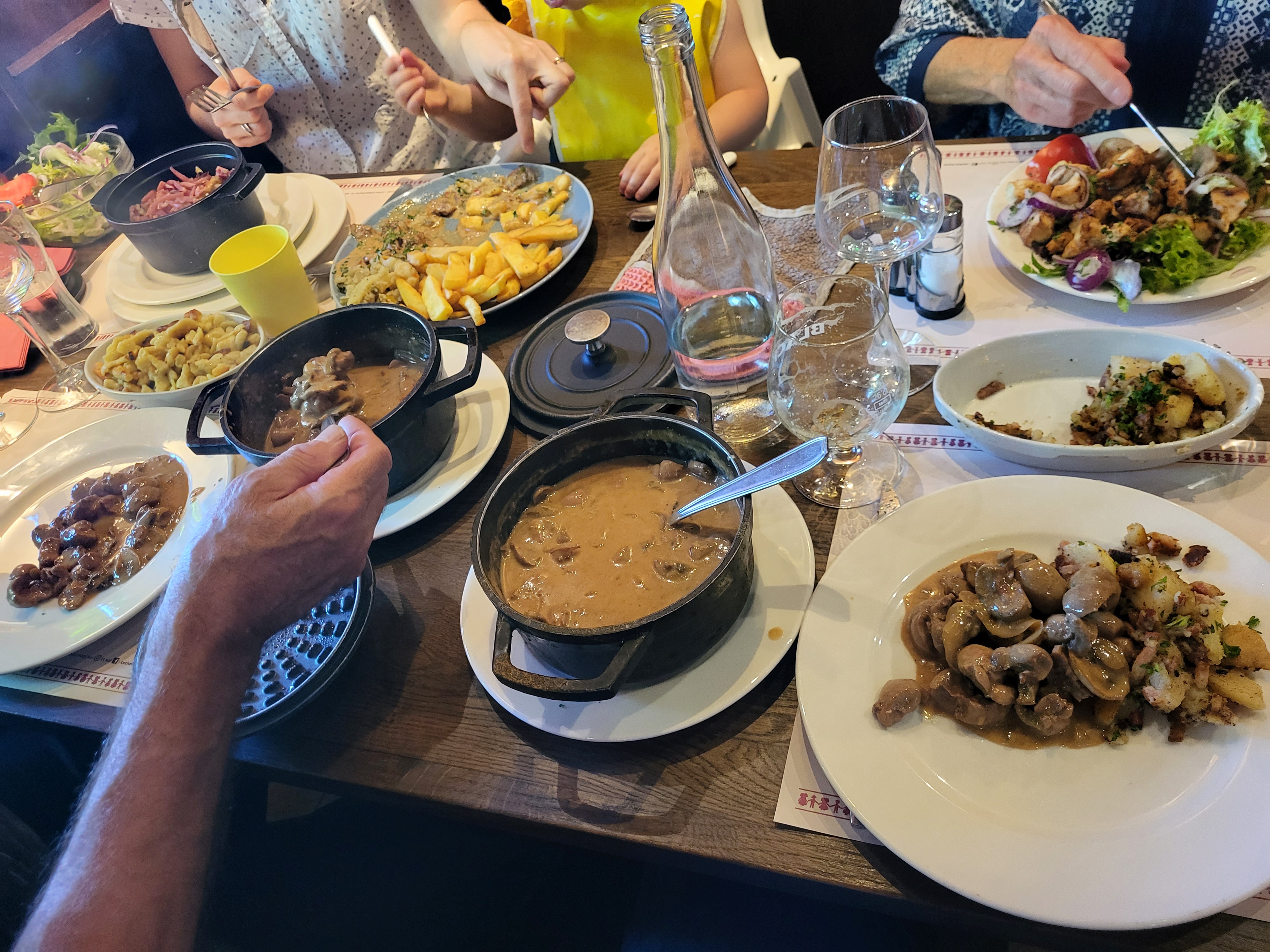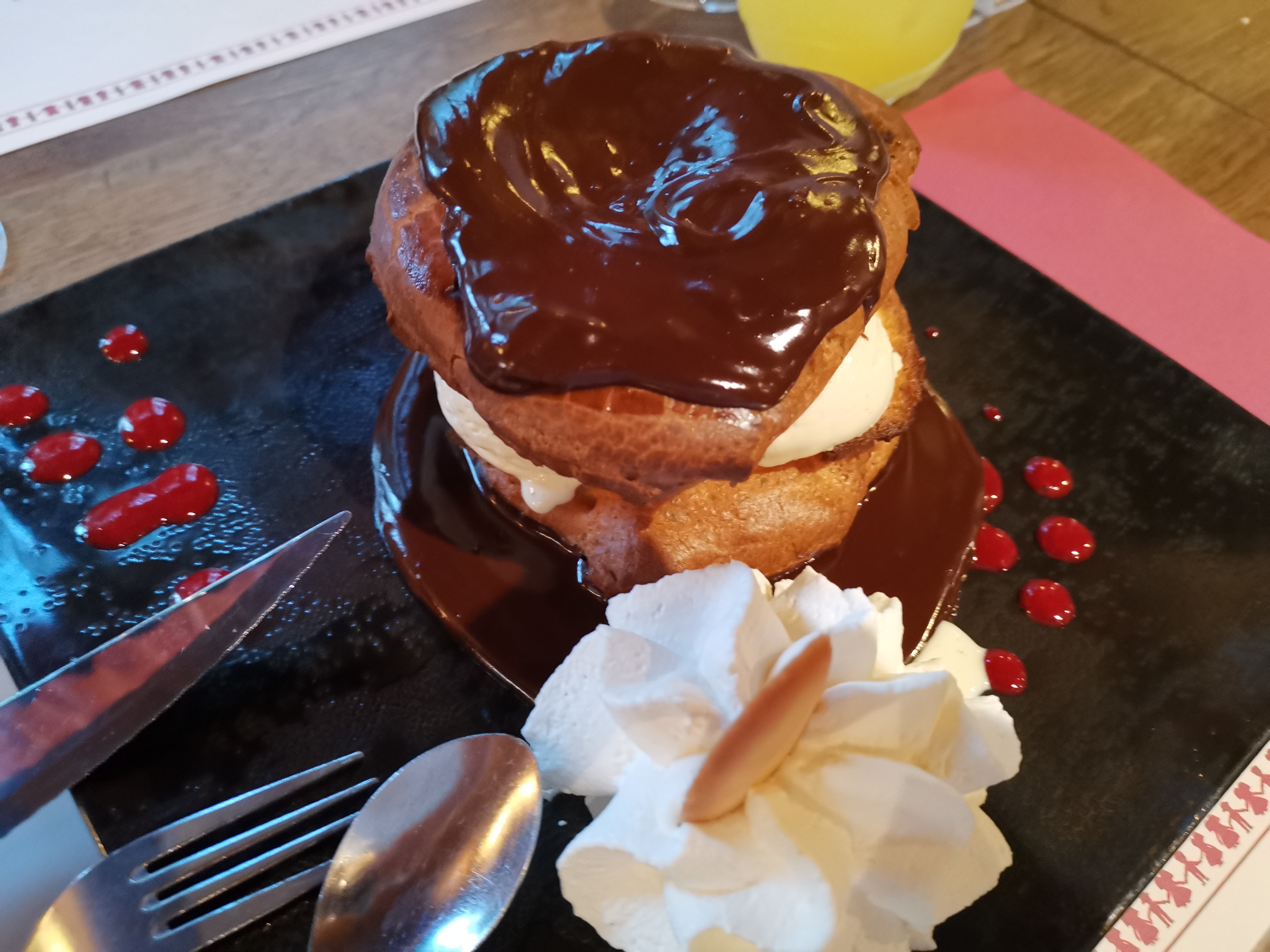 12h30 salle comble, le service ne tarde pas trop pour s'occuper de nous et avec le sourire. L'apéro arrive assez vite le temps de nous préparer une cocote de baeckeofe qui était une des proposition du jour: pas de regrets il est excellent et je m'y connais. Mention très bien pour le pinot noir servi à la bonne température. Desserts au top, la profiterole XXL est👍. D'après ce que j'ai vu sur les tables voisines faudra revenir pour les cordons bleus !