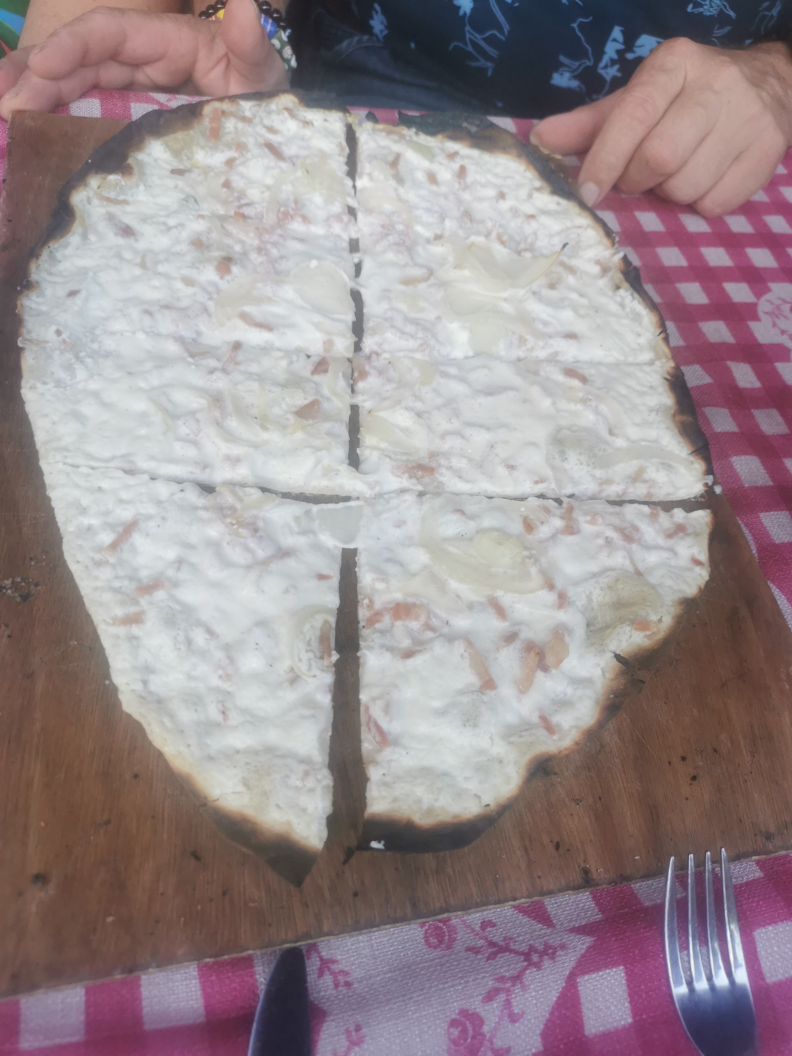 Toujours un plaisir de venir manger une tarte flambée cuite au feu de bois. Garnie, cuite comme il faut, Gewurtzraminer vendange tardive très bon. Je recommande